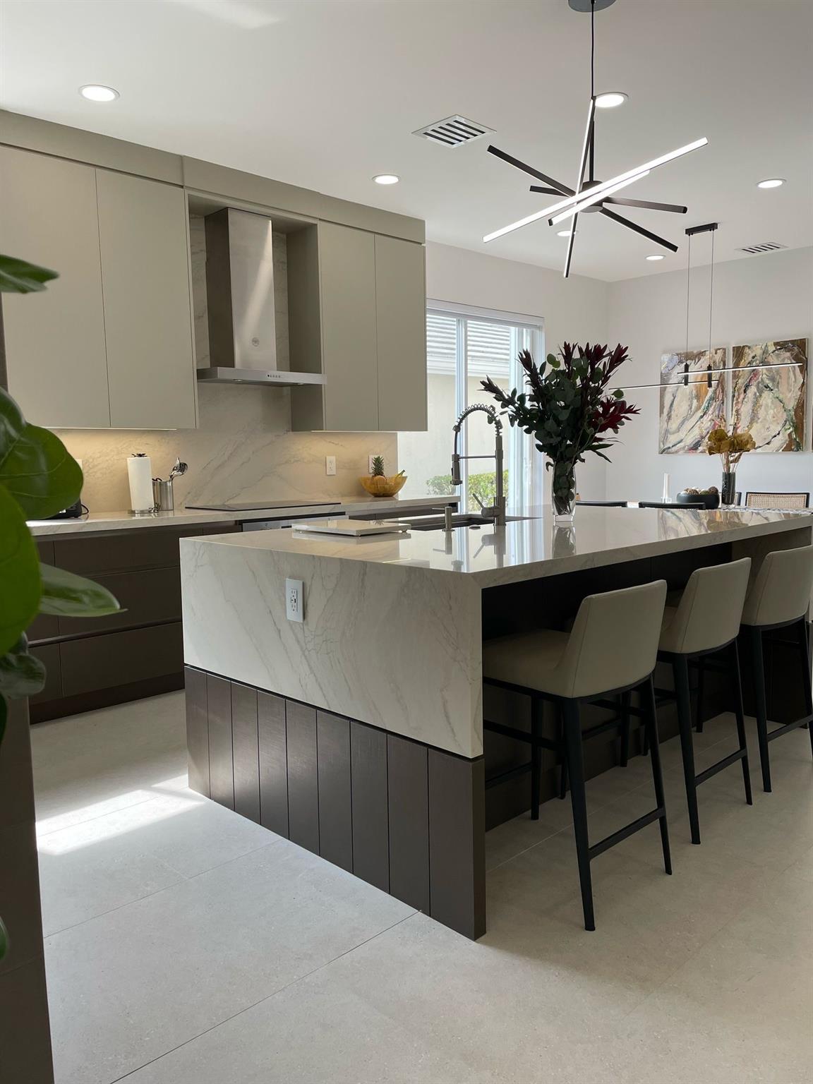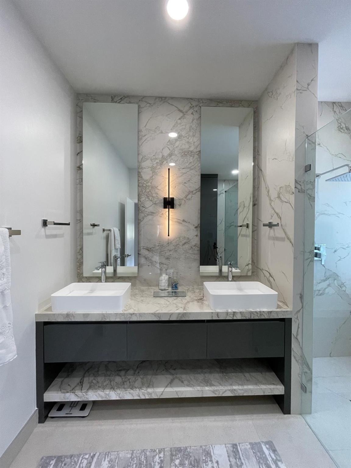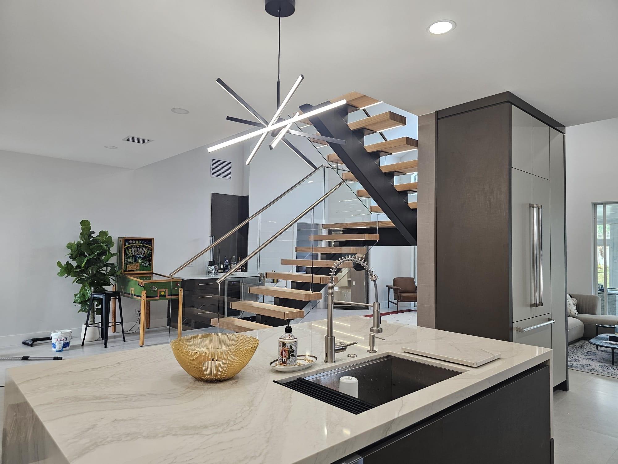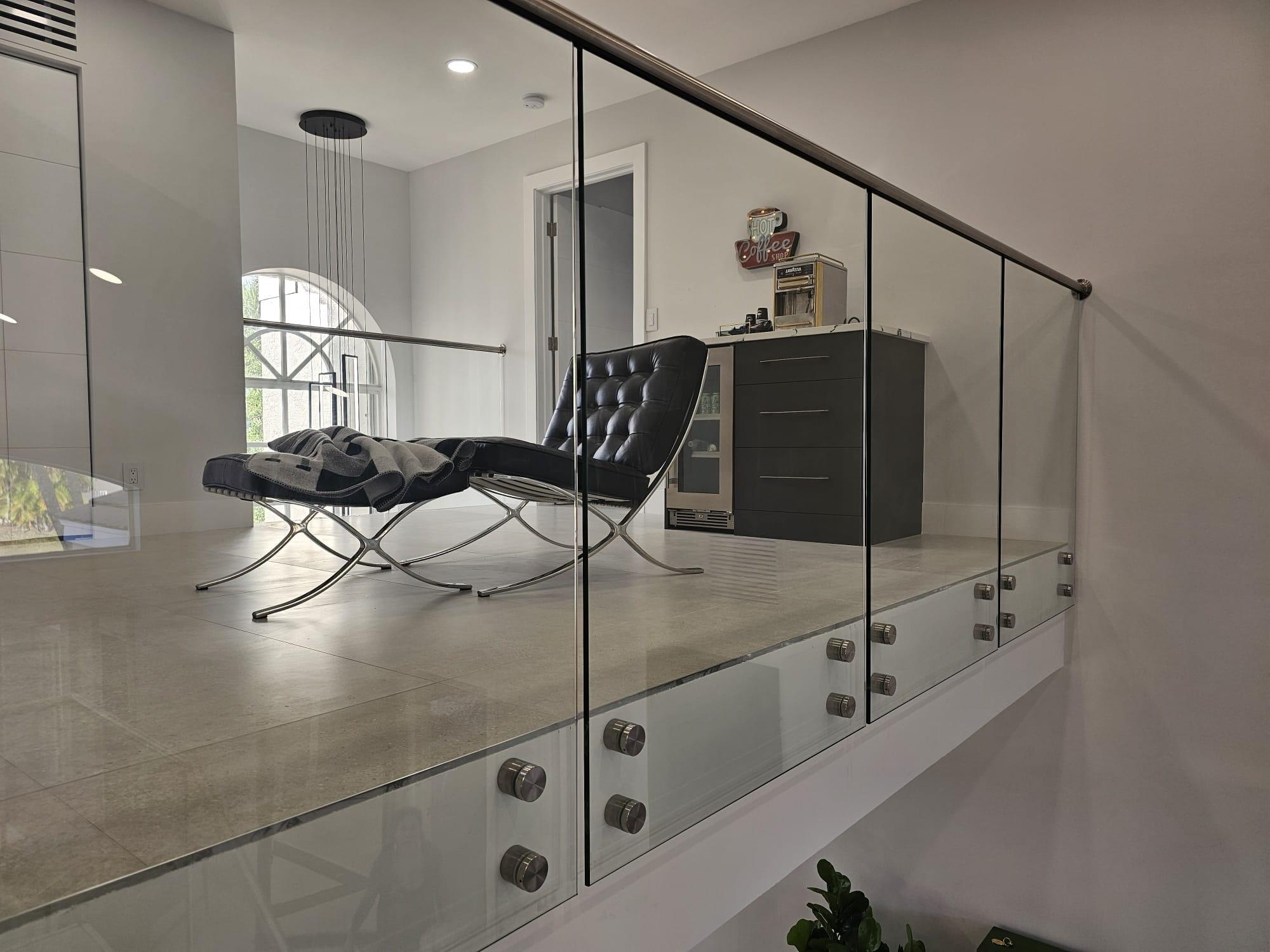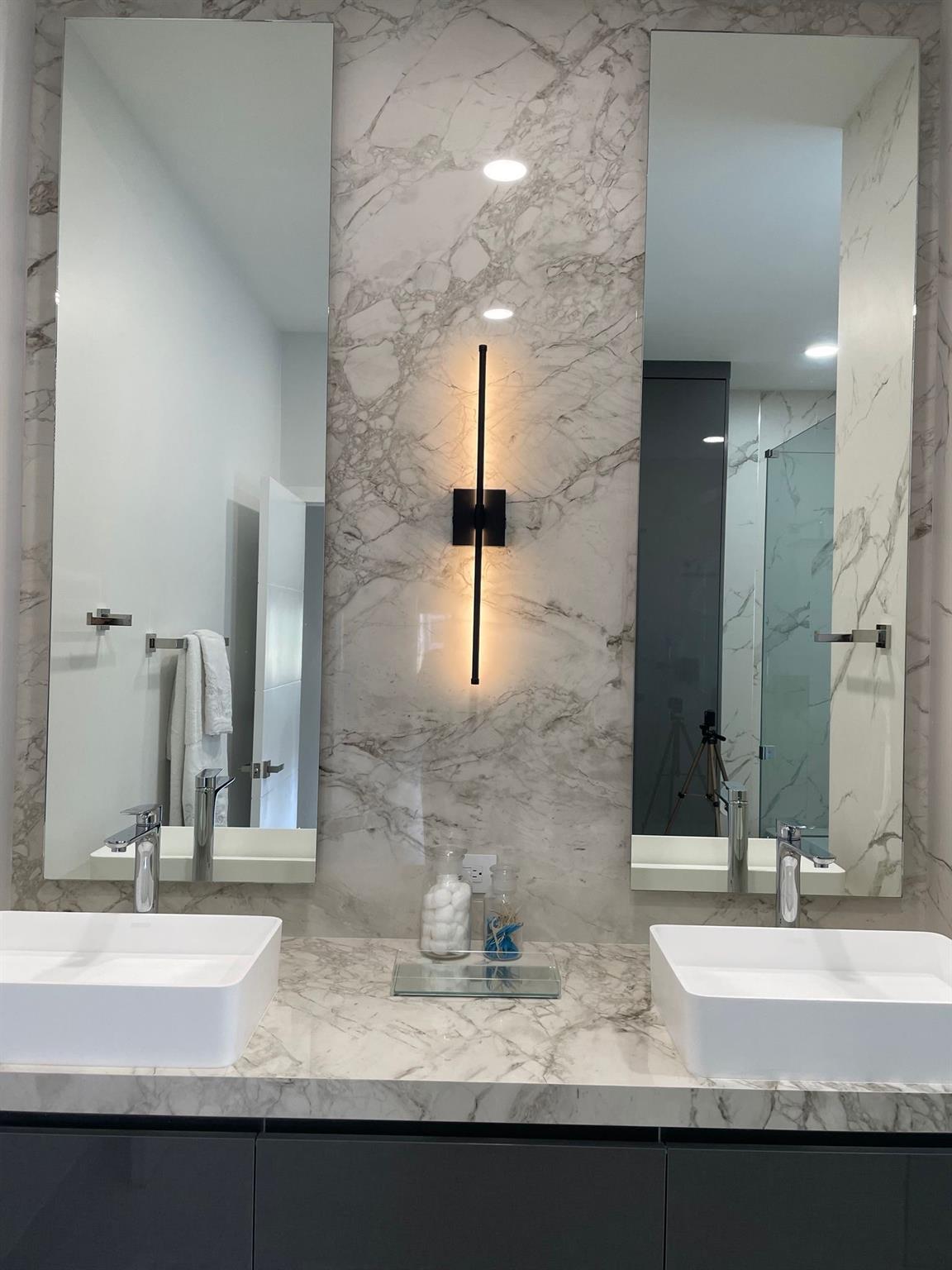 Experience modern luxury in this fully upgraded 4-bedroom, 4.5-bathroom home with a den, offering lake views & premium features throughout. The kitchen boasts Bertazzoni Italian appliances, quartz countertops, custom cabinetry & advanced lighting. The interior showcases large-format porcelain floors, recessed LED lighting, smart climate control & sleek finishes. The spacious living room includes a custom bar & a glass-railing staircase. Primary suite features custom closets, frameless showers & smart toilets, while guest bedrooms provide similar high-end finishes. The mezzanine includes a morning bar with a wine fridge. Additional amenities include hurricane shutters, an epoxy-finished garage, new exterior lighting, and updated plumbing fixtures. This home combines style & functionality.