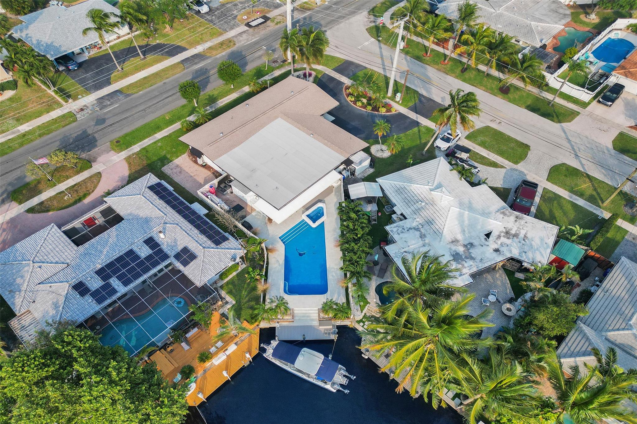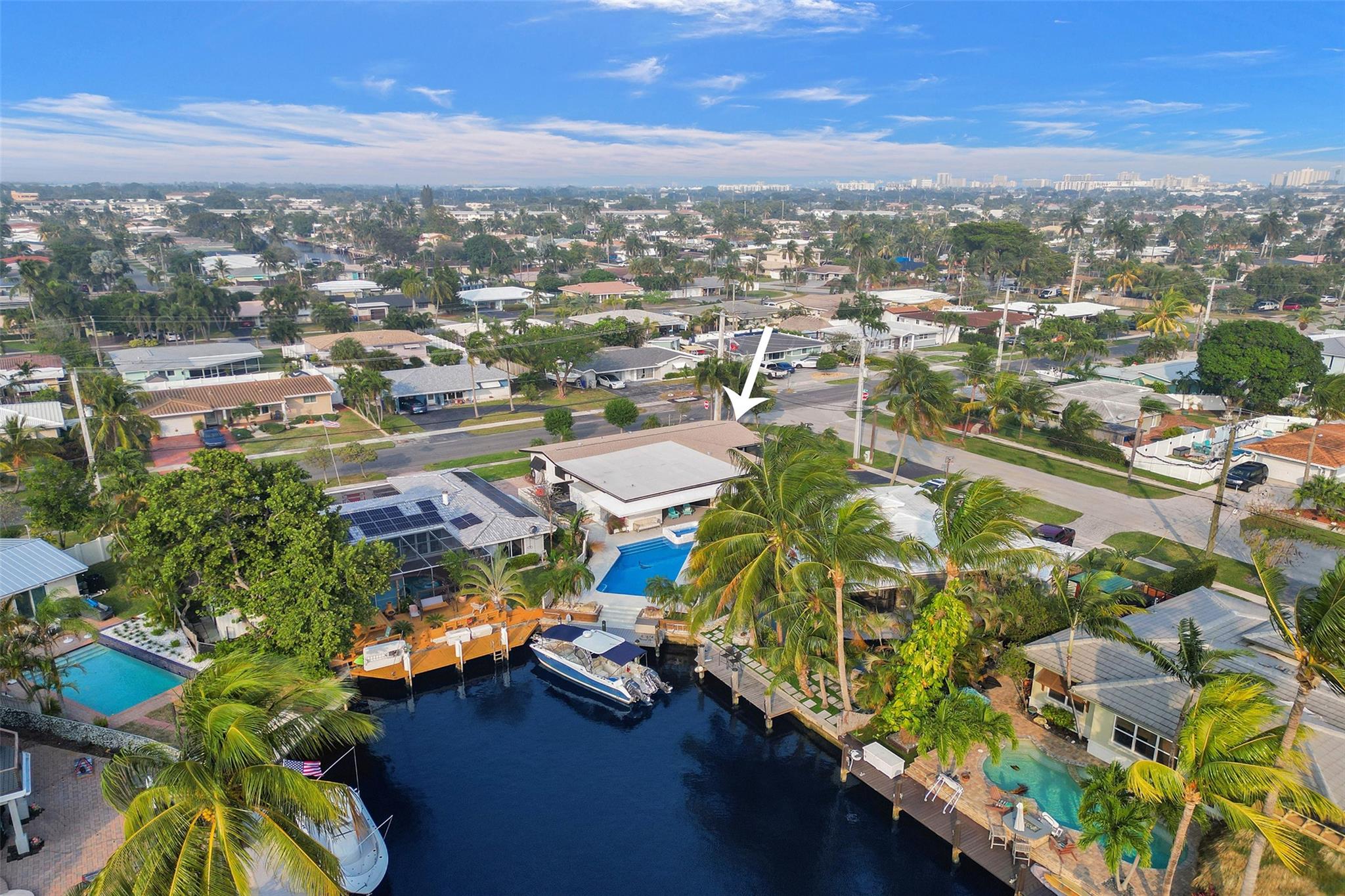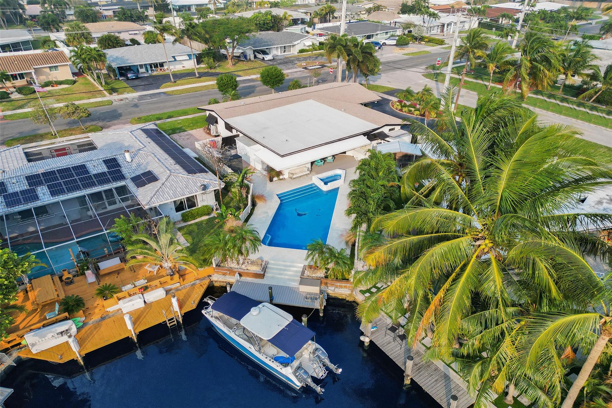 Step into coastal luxury in this fully updated waterfront home with ocean access for your boat. Totaling 2,846 sqft featuring two master suites, two guest bedrooms, and four stylishly renovated bathrooms. 207 sqft bonus room with walk-in wardrobe and a private entrance can be a fifth bedroom/office or workshop. The open floor plan leads to a designer chef’s kitchen with mother-of-pearl tile, oversized island, 5-burner gas range, and custom cabinetry. The main primary suite has a 20×6 ft walk-in closet, zoned AC, and a spa-like en-suite. Outside, enjoy a resort-style backyard with a large salt water pool, gas-heated spa and Trex dock for your boat. Additional upgrades: 2020 roof, impact windows/doors, dual-zone AC, whole house generator and room for additional RV/boat trailer parking.