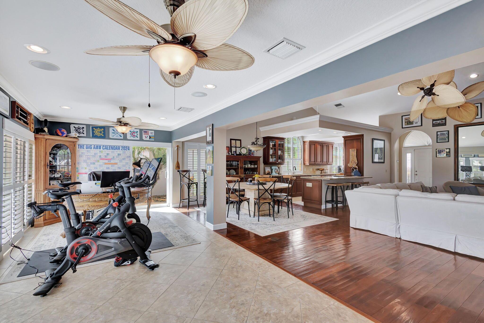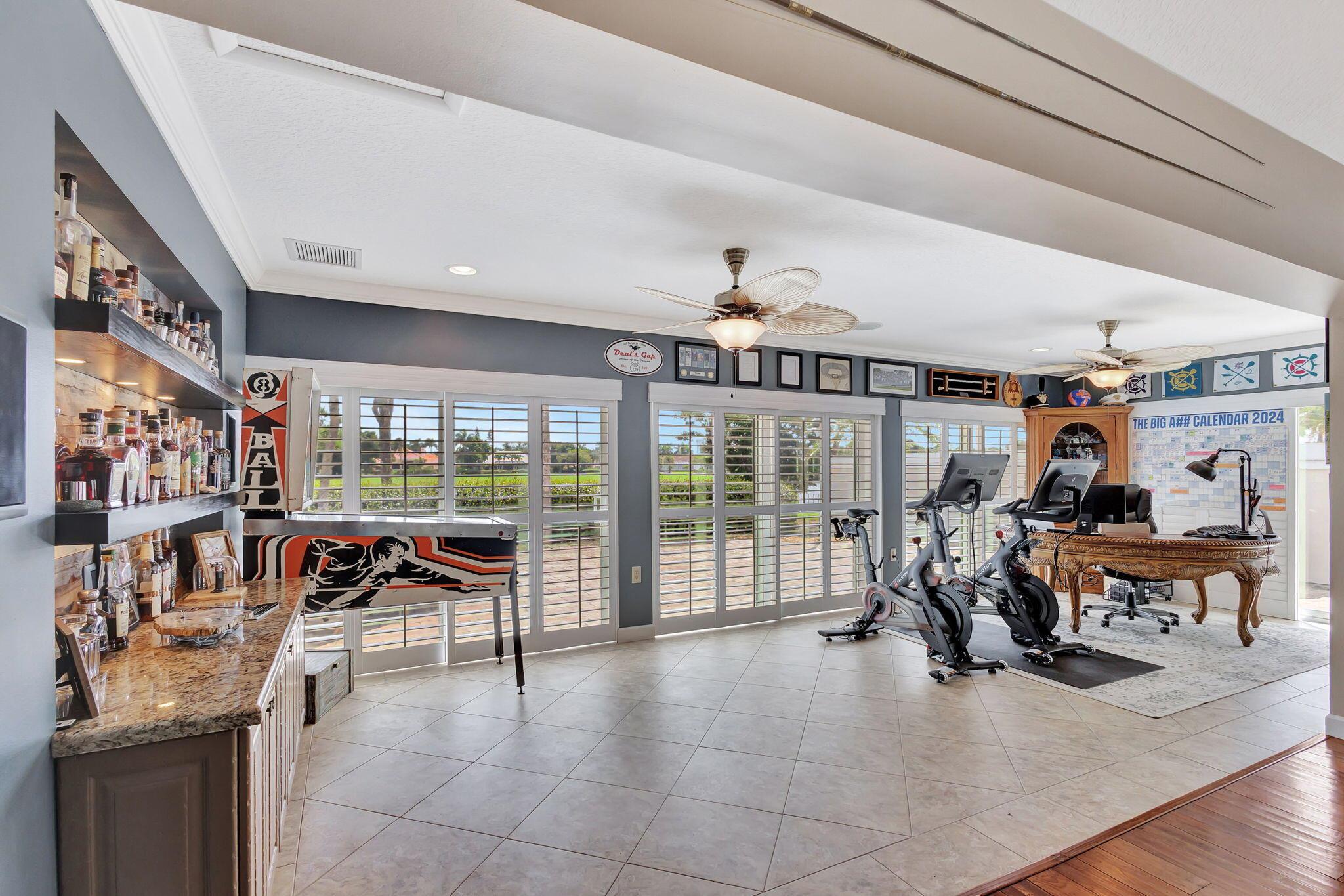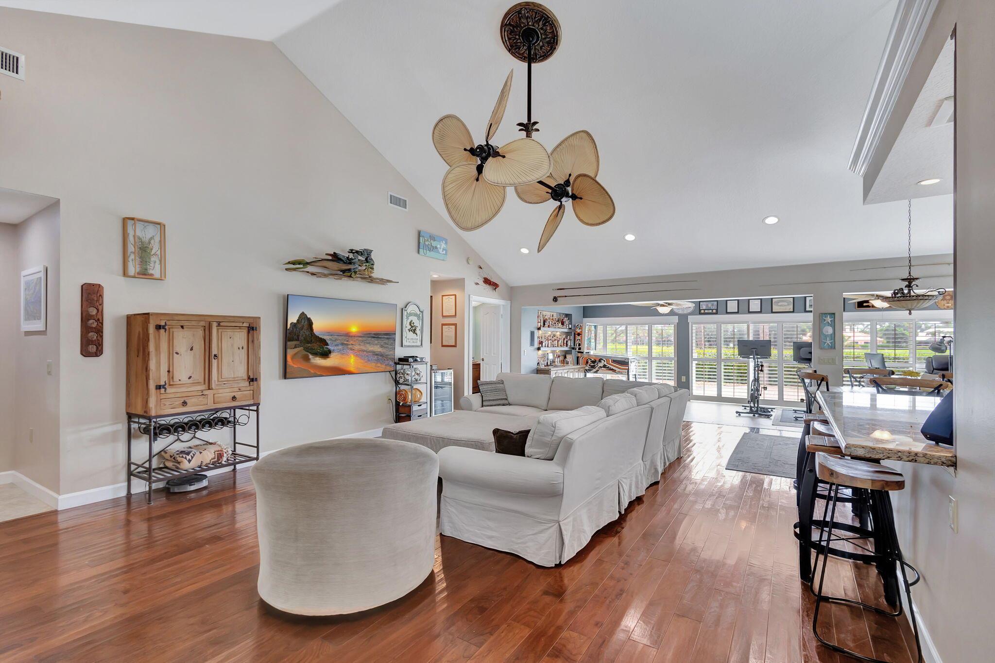 Enjoy South Florida living in the gated golf course community of Saratoga Bay! This desirable Divosta-built home has been beautifully updated with new impact windows and doors and boasts SPECTACULAR golf and lake views! With 3 bedrooms, 2 baths, and extended living area allowing for nearly 2,300 SF, this home is awash with tons of natural light, vaulted ceilings, crown molding and Plantation shutters throughout! Spacious gourmet kitchen perfectly equipped with 42” wood cabinets and under cabinet lighting, granite counter tops and tiled backsplash, GE stainless steel appliances including wall oven, built-in cooktop and expansive breakfast bar. Separate great room and extended lanai offer tons of space with custom built-in shelves and cabinetry- the perfect area for entertaining –