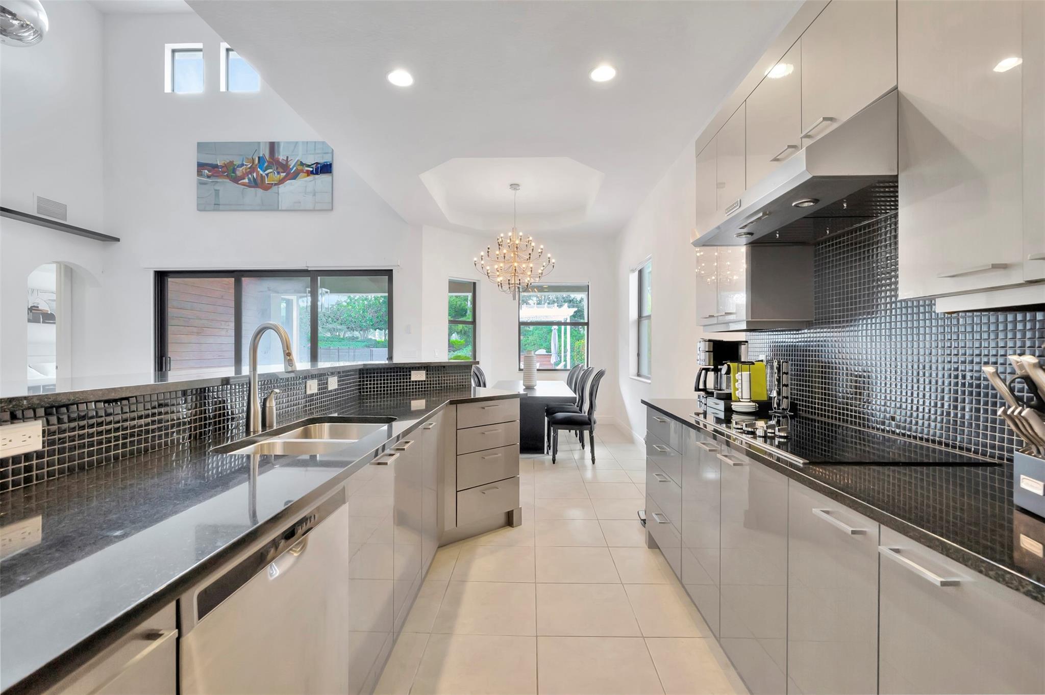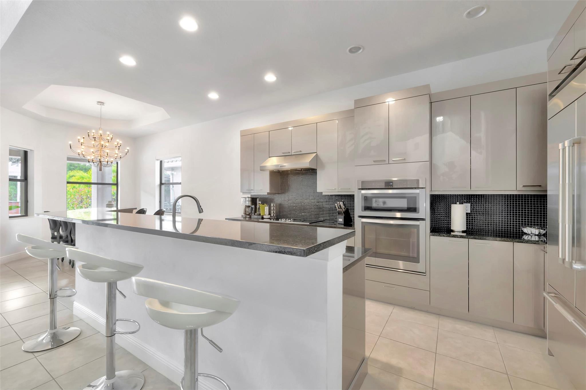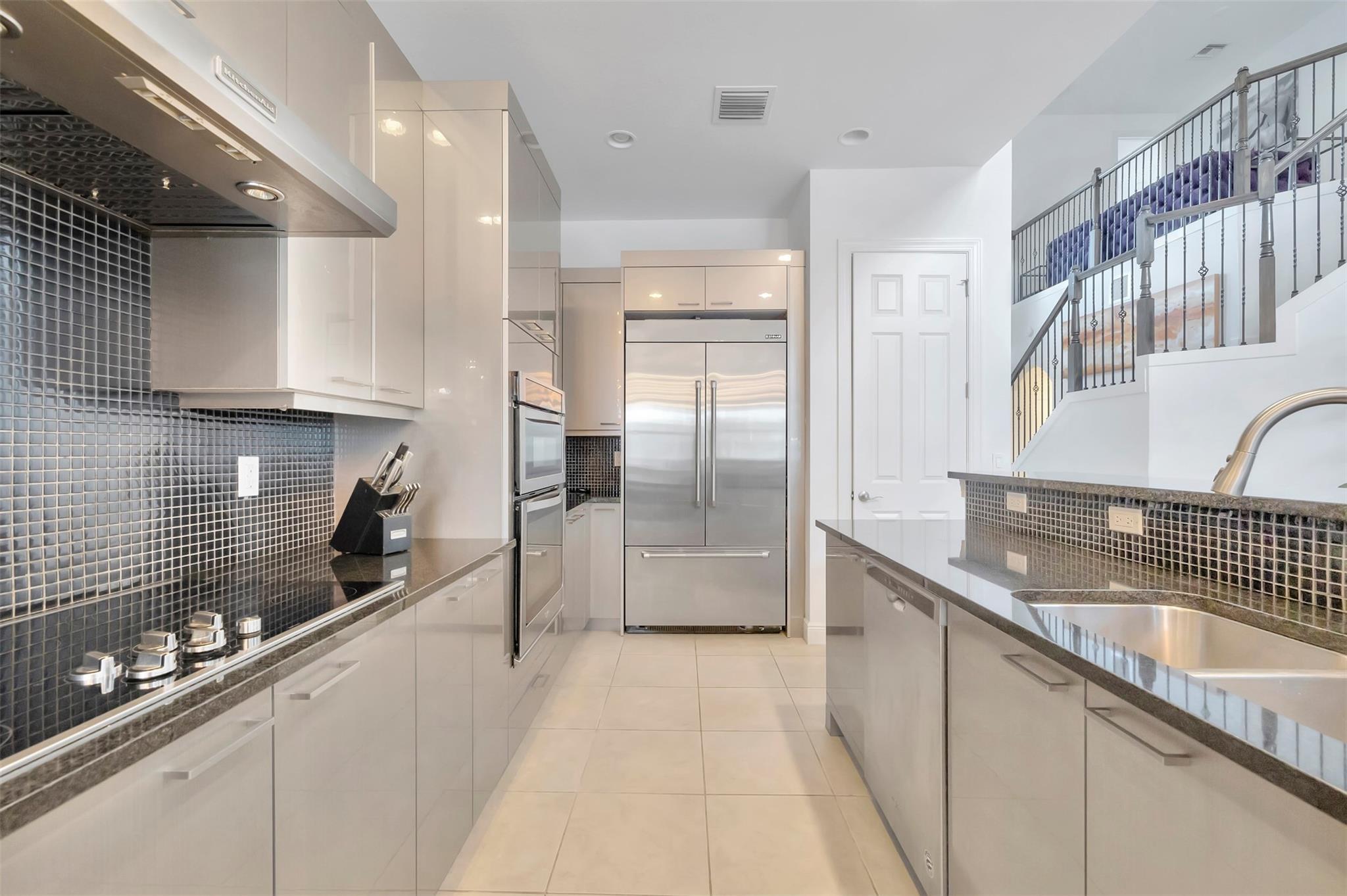 The kitchen boasts stainless steel appliances, granite countertops, and custom cabinetry.
