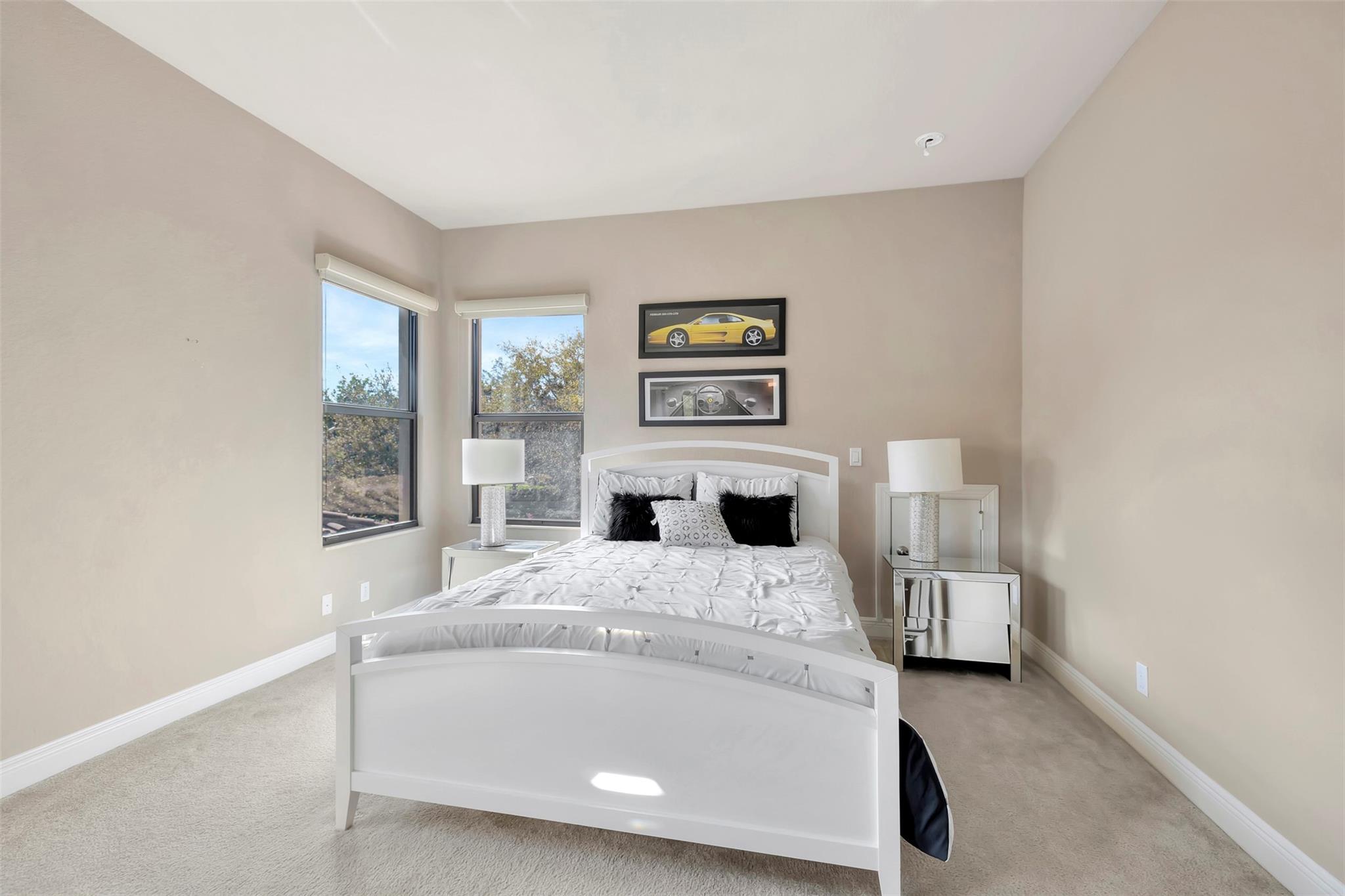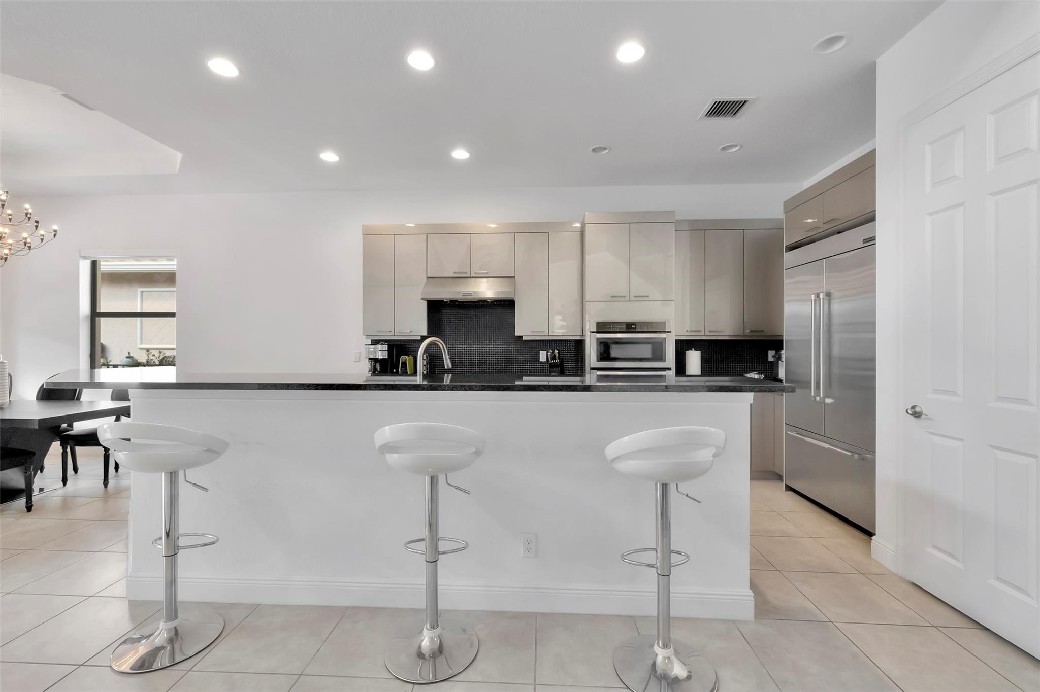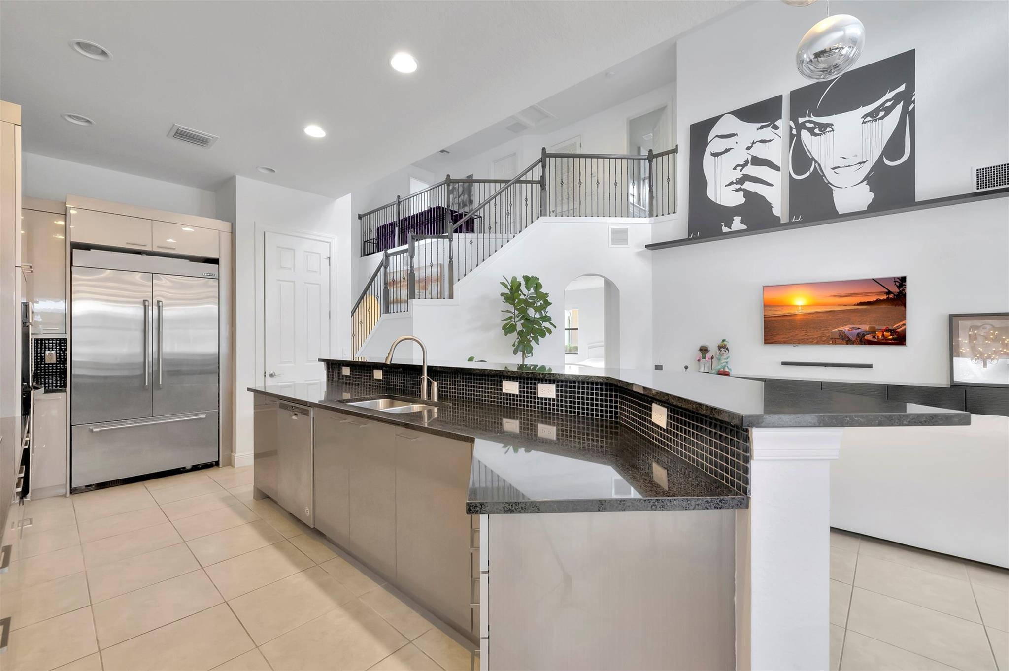 The kitchen boasts stainless steel appliances, granite countertops, and custom cabinetry.