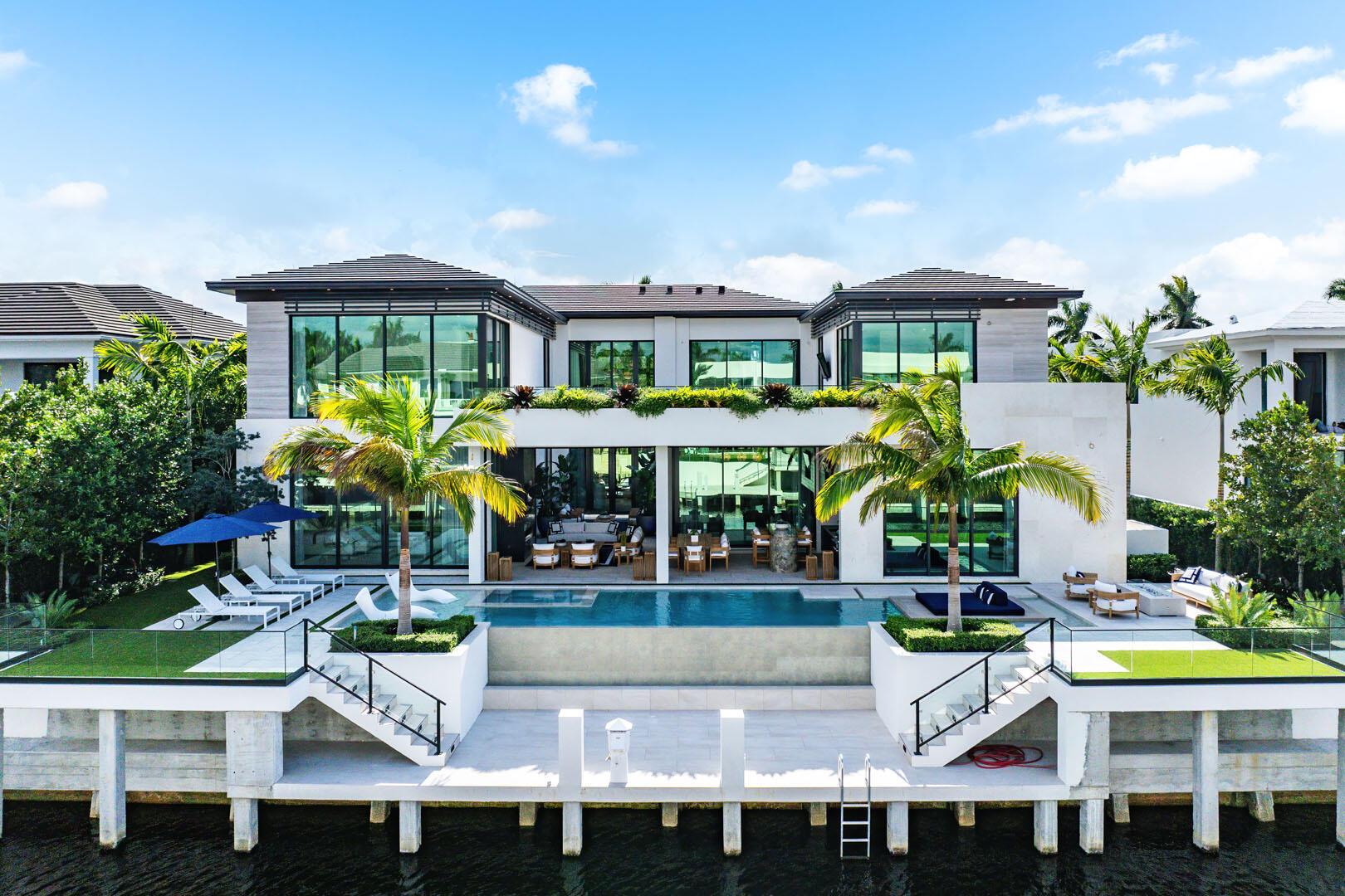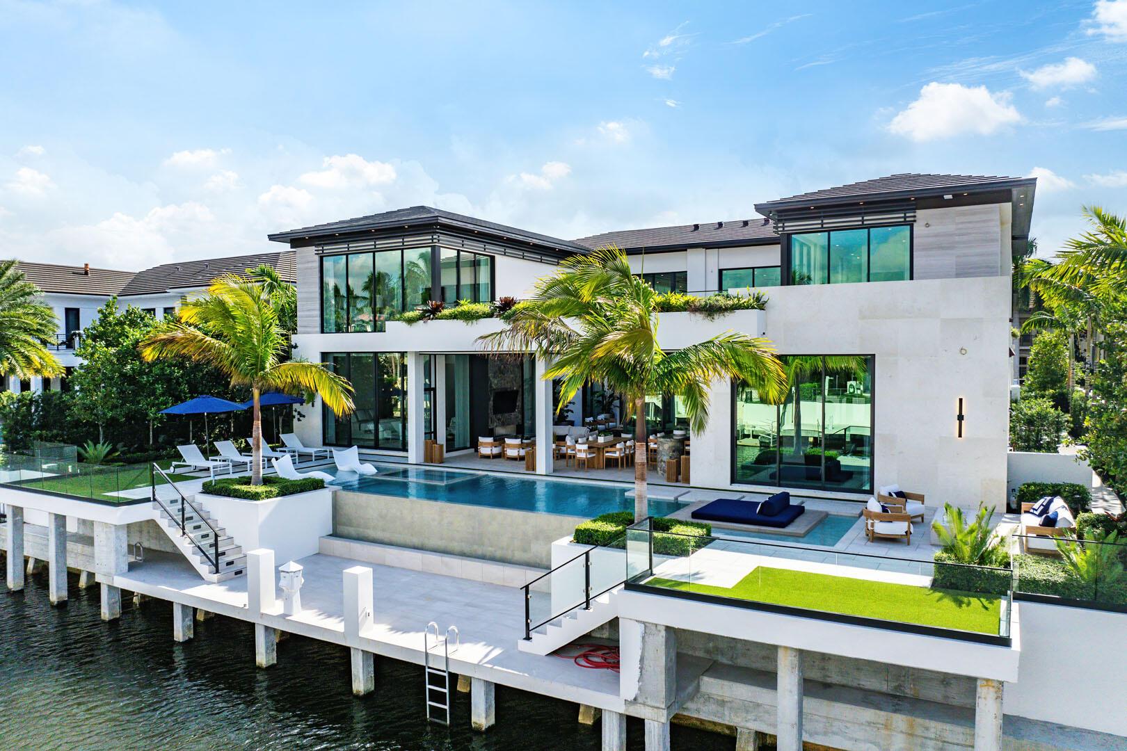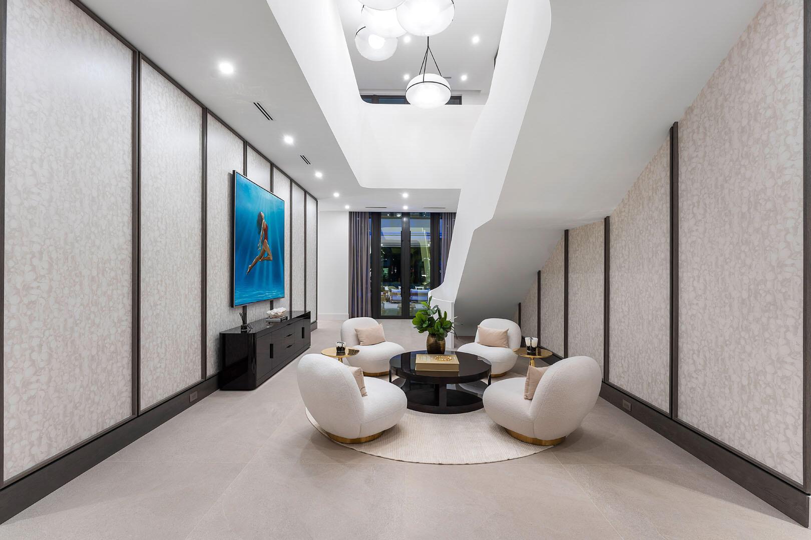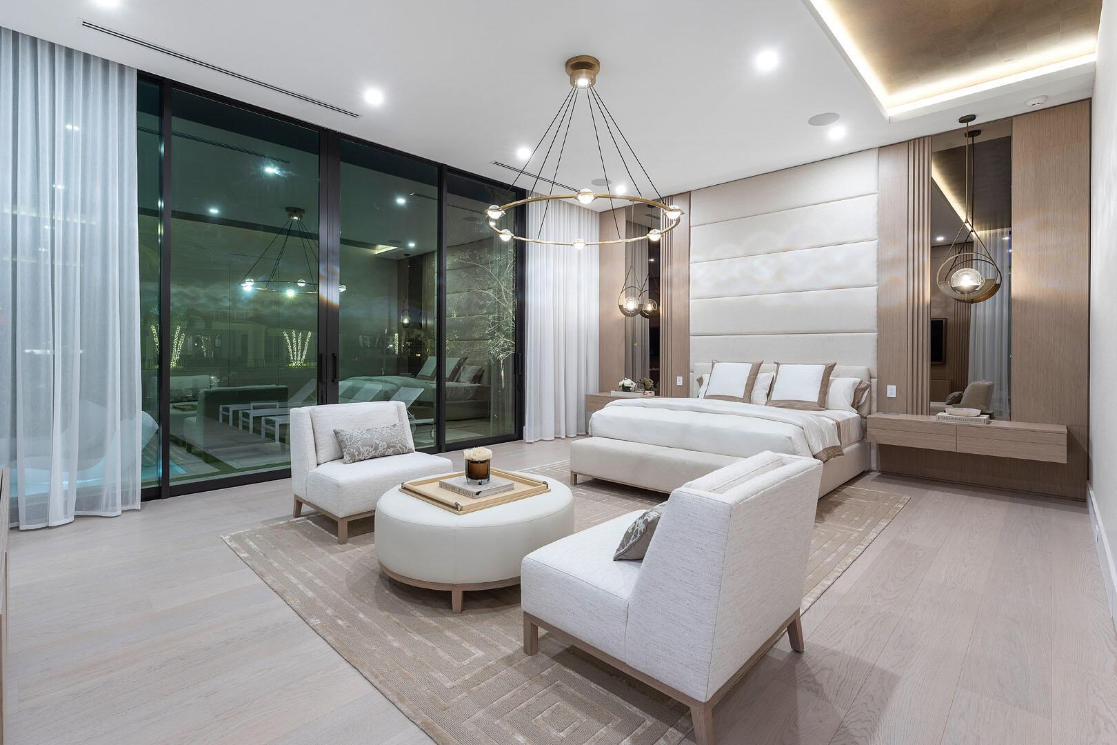 Nestled along 101 feet of the prestigious Butterfly Palm Waterway, this newly completed ultra-luxury contemporary estate developed by Matthew Epstein of Primark Partners sets a new standard that epitomizes waterfront elegance. Architecture by Affiniti Architects with interiors by Michael Gray Interiors, this seven-bedroom residence seamlessly blends innovative design with the finest materials and meticulous craftsmanship, offering a refined lifestyle in one of Boca Raton’s most exclusive enclaves.The first-floor primary suite is a serene retreat with indulgent His & Her spa-inspired bathrooms wrapped in Italian travertine and boutique-style closets. The thoughtfully designed interior also includes a chic clubroom with a Quartzite bar, a sophisticated home office, a formal dining