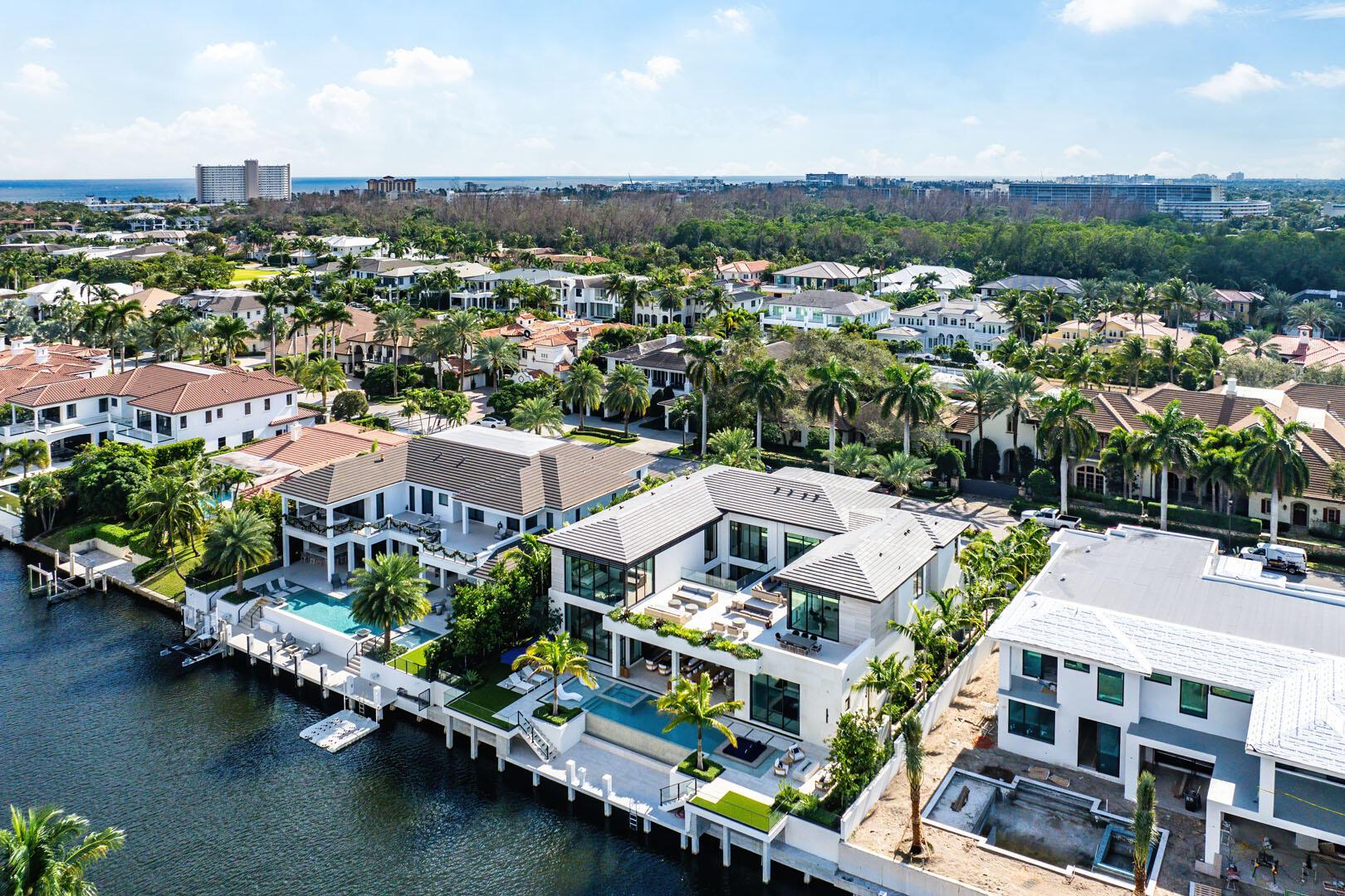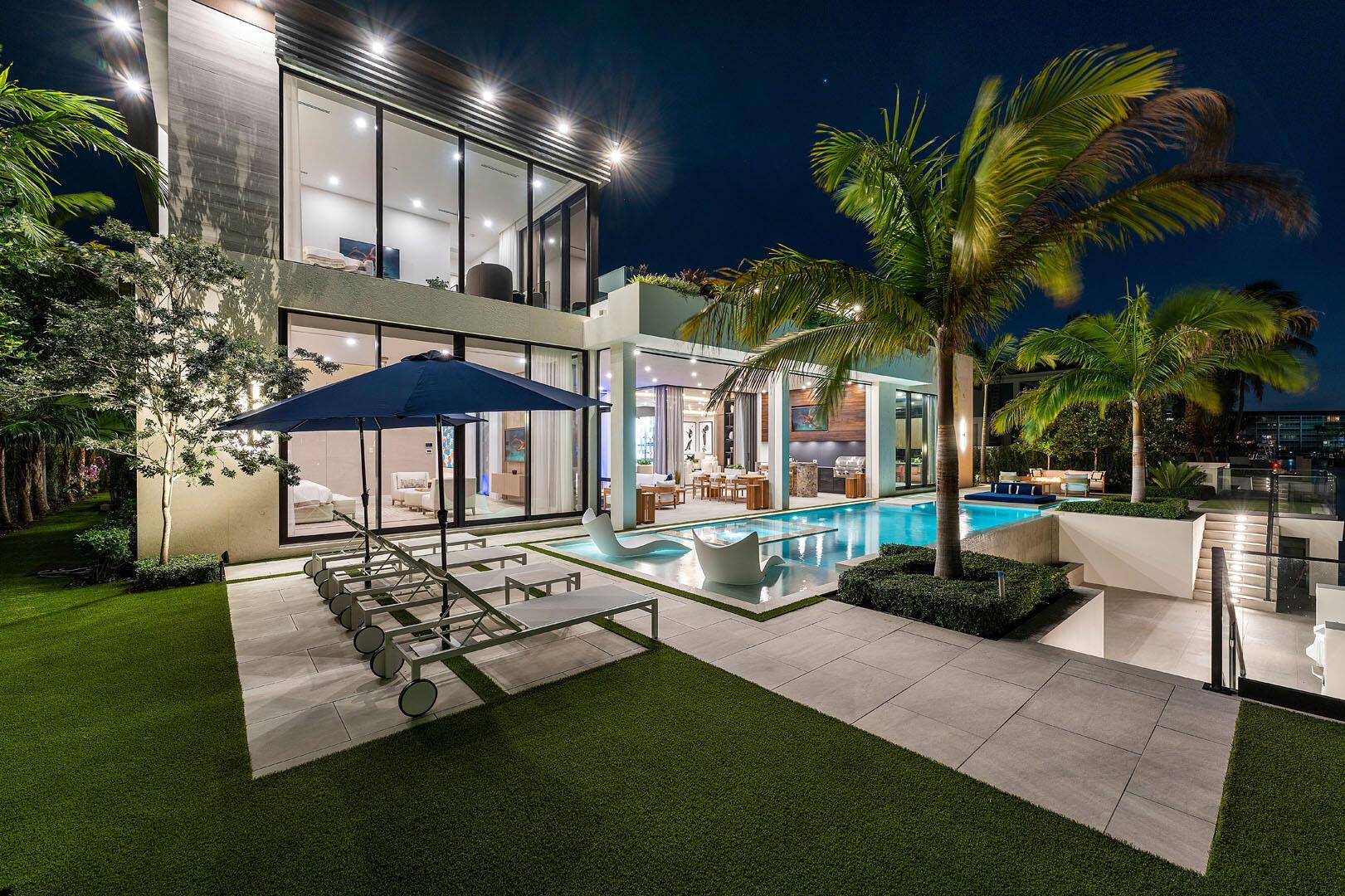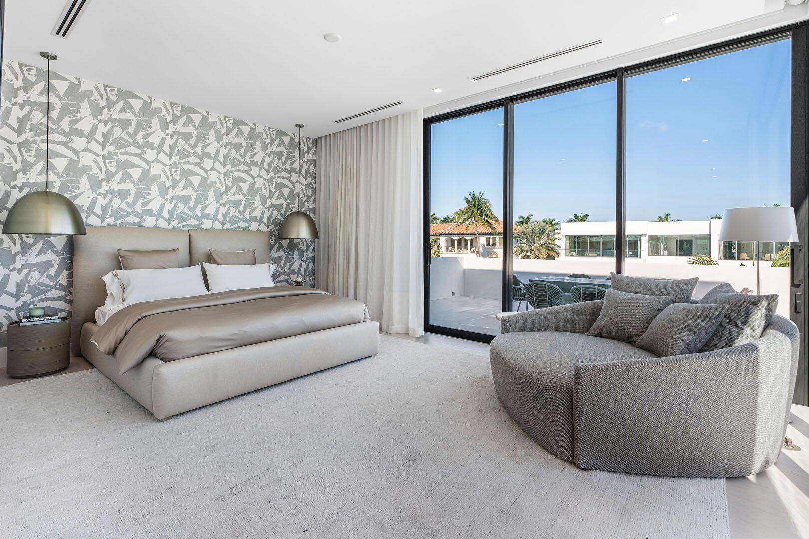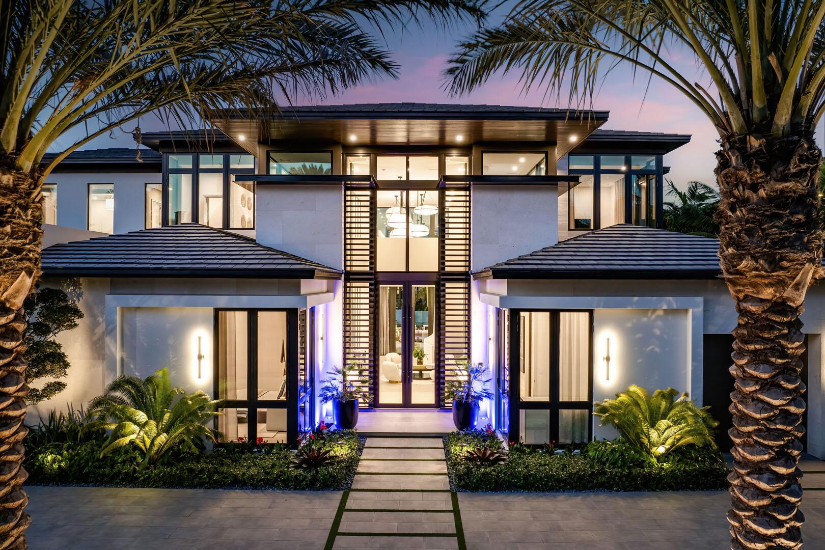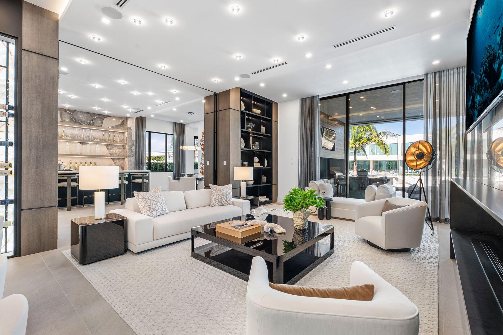 Nestled along 101 feet of the prestigious Butterfly Palm Waterway, this newly completed ultra-luxury contemporary estate developed by Matthew Epstein of Primark Partners sets a new standard that epitomizes waterfront elegance. Architecture by Affiniti Architects with interiors by Michael Gray Interiors, this seven-bedroom residence seamlessly blends innovative design with the finest materials and meticulous craftsmanship, offering a refined lifestyle in one of Boca Raton’s most exclusive enclaves.The first-floor primary suite is a serene retreat with indulgent His & Her spa-inspired bathrooms wrapped in Italian travertine and boutique-style closets. The thoughtfully designed interior also includes a chic clubroom with a Quartzite bar, a sophisticated home office, a formal dining