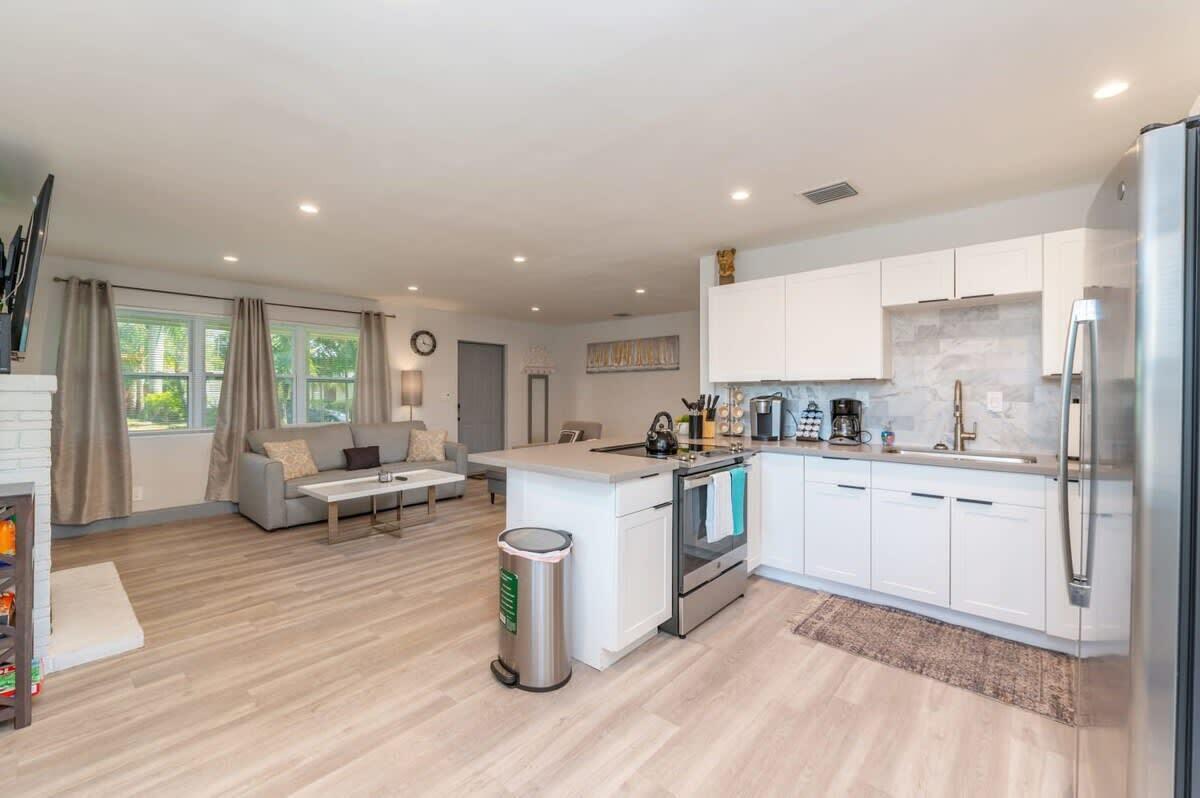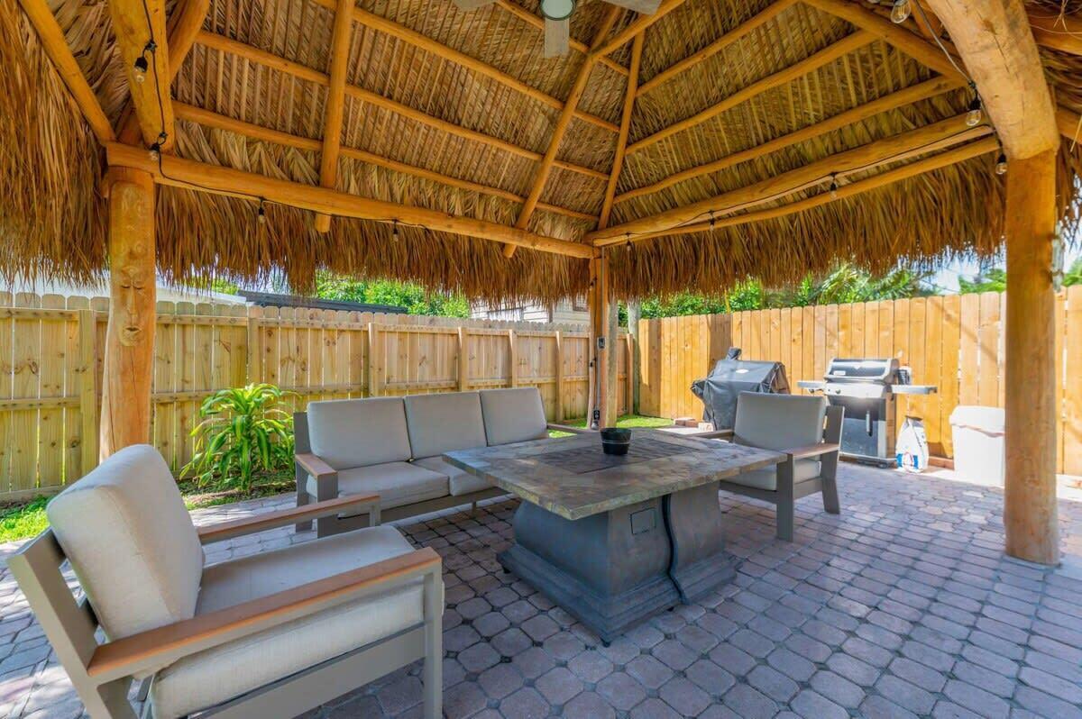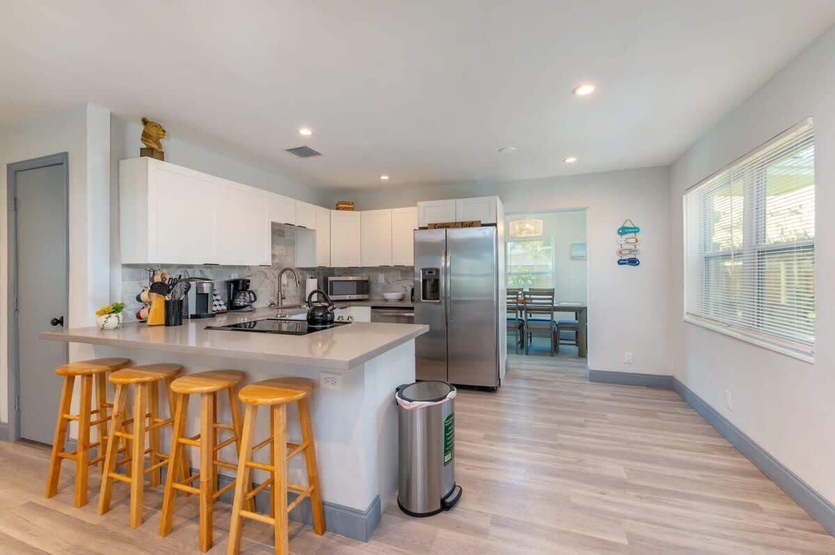 Discover the epitome of coastal living with this exceptional 2-bedroom, 2-bathroom home, nestled in the highly sought-after community of Harbour Village. Perfectly designed for both comfort and convenience, this residence features a fully fenced-in yard, offering ultimate privacy for outdoor living and entertainment. A charming tiki hut adds a touch of tropical elegance, creating an inviting space to unwind or host guests.Inside, you’ll find an open floor plan with a modern kitchen showcasing stainless steel appliances, quartz countertops, and a stylish tile backsplash. Water-resistant flooring runs throughout the home, adding both practicality and sophistication.Situated just a leisurely walk or bike ride from the Pompano Beach Pier, this home provides unparalleled access to the