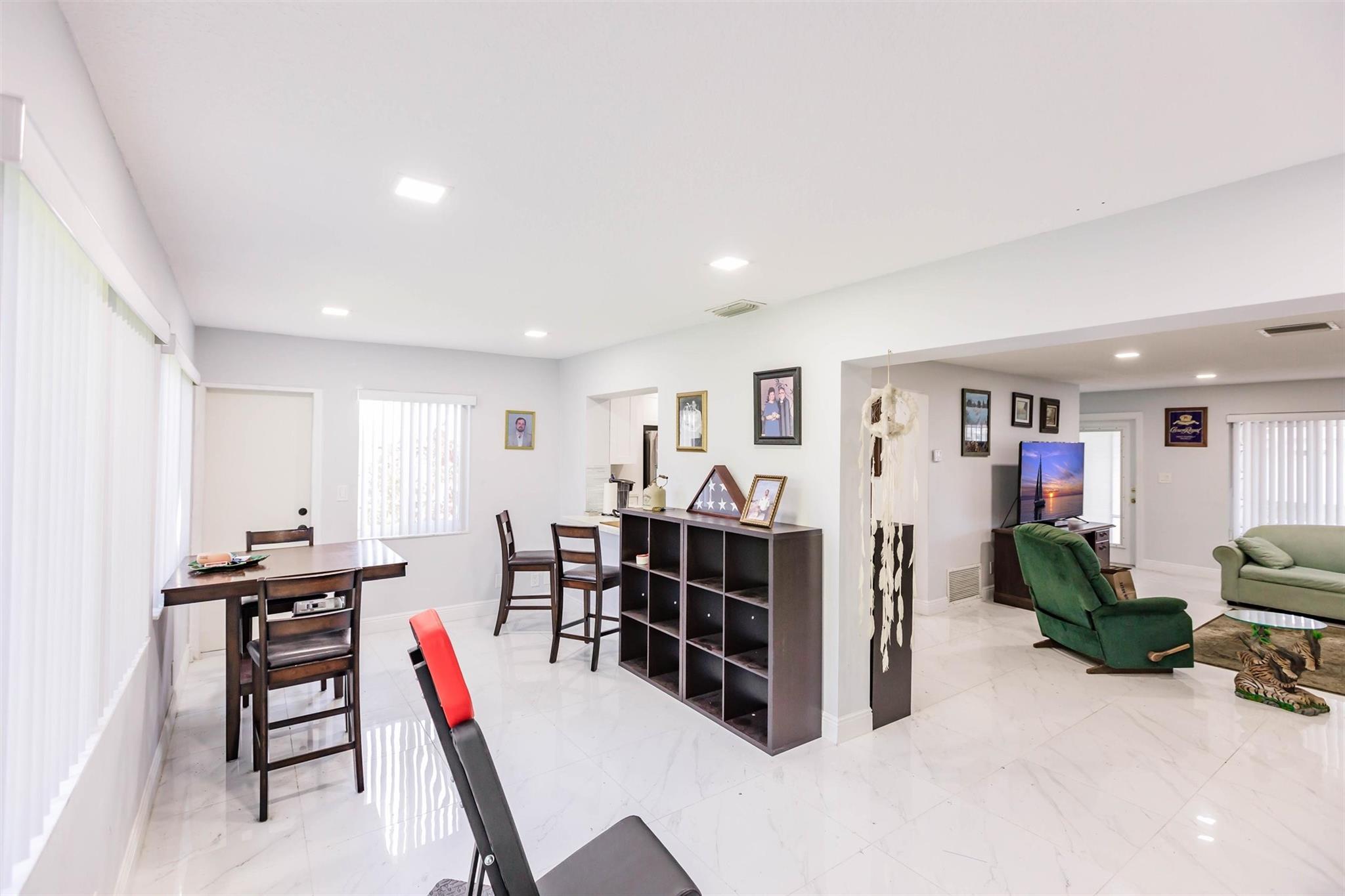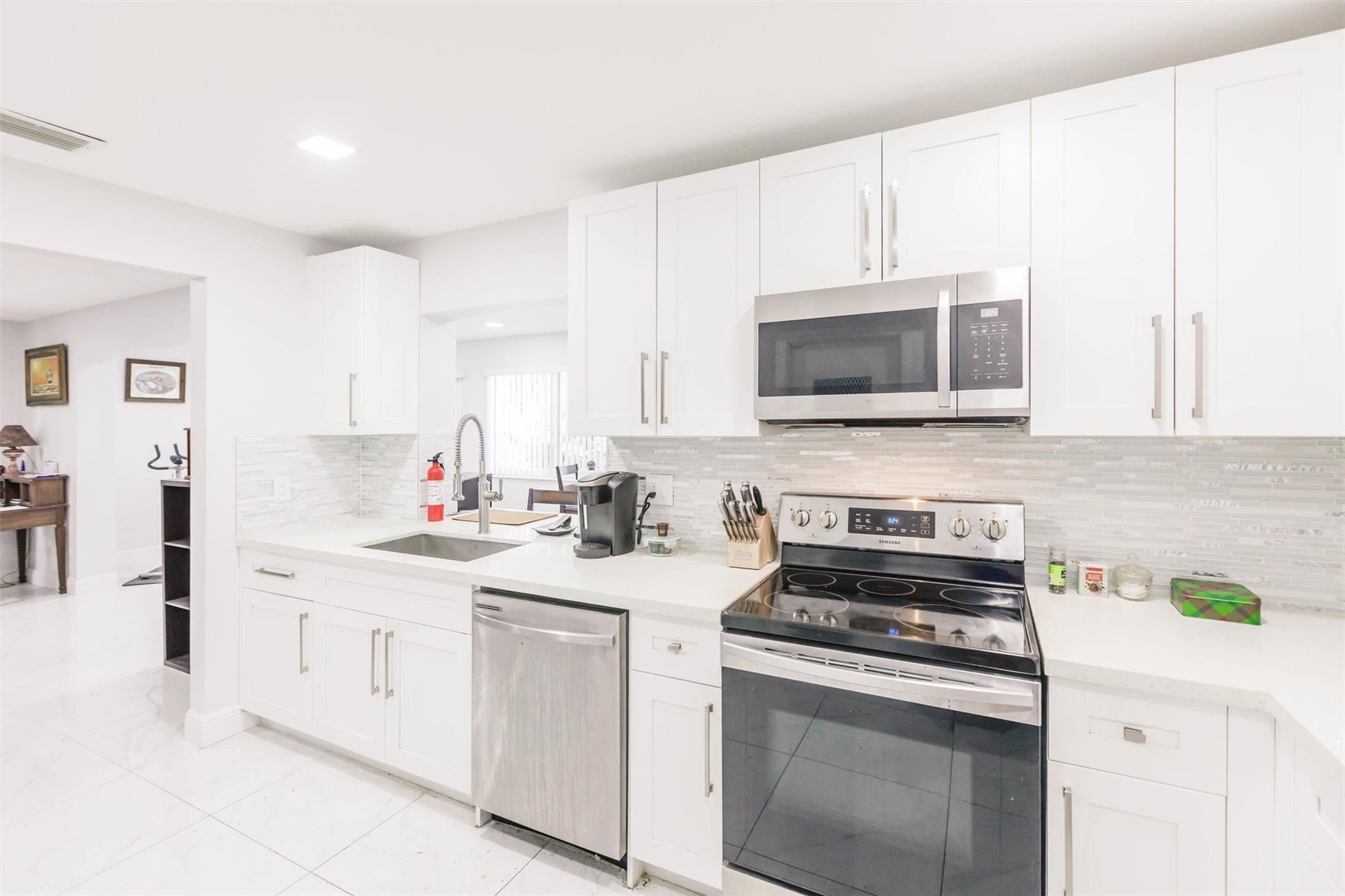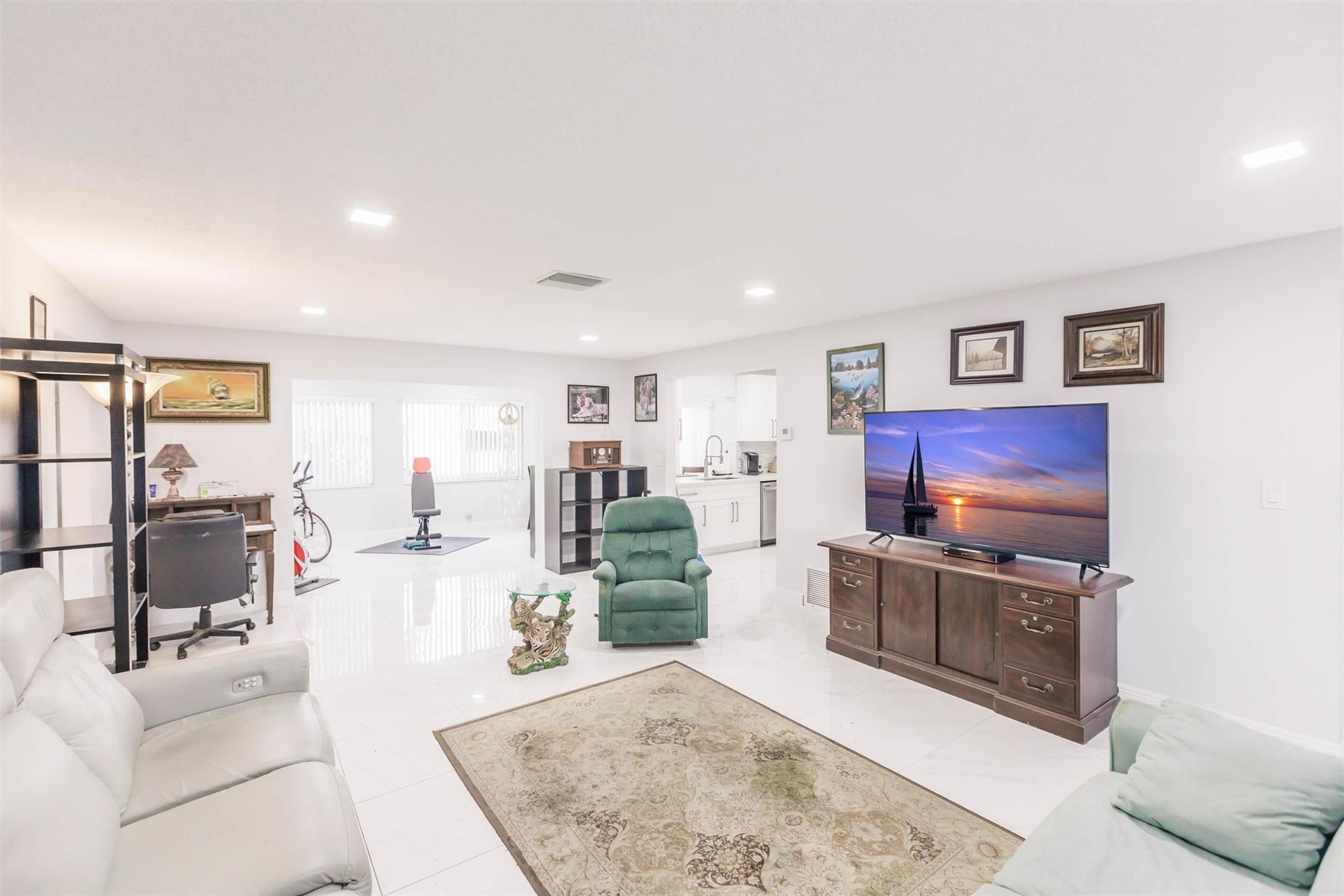 This stunningly renovated 2-bedroom, 2-bath luxury home in Leisureville is the largest model available and truly a must-see! The spacious open floorplan features a 1-car garage and a 2-car wide driveway. Throughout the home, large porcelain tile adds elegance and style. The gourmet kitchen is a chef’s dream with stainless steel appliances and a beautiful backsplash. Enjoy the outdoors with a large covered screened patio in the front and an additional open patio in the back. Situated in a vibrant 55+ community, residents benefit from fantastic amenities such as a free golf course, courtesy bus, and two heated pools. Maintenance is included, covering water, sewer, and lawn care, making for a hassle-free lifestyle. This home offers the perfect balance of luxury, comfort, and community living!