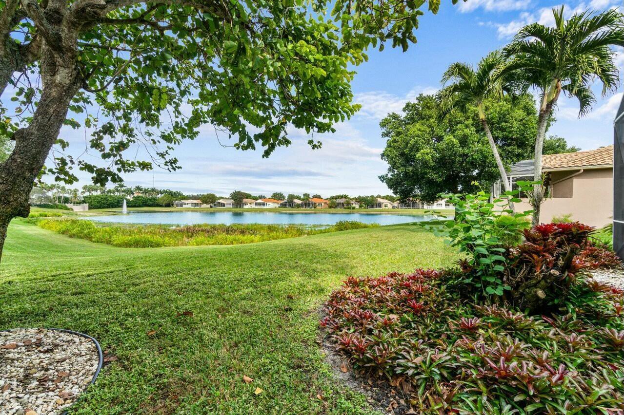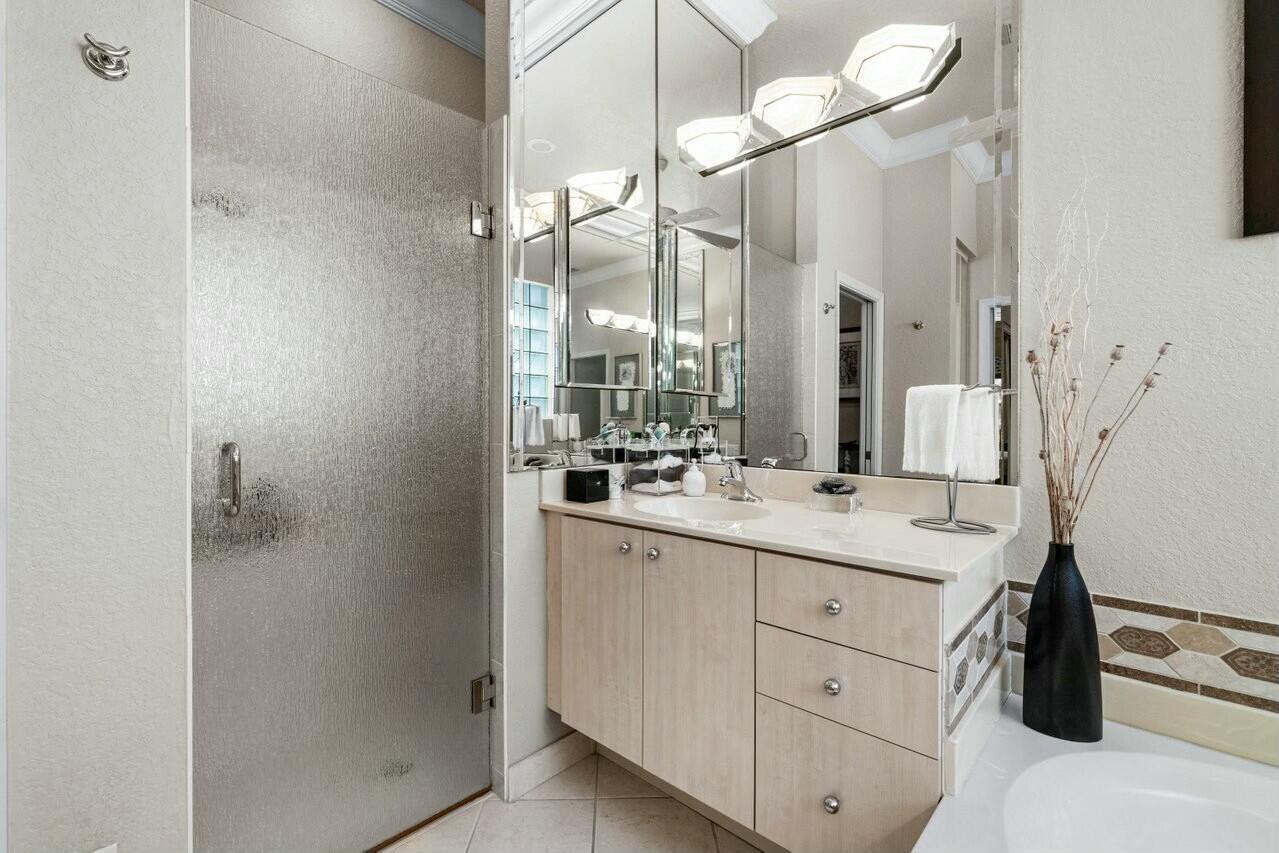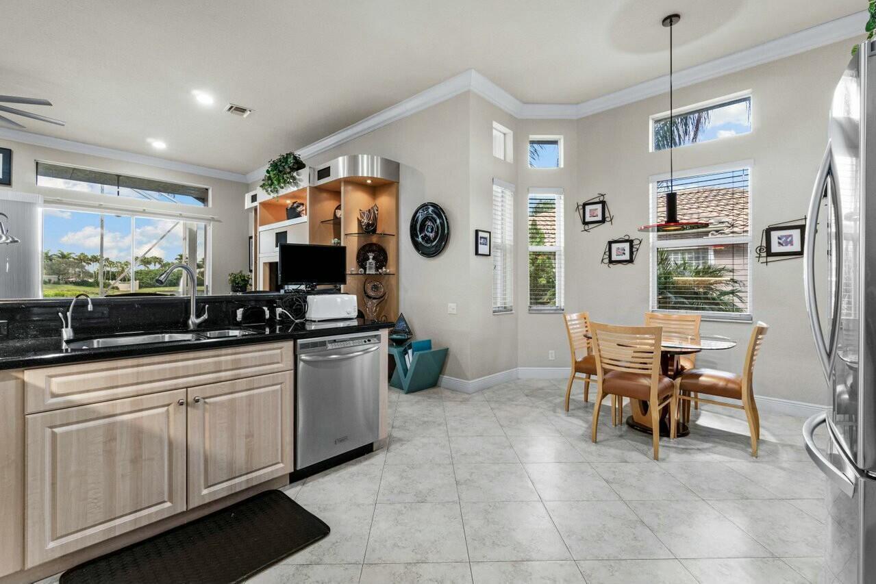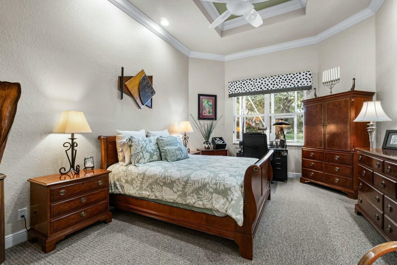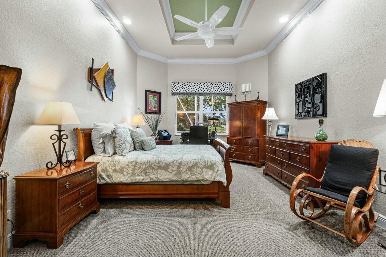 Welcome to your dream home in Bellaggio, an exclusive 55+ resort community. This stunning 3-bed, 2-bath lakefront home is a rare gem, nestled on a cul-de-sac with no neighbors on three sides. The third bedroom is currently set up as an office/den. The elongated driveway leads to glass-etched doors opening into a roomy foyer. Tile on the diagonal thru all but the bedrooms. The spacious, open-concept floor plan features high ceilings, crown moldings, and trey ceiling in the primary. The large eat-in kitchen features stainless-steel appliances, half bevel-edge granite countertops and bar stool seating. The primary bedroom has two walk-in closets with custom shelving. The ensuite bathroom features dual vanity, jetted tub and separate shower. The guest bedroom has custom shelving and closets