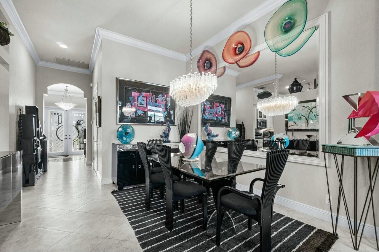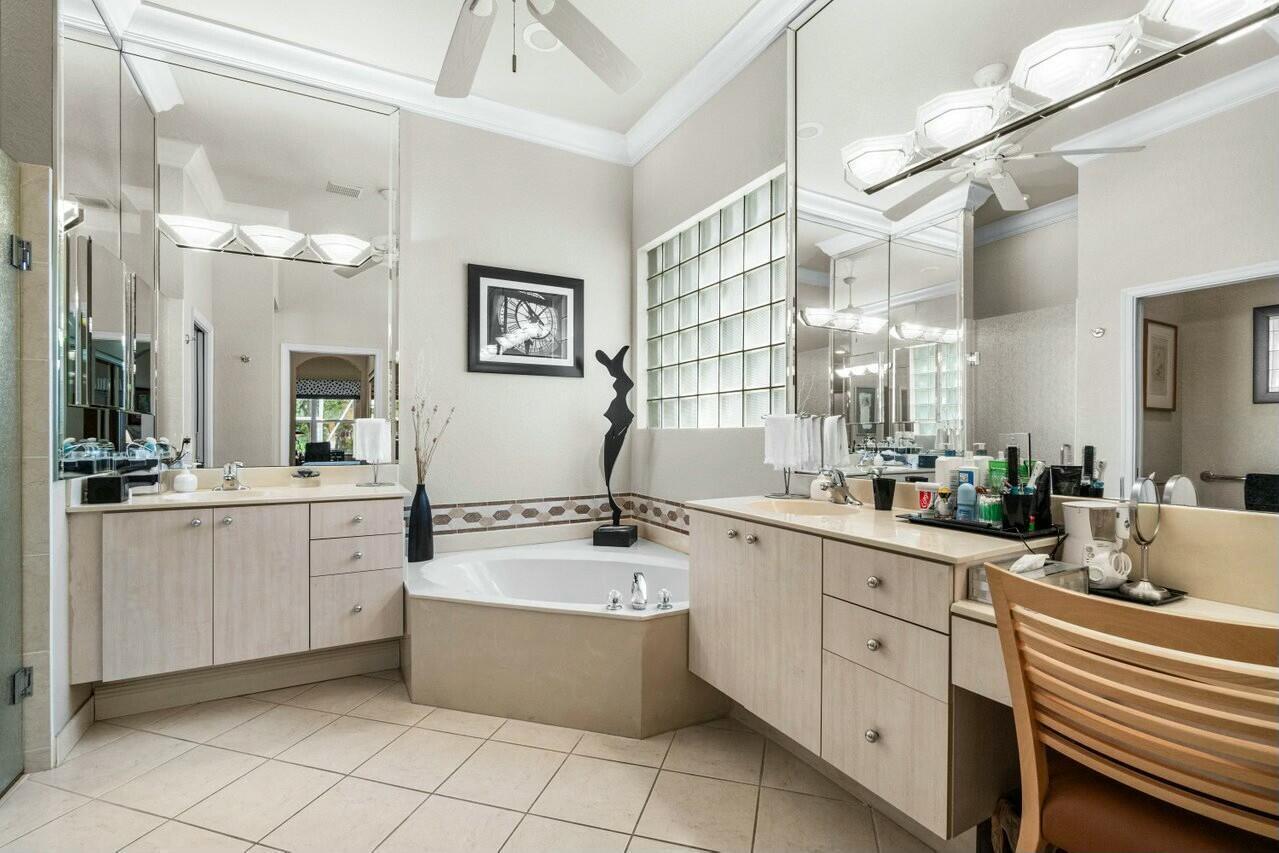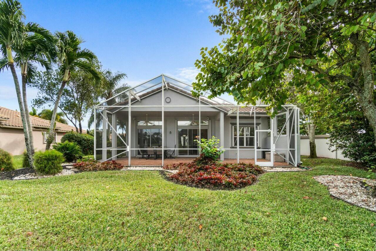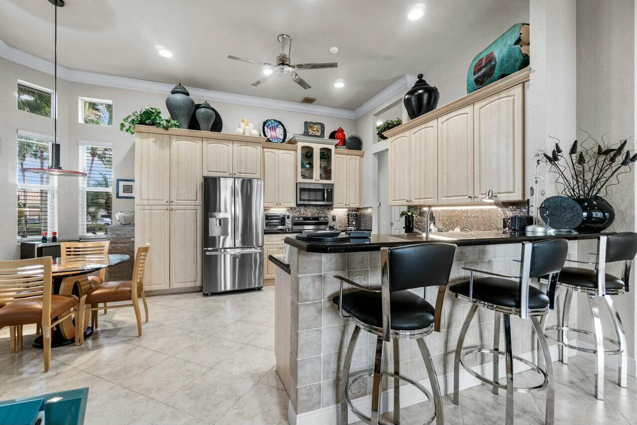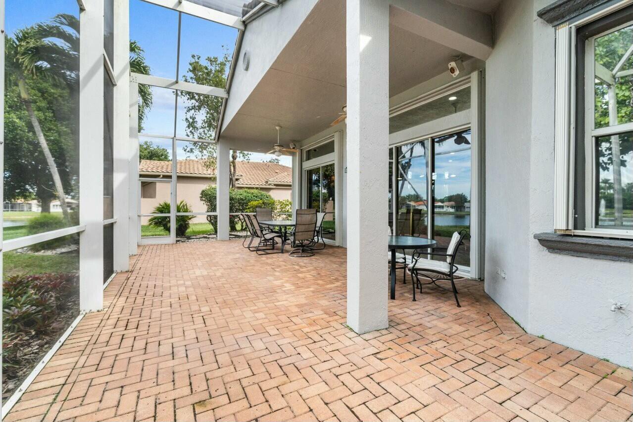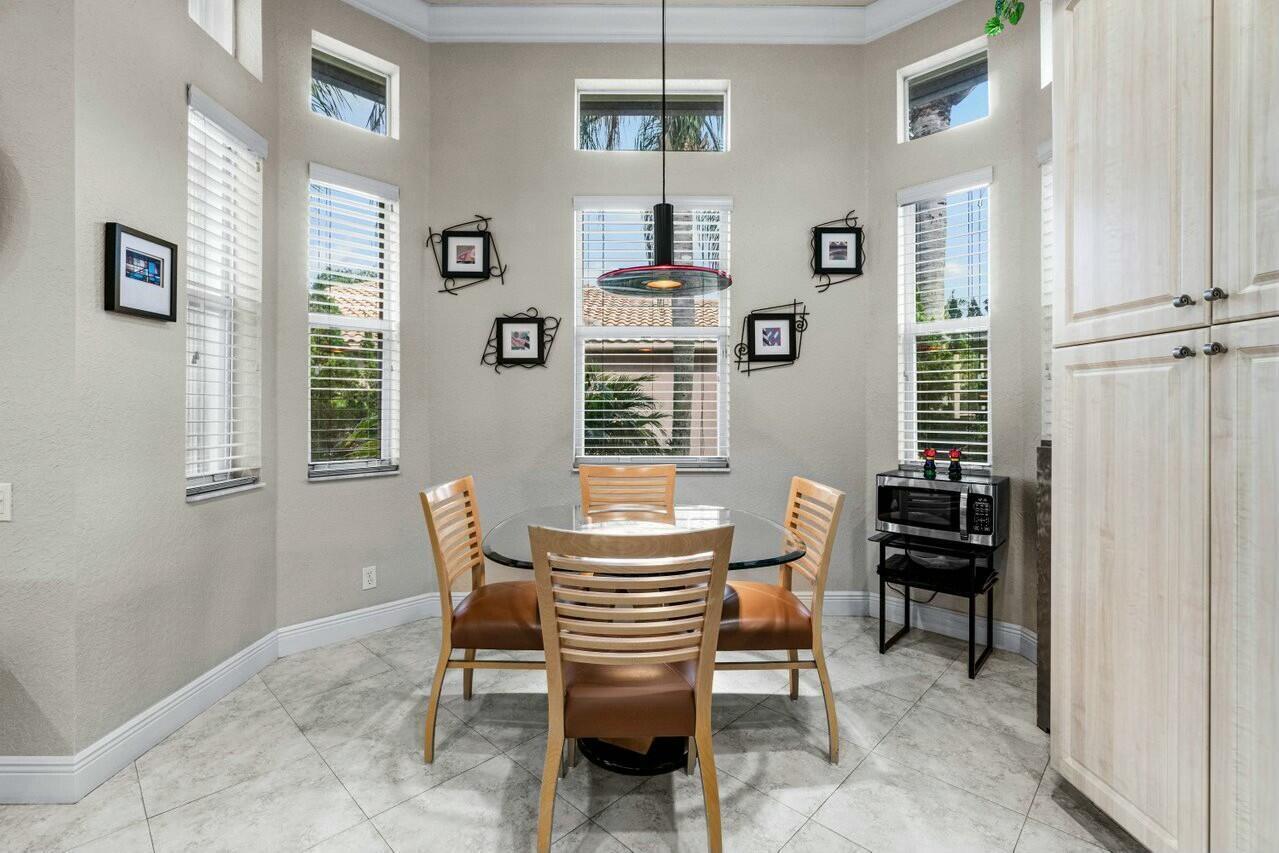 Welcome to your dream home in Bellaggio, an exclusive 55+ resort community. This stunning 3-bed, 2-bath lakefront home is a rare gem, nestled on a cul-de-sac with no neighbors on three sides. The third bedroom is currently set up as an office/den. The elongated driveway leads to glass-etched doors opening into a roomy foyer. Tile on the diagonal thru all but the bedrooms. The spacious, open-concept floor plan features high ceilings, crown moldings, and trey ceiling in the primary. The large eat-in kitchen features stainless-steel appliances, half bevel-edge granite countertops and bar stool seating. The primary bedroom has two walk-in closets with custom shelving. The ensuite bathroom features dual vanity, jetted tub and separate shower. The guest bedroom has custom shelving and closets