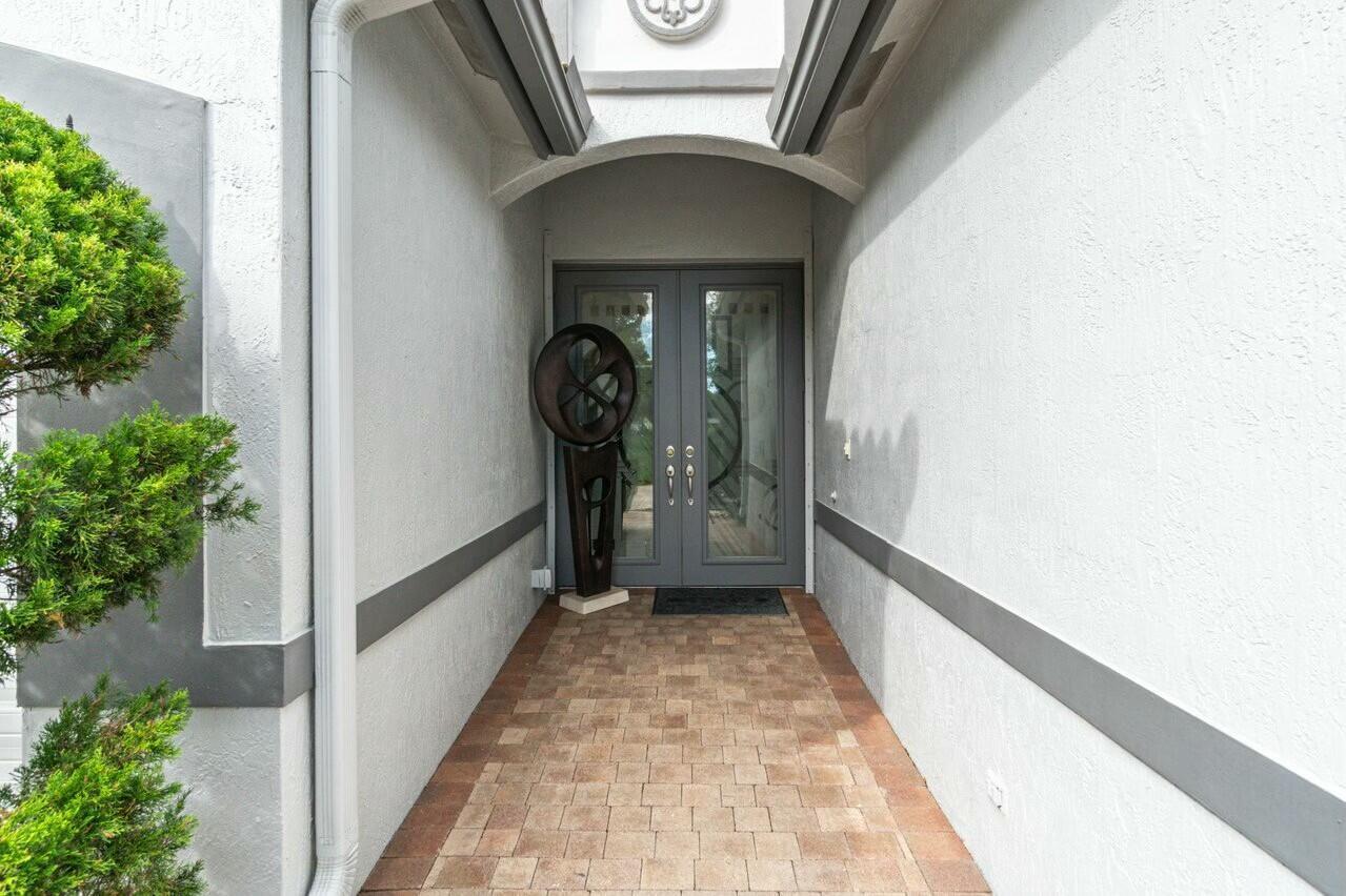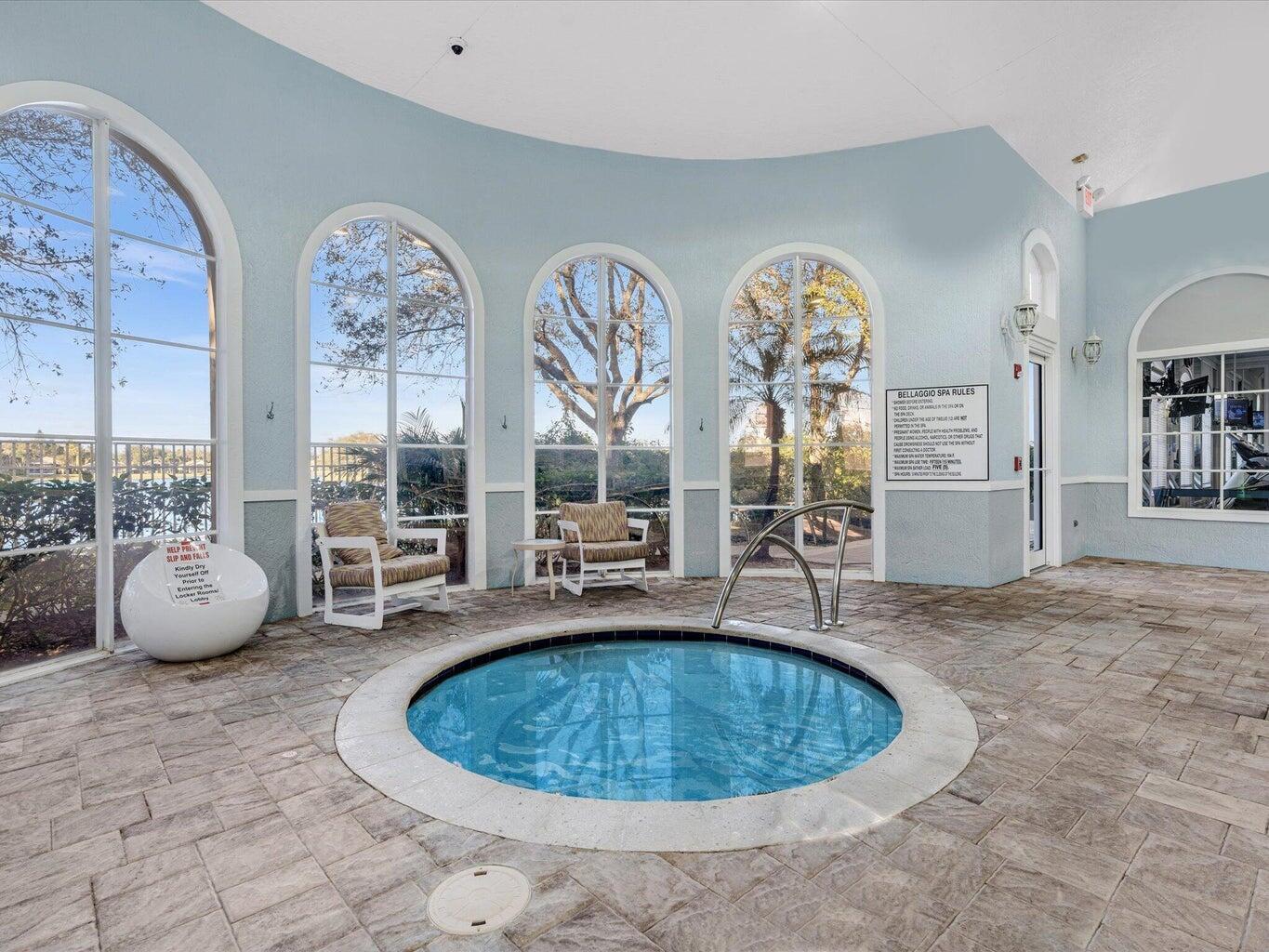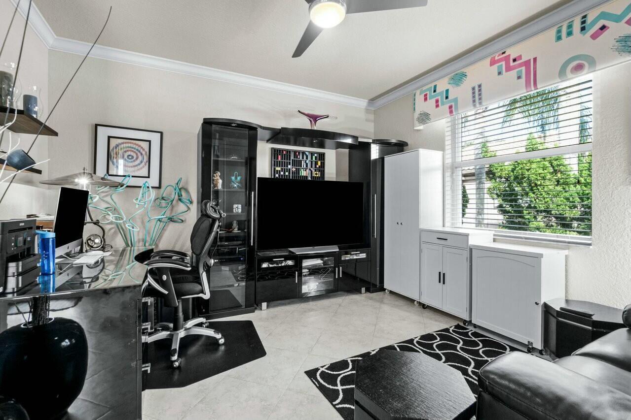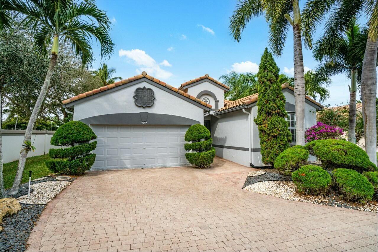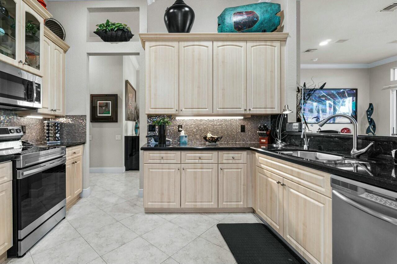 Welcome to your dream home in Bellaggio, an exclusive 55+ resort community. This stunning 3-bed, 2-bath lakefront home is a rare gem, nestled on a cul-de-sac with no neighbors on three sides. The third bedroom is currently set up as an office/den. The elongated driveway leads to glass-etched doors opening into a roomy foyer. Tile on the diagonal thru all but the bedrooms. The spacious, open-concept floor plan features high ceilings, crown moldings, and trey ceiling in the primary. The large eat-in kitchen features stainless-steel appliances, half bevel-edge granite countertops and bar stool seating. The primary bedroom has two walk-in closets with custom shelving. The ensuite bathroom features dual vanity, jetted tub and separate shower. The guest bedroom has custom shelving and closets