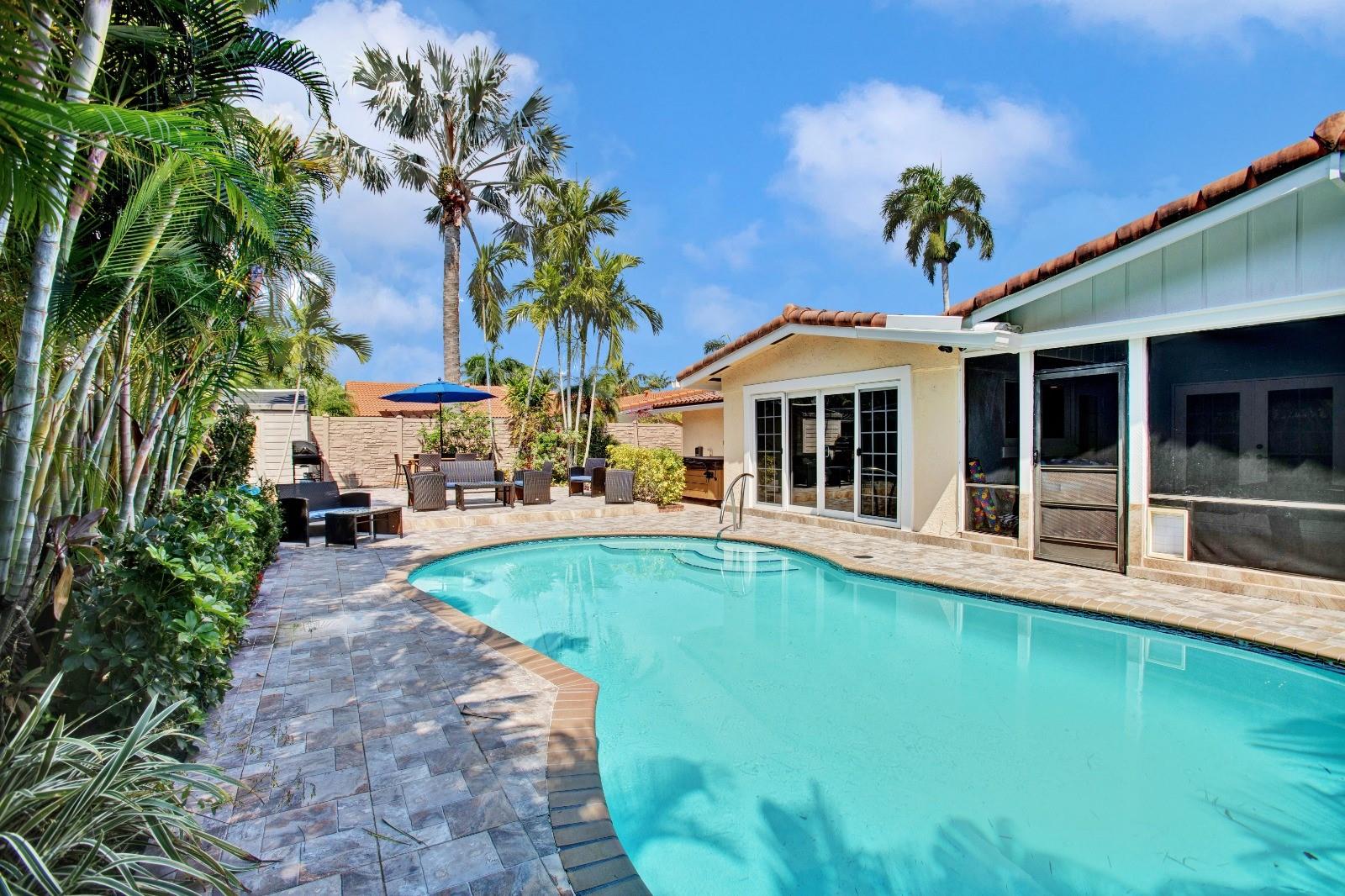 “THE COVE” Less than a mile to the BEACH, COMPLETLEY FURNISHED down to the sheets! Impeccably maintained 3 Bed 2 Bath Pool Home in the Cove. Too much to list, Circular Drive way & 1 Car Garage, bright open floor plan, IMPACT windows, Doors & Garage door, CUSTOM DESIGNED Double Impact Front Door, Custom Built in Closet, Large Screened Patio overlooking the amazing Salt Water/HEATED pool, Hot Tub, Lush tropical landscaping, HUGE walk in Shed & MUCH, MUCH More. Did I mention all the AMAZING Furniture less than a year old that comes with it? This house is ready to move into or start your own 5 Star Rated AIRBNB Business. No HOA Means NO restrictions on renting & No Fees. Take a short Bike ride or Golf cart to the Beach. Grocery stores, restaurants, bars, gas stations are all walking distance.