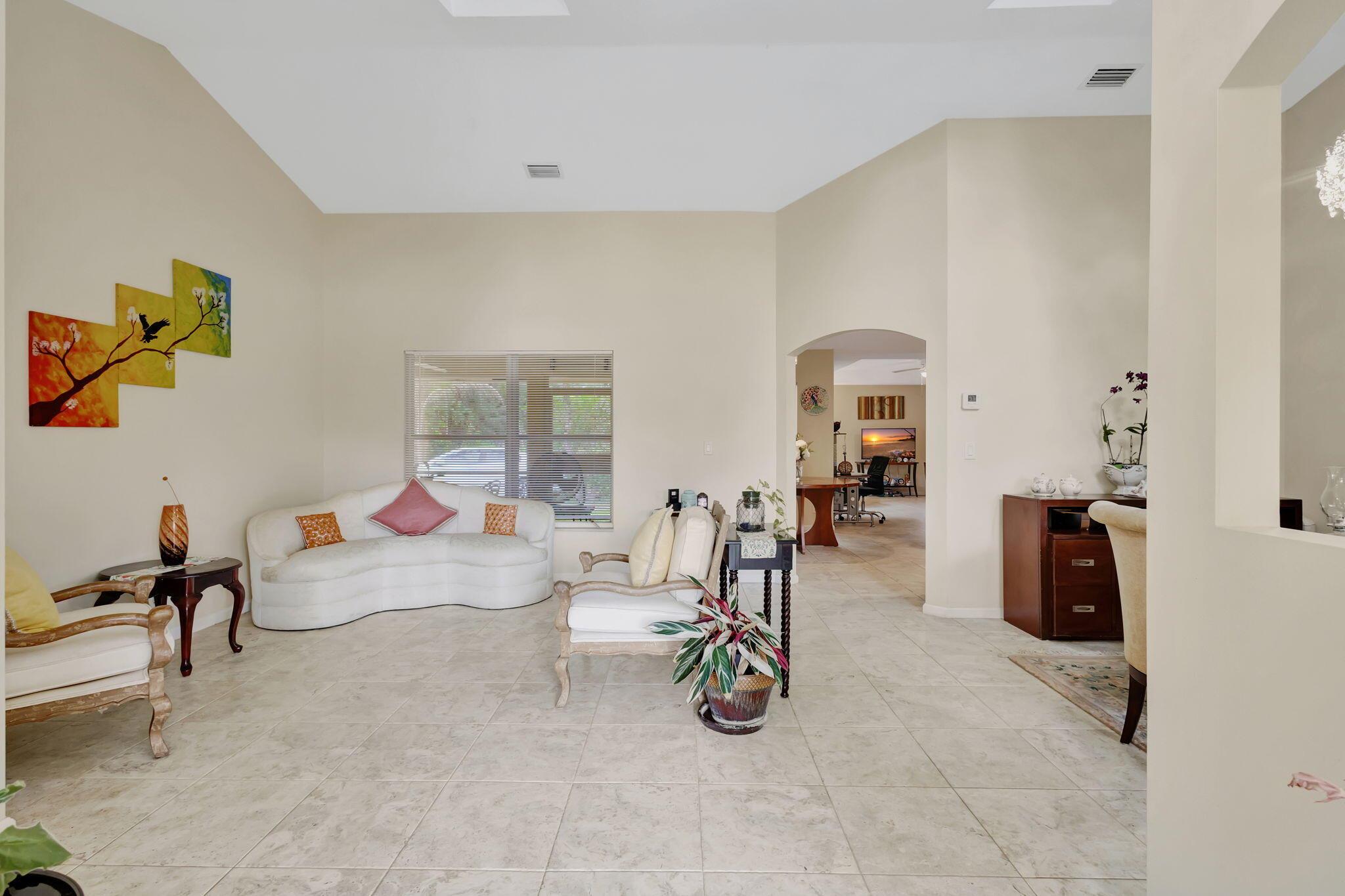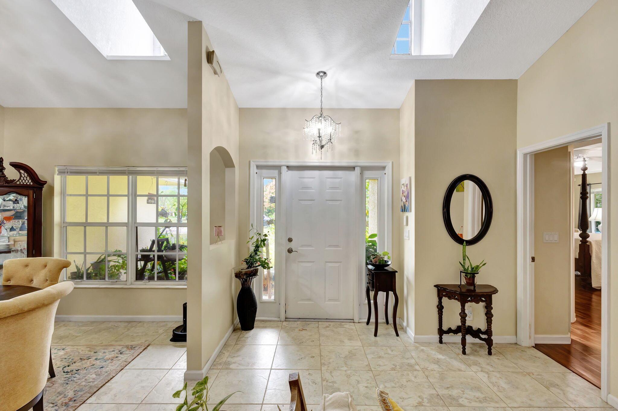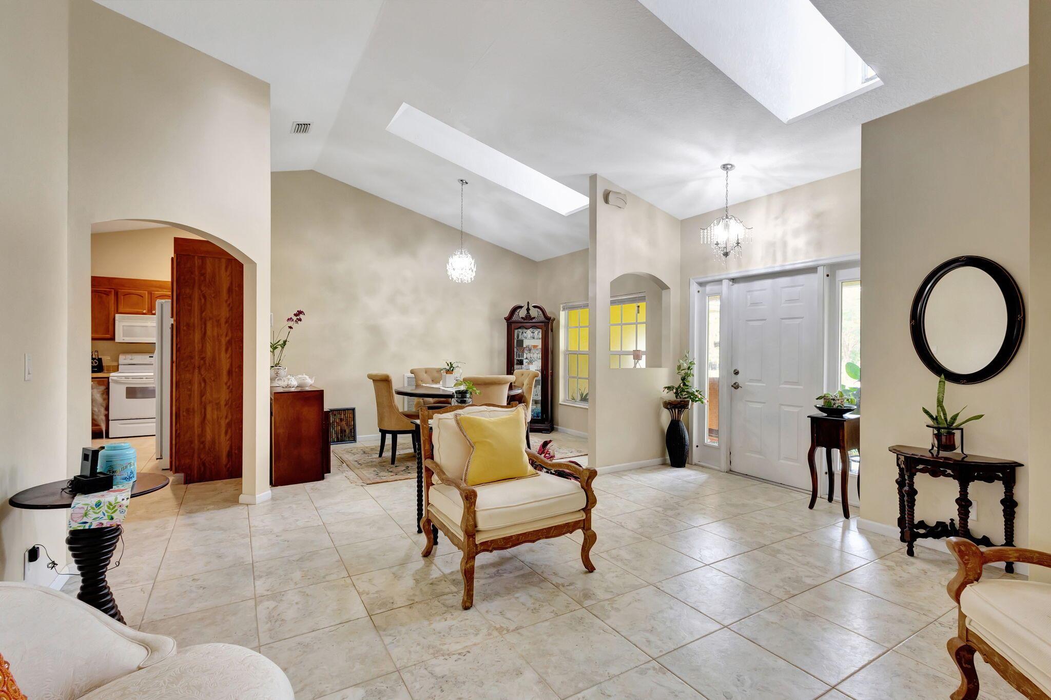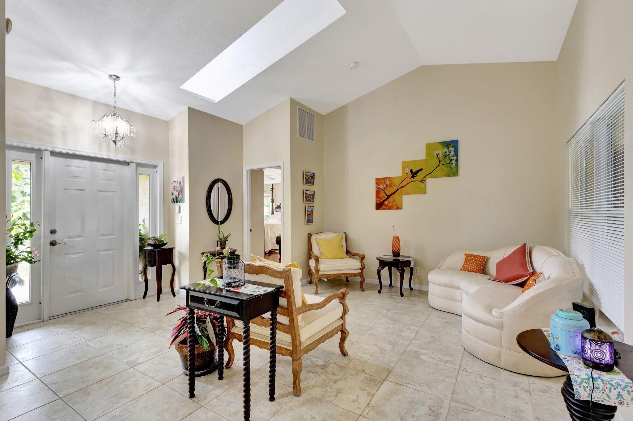 Beautiful 3-bedroom, 2-bathroom single-story home with a 2-car garage, boasting an open and airy floor plan. Enjoy high and vaulted ceilings, skylights, and tile floors throughout, with real wood floors in the master and wood-look tiles in the secondary bedrooms. The spacious living areas flow seamlessly to a large covered, screened porch, perfect for relaxing or entertaining. Nestled in a lush garden with fruit trees, this home is a serene retreat while offering modern style and comfort. Exterior and Interior painted 2018. New reverse osmosis whole house water treatment system installed 2021. New AC installed 2022.