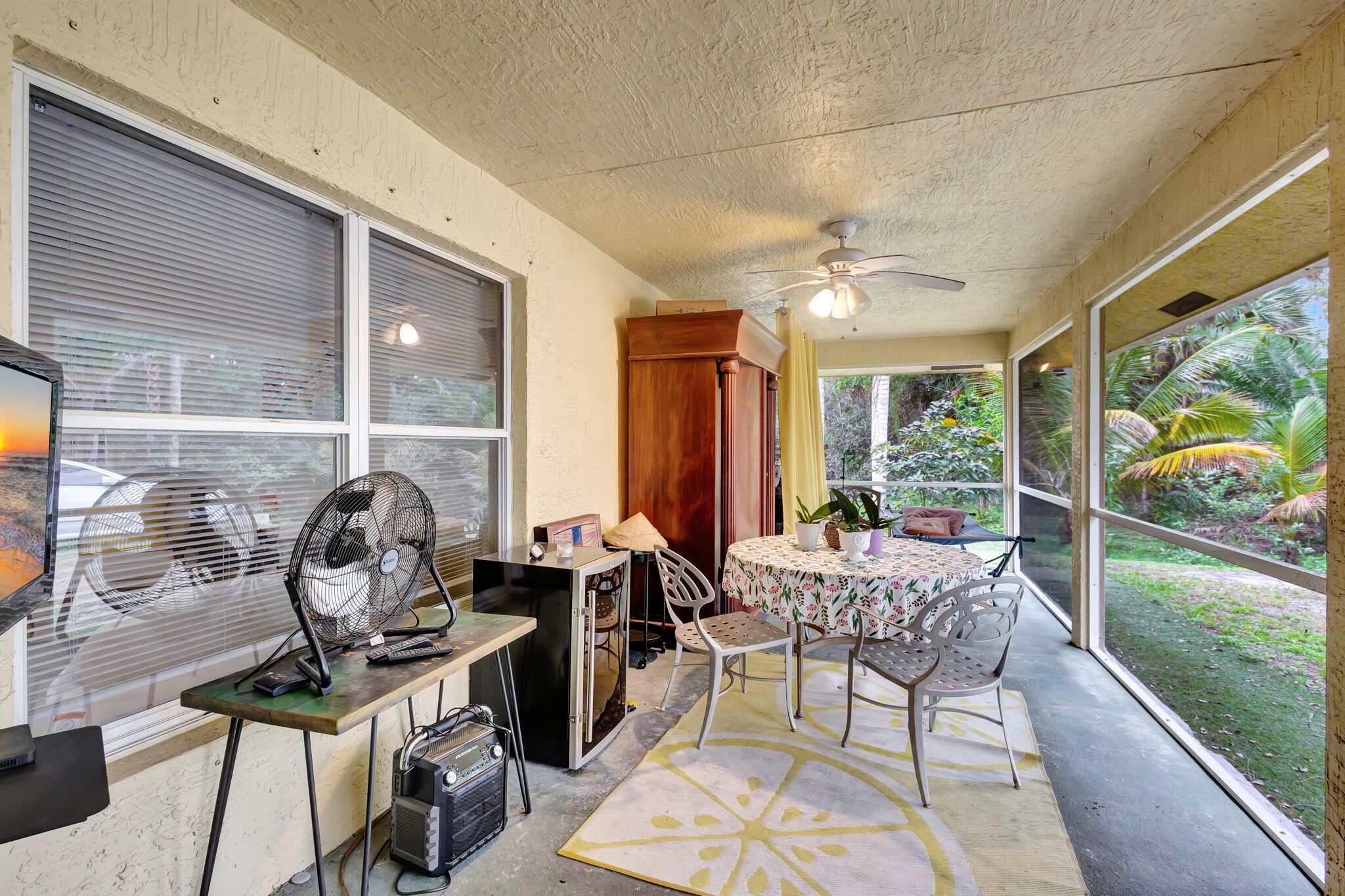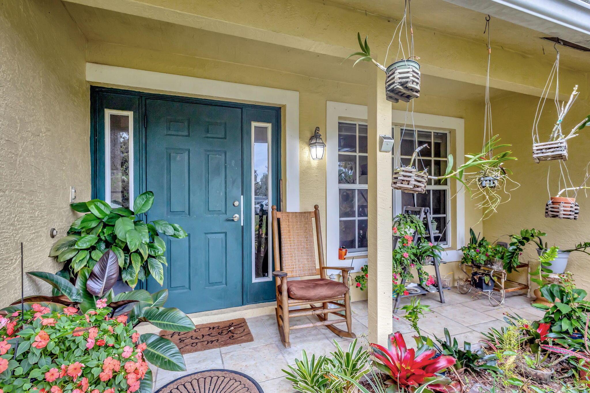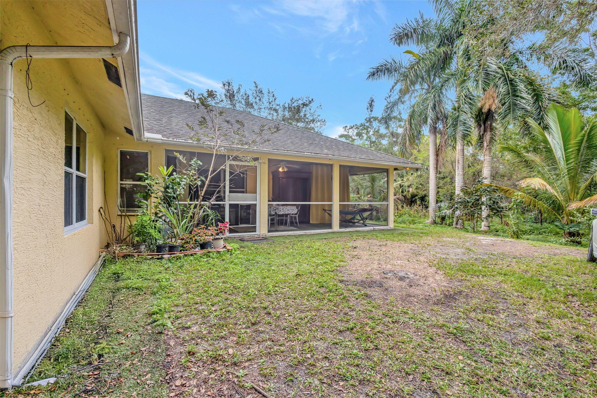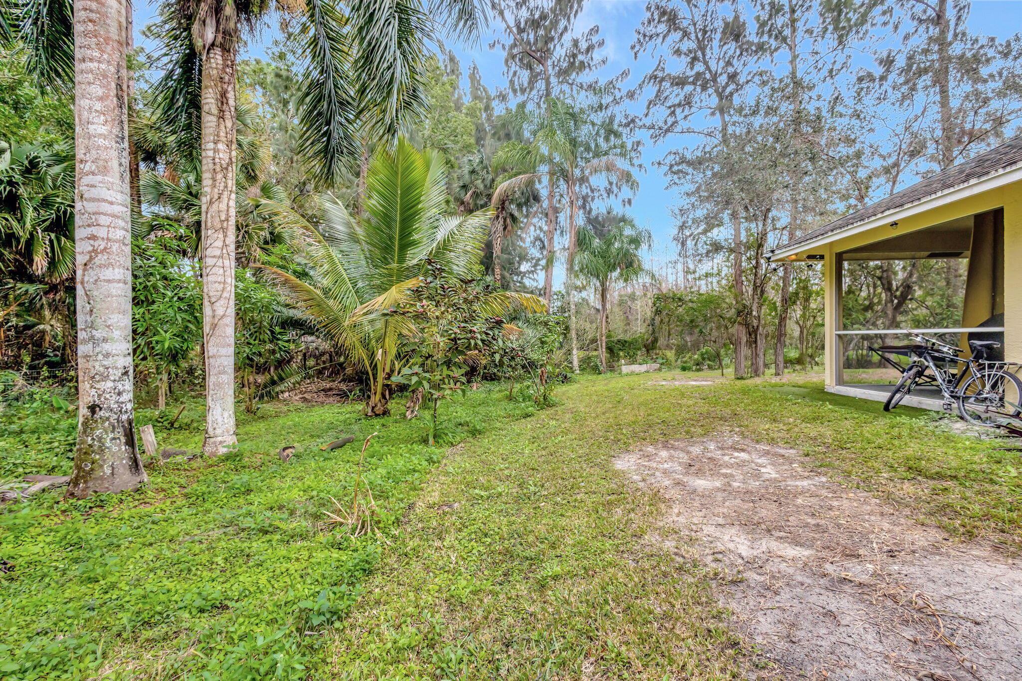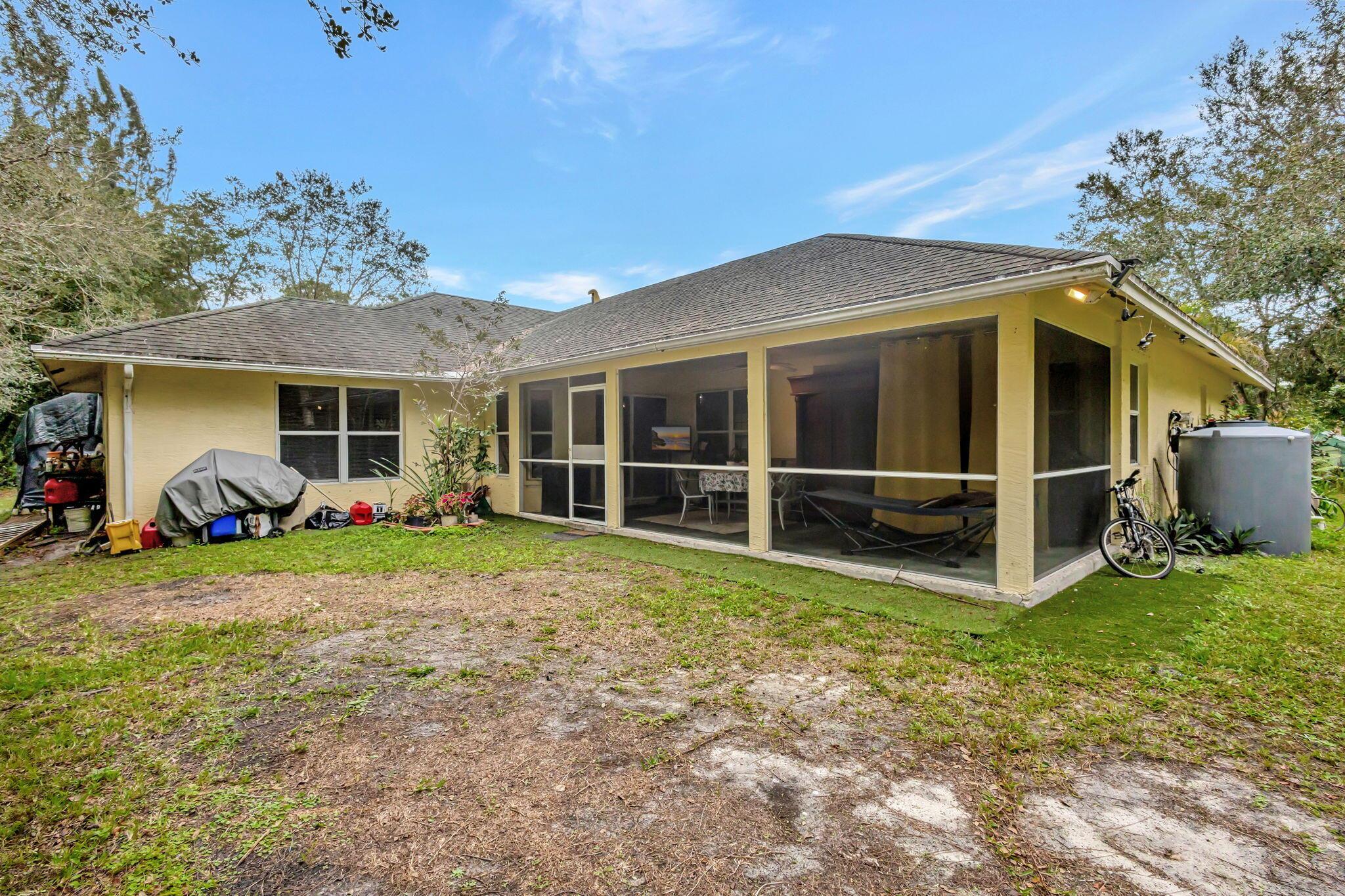 Beautiful 3-bedroom, 2-bathroom single-story home with a 2-car garage, boasting an open and airy floor plan. Enjoy high and vaulted ceilings, skylights, and tile floors throughout, with real wood floors in the master and wood-look tiles in the secondary bedrooms. The spacious living areas flow seamlessly to a large covered, screened porch, perfect for relaxing or entertaining. Nestled in a lush garden with fruit trees, this home is a serene retreat while offering modern style and comfort. Exterior and Interior painted 2018. New reverse osmosis whole house water treatment system installed 2021. New AC installed 2022.