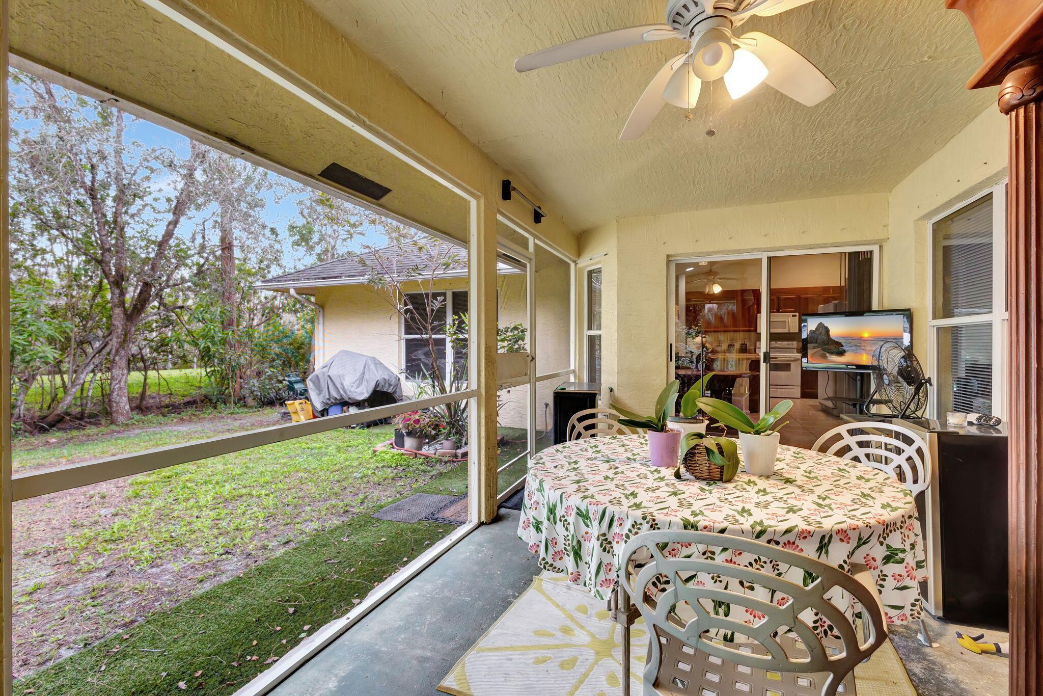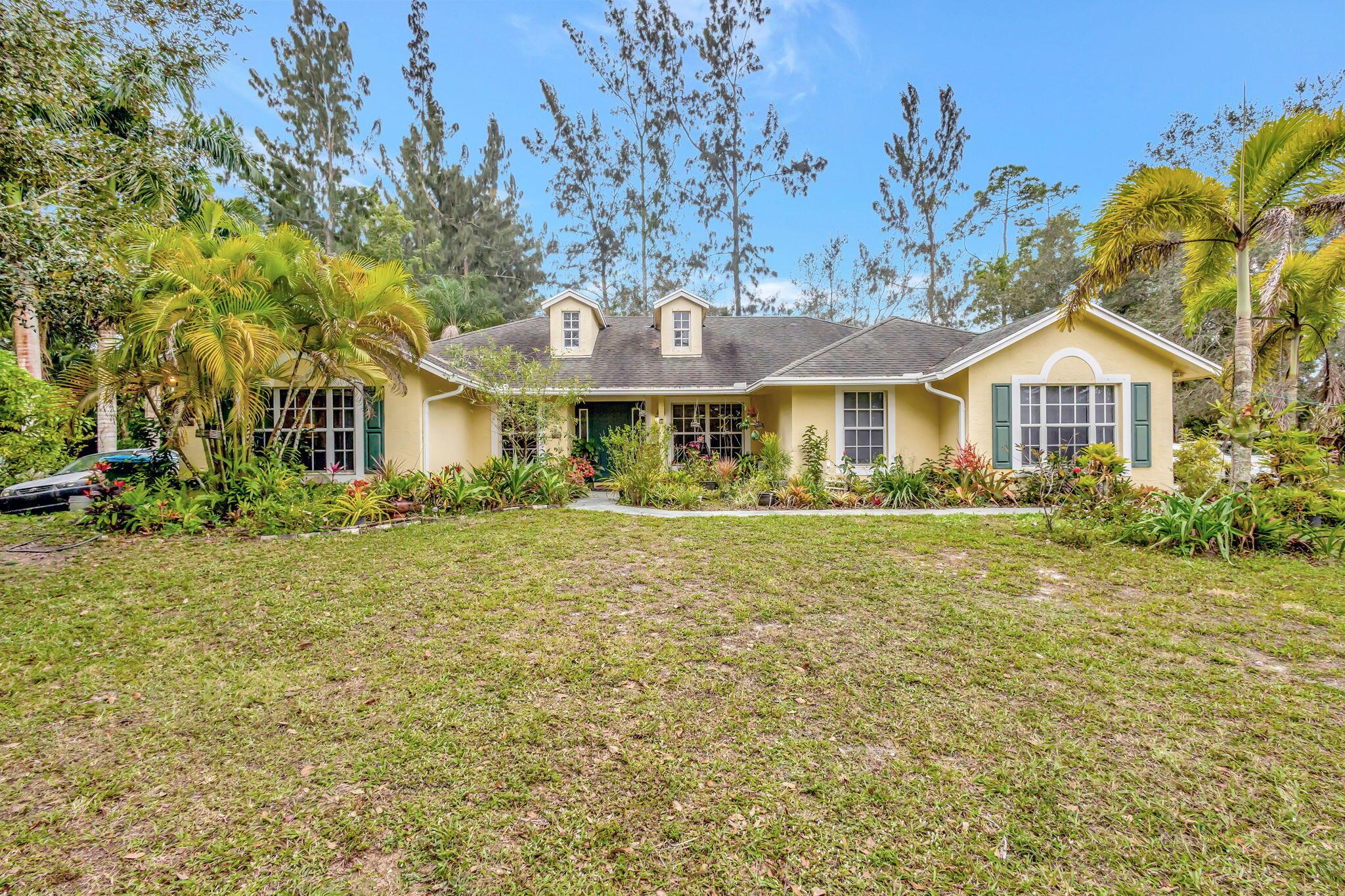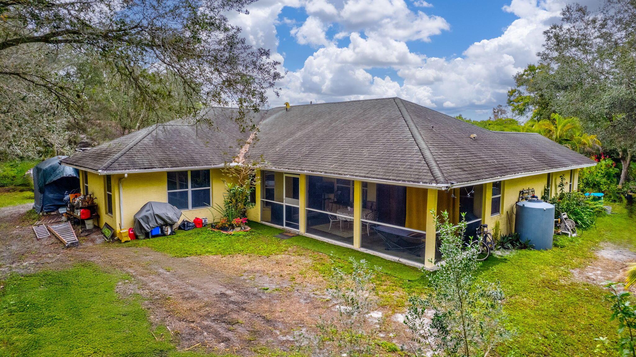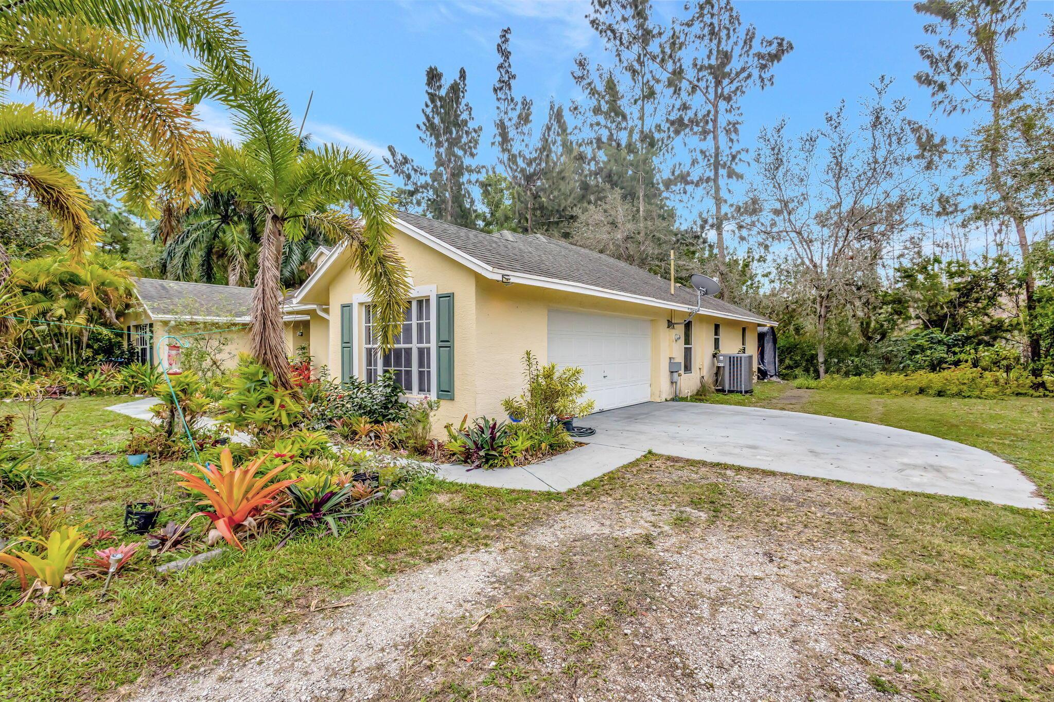 Beautiful 3-bedroom, 2-bathroom single-story home with a 2-car garage, boasting an open and airy floor plan. Enjoy high and vaulted ceilings, skylights, and tile floors throughout, with real wood floors in the master and wood-look tiles in the secondary bedrooms. The spacious living areas flow seamlessly to a large covered, screened porch, perfect for relaxing or entertaining. Nestled in a lush garden with fruit trees, this home is a serene retreat while offering modern style and comfort. Exterior and Interior painted 2018. New reverse osmosis whole house water treatment system installed 2021. New AC installed 2022.
