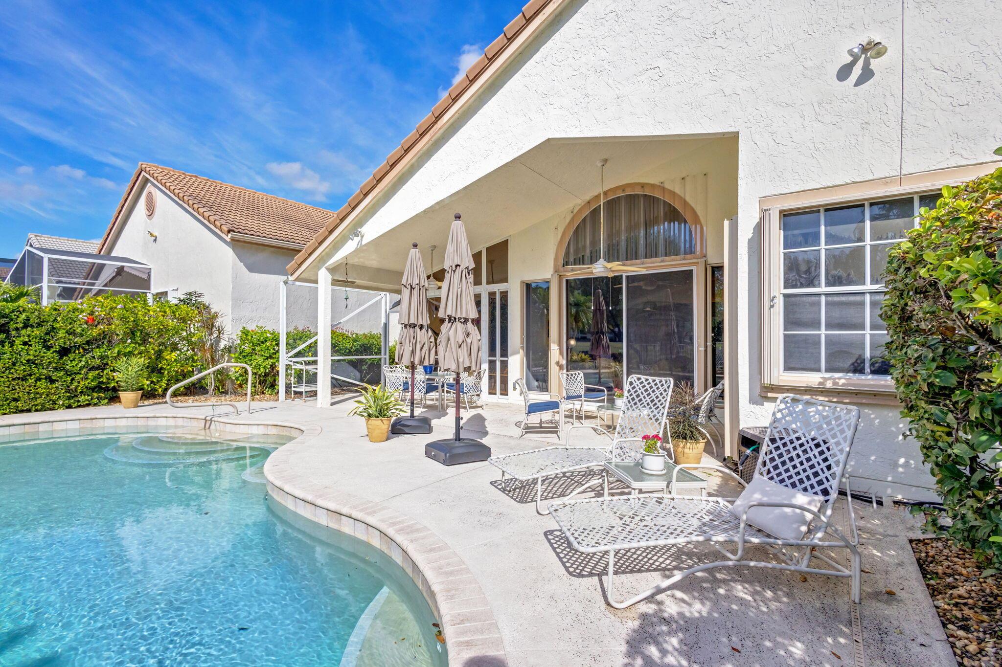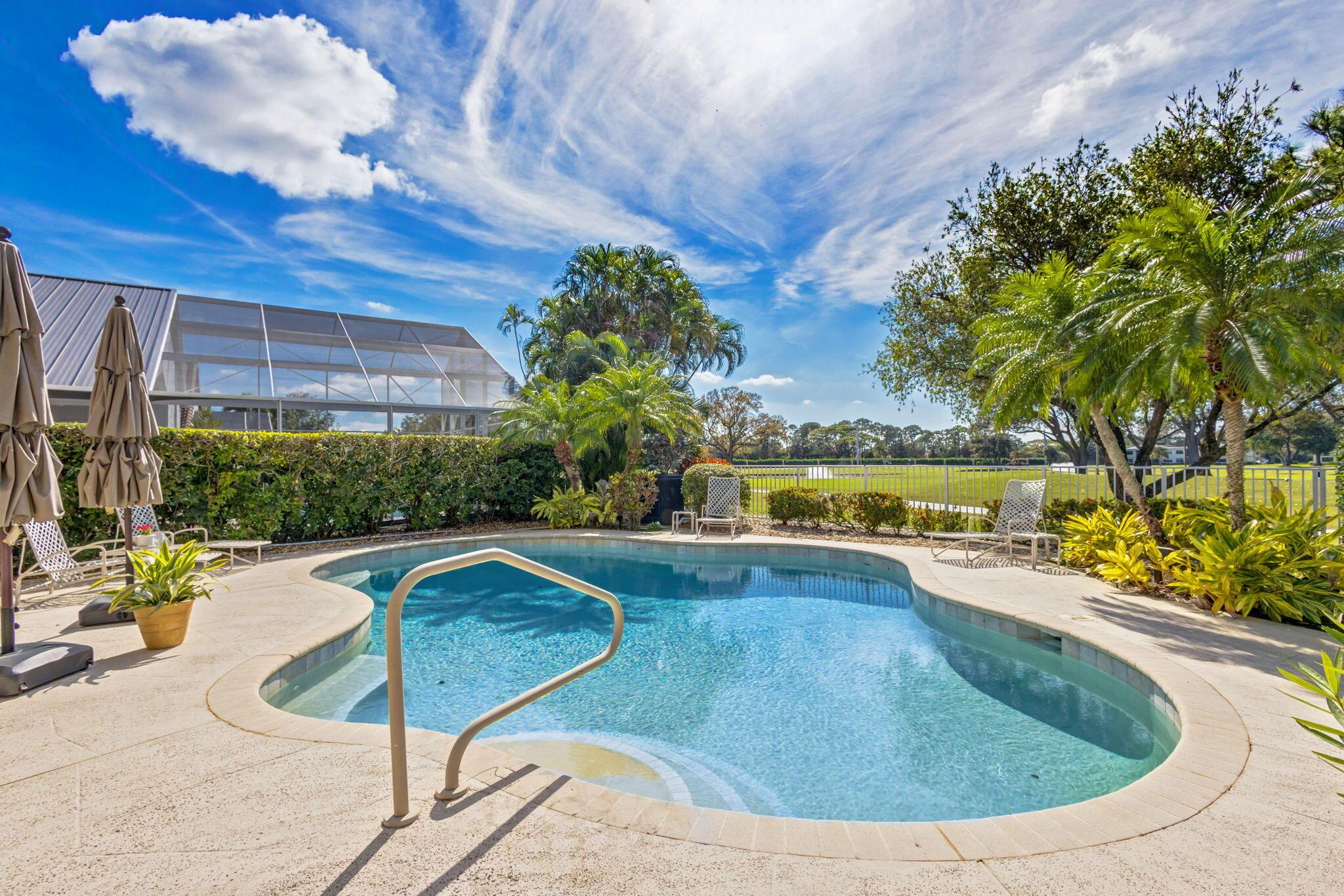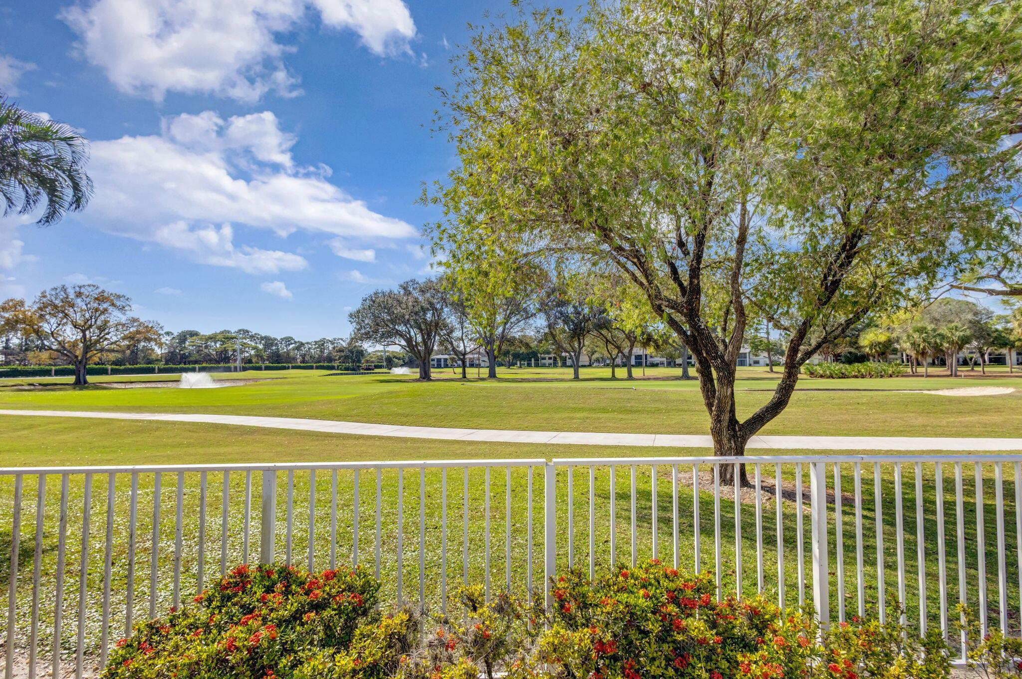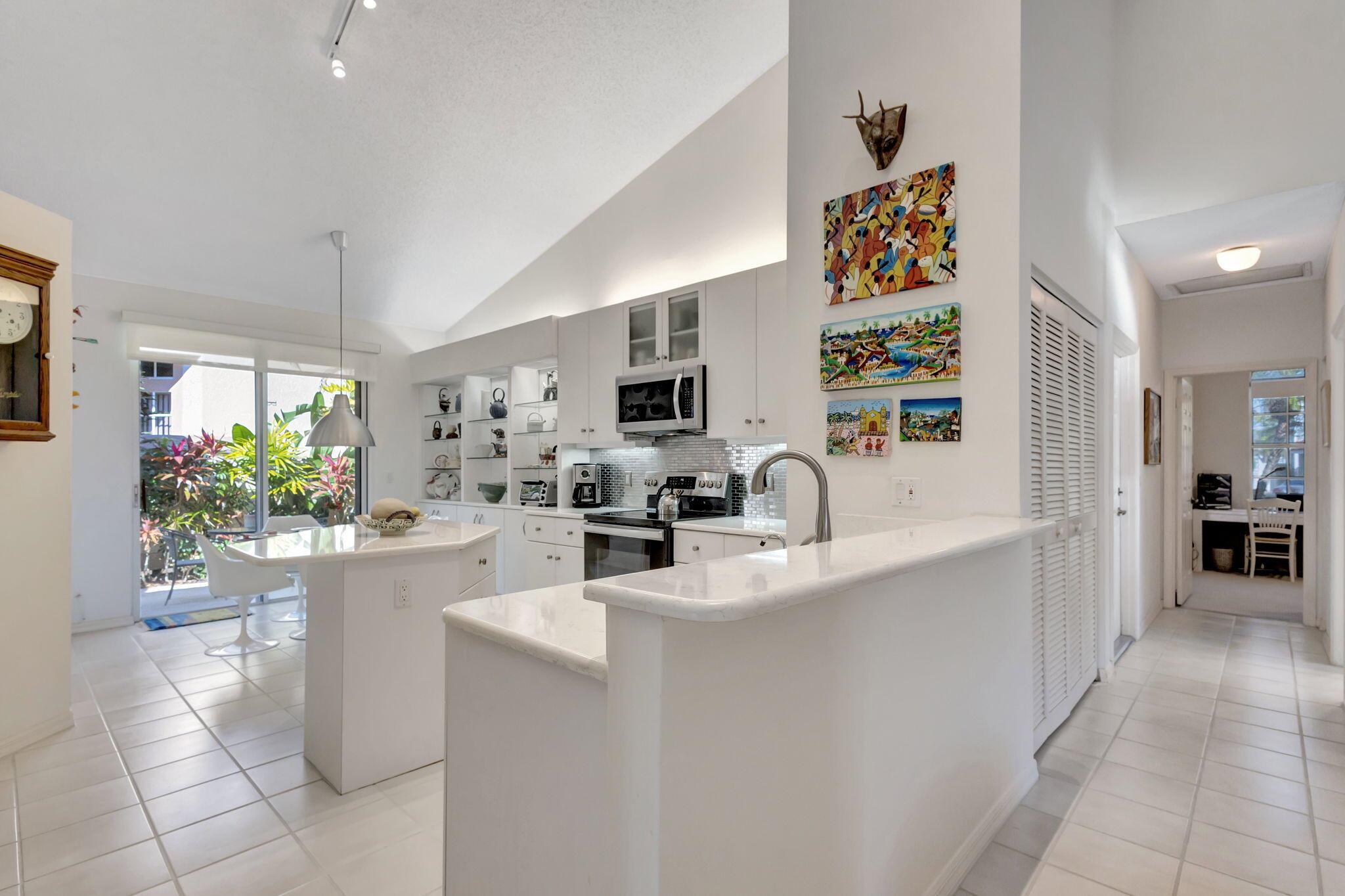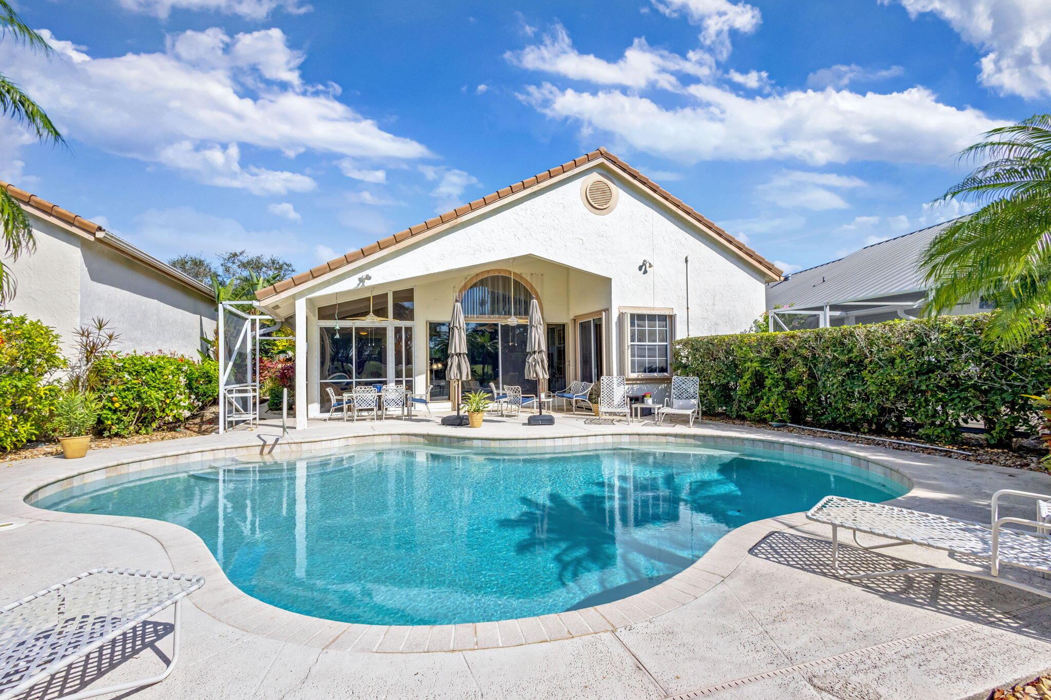 This beautifully designed lush landscaped Pool home serves light and bright with 2-bedrooms, 2-baths and a den that can be easily converted to 3rd bedroom, baths remodeled. Perfectly situated along a double fairway in the prestigious Eastpointe Country Club of Palm Beach Gardens. With western exposure, this home offers breathtaking sunsets over the lush golf course. Step inside to an open-concept floor plan with vaulted ceilings filling the home with natural light, featuring a split-bedroom layout for privacy and comfort. The chef’s kitchen boasts high-end appliances, ample counter space, island for prepping and an eat-in breakfast area, making it perfect for both casual and gourmet dining. Adjacent to the kitchen, a formal dining room provides an elegant setting for entertaining.
