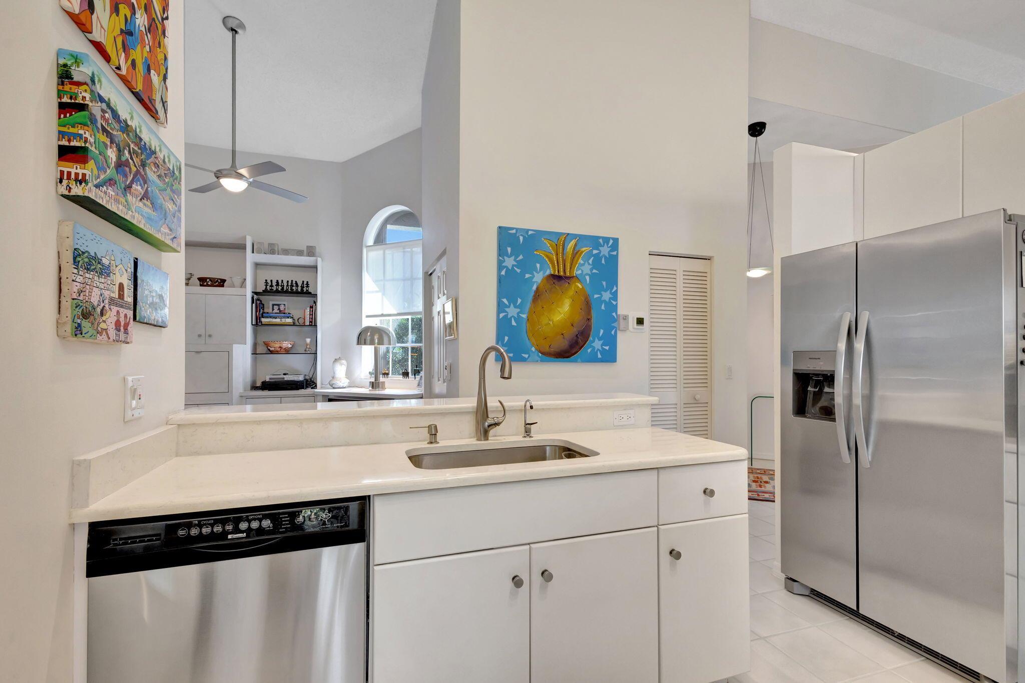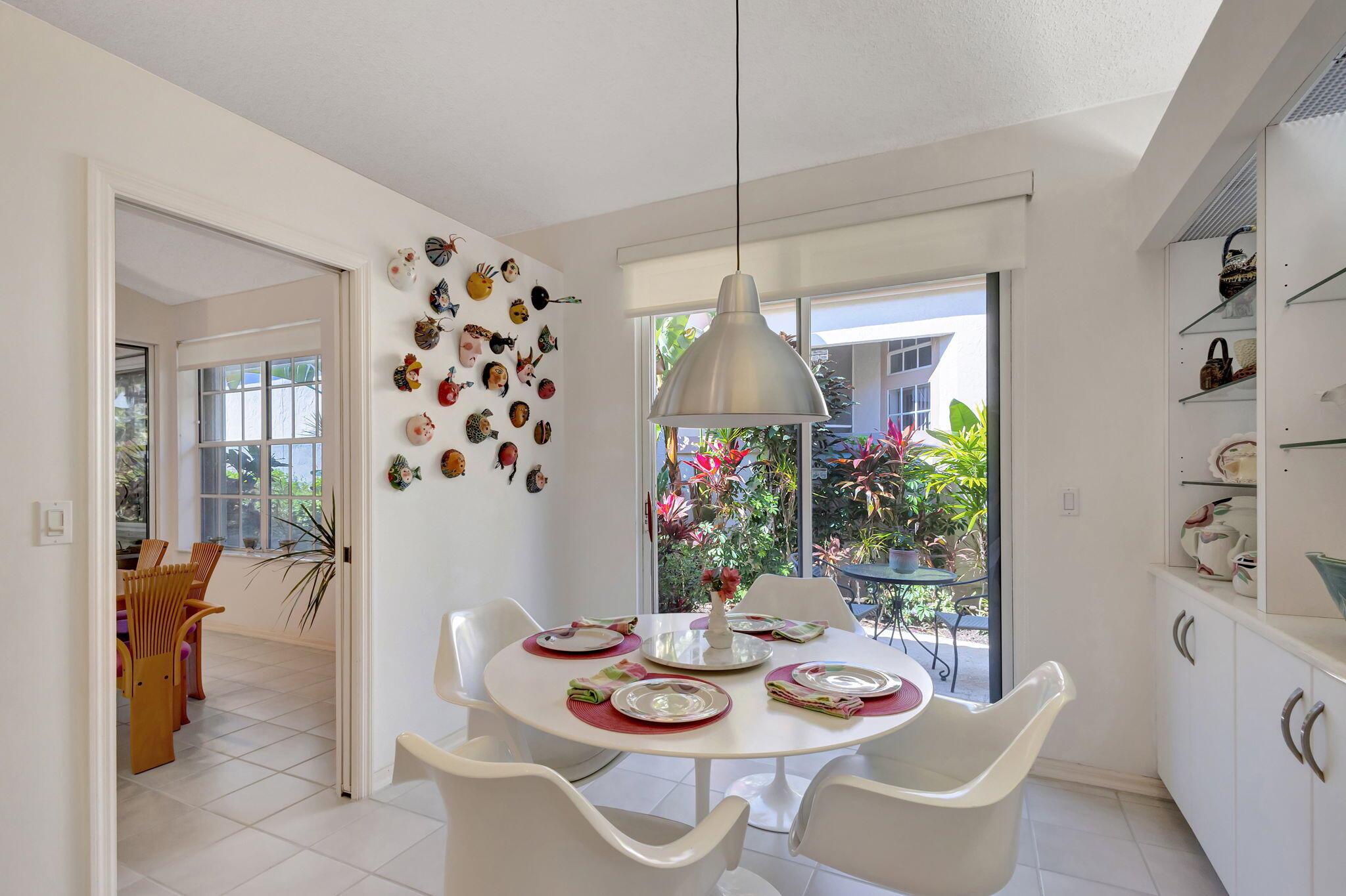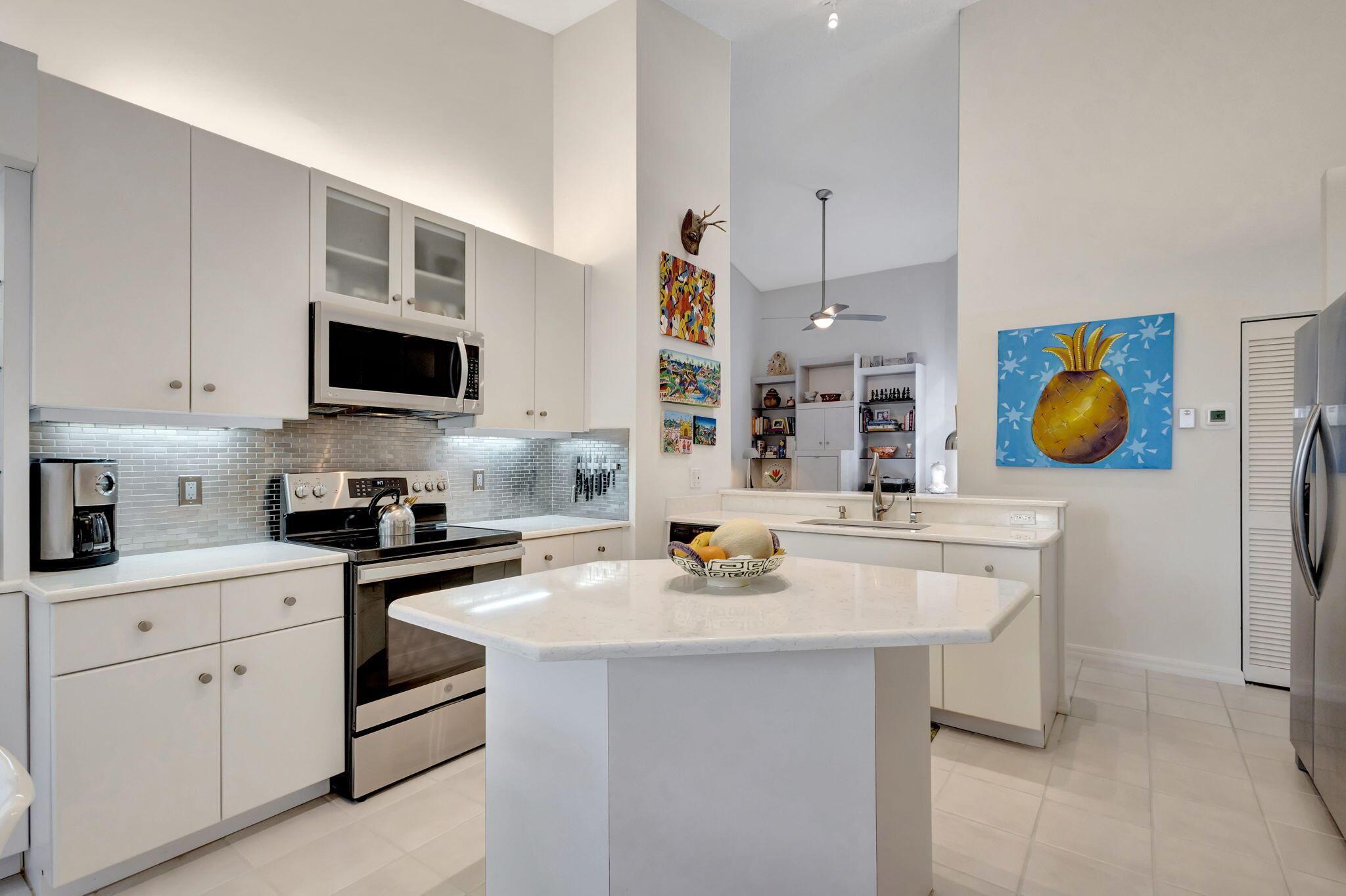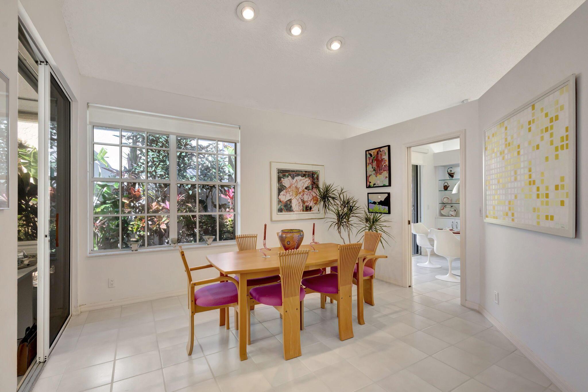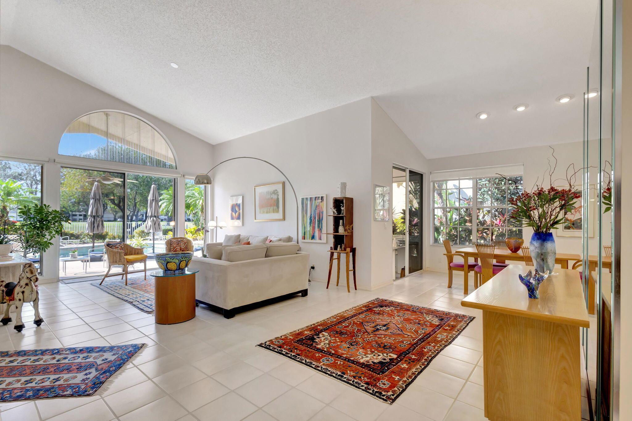 This beautifully designed lush landscaped Pool home serves light and bright with 2-bedrooms, 2-baths and a den that can be easily converted to 3rd bedroom, baths remodeled. Perfectly situated along a double fairway in the prestigious Eastpointe Country Club of Palm Beach Gardens. With western exposure, this home offers breathtaking sunsets over the lush golf course. Step inside to an open-concept floor plan with vaulted ceilings filling the home with natural light, featuring a split-bedroom layout for privacy and comfort. The chef’s kitchen boasts high-end appliances, ample counter space, island for prepping and an eat-in breakfast area, making it perfect for both casual and gourmet dining. Adjacent to the kitchen, a formal dining room provides an elegant setting for entertaining.