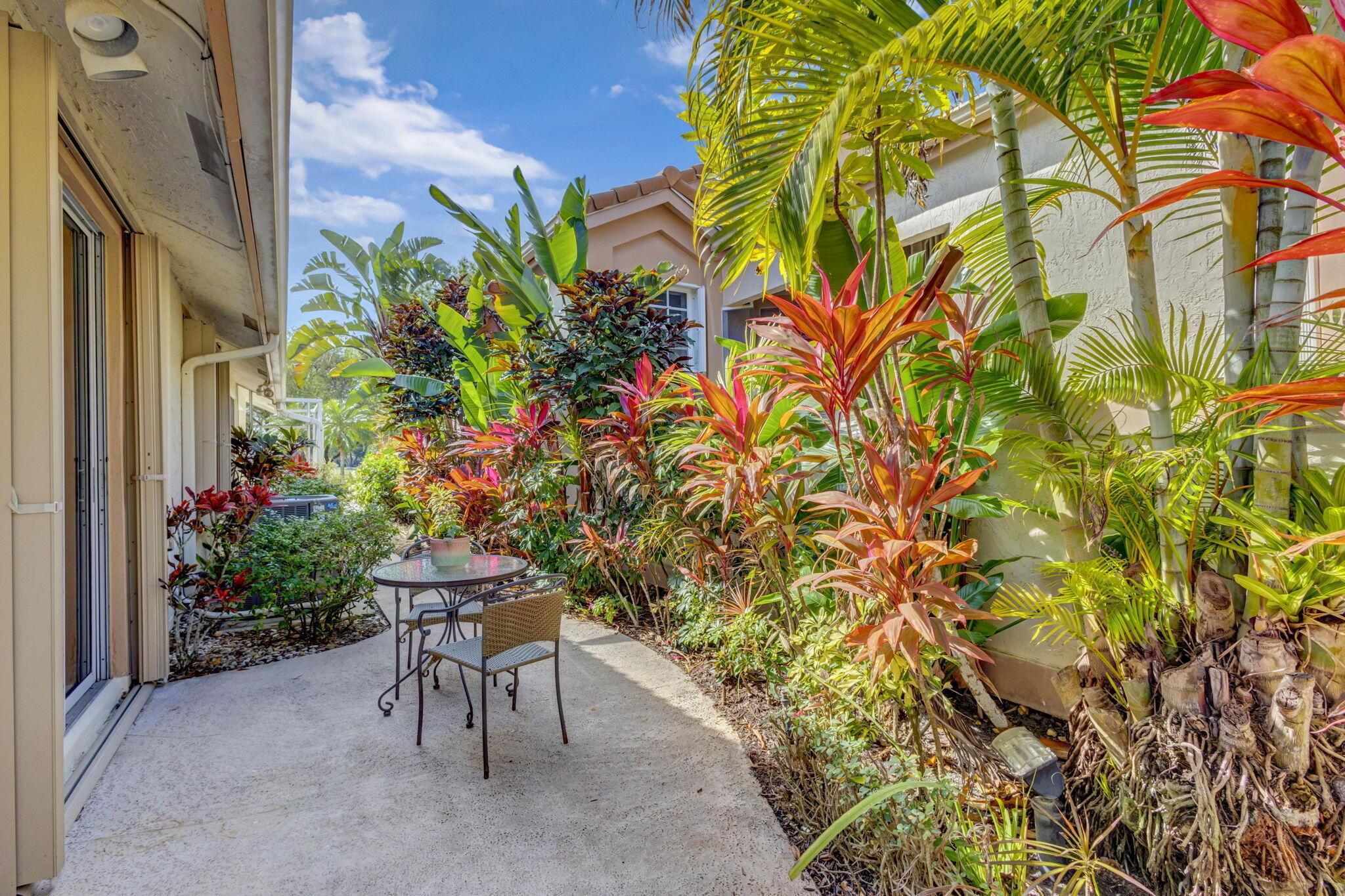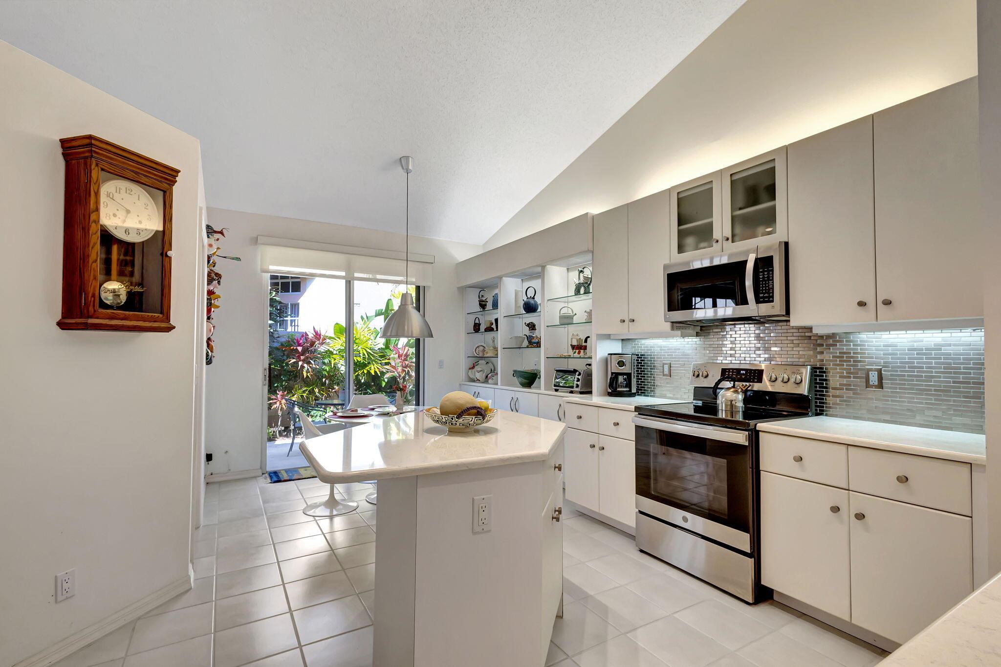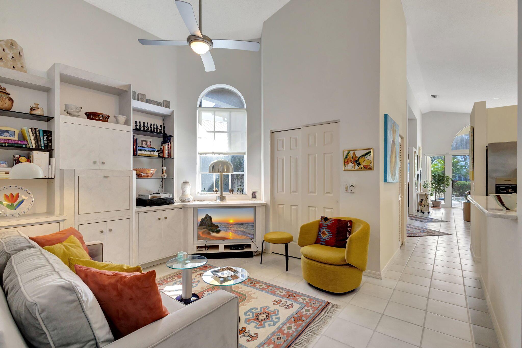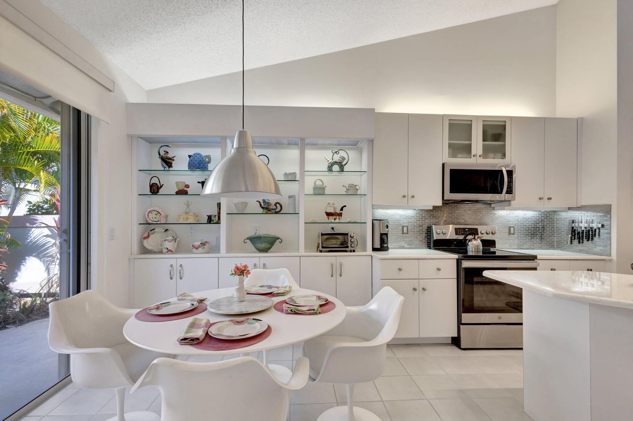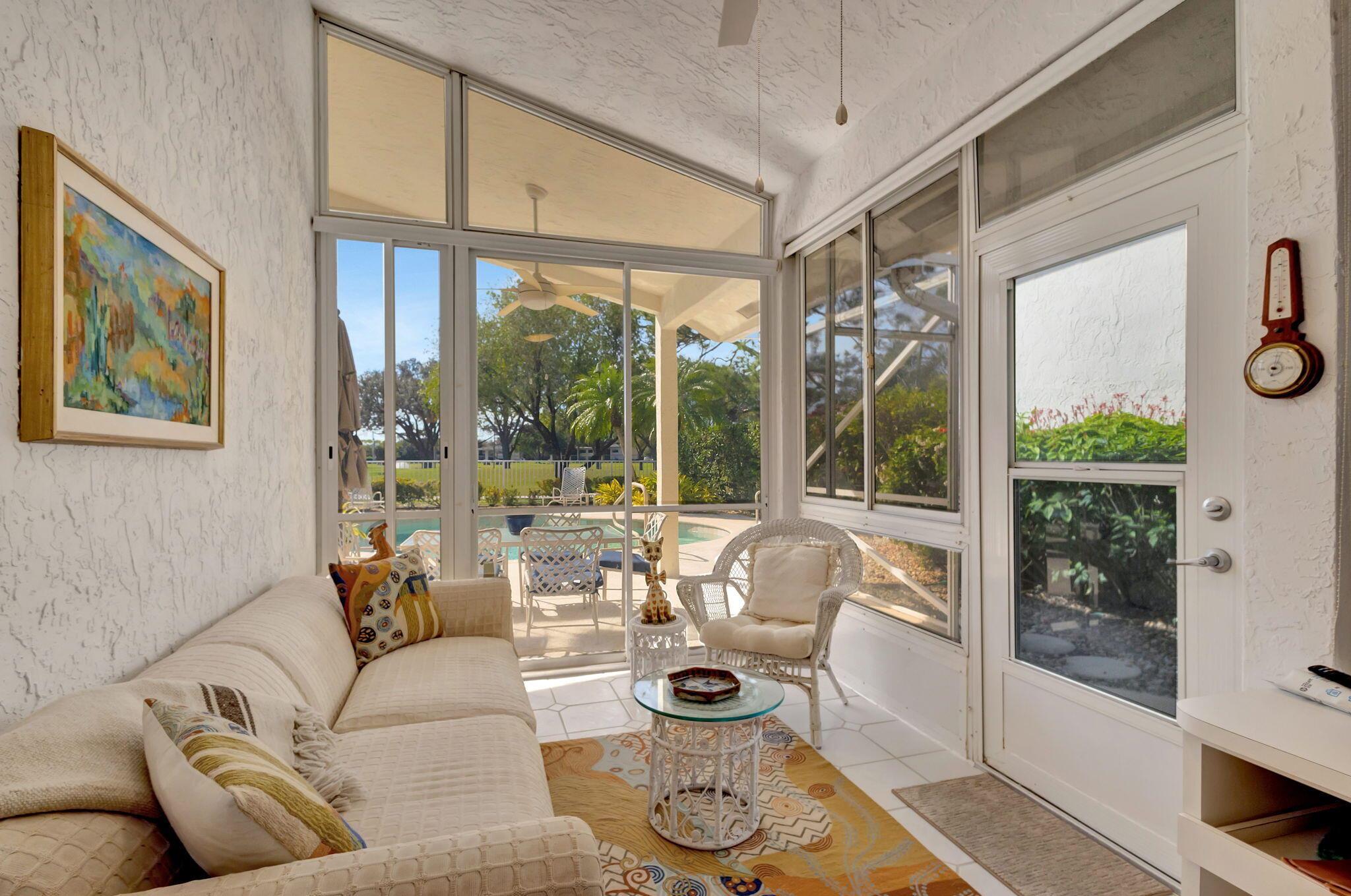This beautifully designed lush landscaped Pool home serves light and bright with 2-bedrooms, 2-baths and a den that can be easily converted to 3rd bedroom, baths remodeled. Perfectly situated along a double fairway in the prestigious Eastpointe Country Club of Palm Beach Gardens. With western exposure, this home offers breathtaking sunsets over the lush golf course. Step inside to an open-concept floor plan with vaulted ceilings filling the home with natural light, featuring a split-bedroom layout for privacy and comfort. The chef’s kitchen boasts high-end appliances, ample counter space, island for prepping and an eat-in breakfast area, making it perfect for both casual and gourmet dining. Adjacent to the kitchen, a formal dining room provides an elegant setting for entertaining.
