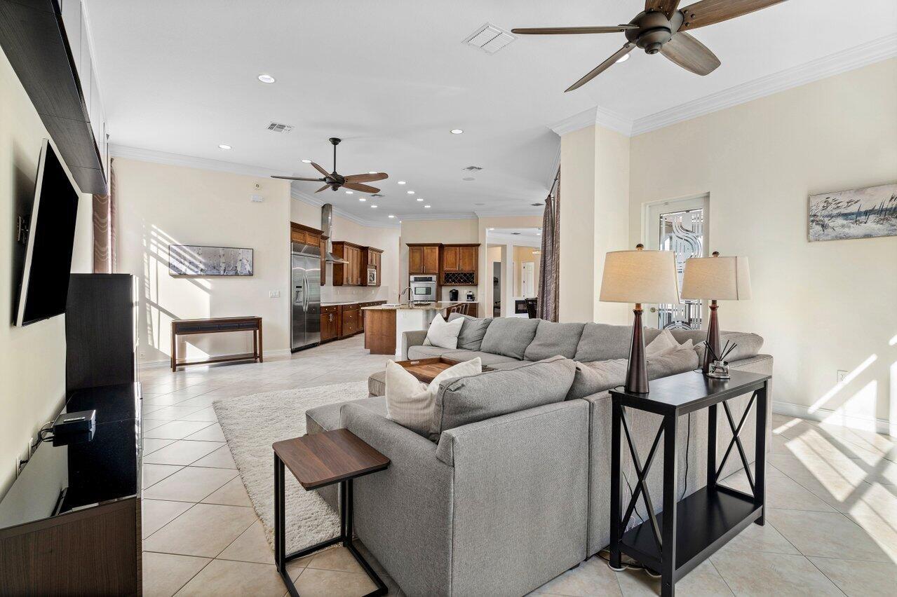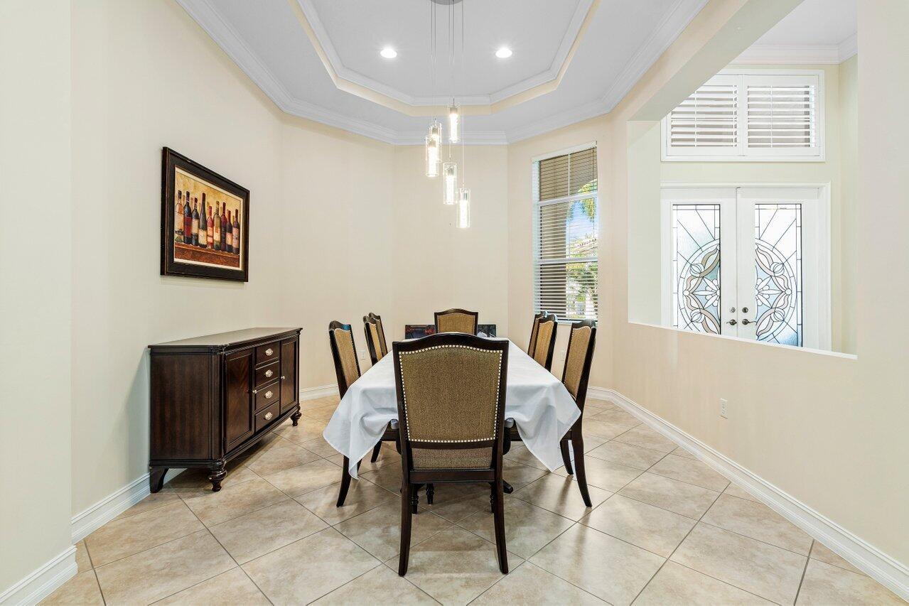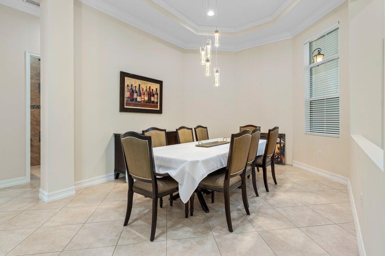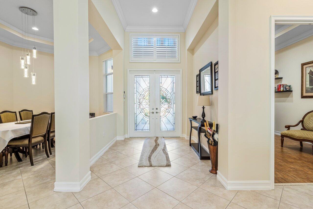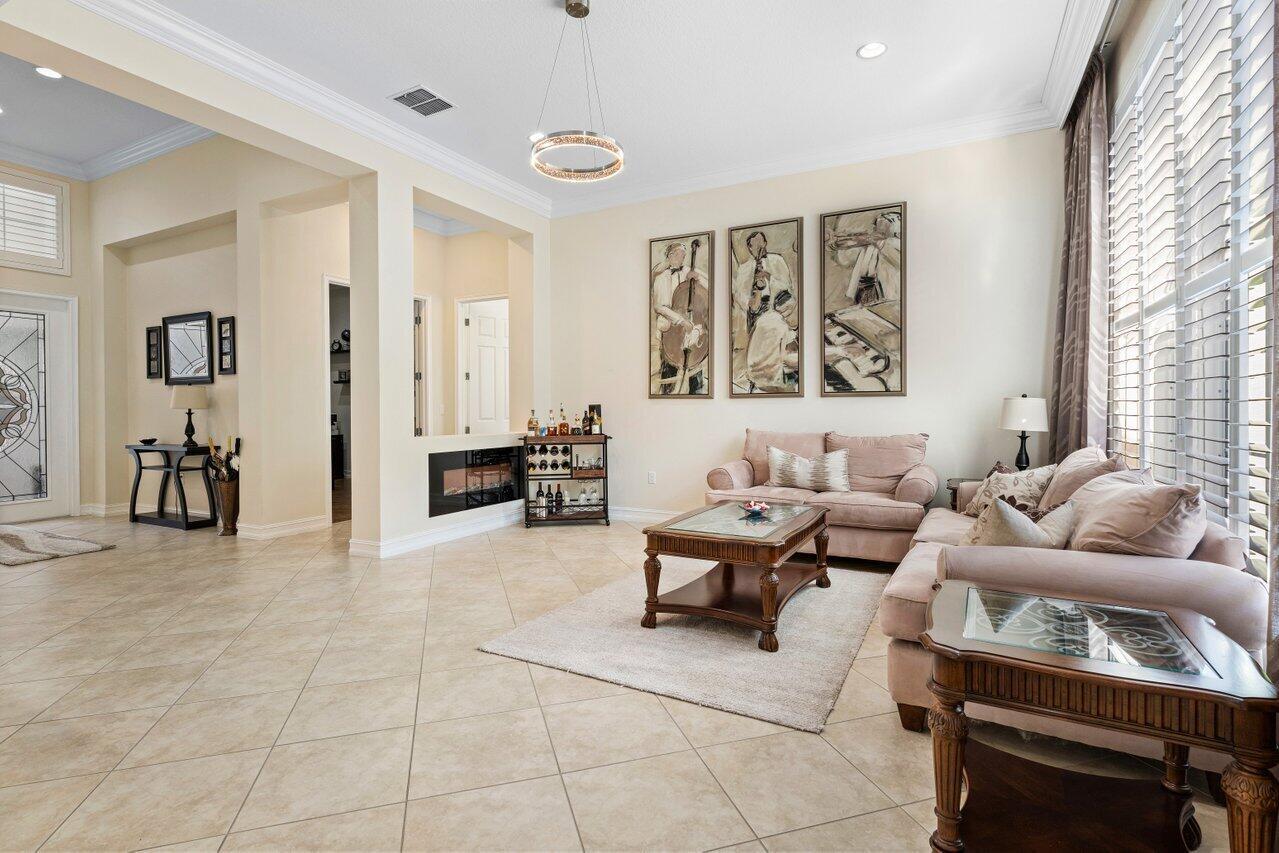 Welcome to this exquisite single-story, 5-bedroom, 4.5-bathroom estate with a 3-car garage, nestled in the highly sought-after community of Olympia. From the moment you arrive, the lush tropical landscaping and oversized circular paver driveway create an impressive entrance, setting the stage for the elegance within. Step inside to find soaring 11-foot ceilings, diagonal tile flooring, upgraded baseboards, and tray ceilings with intricate crown molding, all enhancing the home’s luxurious feel. Natural light floods through large plantation-shuttered windows, illuminating the thoughtfully designed spaces. The formal living room features an electric fireplace, recessed LED lighting, and a refined ambiance, perfect for welcoming guests. The adjacent formal dining room, with its