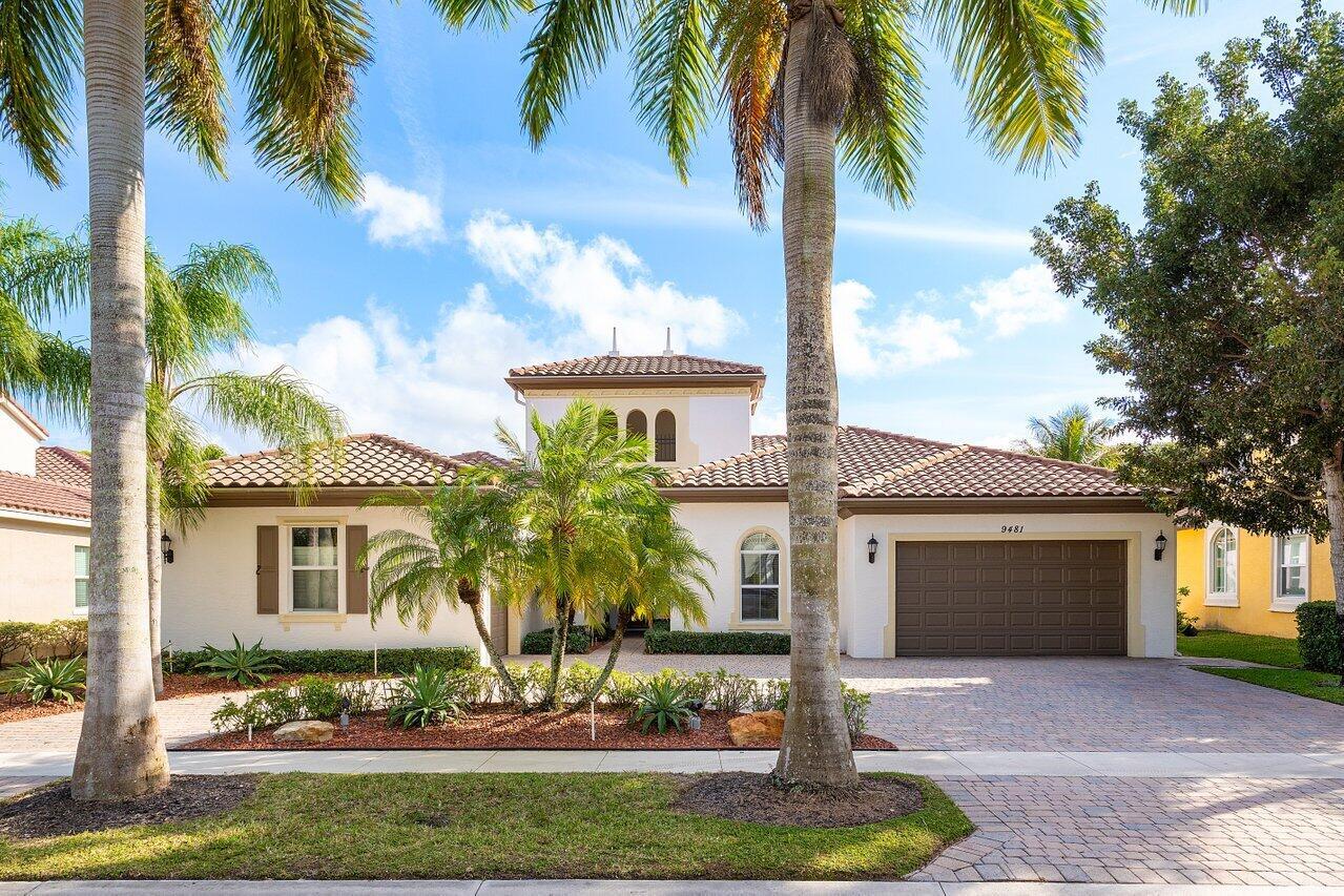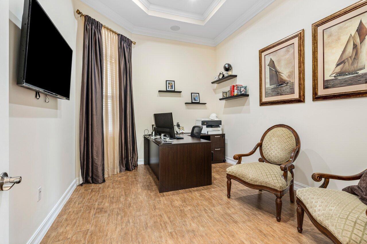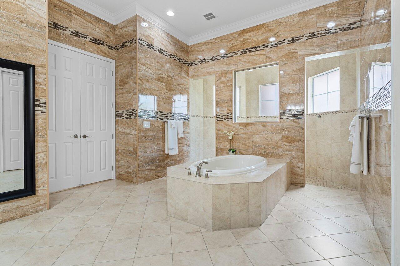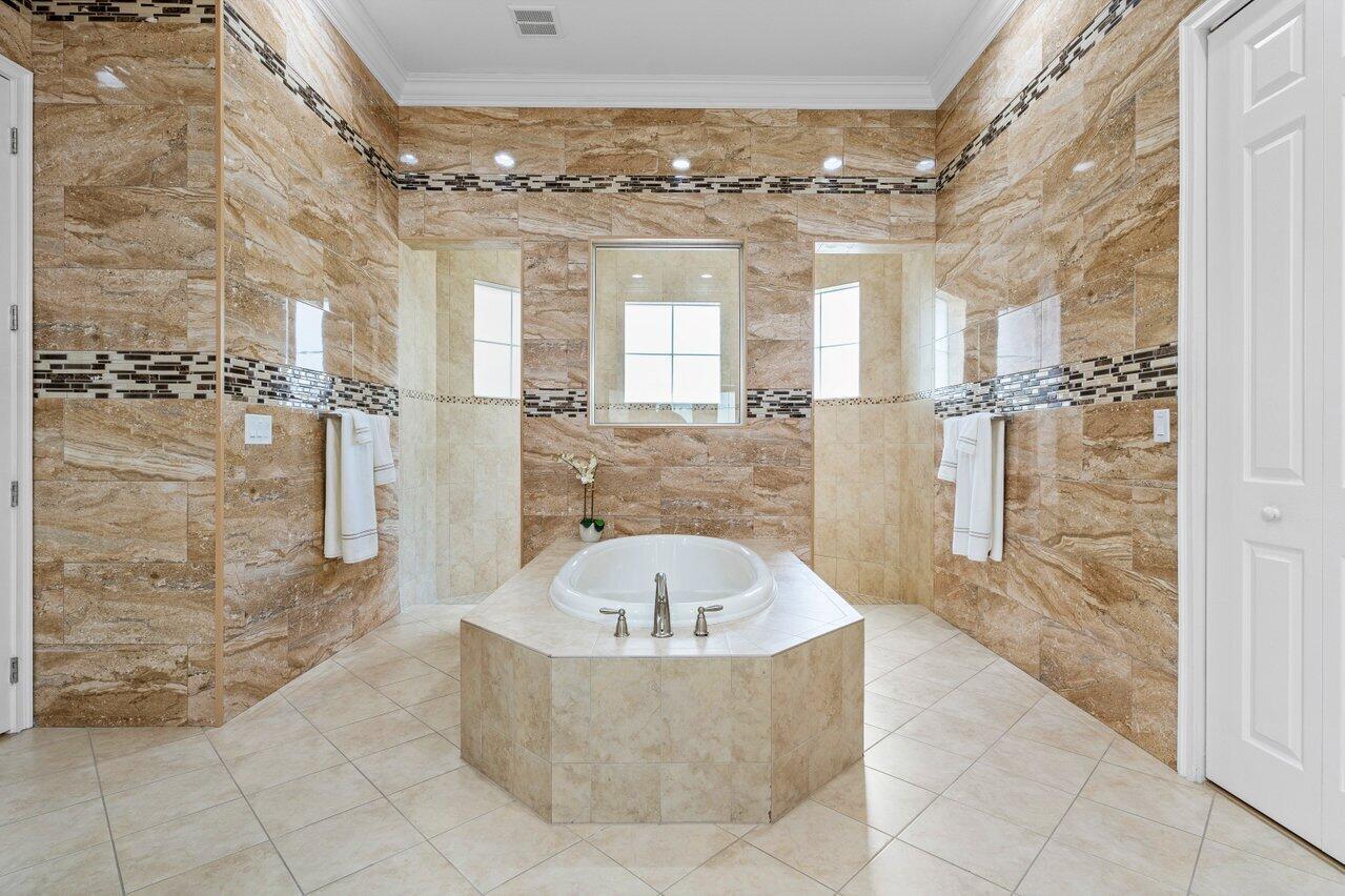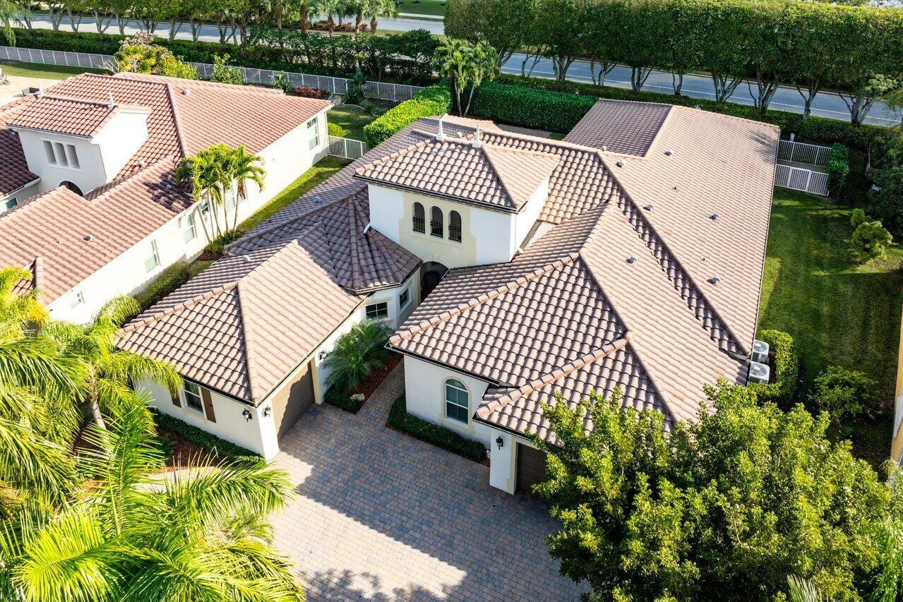 Welcome to this exquisite single-story, 5-bedroom, 4.5-bathroom estate with a 3-car garage, nestled in the highly sought-after community of Olympia. From the moment you arrive, the lush tropical landscaping and oversized circular paver driveway create an impressive entrance, setting the stage for the elegance within. Step inside to find soaring 11-foot ceilings, diagonal tile flooring, upgraded baseboards, and tray ceilings with intricate crown molding, all enhancing the home’s luxurious feel. Natural light floods through large plantation-shuttered windows, illuminating the thoughtfully designed spaces. The formal living room features an electric fireplace, recessed LED lighting, and a refined ambiance, perfect for welcoming guests. The adjacent formal dining room, with its