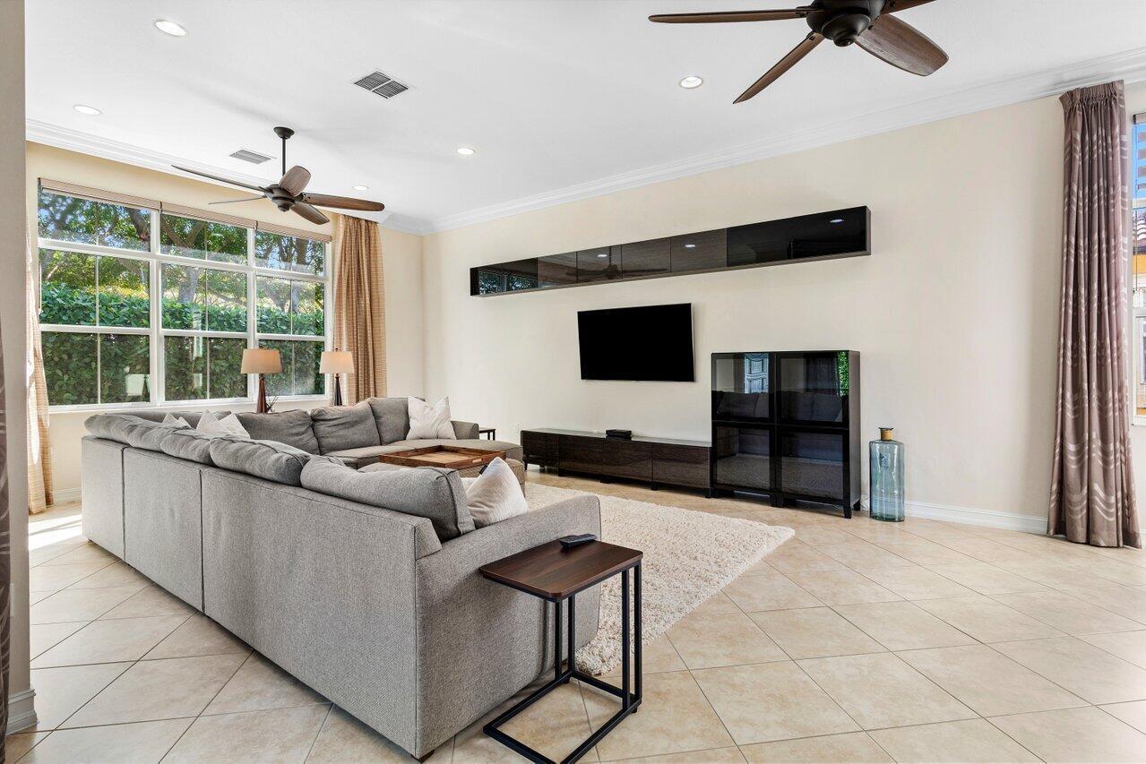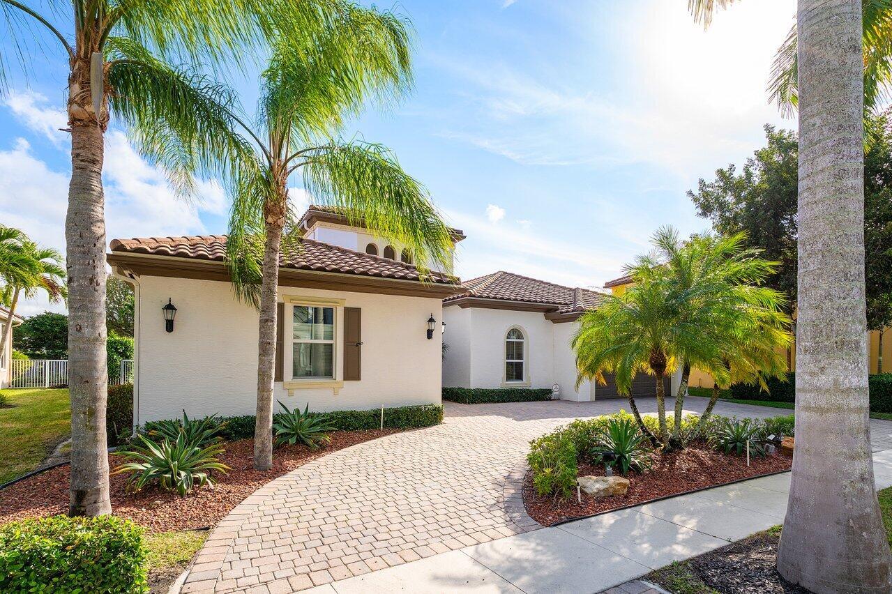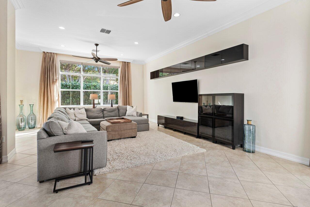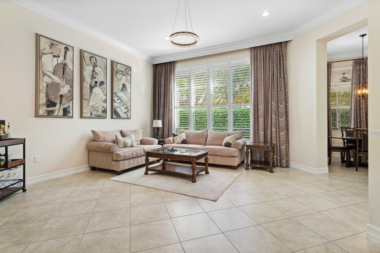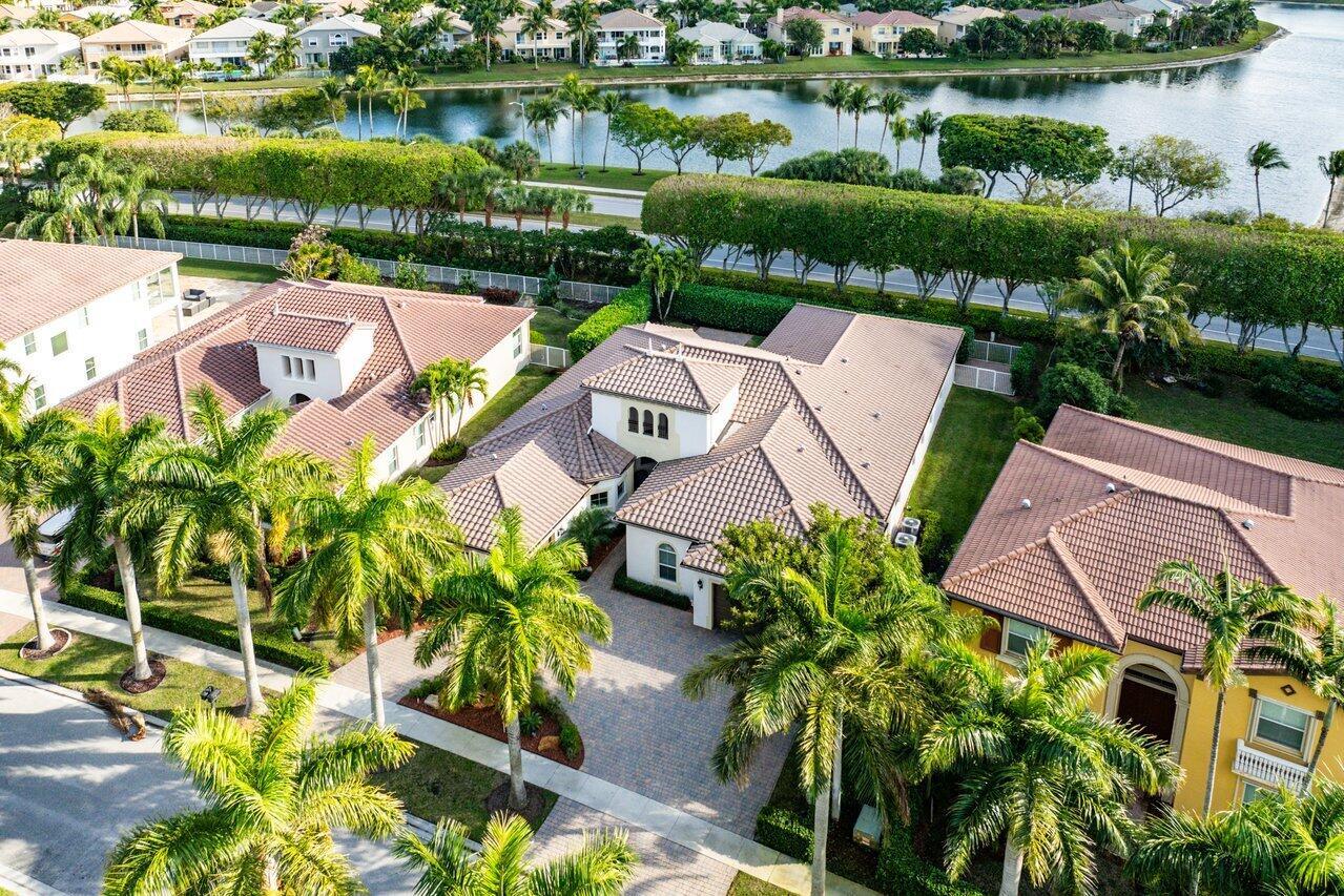 Welcome to this exquisite single-story, 5-bedroom, 4.5-bathroom estate with a 3-car garage, nestled in the highly sought-after community of Olympia. From the moment you arrive, the lush tropical landscaping and oversized circular paver driveway create an impressive entrance, setting the stage for the elegance within. Step inside to find soaring 11-foot ceilings, diagonal tile flooring, upgraded baseboards, and tray ceilings with intricate crown molding, all enhancing the home’s luxurious feel. Natural light floods through large plantation-shuttered windows, illuminating the thoughtfully designed spaces. The formal living room features an electric fireplace, recessed LED lighting, and a refined ambiance, perfect for welcoming guests. The adjacent formal dining room, with its