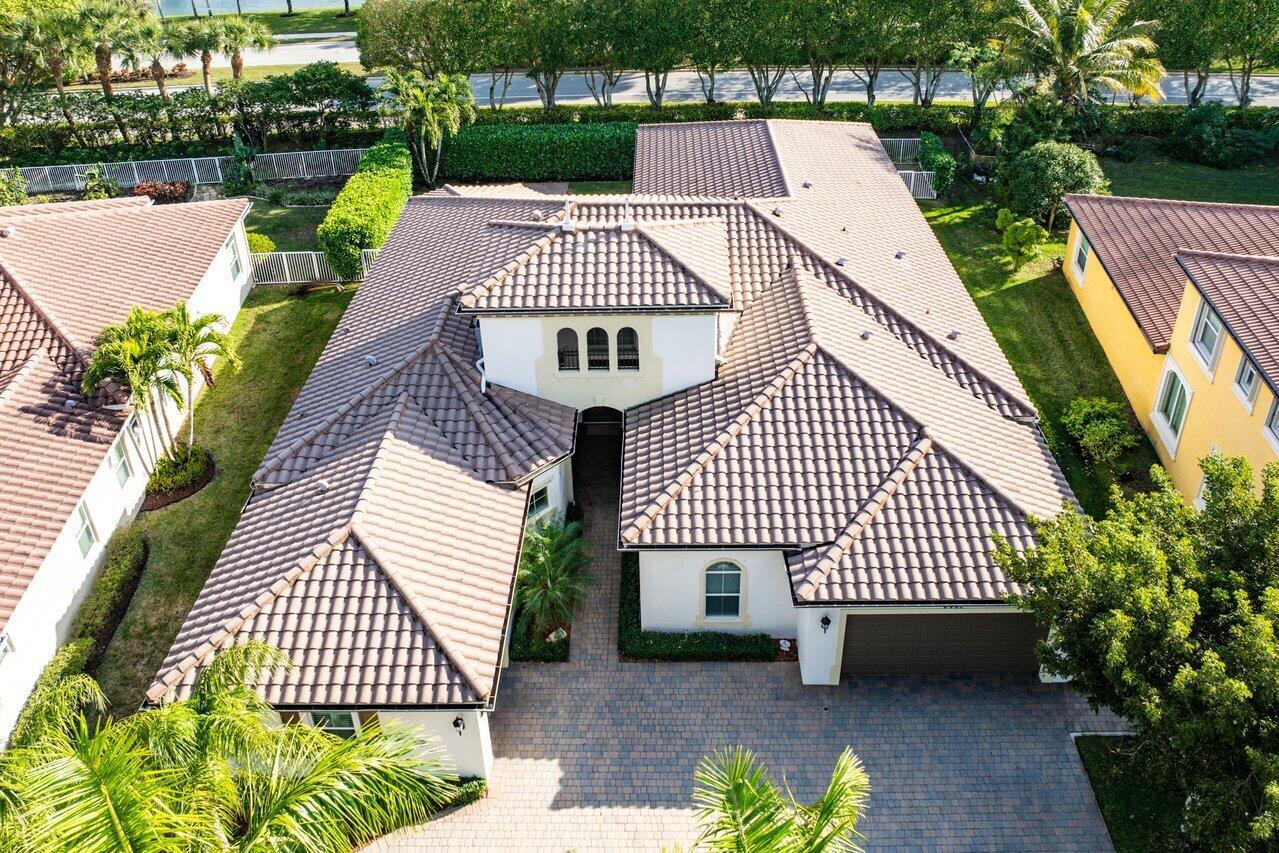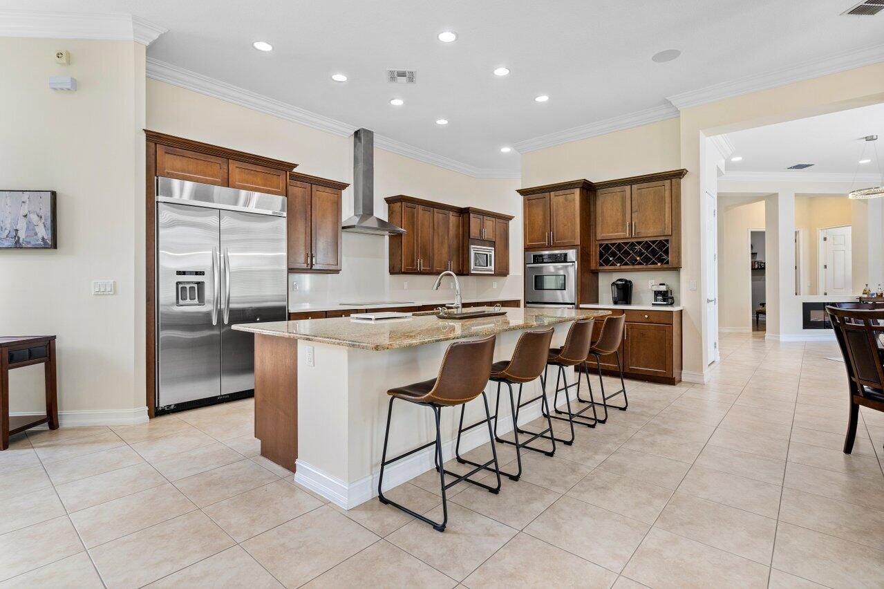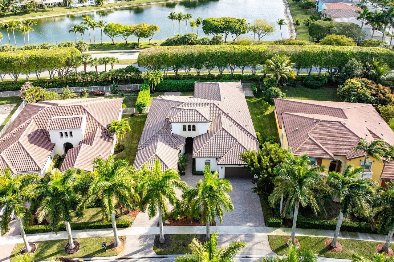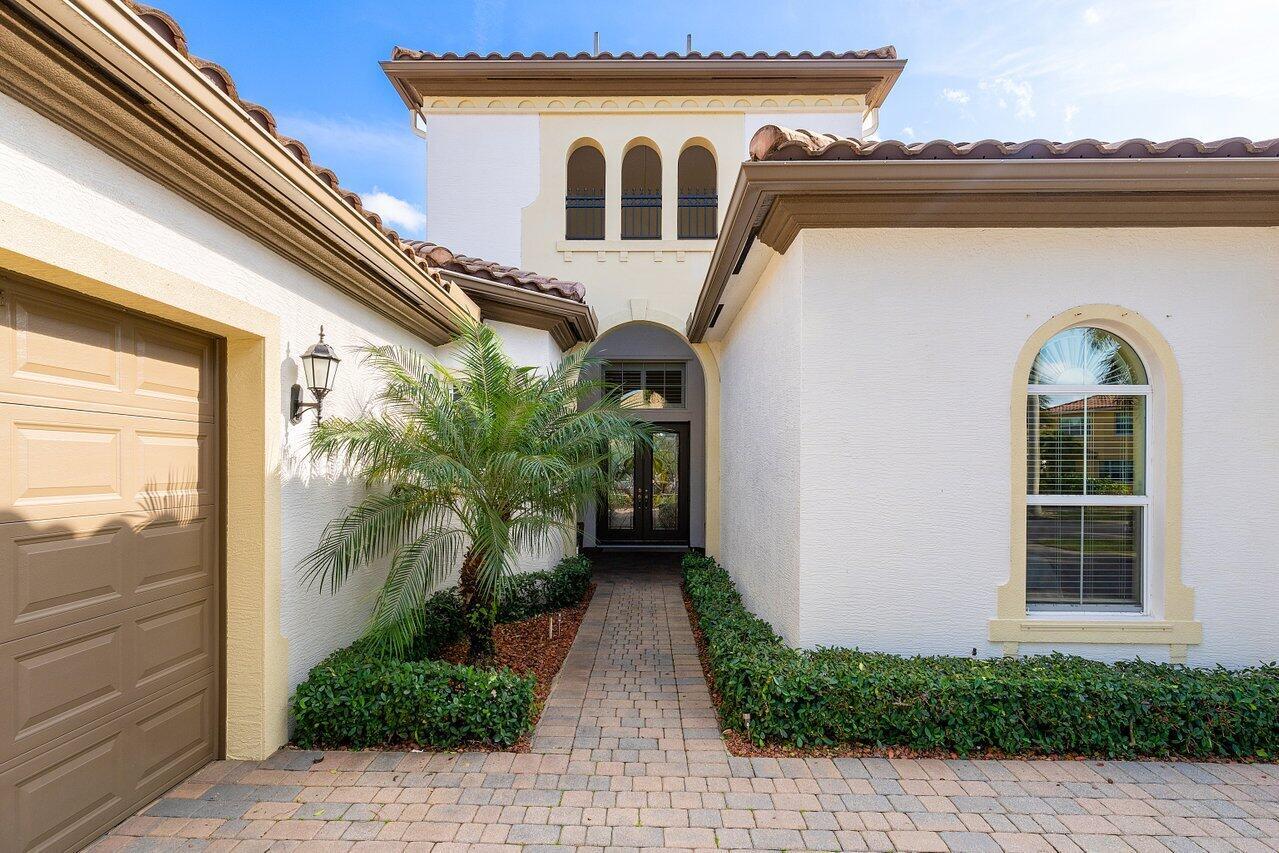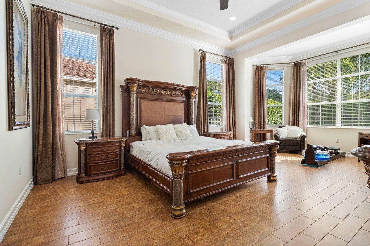 Welcome to this exquisite single-story, 5-bedroom, 4.5-bathroom estate with a 3-car garage, nestled in the highly sought-after community of Olympia. From the moment you arrive, the lush tropical landscaping and oversized circular paver driveway create an impressive entrance, setting the stage for the elegance within. Step inside to find soaring 11-foot ceilings, diagonal tile flooring, upgraded baseboards, and tray ceilings with intricate crown molding, all enhancing the home’s luxurious feel. Natural light floods through large plantation-shuttered windows, illuminating the thoughtfully designed spaces. The formal living room features an electric fireplace, recessed LED lighting, and a refined ambiance, perfect for welcoming guests. The adjacent formal dining room, with its