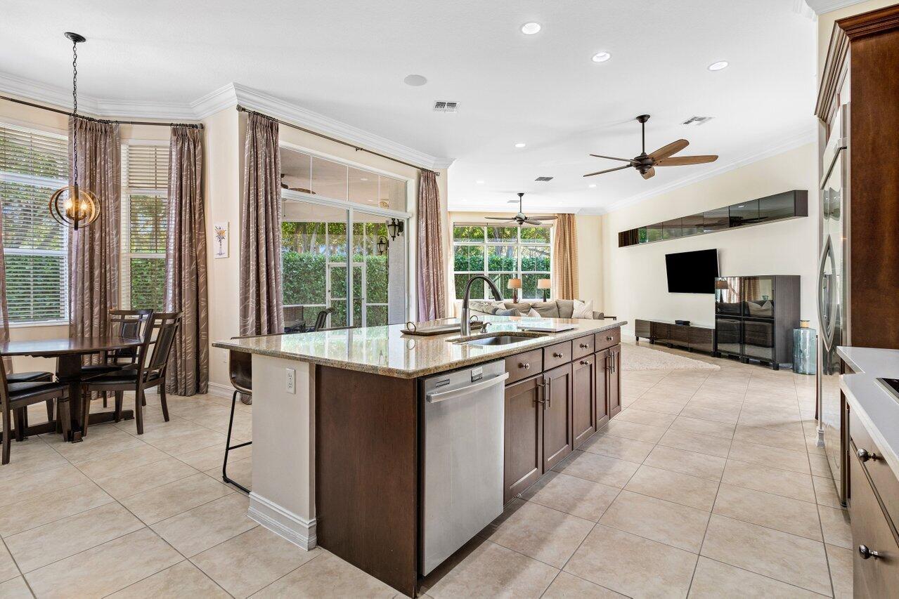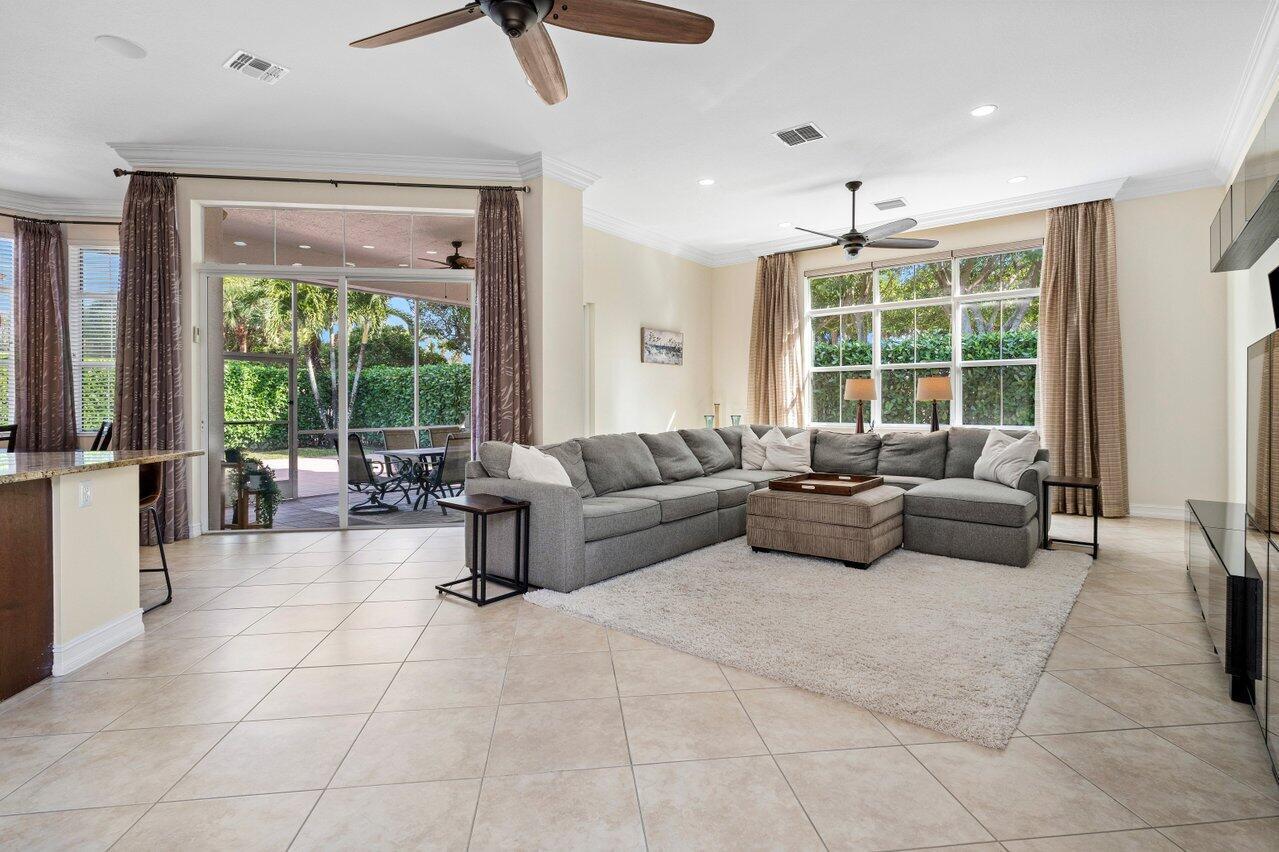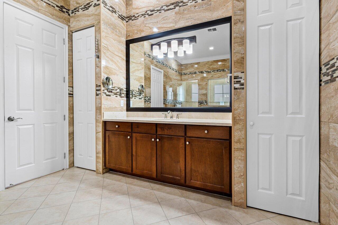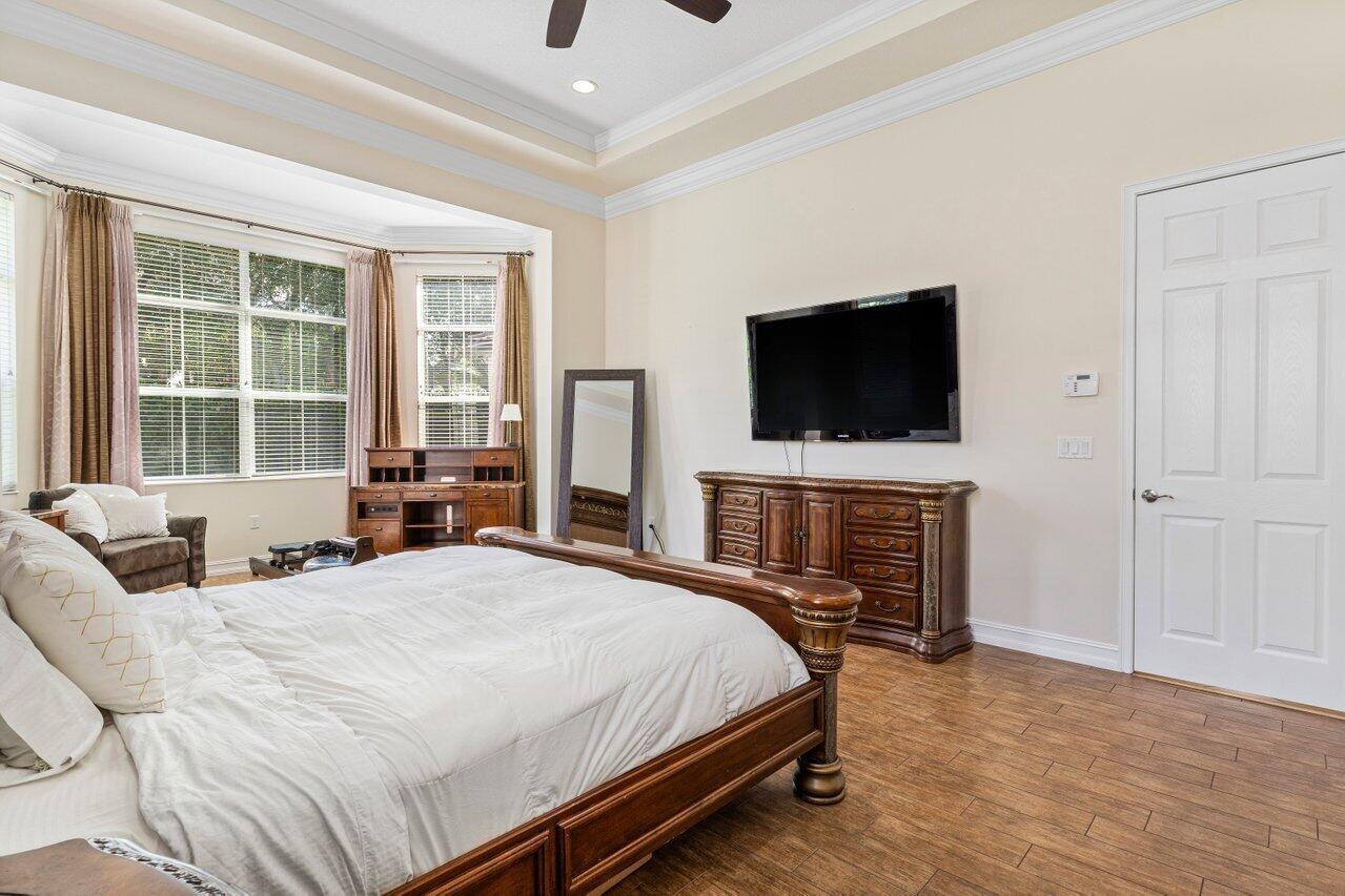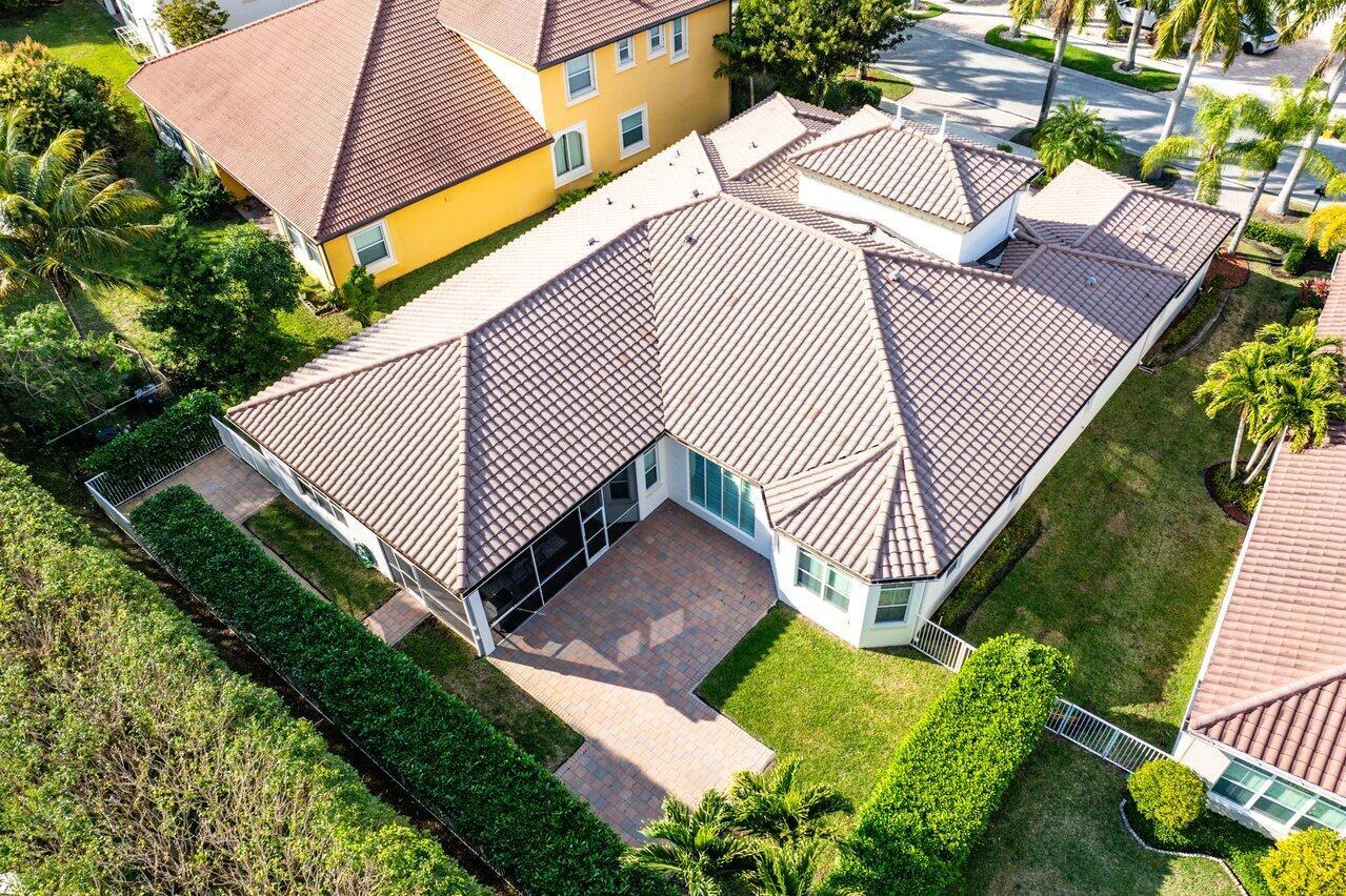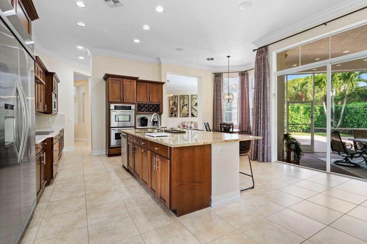 Welcome to this exquisite single-story, 5-bedroom, 4.5-bathroom estate with a 3-car garage, nestled in the highly sought-after community of Olympia. From the moment you arrive, the lush tropical landscaping and oversized circular paver driveway create an impressive entrance, setting the stage for the elegance within. Step inside to find soaring 11-foot ceilings, diagonal tile flooring, upgraded baseboards, and tray ceilings with intricate crown molding, all enhancing the home’s luxurious feel. Natural light floods through large plantation-shuttered windows, illuminating the thoughtfully designed spaces. The formal living room features an electric fireplace, recessed LED lighting, and a refined ambiance, perfect for welcoming guests. The adjacent formal dining room, with its