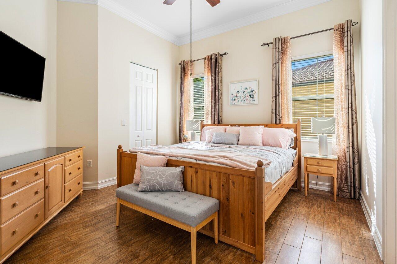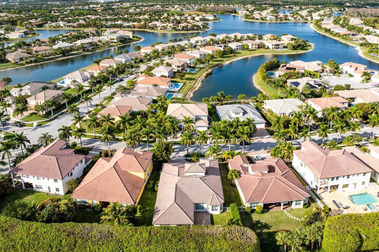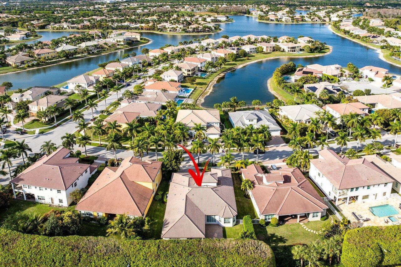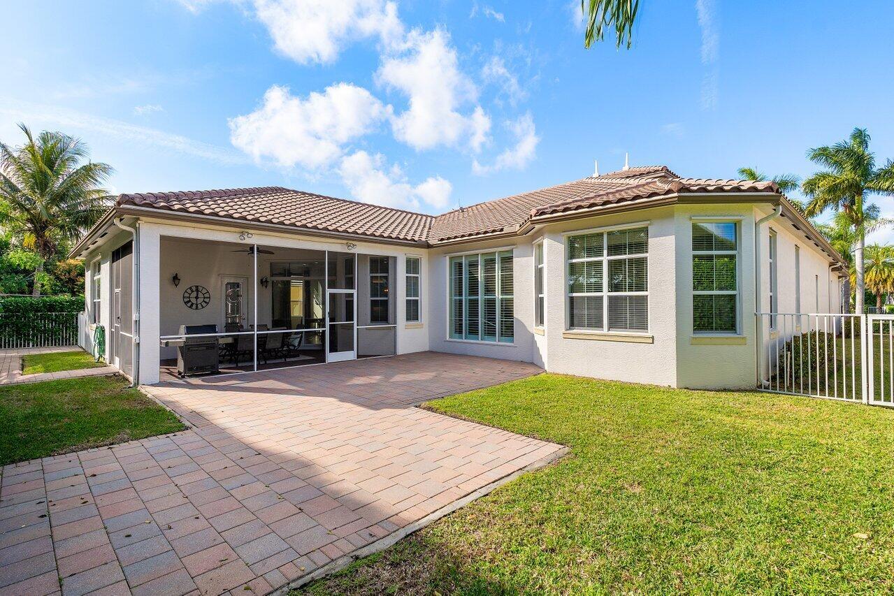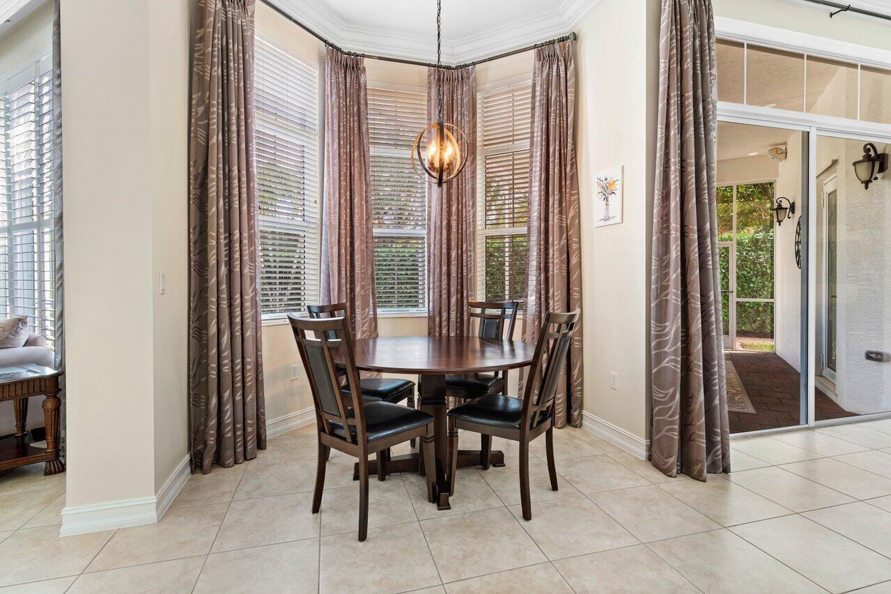 Welcome to this exquisite single-story, 5-bedroom, 4.5-bathroom estate with a 3-car garage, nestled in the highly sought-after community of Olympia. From the moment you arrive, the lush tropical landscaping and oversized circular paver driveway create an impressive entrance, setting the stage for the elegance within. Step inside to find soaring 11-foot ceilings, diagonal tile flooring, upgraded baseboards, and tray ceilings with intricate crown molding, all enhancing the home’s luxurious feel. Natural light floods through large plantation-shuttered windows, illuminating the thoughtfully designed spaces. The formal living room features an electric fireplace, recessed LED lighting, and a refined ambiance, perfect for welcoming guests. The adjacent formal dining room, with its