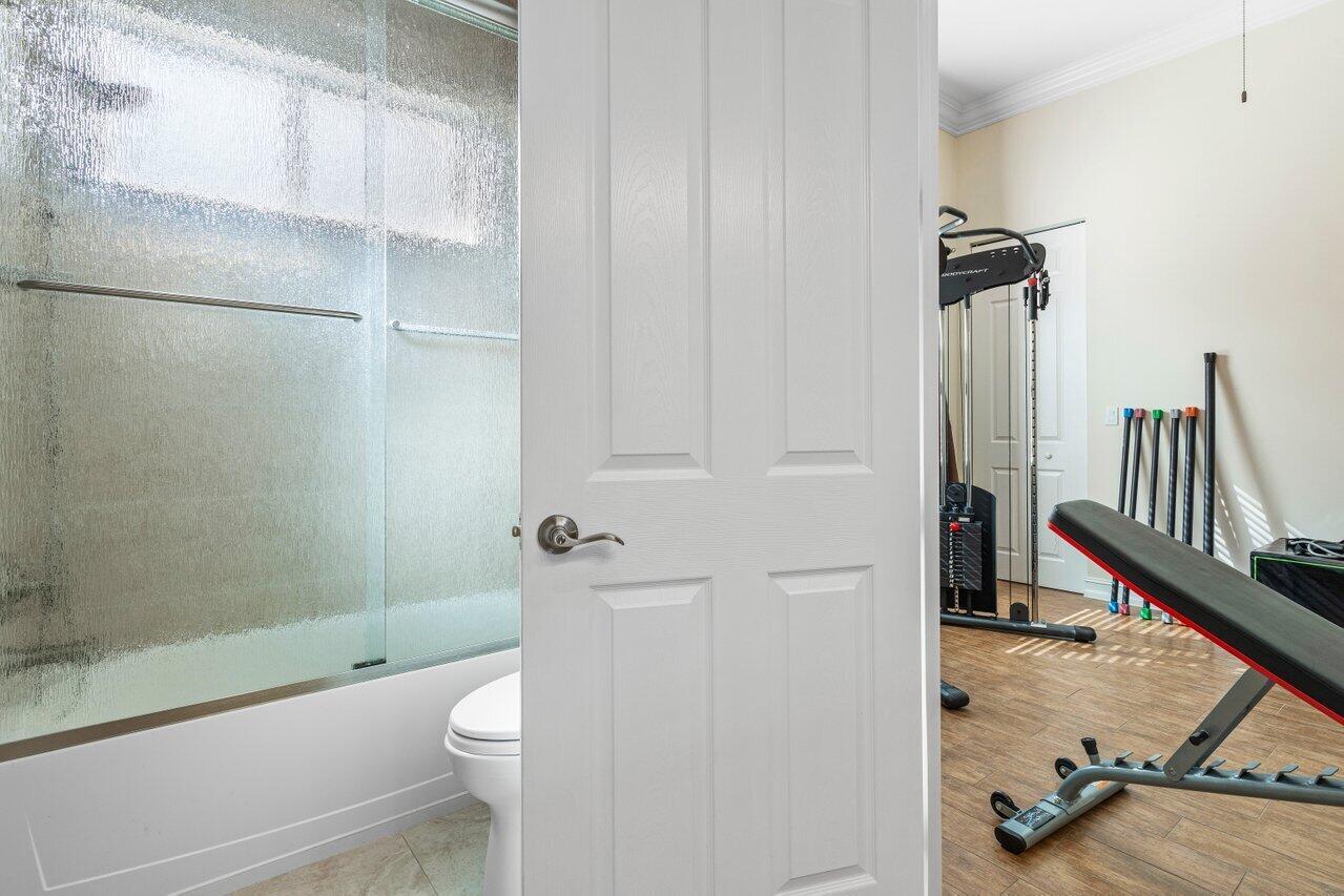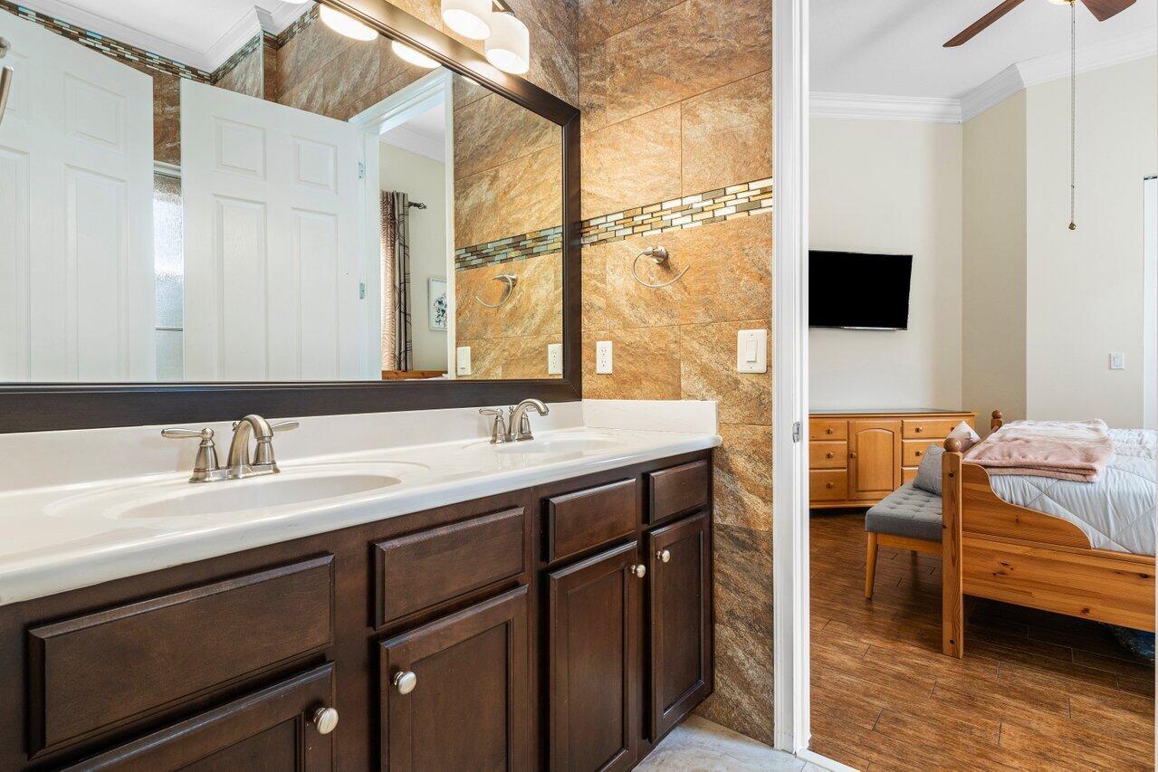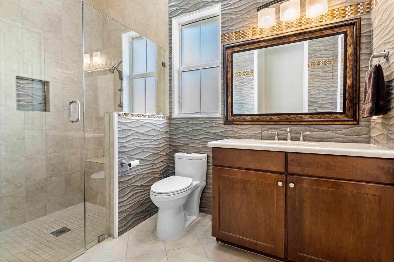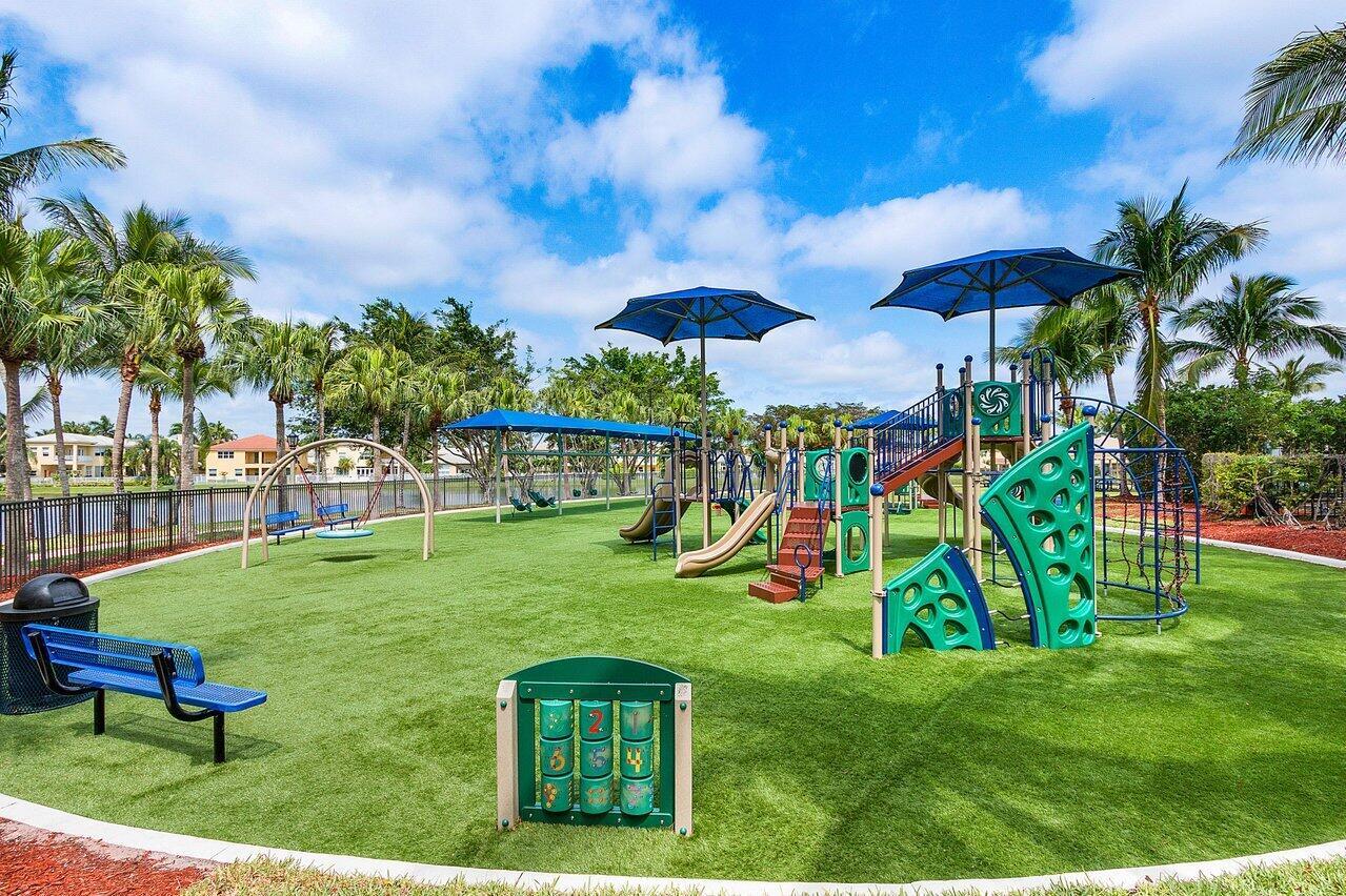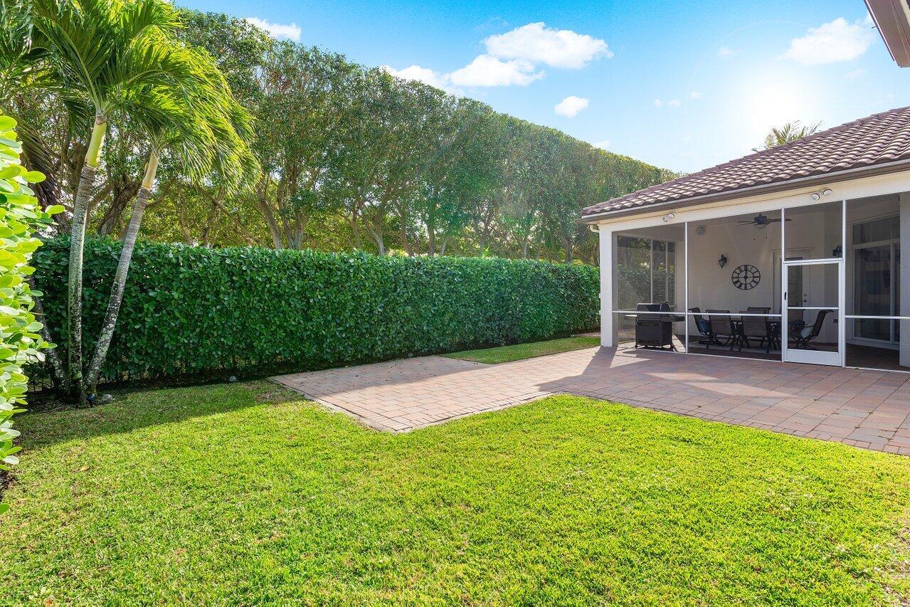 Welcome to this exquisite single-story, 5-bedroom, 4.5-bathroom estate with a 3-car garage, nestled in the highly sought-after community of Olympia. From the moment you arrive, the lush tropical landscaping and oversized circular paver driveway create an impressive entrance, setting the stage for the elegance within. Step inside to find soaring 11-foot ceilings, diagonal tile flooring, upgraded baseboards, and tray ceilings with intricate crown molding, all enhancing the home’s luxurious feel. Natural light floods through large plantation-shuttered windows, illuminating the thoughtfully designed spaces. The formal living room features an electric fireplace, recessed LED lighting, and a refined ambiance, perfect for welcoming guests. The adjacent formal dining room, with its