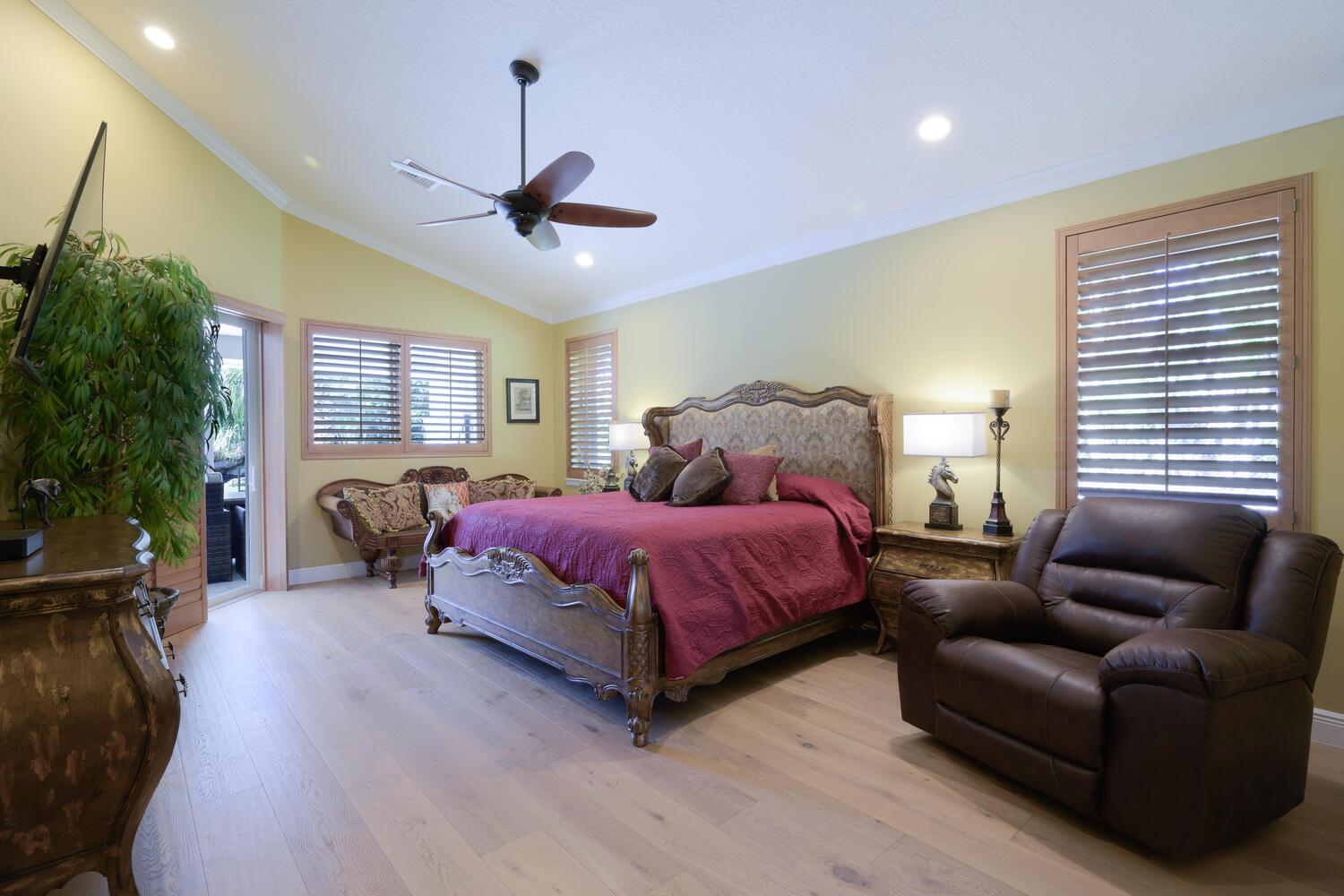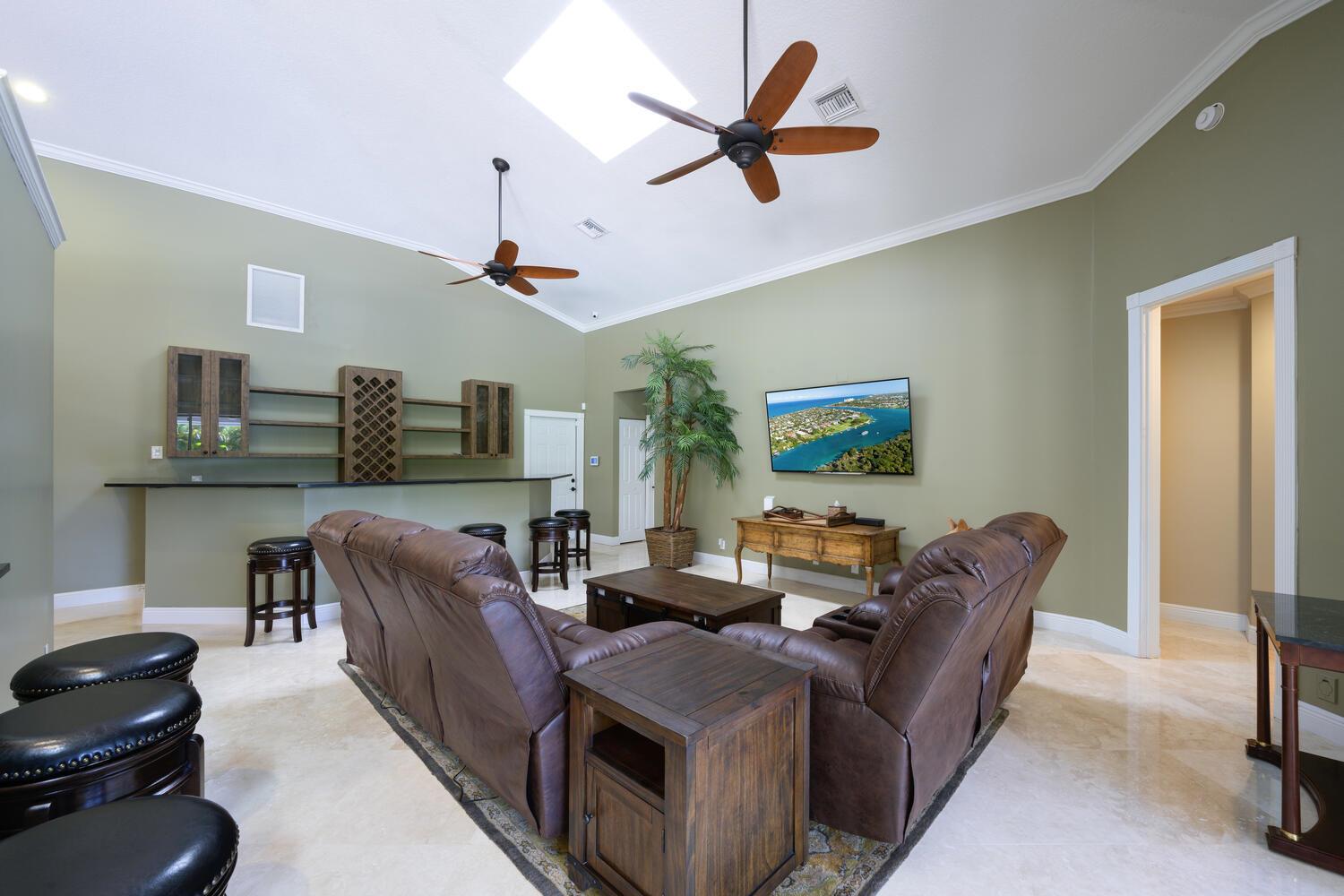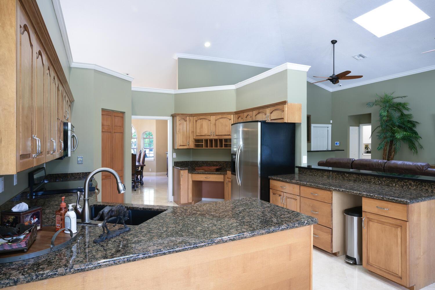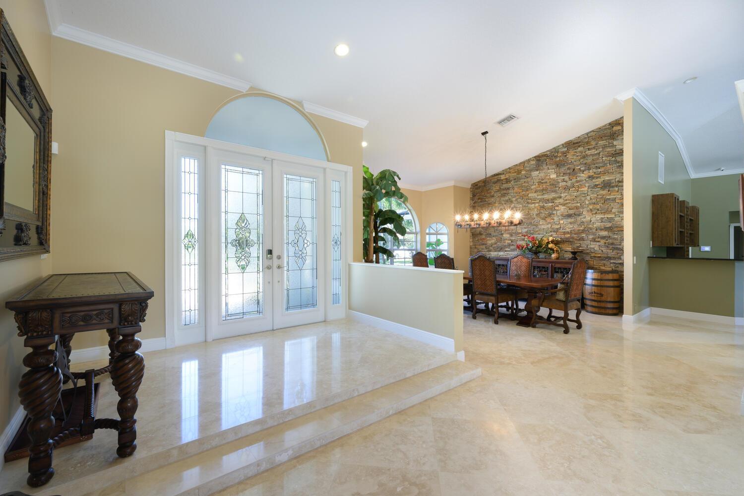 Experience luxury living in this four-bedroom, three-bath, two-car garage pool home, located in the sought after community of Steeplechase. The traditional design, CBS structure, and front East exposure provide an inviting ambiance on this expansive 1.31-acre lot. New flat concrete tile roof $76,230 with 5 year warranty, partial impact windows, and doors and captivating views of the garden, pool, and water feature. This residence boasts marble and tile flooring throughout, with the living room featuring sliders to the outside, vaulted ceiling, recessed lighting, and crown molding. The family room exudes sophistication with marble floors, vaulted ceiling, skylights, and a full bar equipped with built-in cabinets, wine cooler, sink, wine racks, and granite countertops.