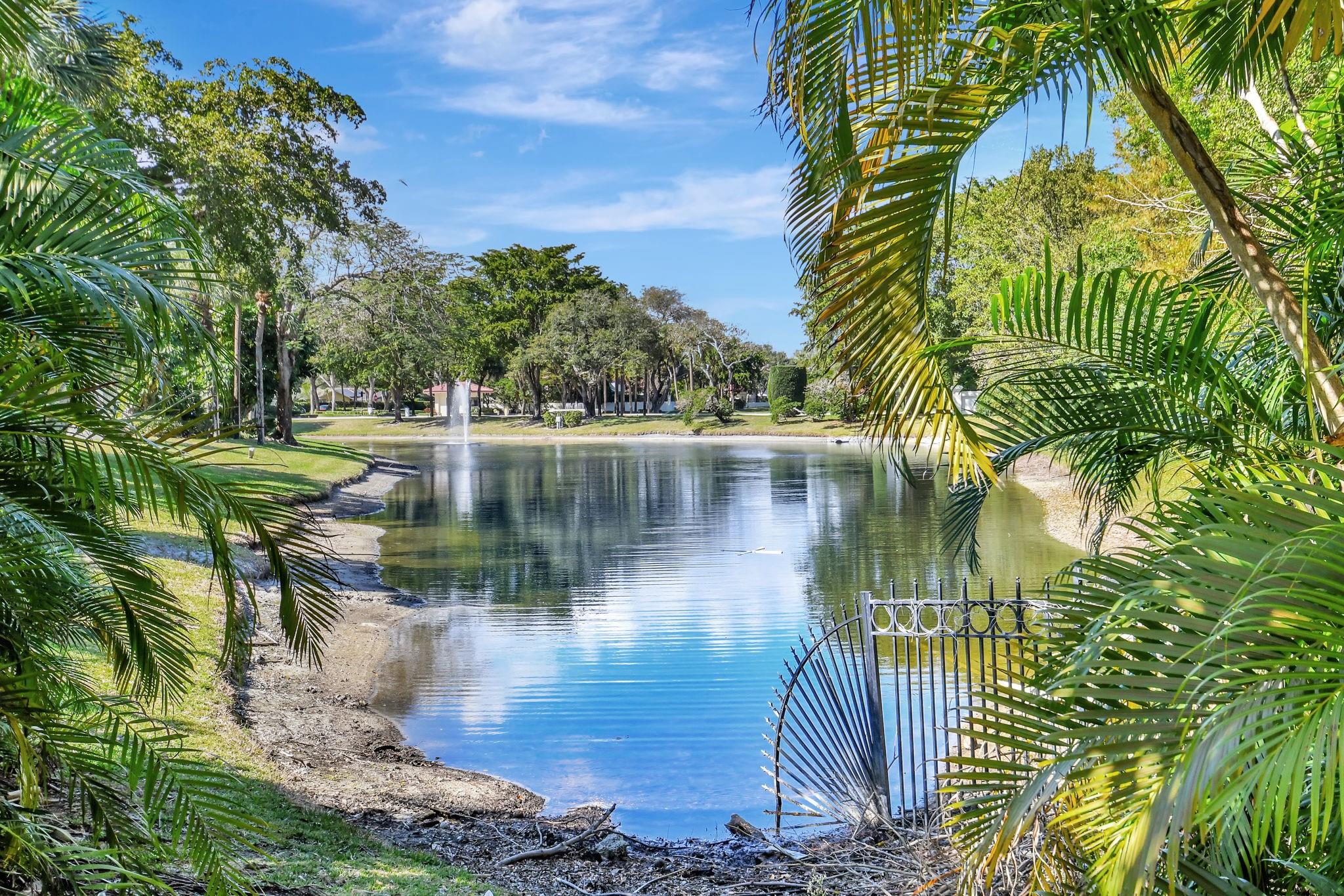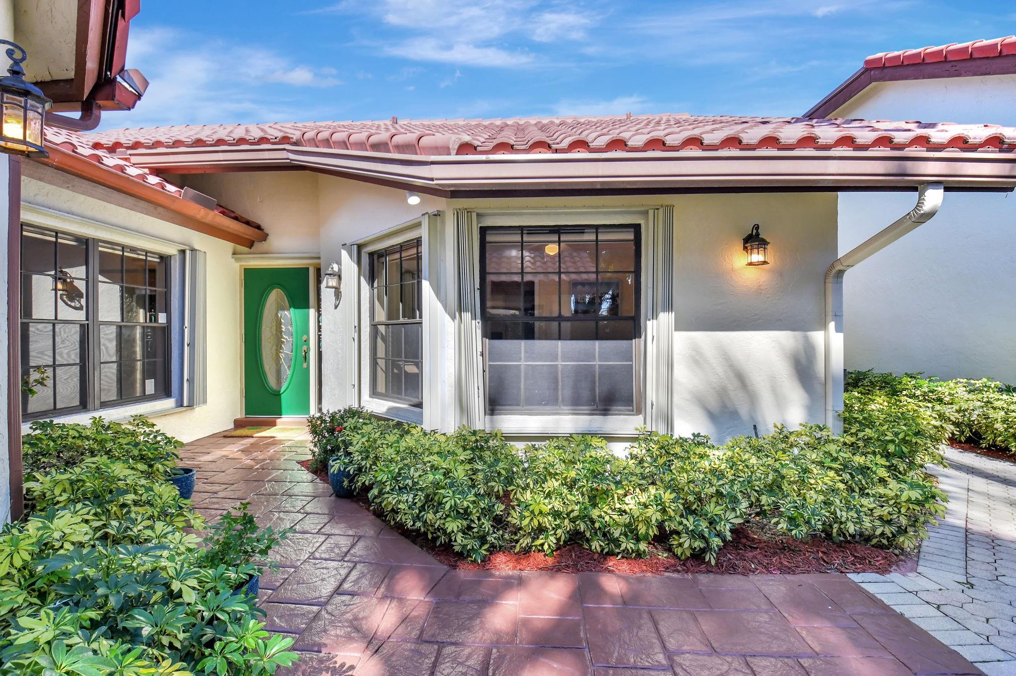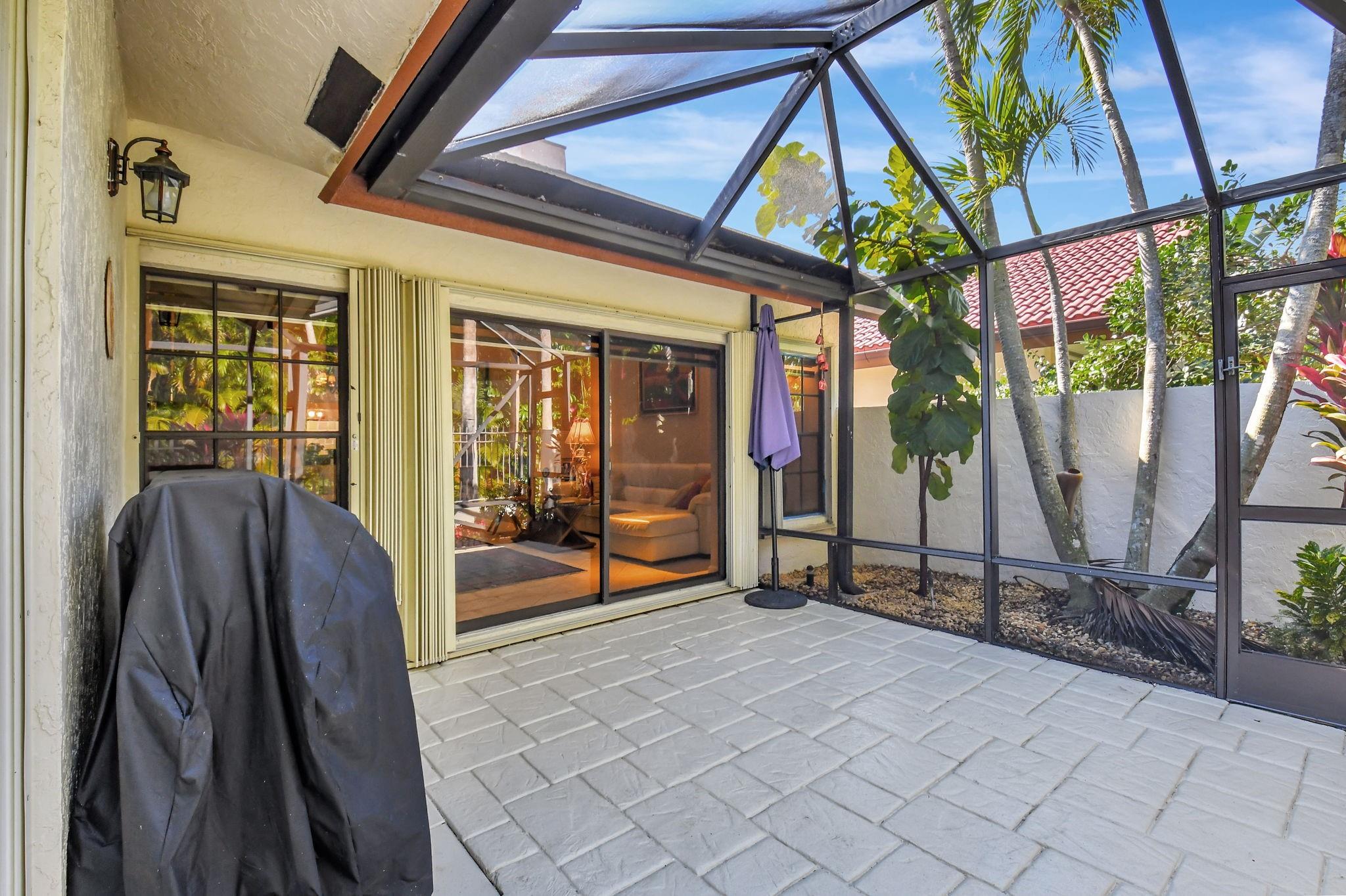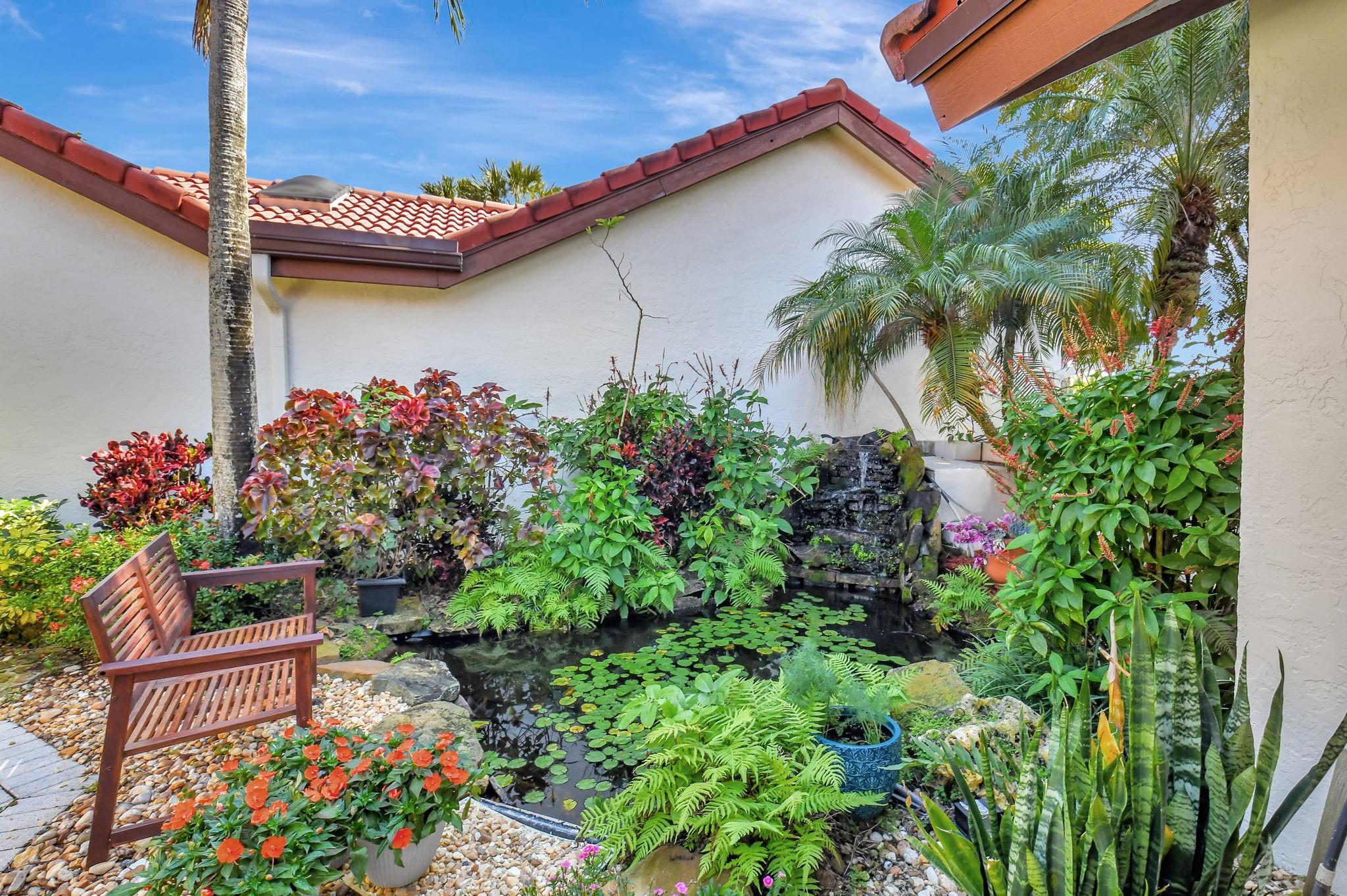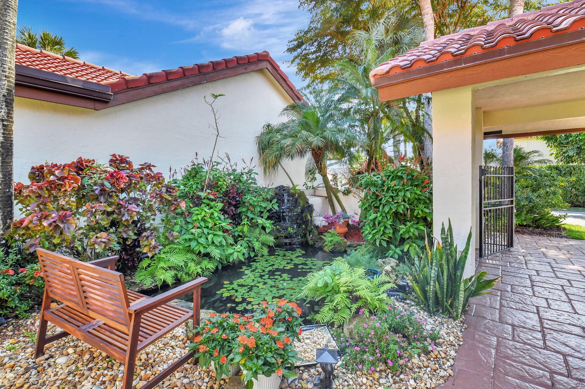 Rarely offered beautifully updated three bedroom plus family room Cayman model. Spacious split bedroom floorplan features soaring smooth ceilings, formal dining & living room with floor to ceiling fireplace. Generous updated kitchen offers granite countertops, smooth-top range w/double ovens, breakfast bar & SS appliances. Primary suite offers vaulted ceilings, beautiful updated bath with granite top vanity, relaxing soaking tub & tiled shower. Tropical lushly landscaped zen-like courtyard entry w/tranquil waterfall & koi pond. Side courtyard leads to your open patio plus a screened in patio perfect for outdoor living & entertaining. Enjoy a bonus greenspace space outside your back patio with a lake view, plenty of space to walk the dog and for the kids to play (maintained by the HOA).