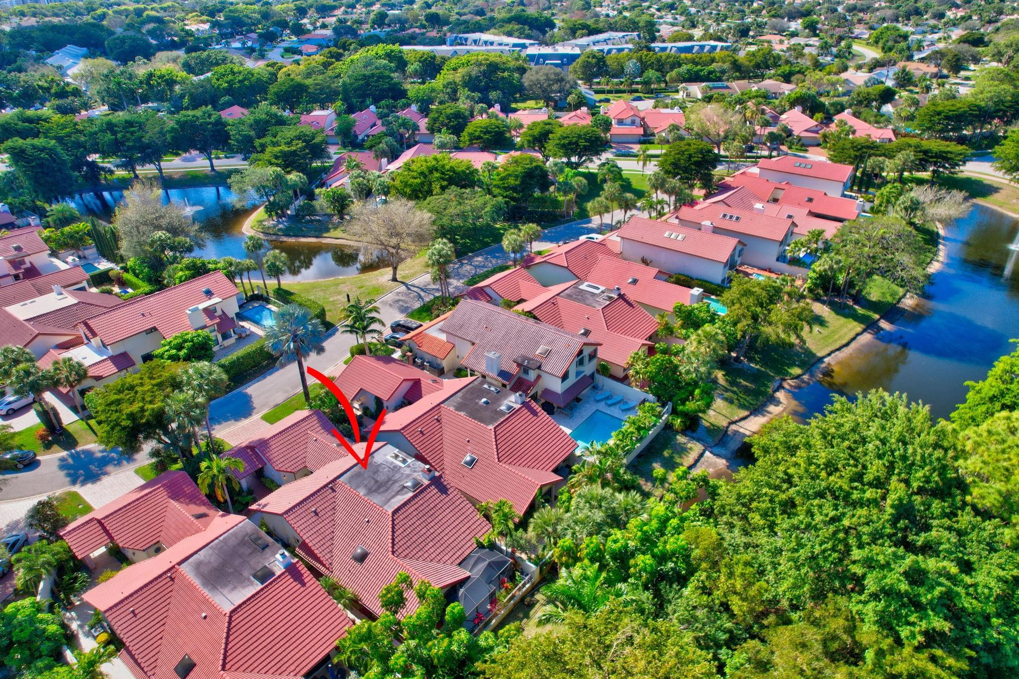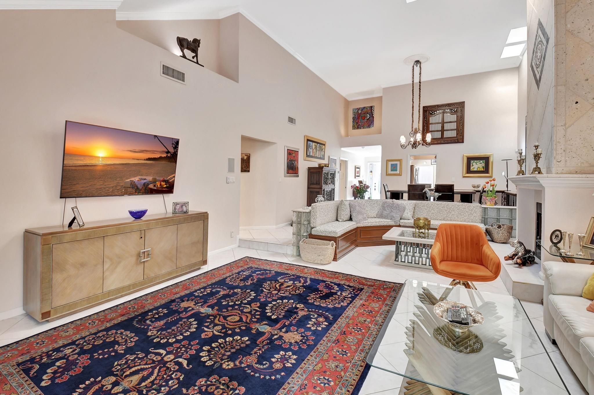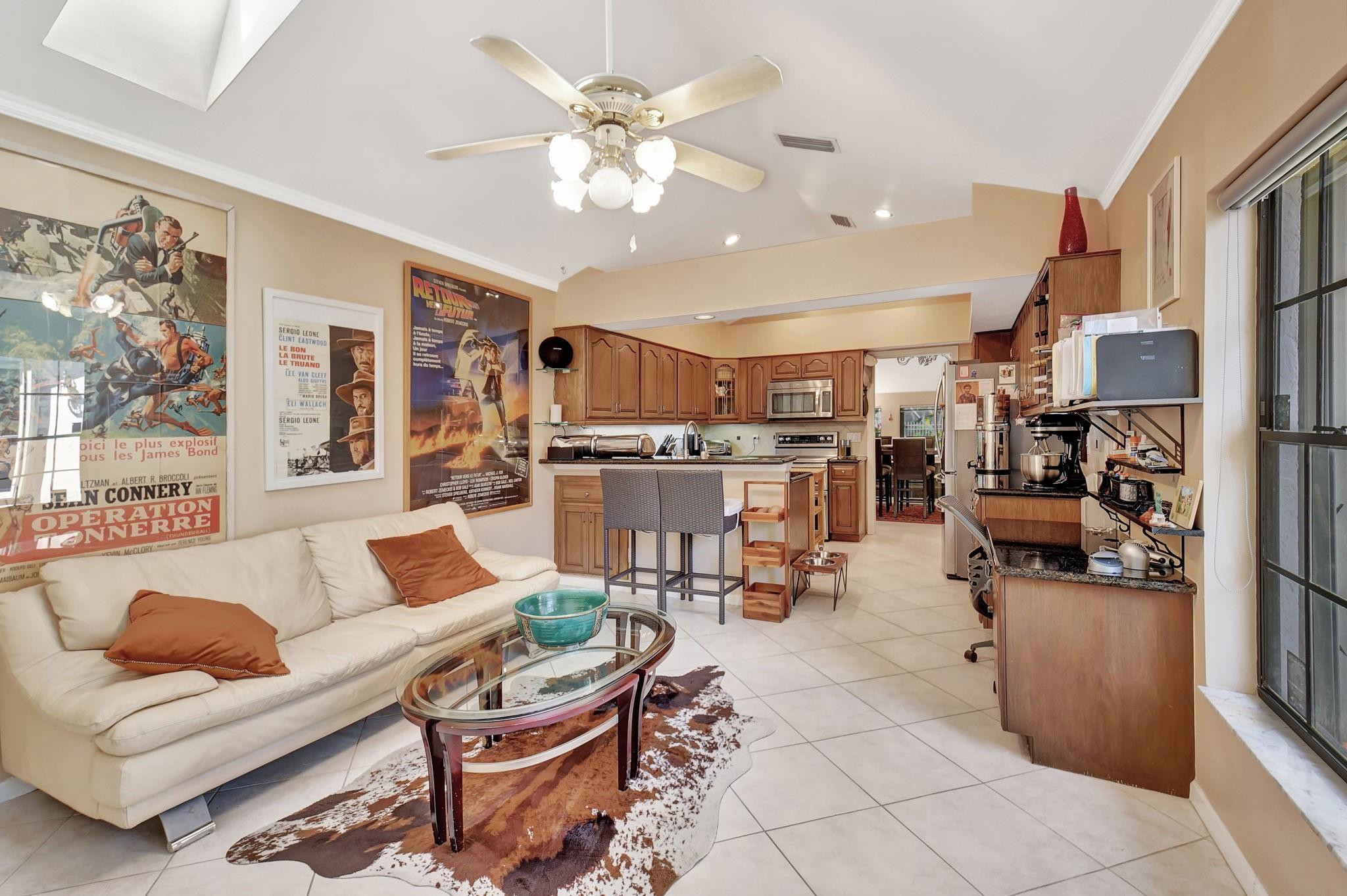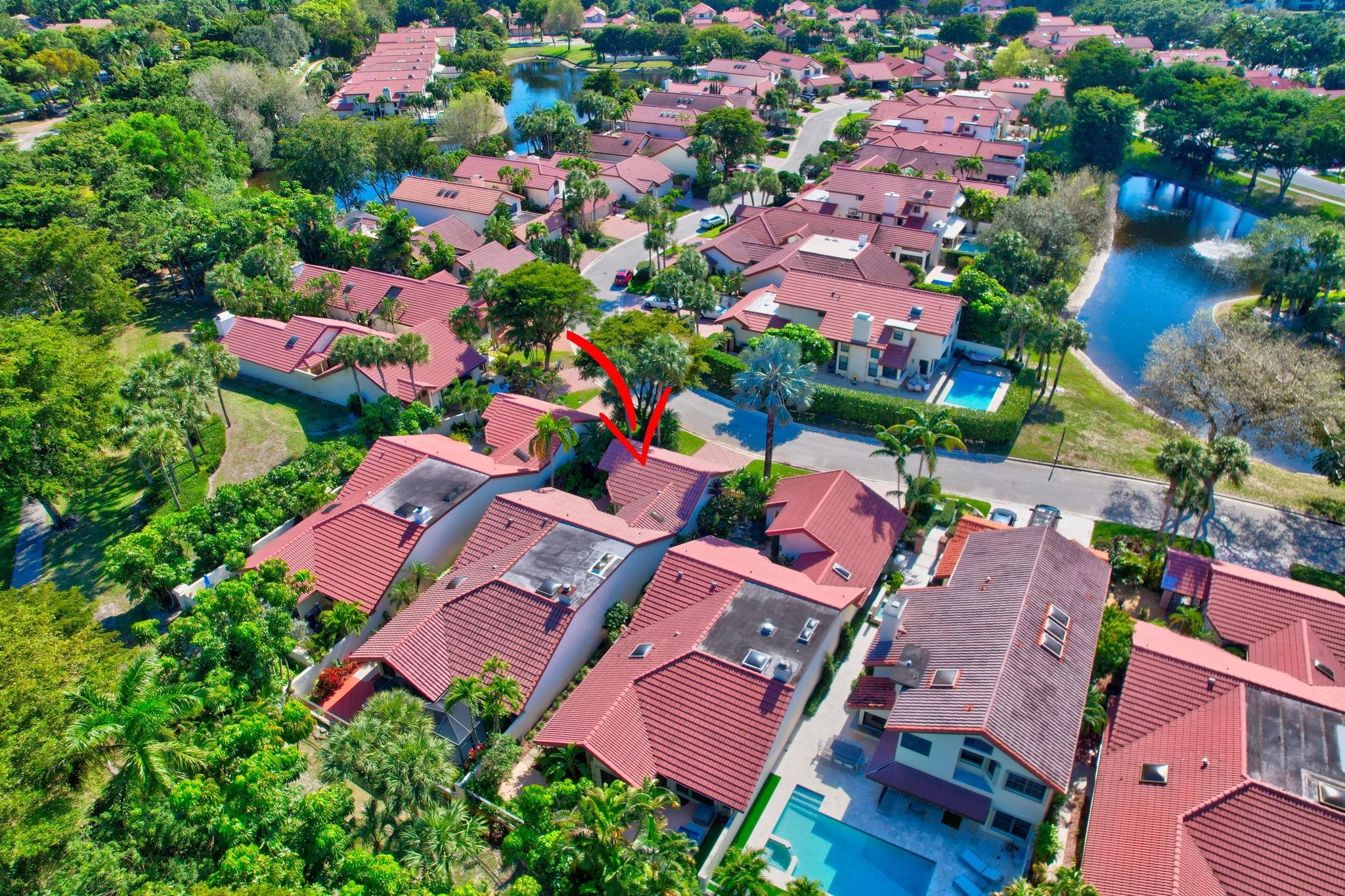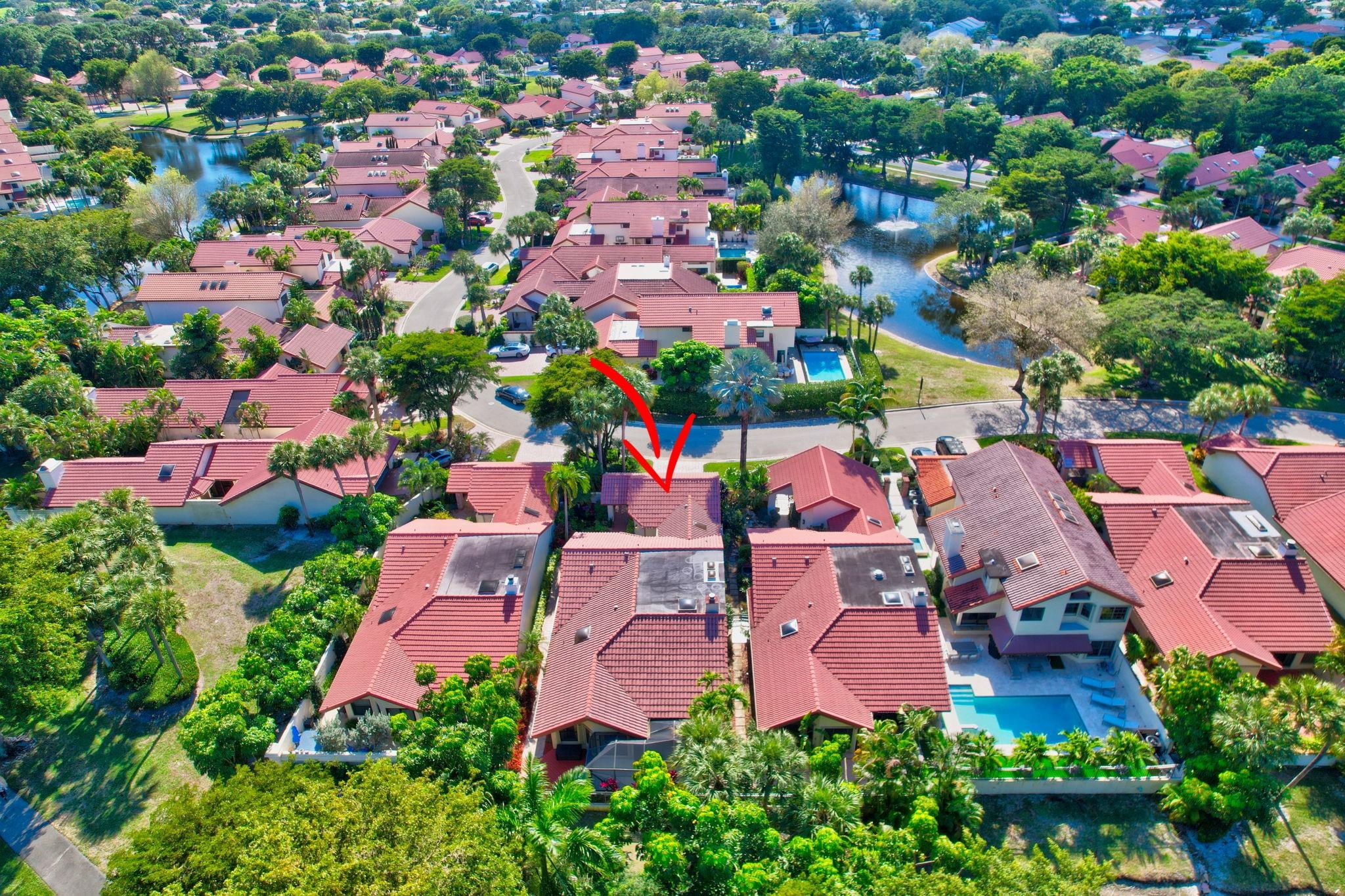 Rarely offered beautifully updated three bedroom plus family room Cayman model. Spacious split bedroom floorplan features soaring smooth ceilings, formal dining & living room with floor to ceiling fireplace. Generous updated kitchen offers granite countertops, smooth-top range w/double ovens, breakfast bar & SS appliances. Primary suite offers vaulted ceilings, beautiful updated bath with granite top vanity, relaxing soaking tub & tiled shower. Tropical lushly landscaped zen-like courtyard entry w/tranquil waterfall & koi pond. Side courtyard leads to your open patio plus a screened in patio perfect for outdoor living & entertaining. Enjoy a bonus greenspace space outside your back patio with a lake view, plenty of space to walk the dog and for the kids to play (maintained by the HOA).