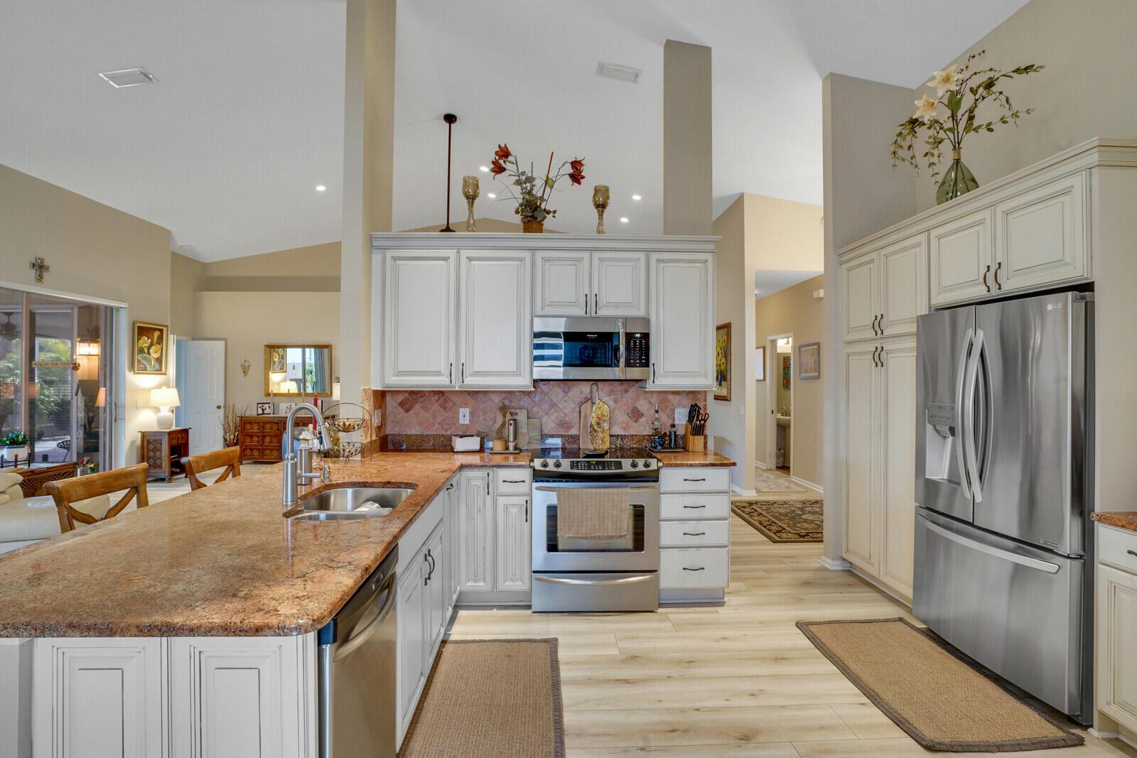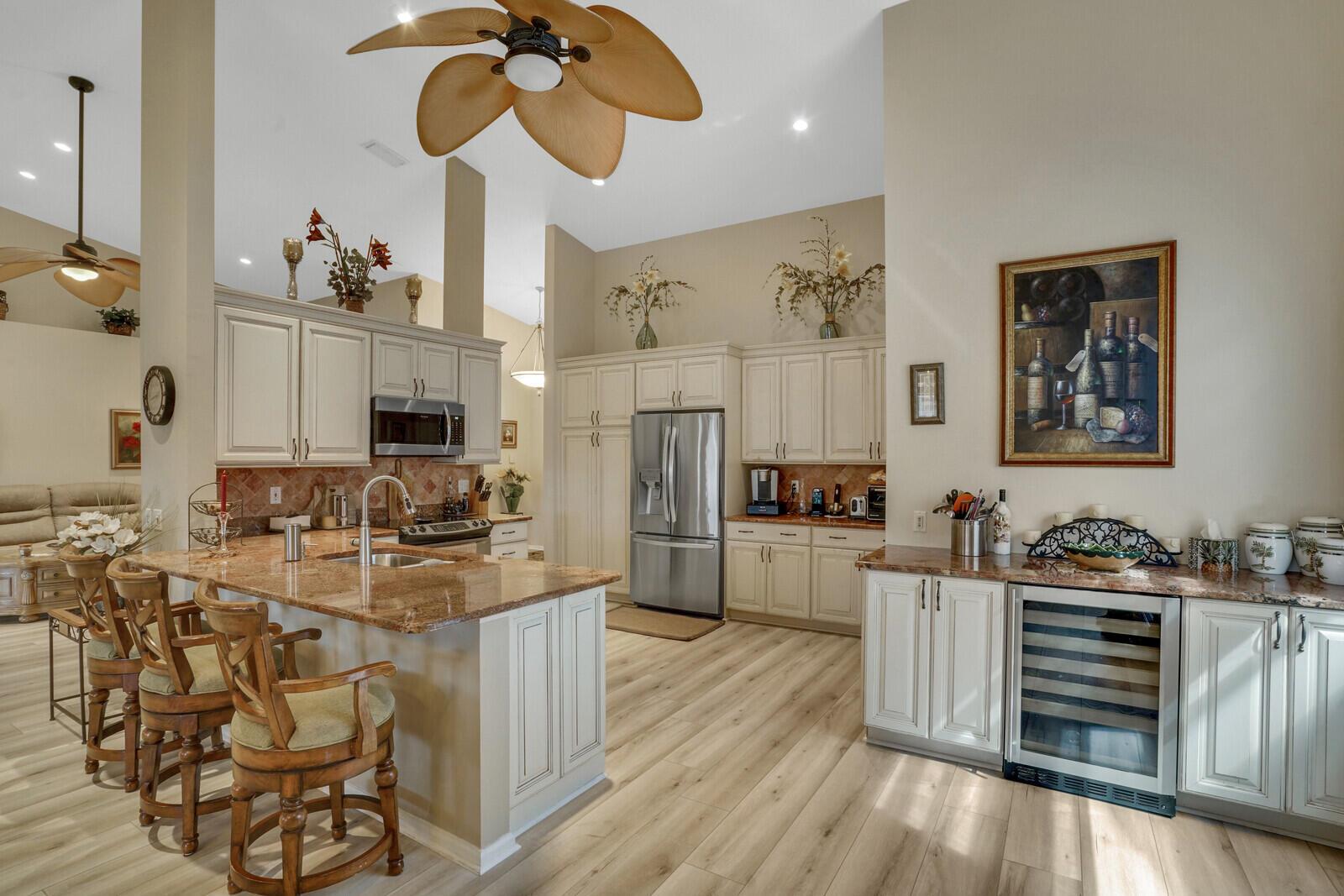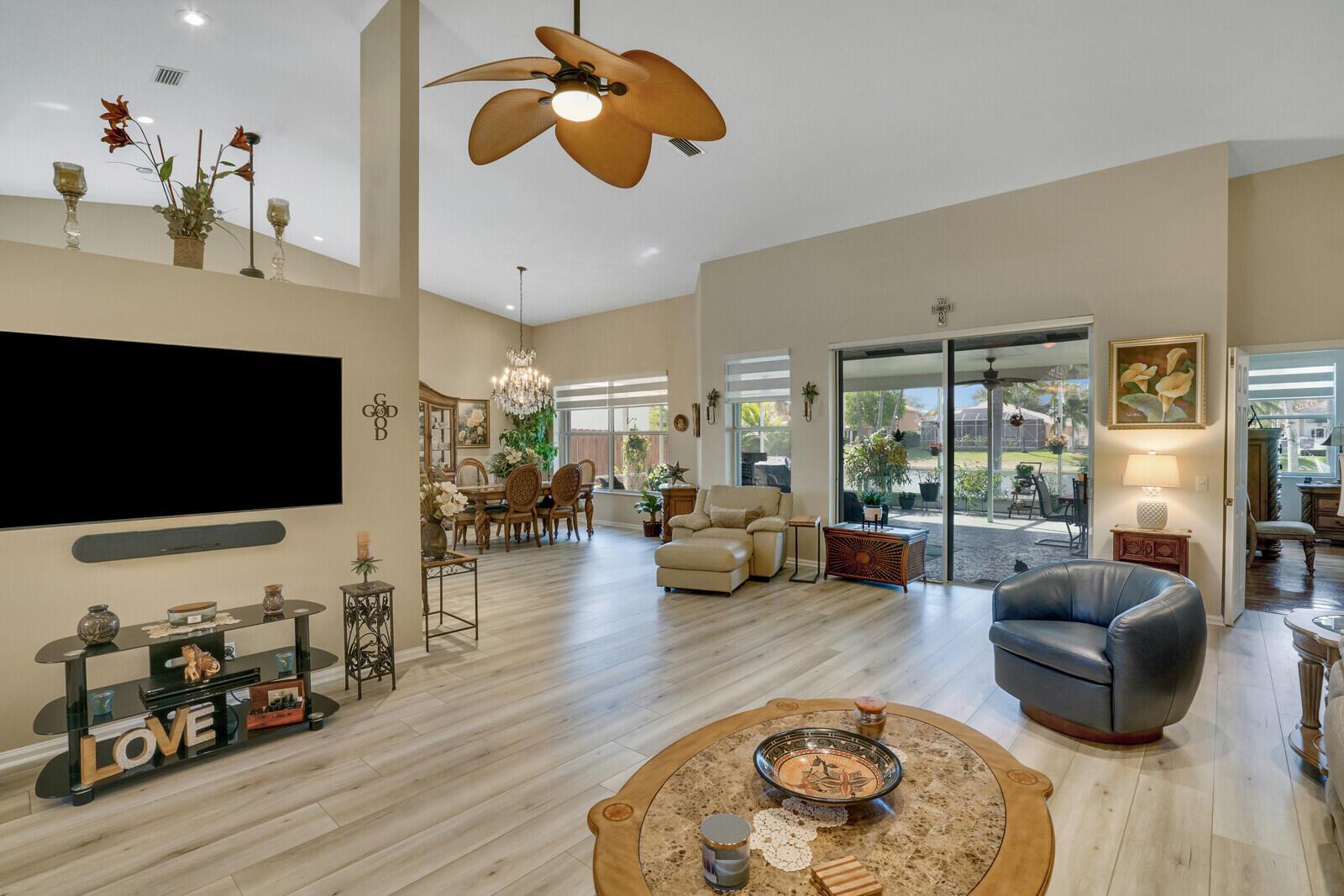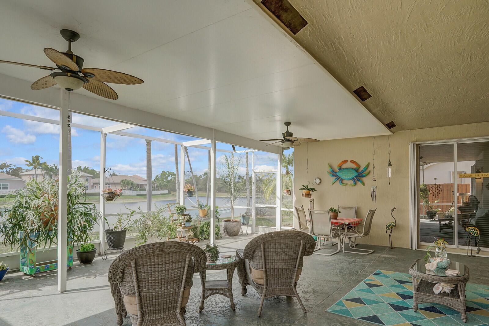 Welcome to this stunning 4-bedroom, 2.5-bathroom home with breathtaking water views and a massive screened-in enclosure, perfect for enjoying the outdoors in comfort. This home underwent a major renovation in 2021, including new bathrooms, modern wood look floors, custom window treatments and paint. All major items recently replaced. A/C system (2021), water heater (2022) and roof (2016). Home has an open floor plan that boasts high ceilings with water views from all the windows. The home offers ample storage space, including a spacious kitchen with a wine fridge, ideal for entertaining. Other upgrades include a beautiful Austrian crystal chandelier and accordion shutters. Situated in a well-maintained community with low HOA fees. This home truly has it all. Come see it for yourself.