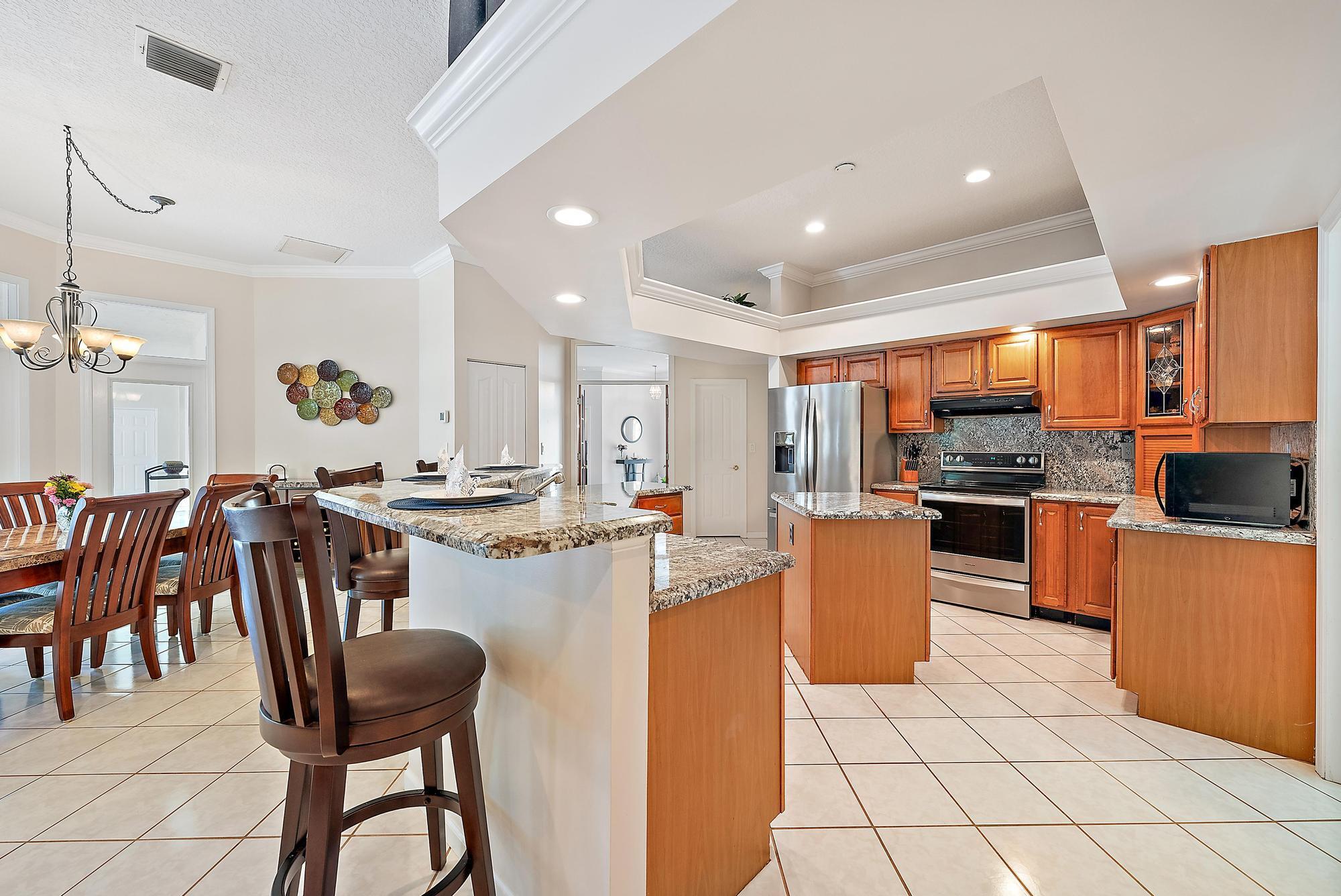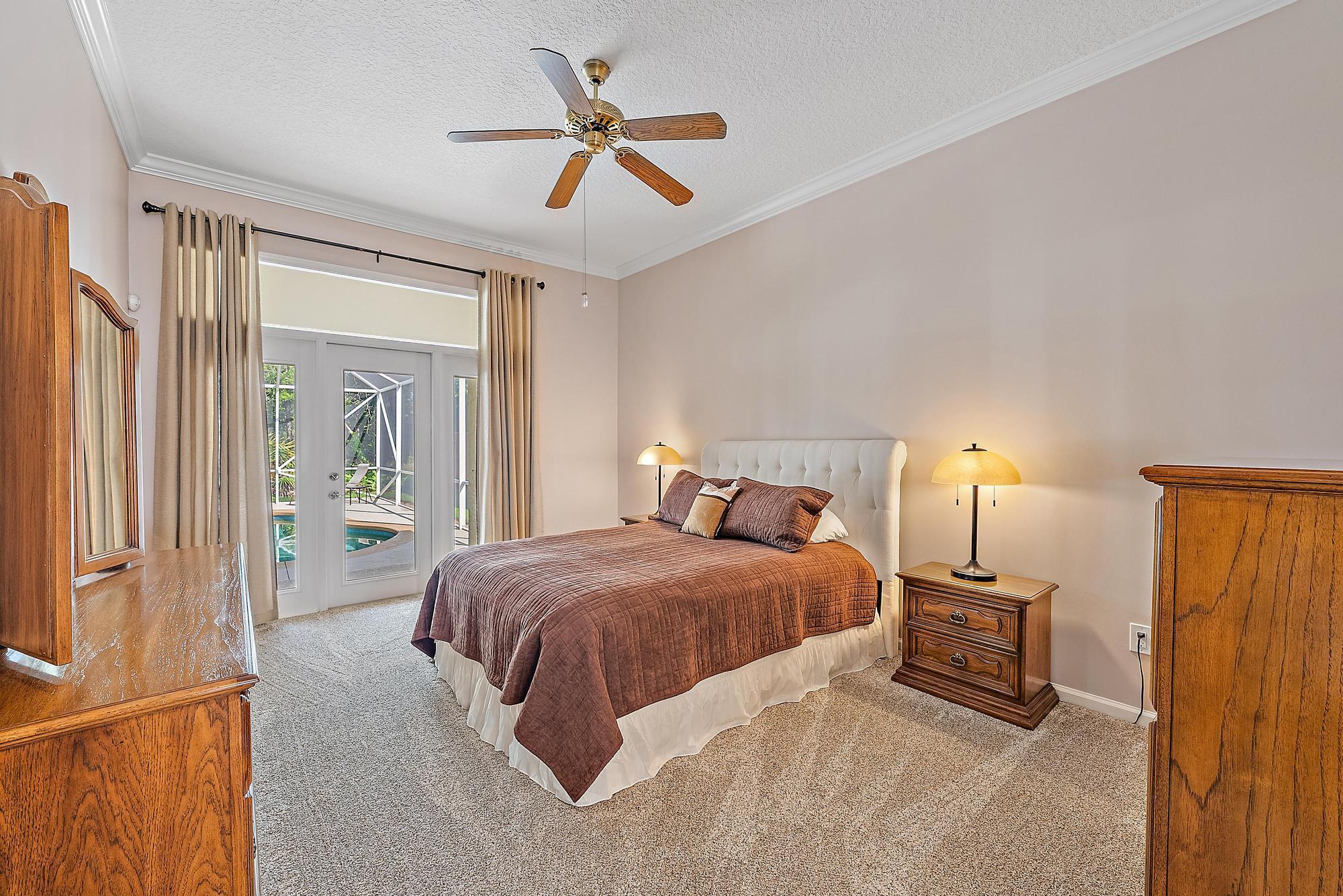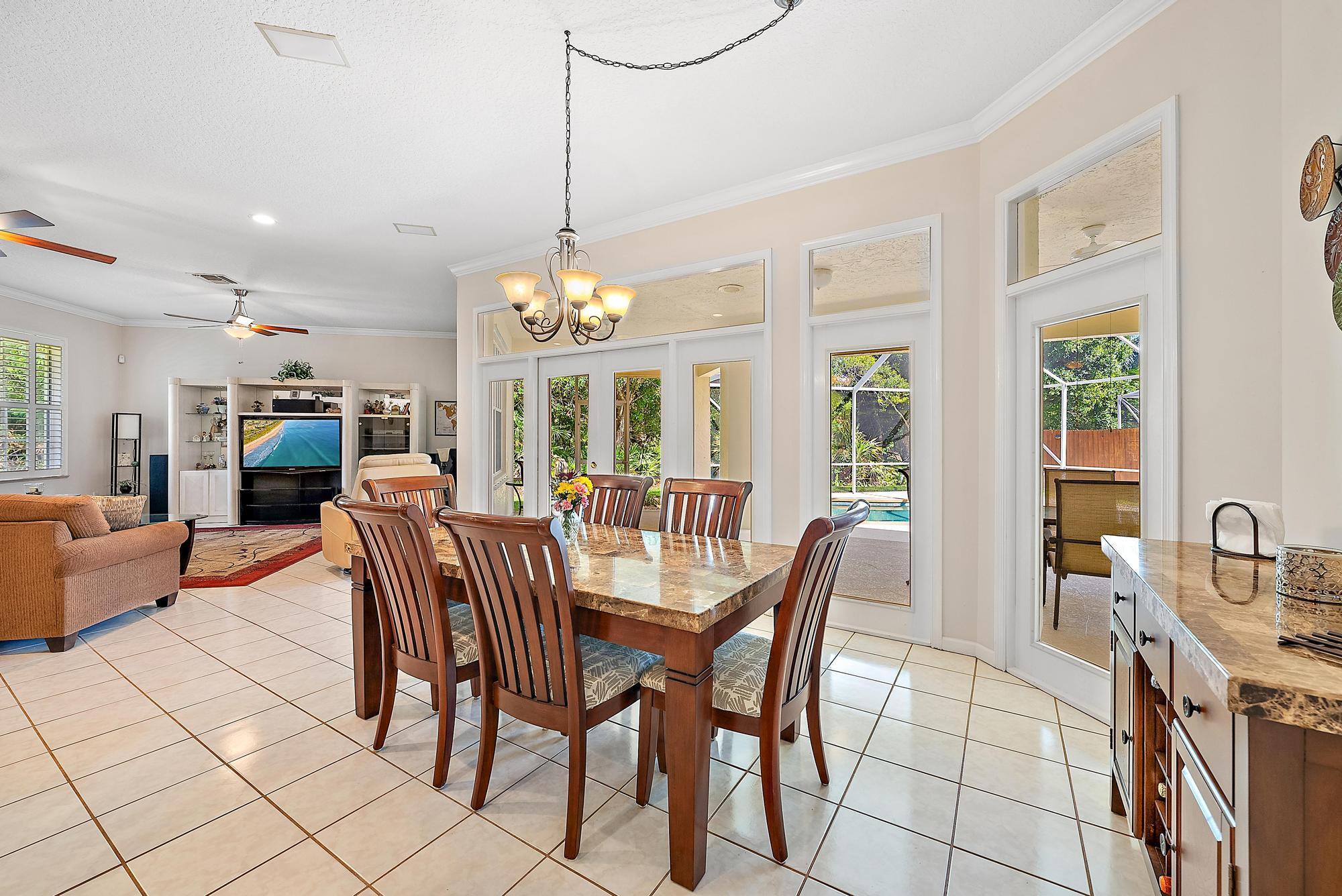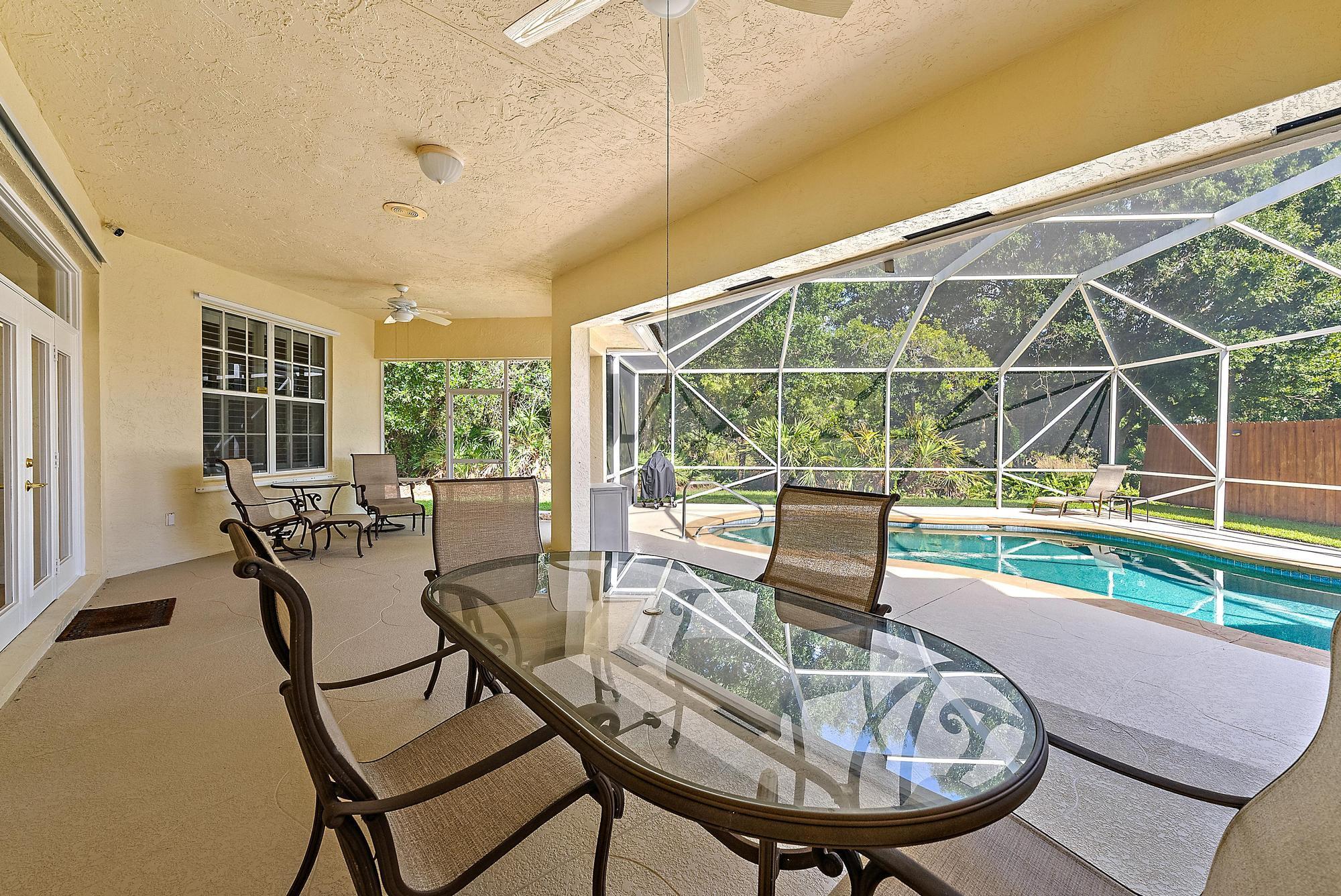 Located in The Shores of Jupiter, this 2-story pool home offers 3,665 sq ft of living space, 5 bedrooms, a den/office (convertible to a 6th bedroom) and 2.5 baths. An open floor plan includes tile flooring and crown molding on the main level, with plantation shutters. The kitchen boasts wood cabinetry, a central island, stainless steel appliances (2021) and granite countertops. A laundry room with LG washer/dryer (2016) is off the kitchen. French doors lead to a resurfaced, screen-enclosed pool and patio with preserve views. The main-level primary suite offers a renovated (2021) spa-like bathroom. Upstairs, 4 spacious bedrooms and multiple walk-in closets provide ample storage. A newer metal roof (2014)