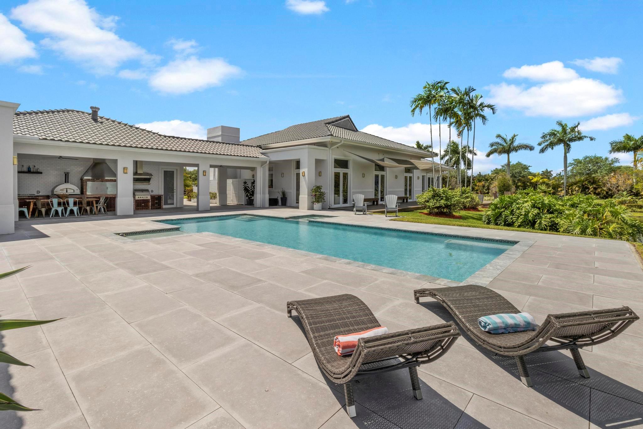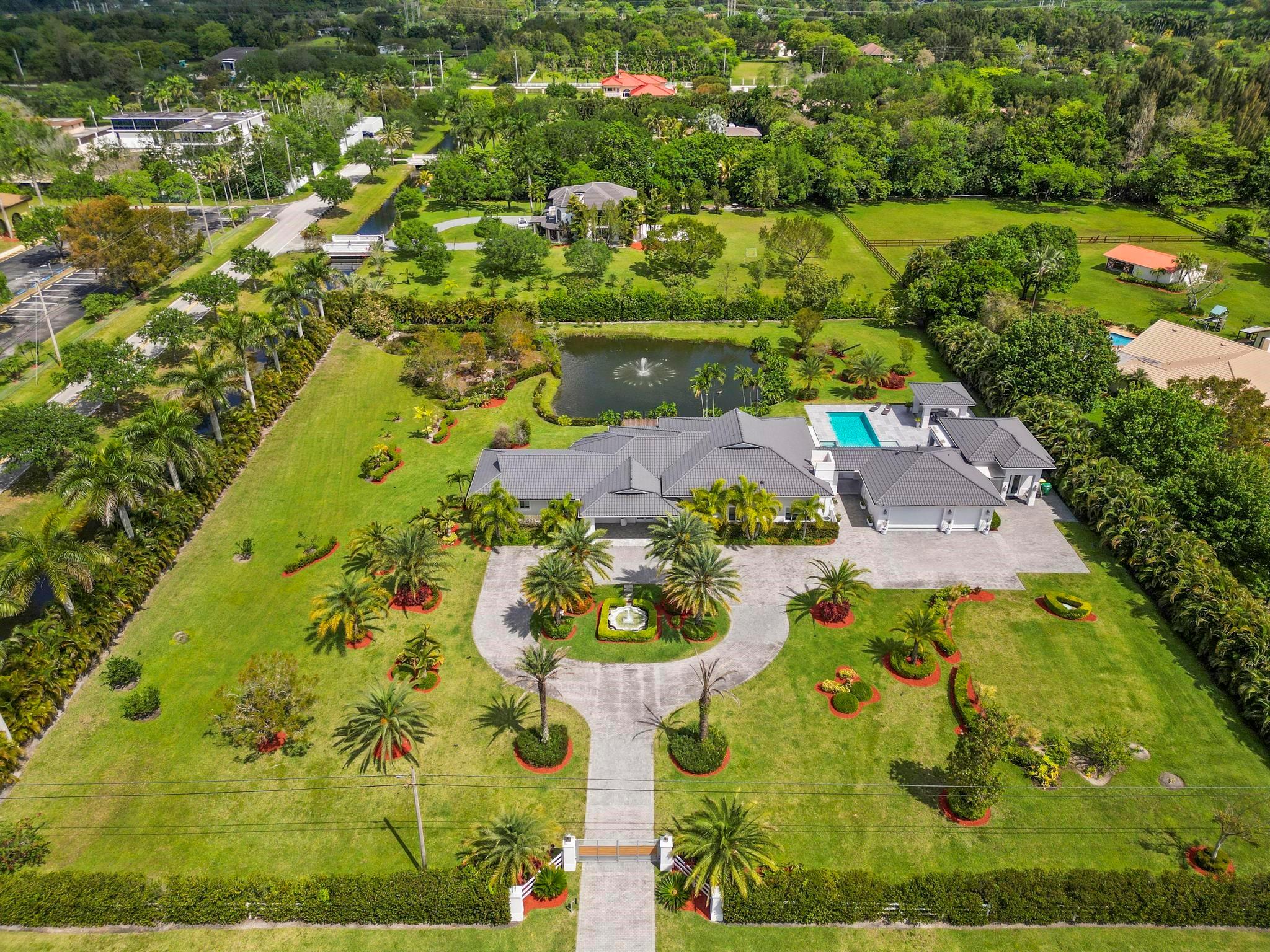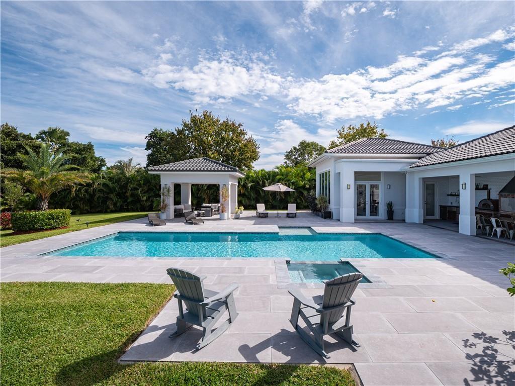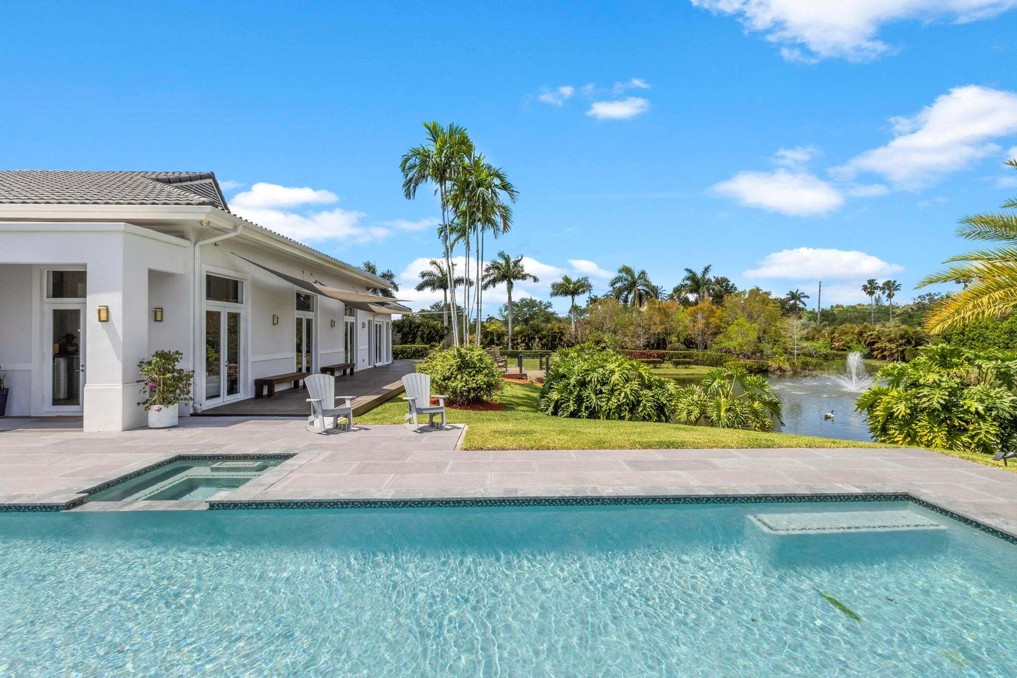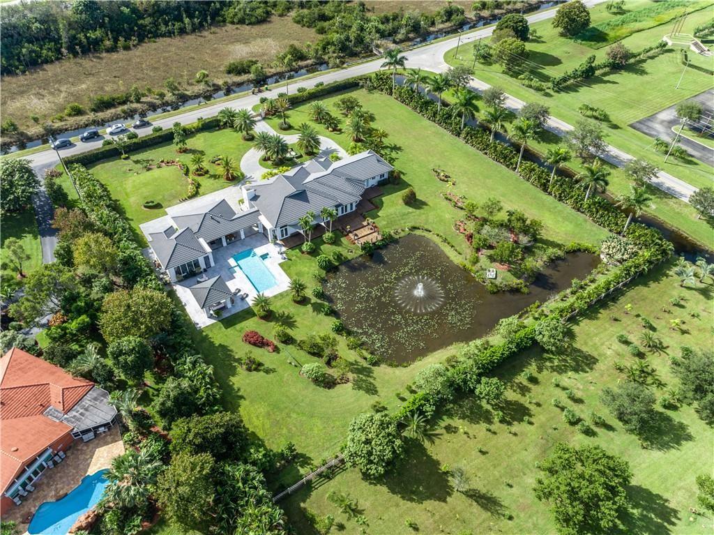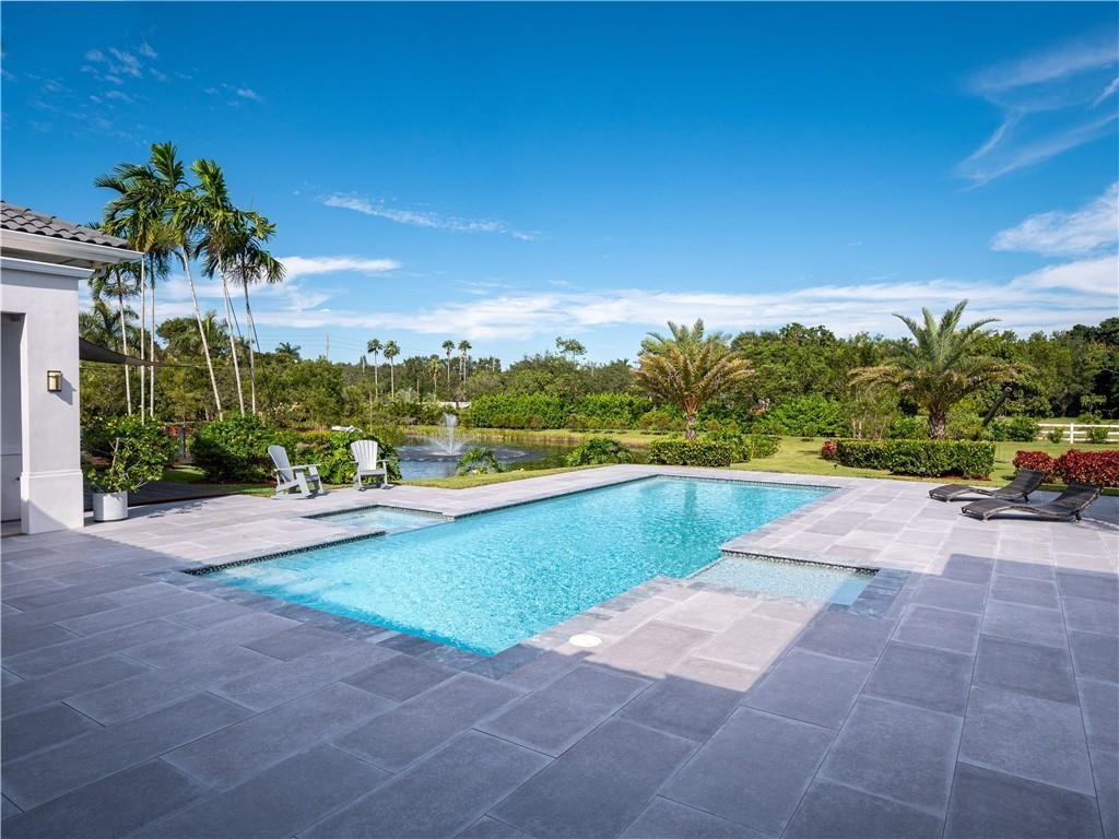 Escape to your Private 2.3-ac Estate in Sunshine Ranches with beautiful lush tropical landscaping. Luxurious 6,200 sqft residence harmonizing rustic charm w/modern design. Enjoy an open floorplan w/Italian porcelain floors, vaulted ceilings & an abundance of natural light. This exquisitely renovated home offers a Chef’s kitchen w/hand-painted Italian-tile backsplash, beautiful cabinetry adorned w/stunning quartz countertops & premium appliances. Picturesque views of tropical-foliaged grounds featuring a storybook pond & Zen-setting. Seamlessly transition to al fresco entertaining w/spacious covered terraces, custom built-in BBQ, Argentinian Rotisserie Grill, Old World Pizza Brick Oven & full Summer Kitchen amenities. Resort-style salt-water pool & Guest House complete this marvelous home!