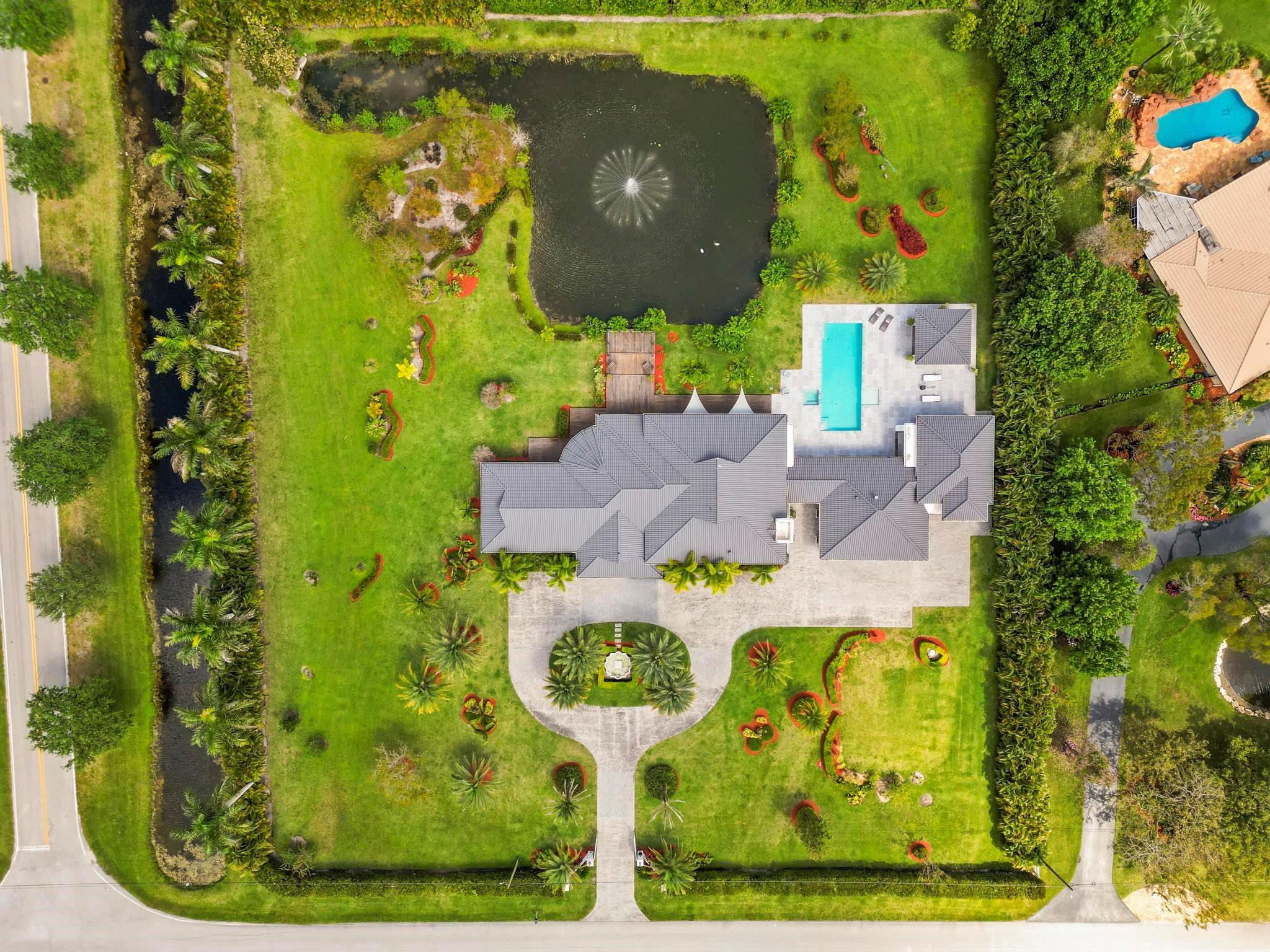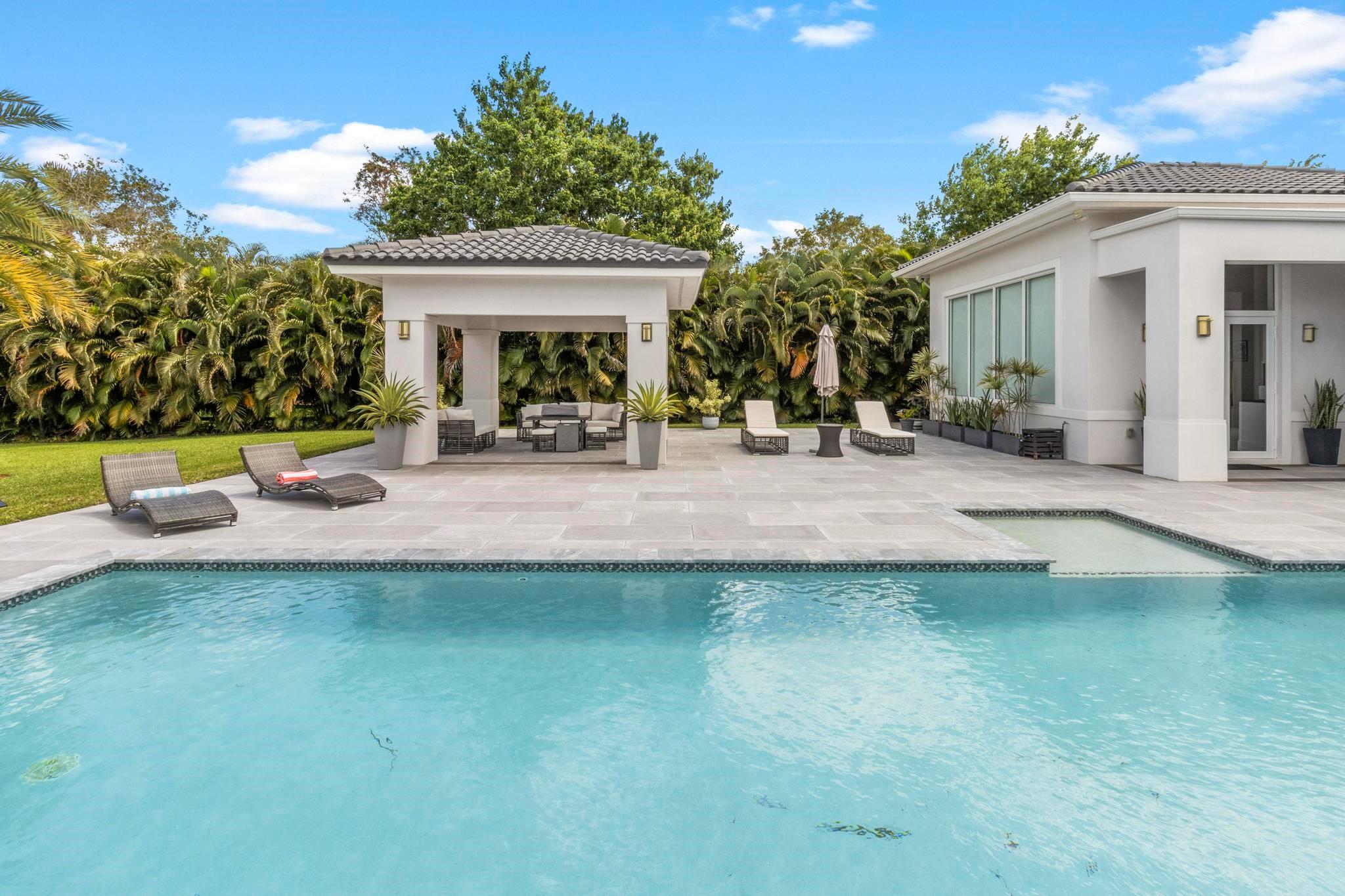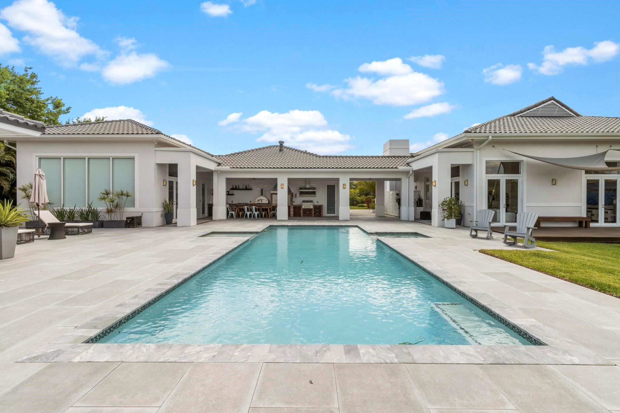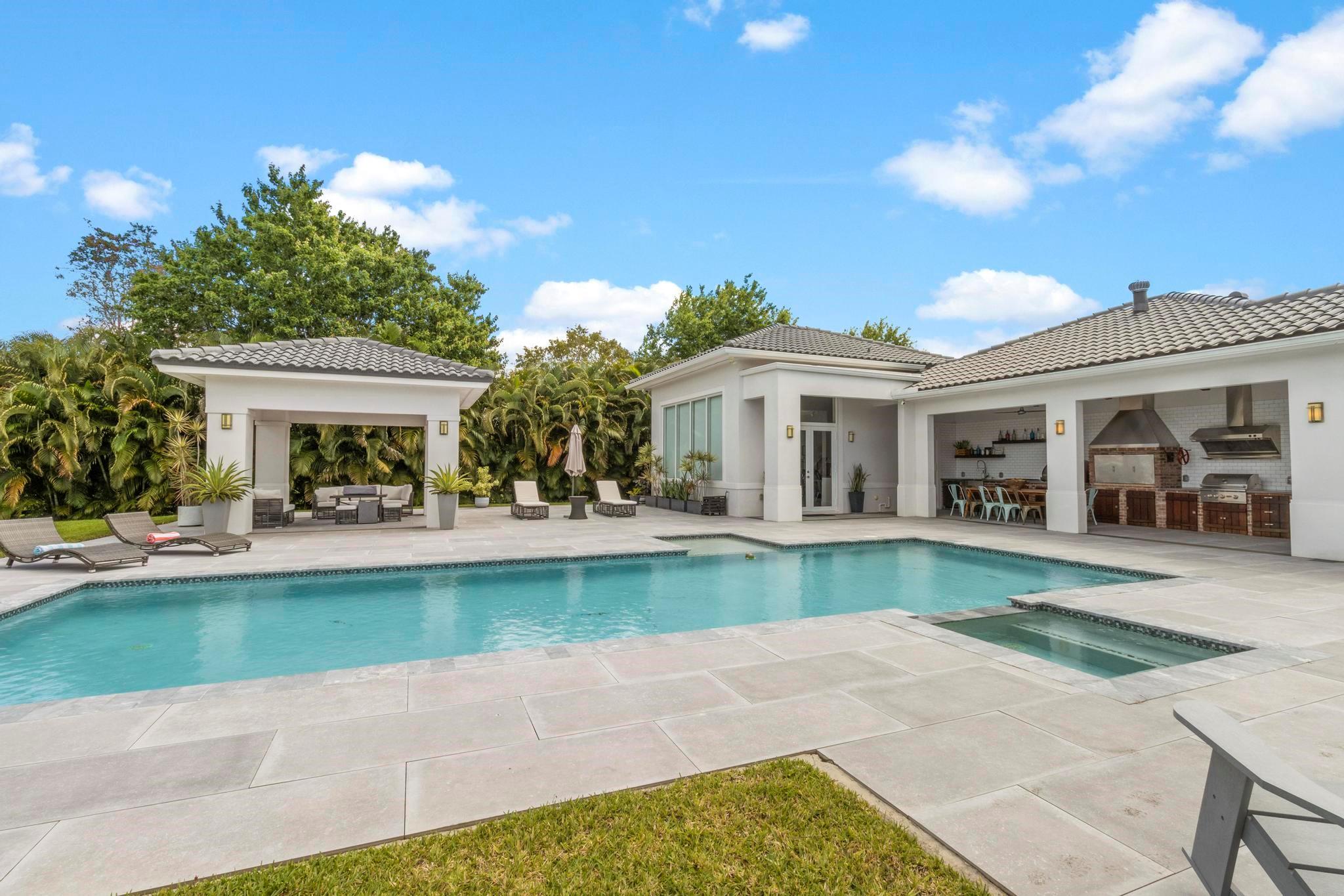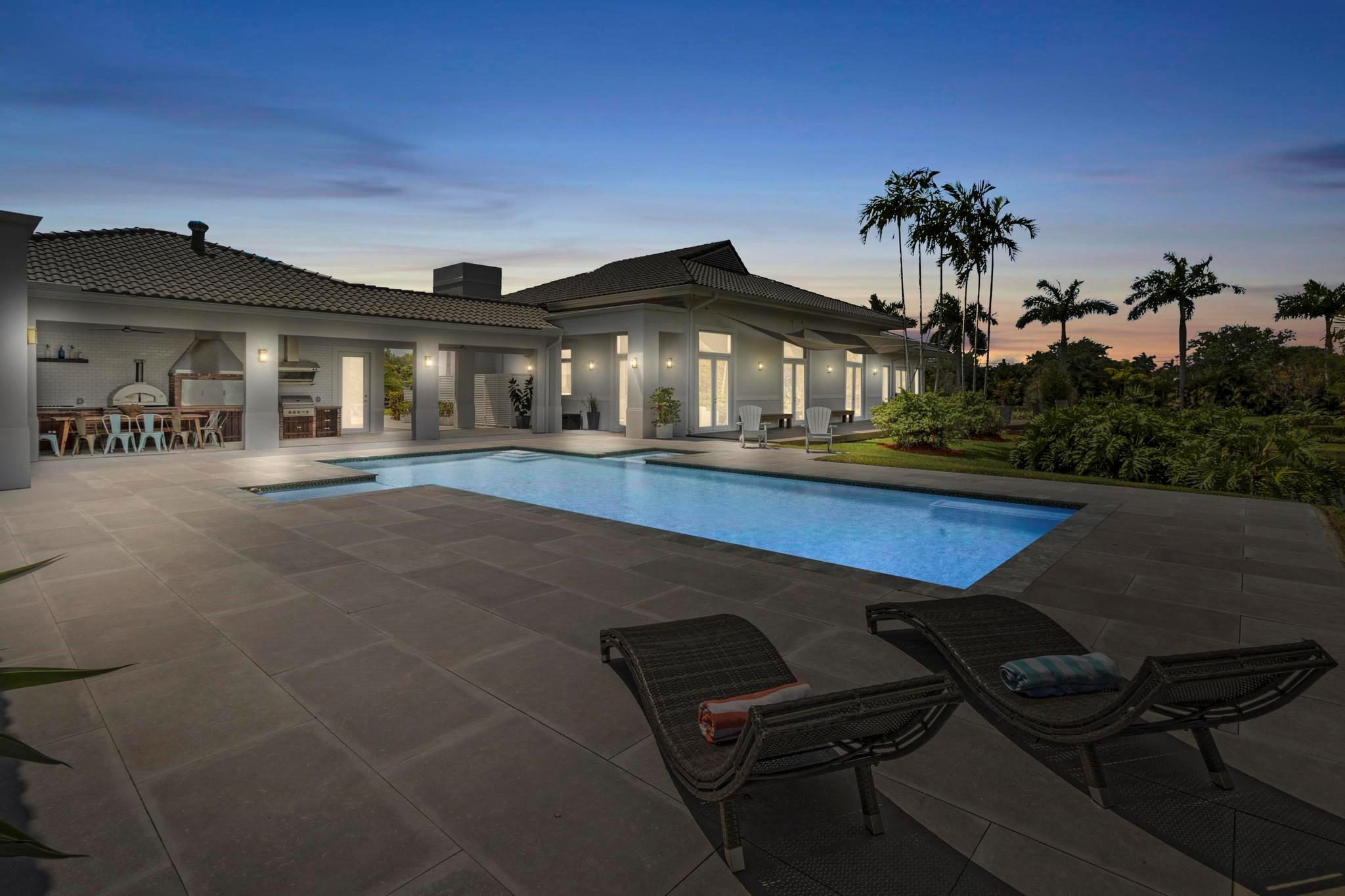 Escape to your Private 2.3-ac Estate in Sunshine Ranches with beautiful lush tropical landscaping. Luxurious 6,200 sqft residence harmonizing rustic charm w/modern design. Enjoy an open floorplan w/Italian porcelain floors, vaulted ceilings & an abundance of natural light. This exquisitely renovated home offers a Chef’s kitchen w/hand-painted Italian-tile backsplash, beautiful cabinetry adorned w/stunning quartz countertops & premium appliances. Picturesque views of tropical-foliaged grounds featuring a storybook pond & Zen-setting. Seamlessly transition to al fresco entertaining w/spacious covered terraces, custom built-in BBQ, Argentinian Rotisserie Grill, Old World Pizza Brick Oven & full Summer Kitchen amenities. Resort-style salt-water pool & Guest House complete this marvelous home!