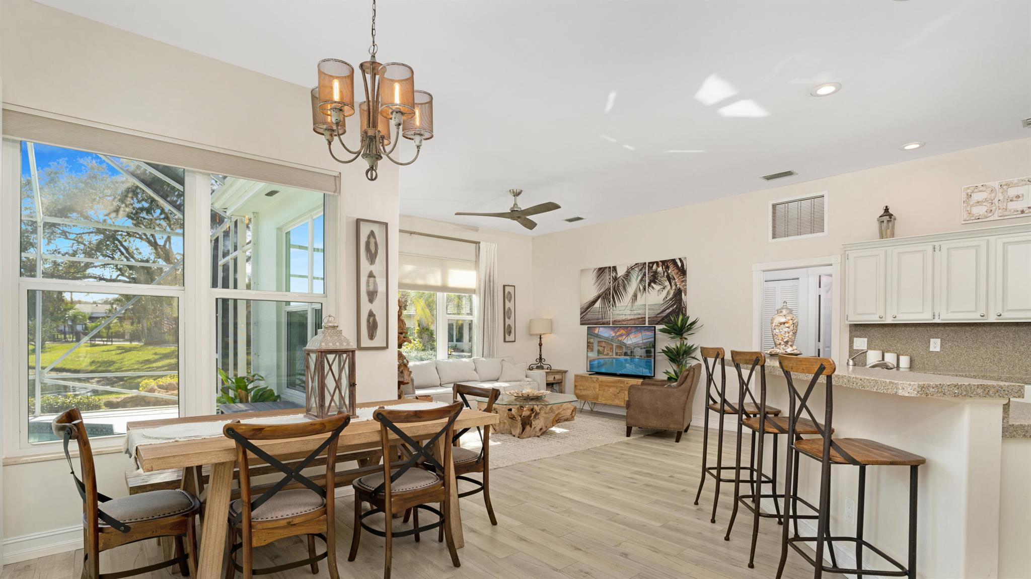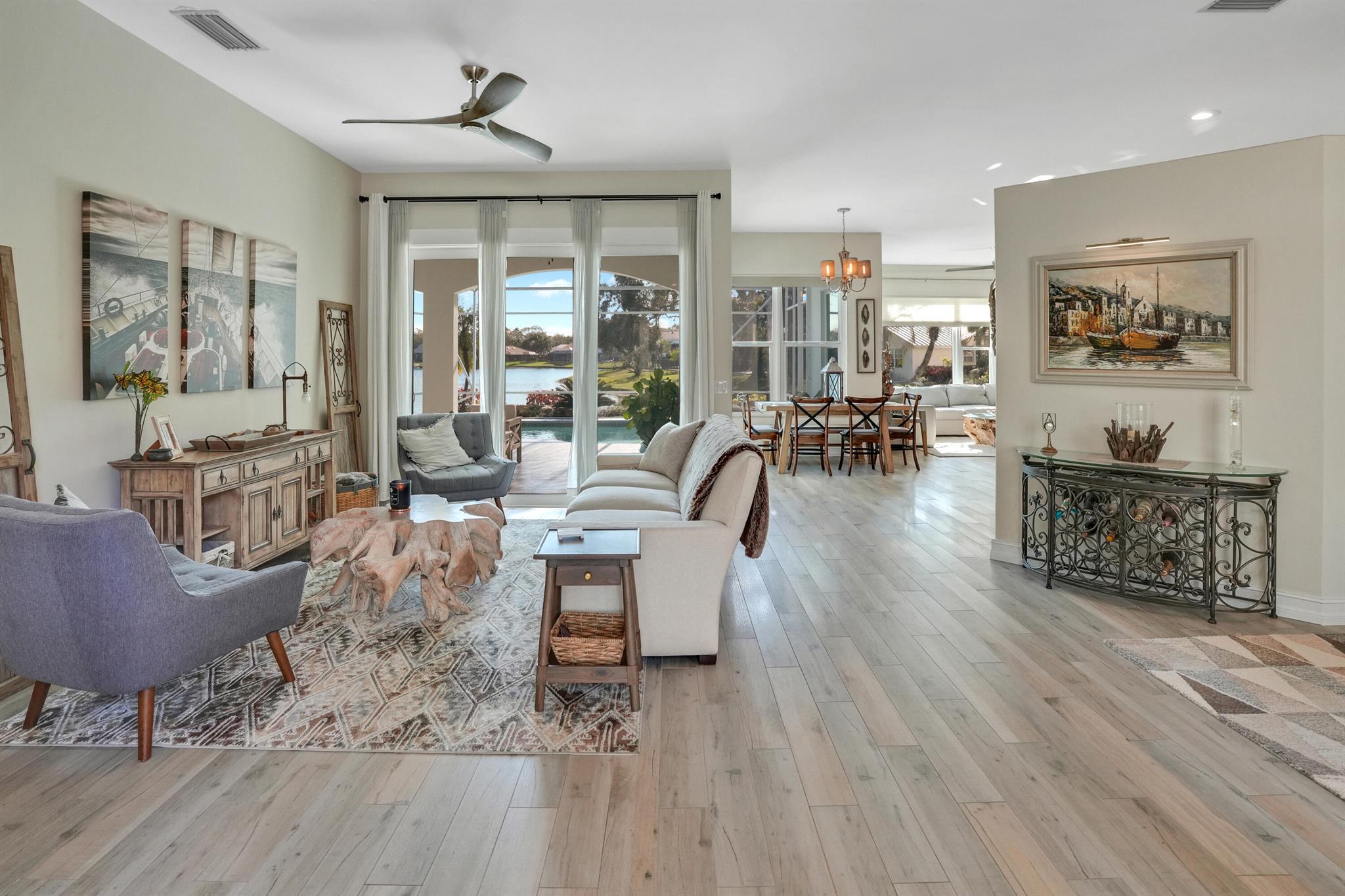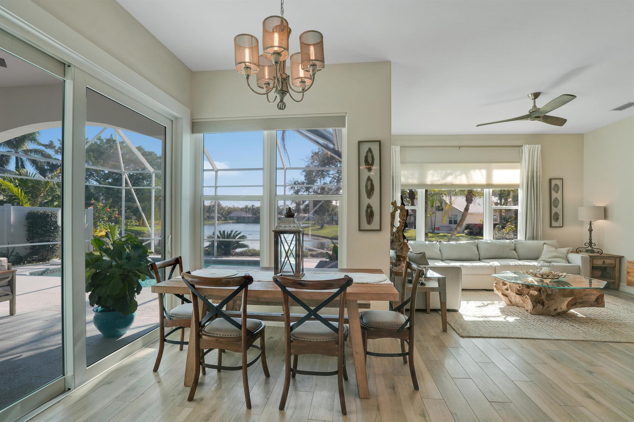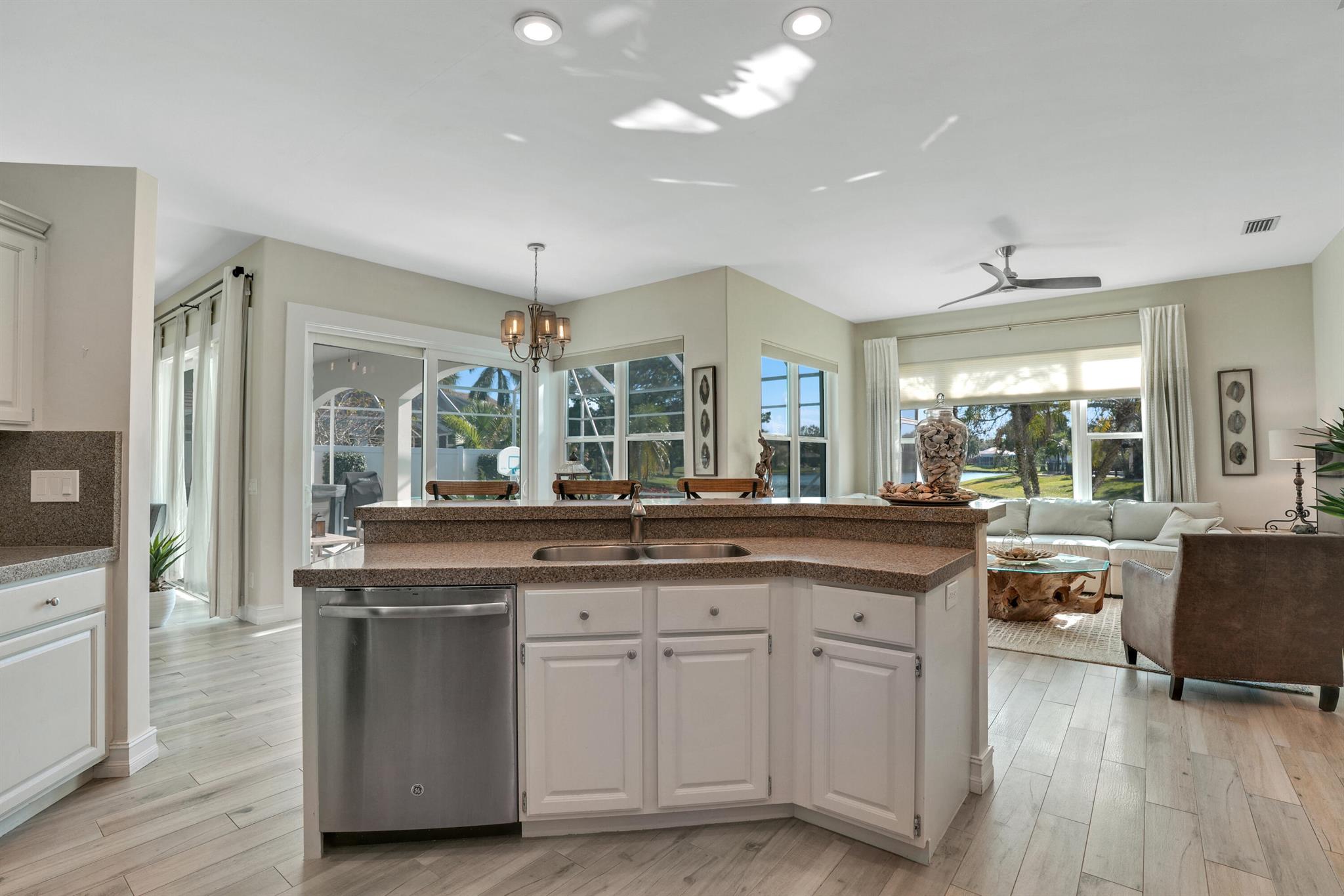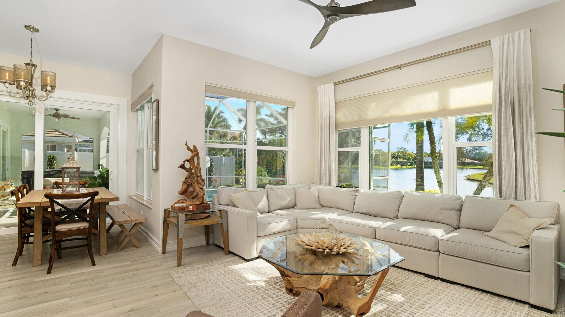 LONG LAKE VIEWS! 3 Bed + Den, 2 Bath, CBS Masterpiece w/ heated pool, IMPACT GLASS & S. exposure in The Shores. Luxury is woven throughout! 10′ ceilings greet along w/ instant pool & lake views before plank tile in driftwood tones guide you to a private den at right. Next, the large living room & family rooms are separated by a dining room and kitchen which features: stainless appliances, an island seating 5, cabinets w/ slide outs & a pantry. The covered lanai, pool, spa, lake views & sunsets are accessed via 3 sets of sliding glass doors. Back inside, 2 guest bedrooms share an updated hall bath w/ glass shower. The Main Bedroom, designed in 2023 is breathtaking! A walk-in closet w/ organizer, 2 Vanities, corner tub, glass shower, Champagne Bronze fixtures AC 2021, W & D 2024 A-Rated Sc