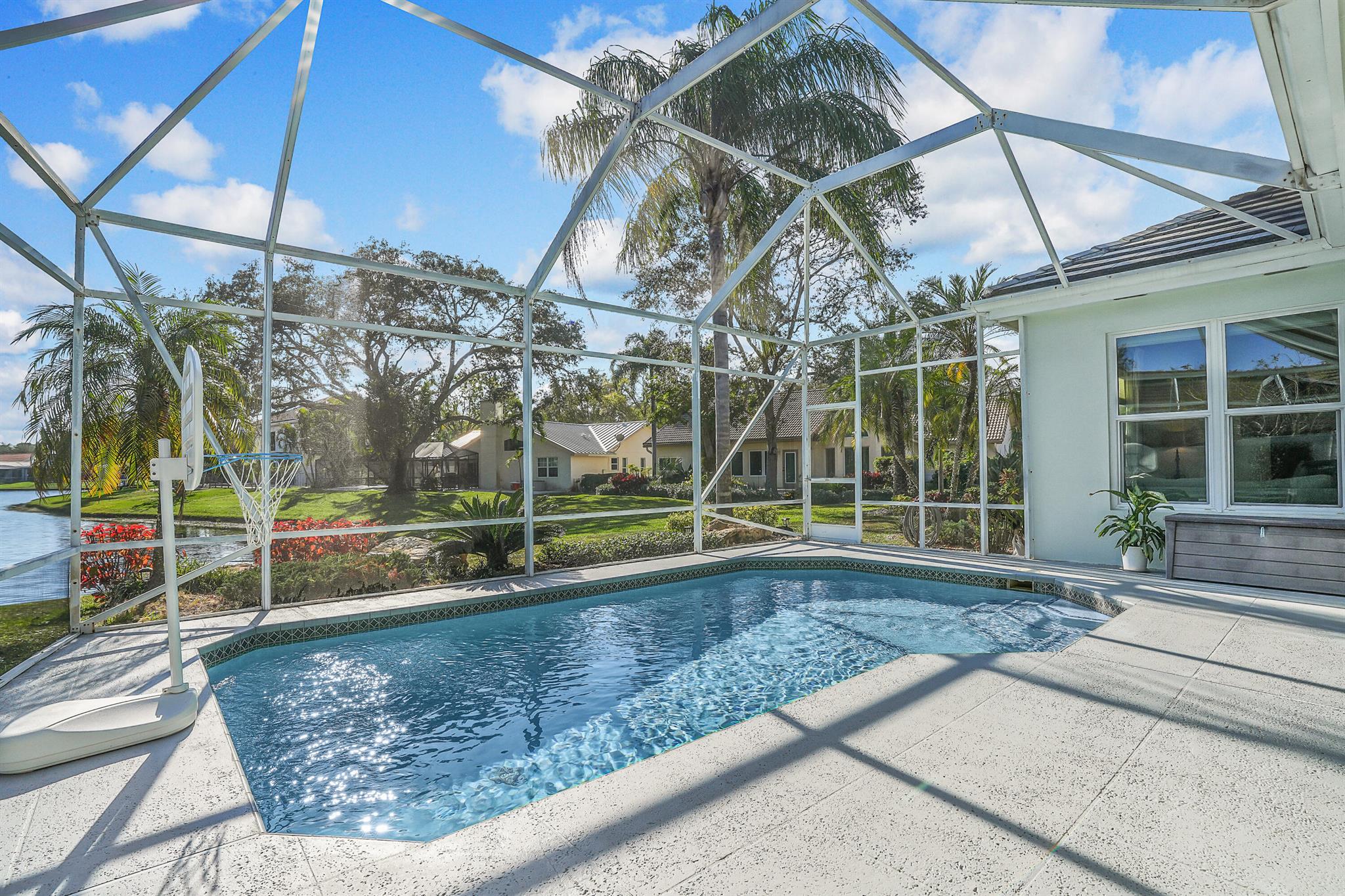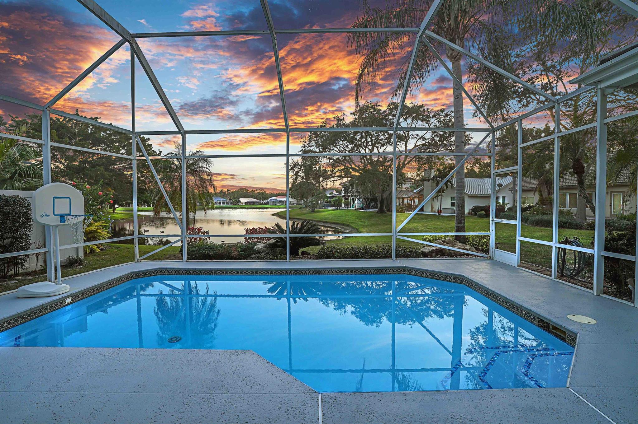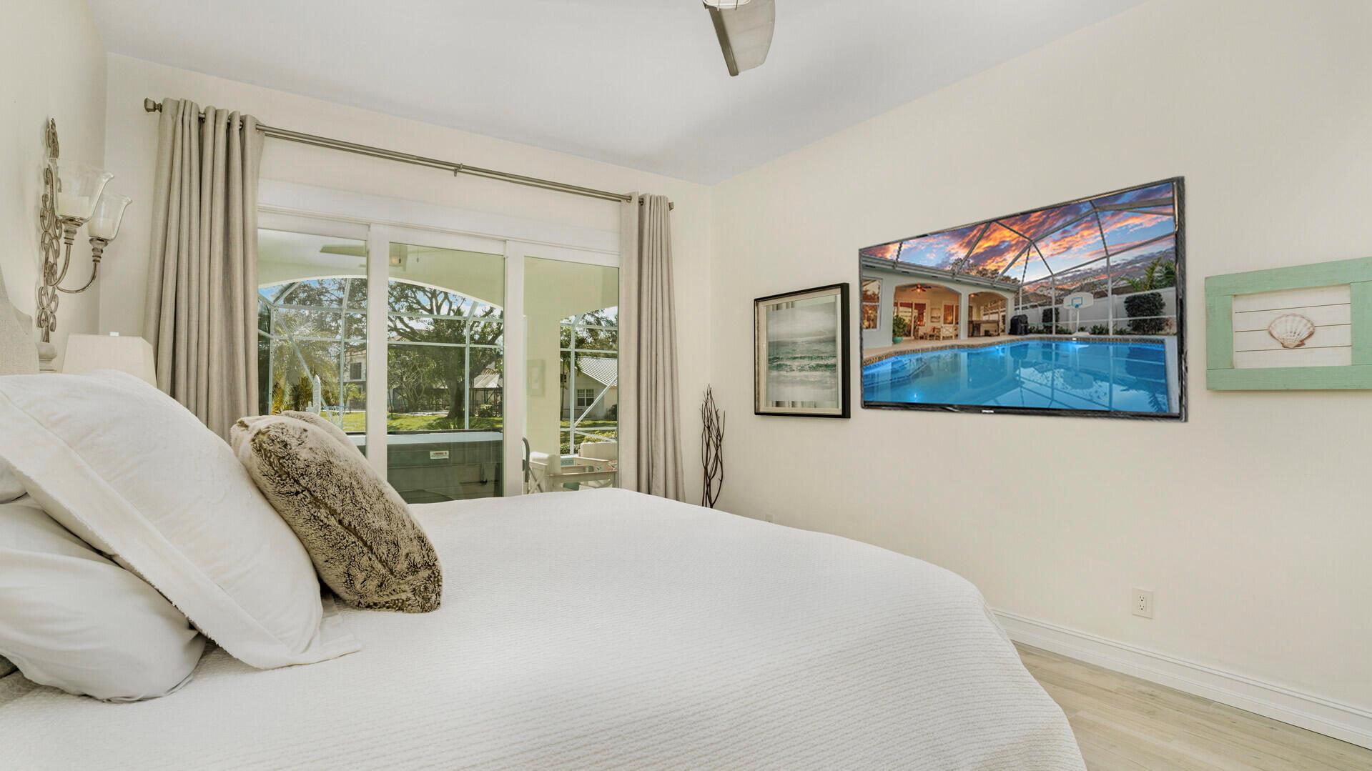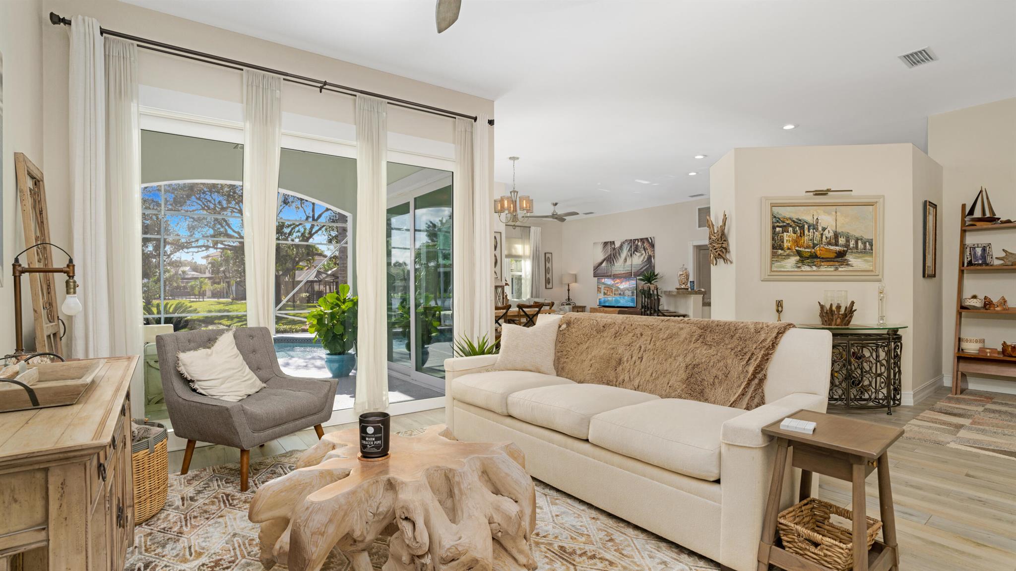 LONG LAKE VIEWS! 3 Bed + Den, 2 Bath, CBS Masterpiece w/ heated pool, IMPACT GLASS & S. exposure in The Shores. Luxury is woven throughout! 10′ ceilings greet along w/ instant pool & lake views before plank tile in driftwood tones guide you to a private den at right. Next, the large living room & family rooms are separated by a dining room and kitchen which features: stainless appliances, an island seating 5, cabinets w/ slide outs & a pantry. The covered lanai, pool, spa, lake views & sunsets are accessed via 3 sets of sliding glass doors. Back inside, 2 guest bedrooms share an updated hall bath w/ glass shower. The Main Bedroom, designed in 2023 is breathtaking! A walk-in closet w/ organizer, 2 Vanities, corner tub, glass shower, Champagne Bronze fixtures AC 2021, W & D 2024 A-Rated Sc