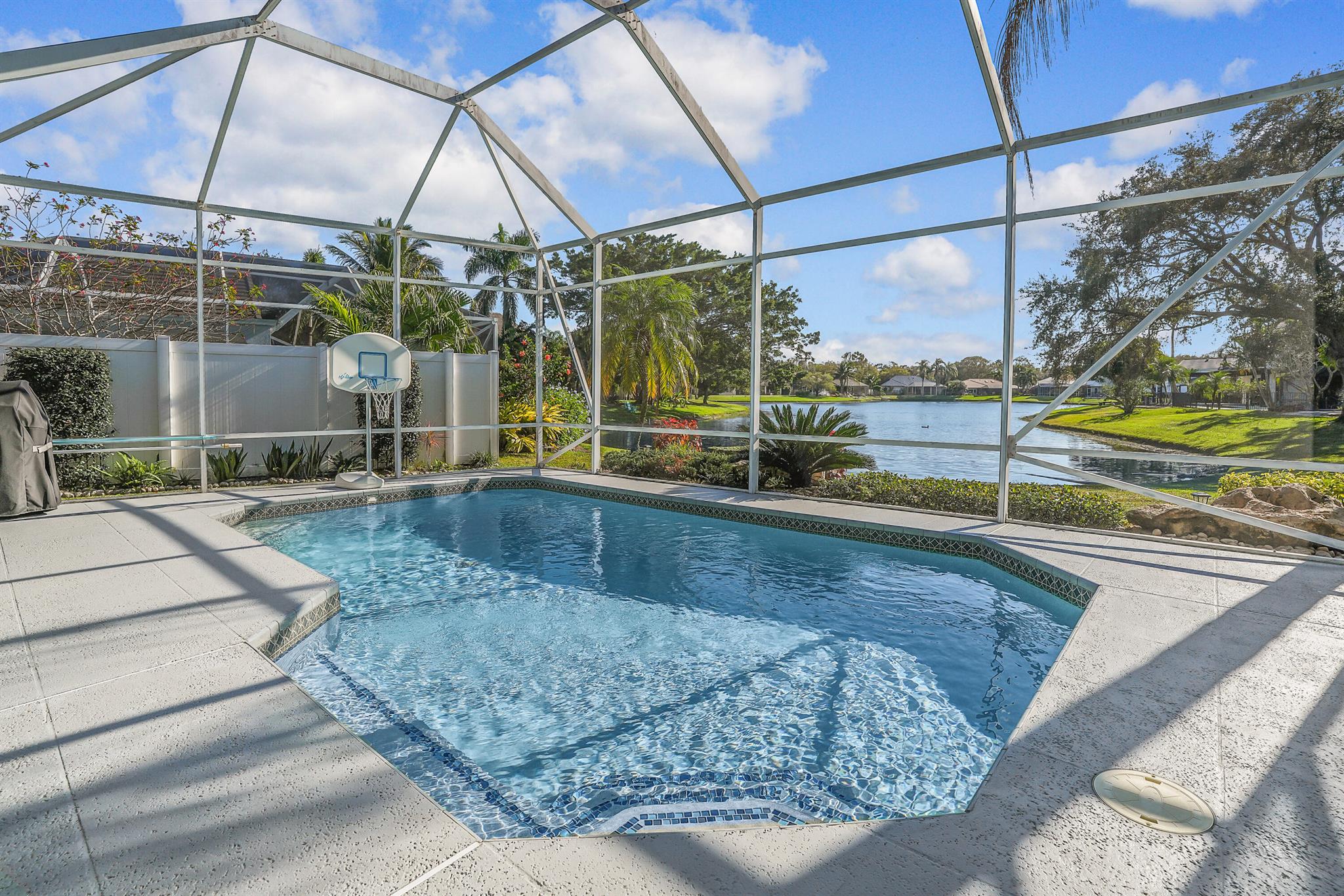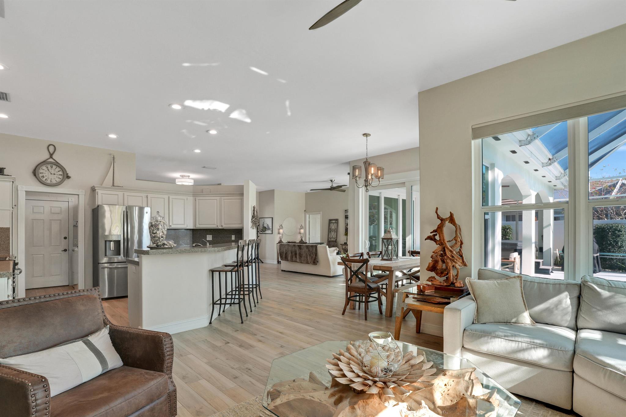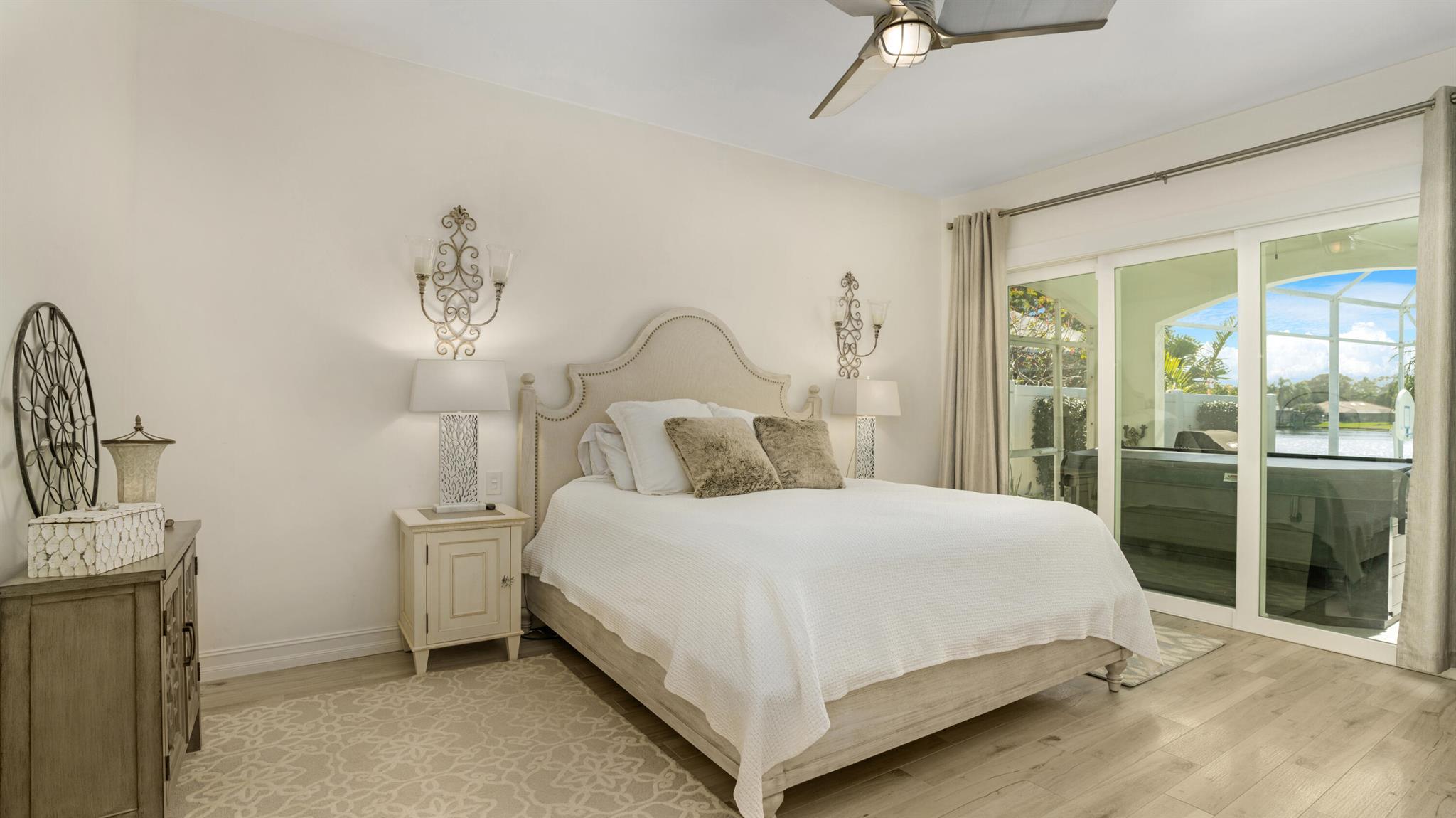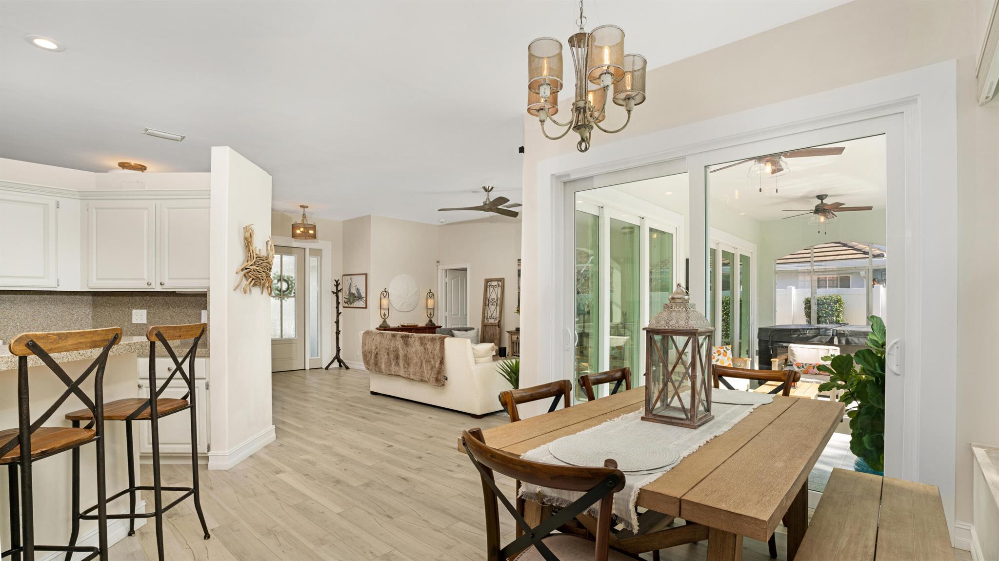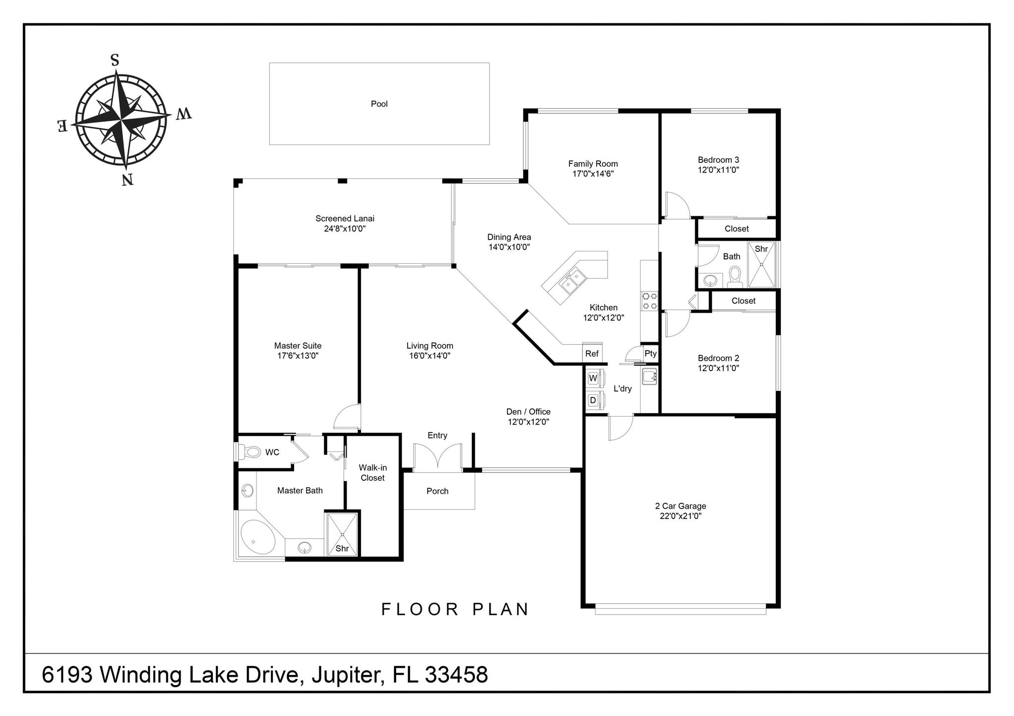 LONG LAKE VIEWS! 3 Bed + Den, 2 Bath, CBS Masterpiece w/ heated pool, IMPACT GLASS & S. exposure in The Shores. Luxury is woven throughout! 10′ ceilings greet along w/ instant pool & lake views before plank tile in driftwood tones guide you to a private den at right. Next, the large living room & family rooms are separated by a dining room and kitchen which features: stainless appliances, an island seating 5, cabinets w/ slide outs & a pantry. The covered lanai, pool, spa, lake views & sunsets are accessed via 3 sets of sliding glass doors. Back inside, 2 guest bedrooms share an updated hall bath w/ glass shower. The Main Bedroom, designed in 2023 is breathtaking! A walk-in closet w/ organizer, 2 Vanities, corner tub, glass shower, Champagne Bronze fixtures AC 2021, W & D 2024 A-Rated Sc