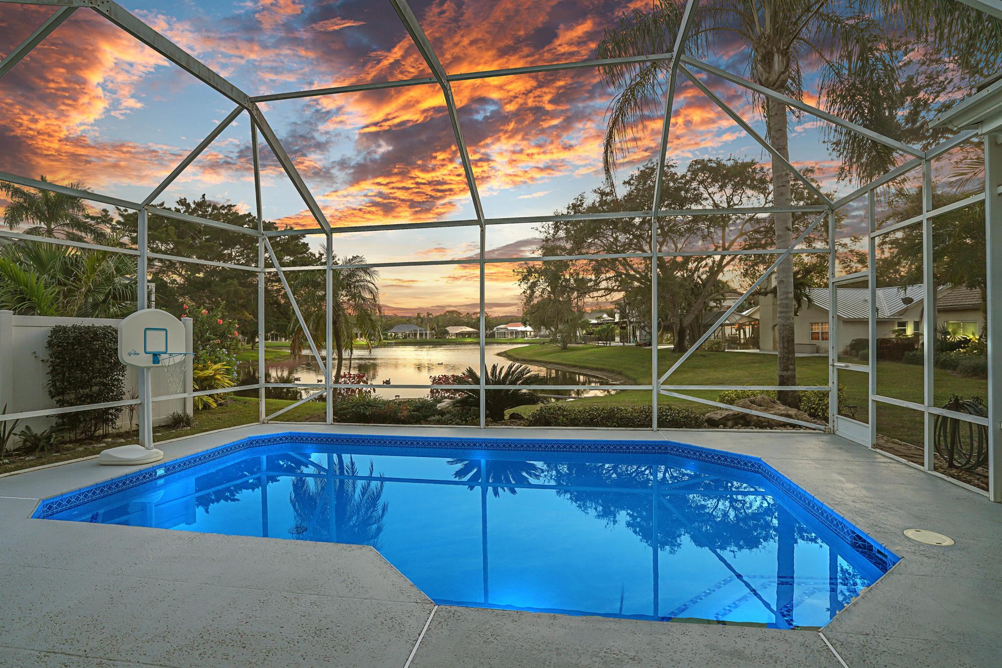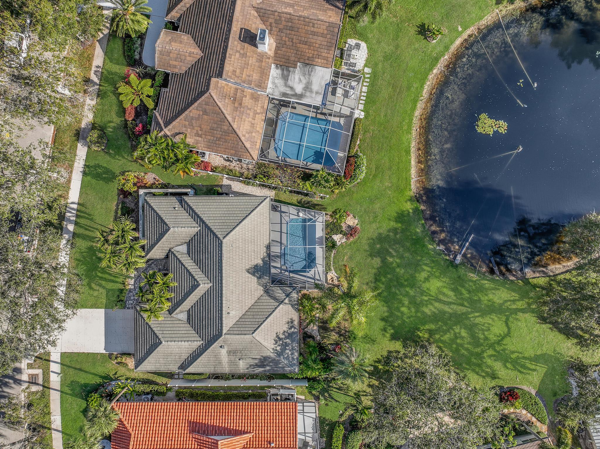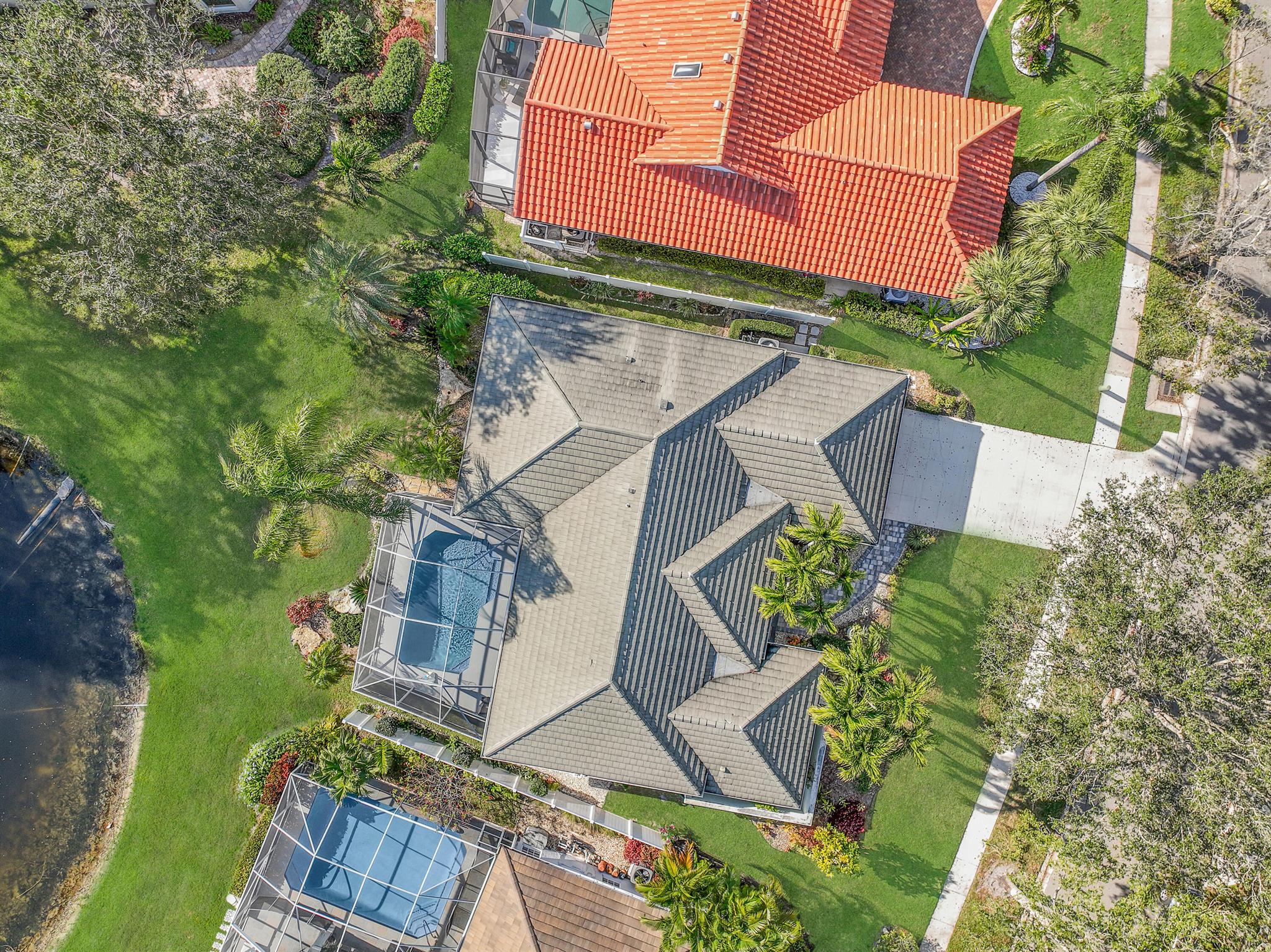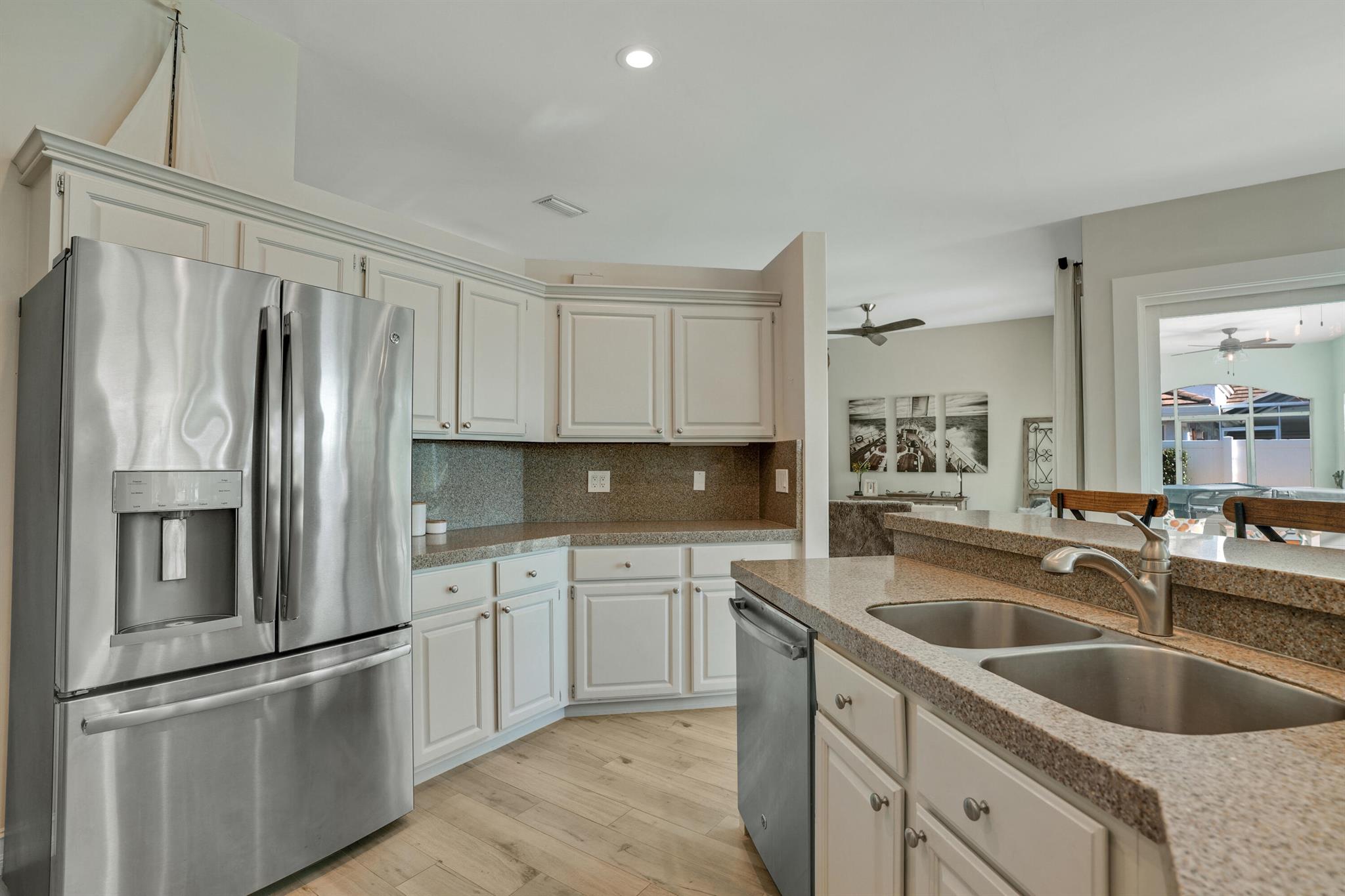 LONG LAKE VIEWS! 3 Bed + Den, 2 Bath, CBS Masterpiece w/ heated pool, IMPACT GLASS & S. exposure in The Shores. Luxury is woven throughout! 10′ ceilings greet along w/ instant pool & lake views before plank tile in driftwood tones guide you to a private den at right. Next, the large living room & family rooms are separated by a dining room and kitchen which features: stainless appliances, an island seating 5, cabinets w/ slide outs & a pantry. The covered lanai, pool, spa, lake views & sunsets are accessed via 3 sets of sliding glass doors. Back inside, 2 guest bedrooms share an updated hall bath w/ glass shower. The Main Bedroom, designed in 2023 is breathtaking! A walk-in closet w/ organizer, 2 Vanities, corner tub, glass shower, Champagne Bronze fixtures AC 2021, W & D 2024 A-Rated Sc
