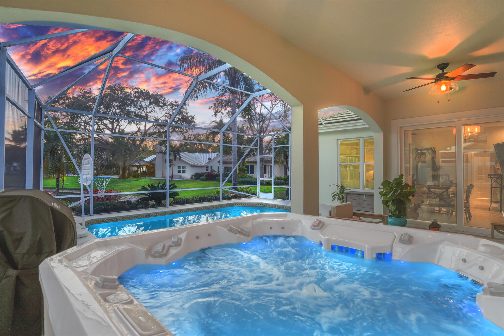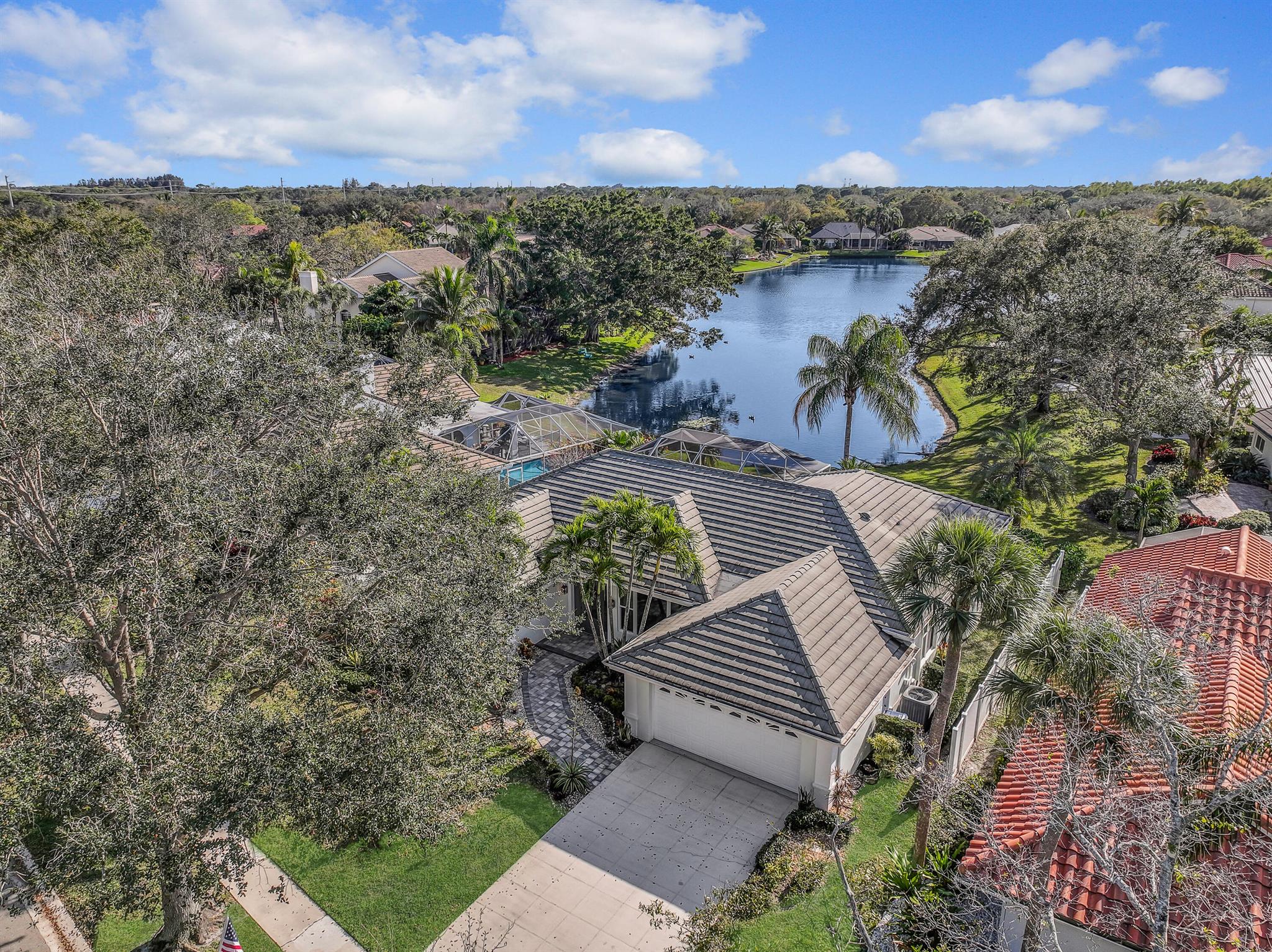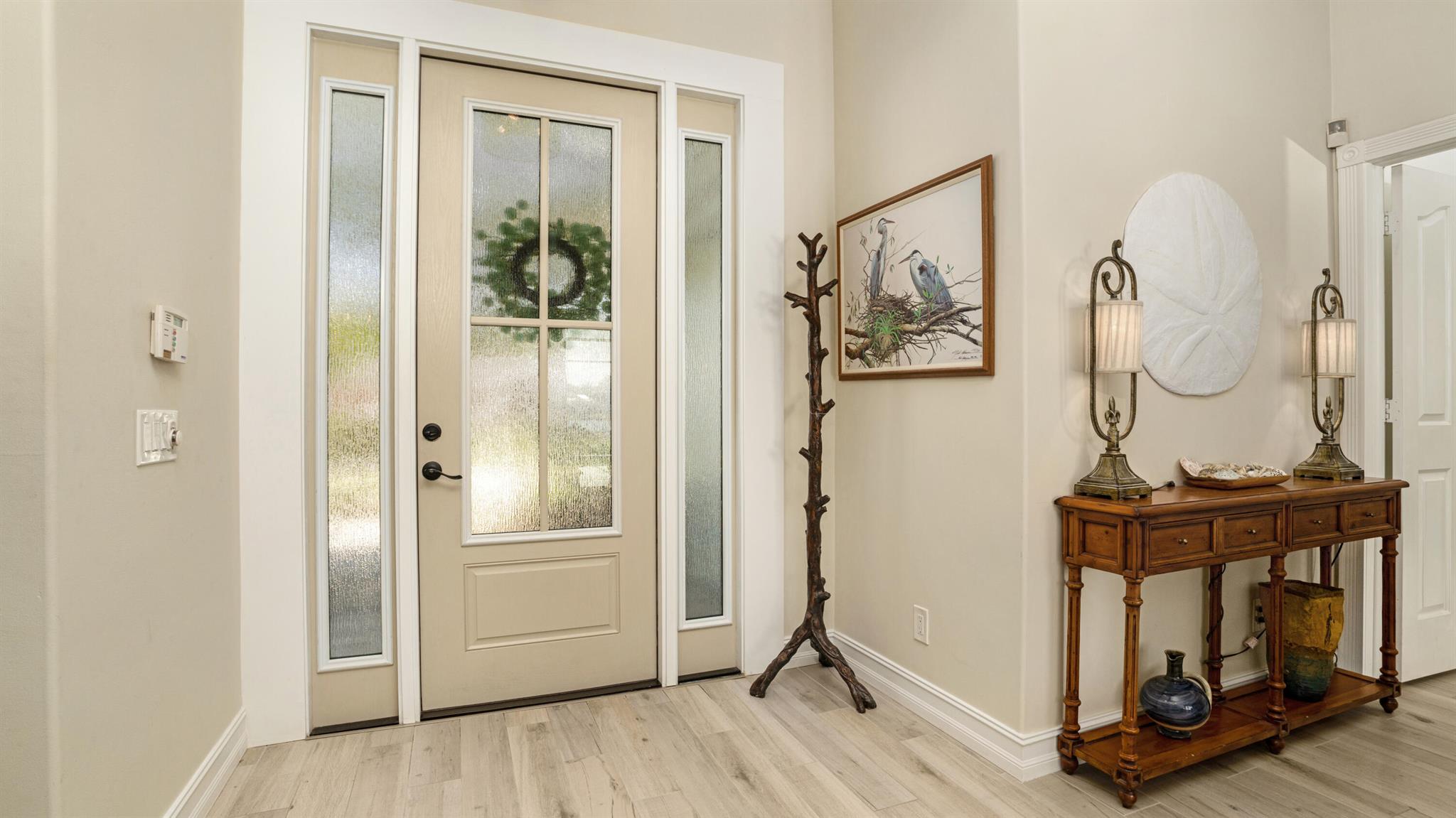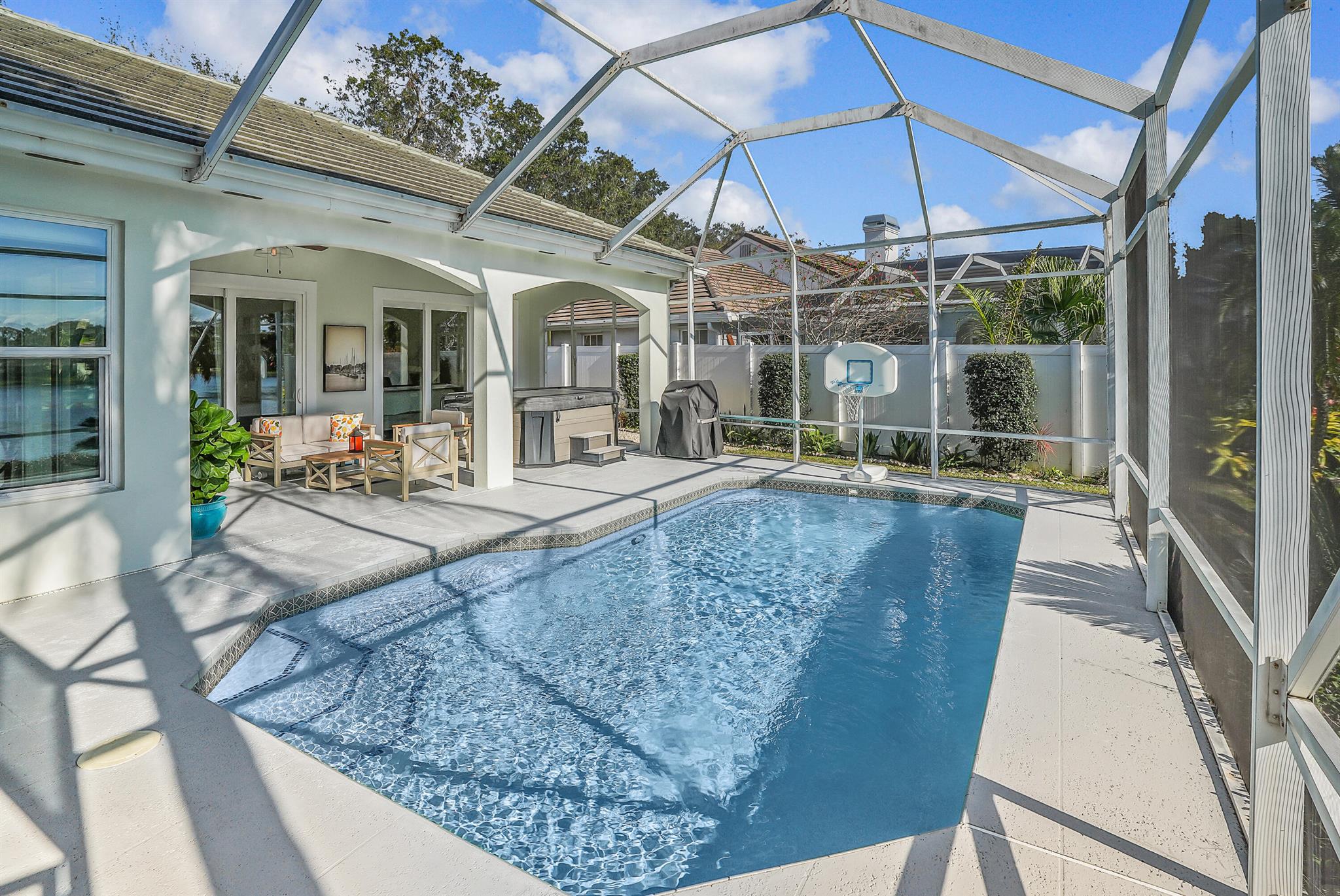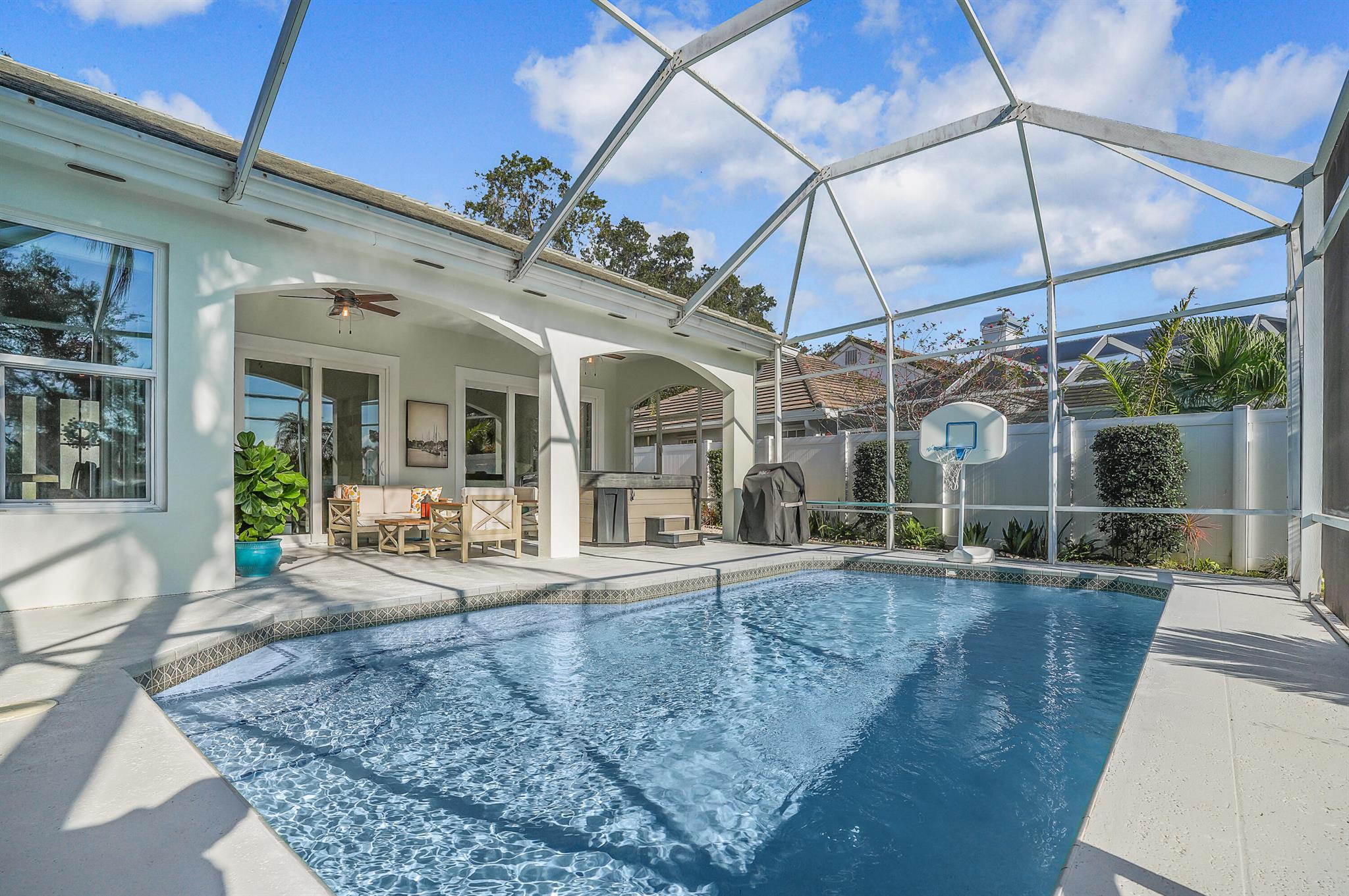 LONG LAKE VIEWS! 3 Bed + Den, 2 Bath, CBS Masterpiece w/ heated pool, IMPACT GLASS & S. exposure in The Shores. Luxury is woven throughout! 10′ ceilings greet along w/ instant pool & lake views before plank tile in driftwood tones guide you to a private den at right. Next, the large living room & family rooms are separated by a dining room and kitchen which features: stainless appliances, an island seating 5, cabinets w/ slide outs & a pantry. The covered lanai, pool, spa, lake views & sunsets are accessed via 3 sets of sliding glass doors. Back inside, 2 guest bedrooms share an updated hall bath w/ glass shower. The Main Bedroom, designed in 2023 is breathtaking! A walk-in closet w/ organizer, 2 Vanities, corner tub, glass shower, Champagne Bronze fixtures AC 2021, W & D 2024 A-Rated Sc