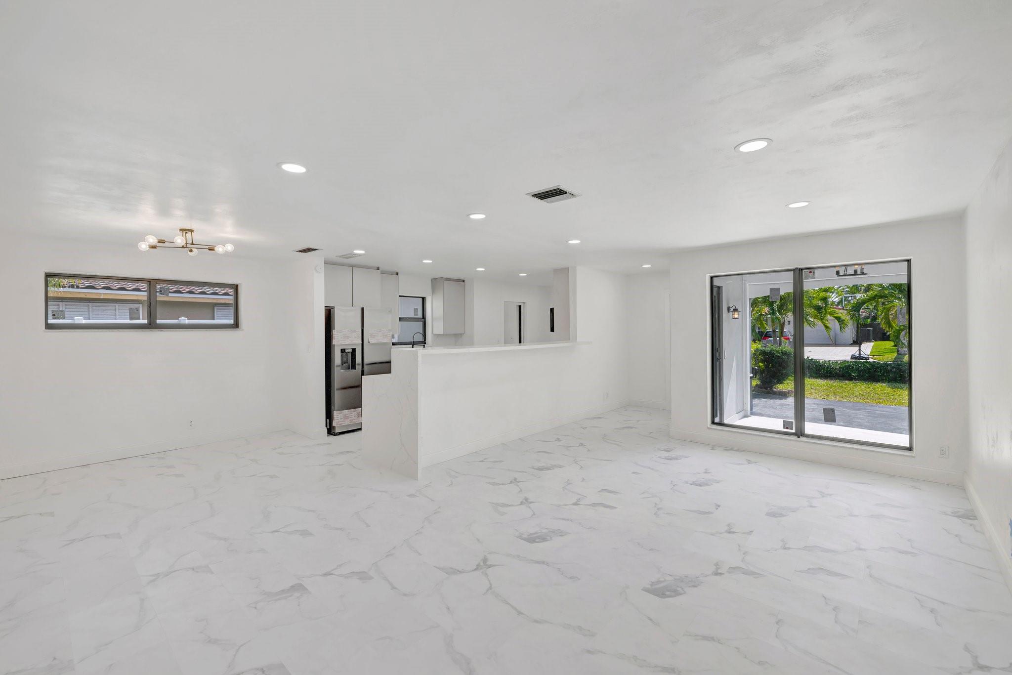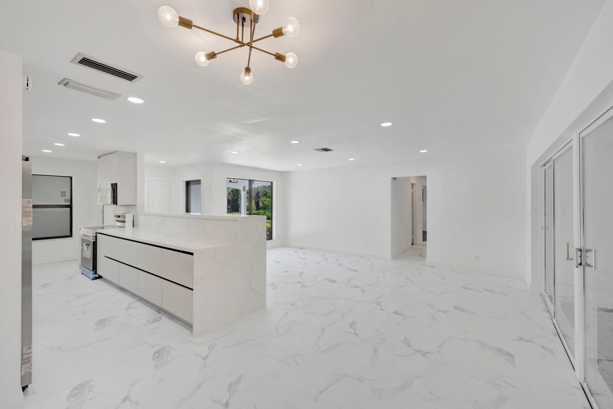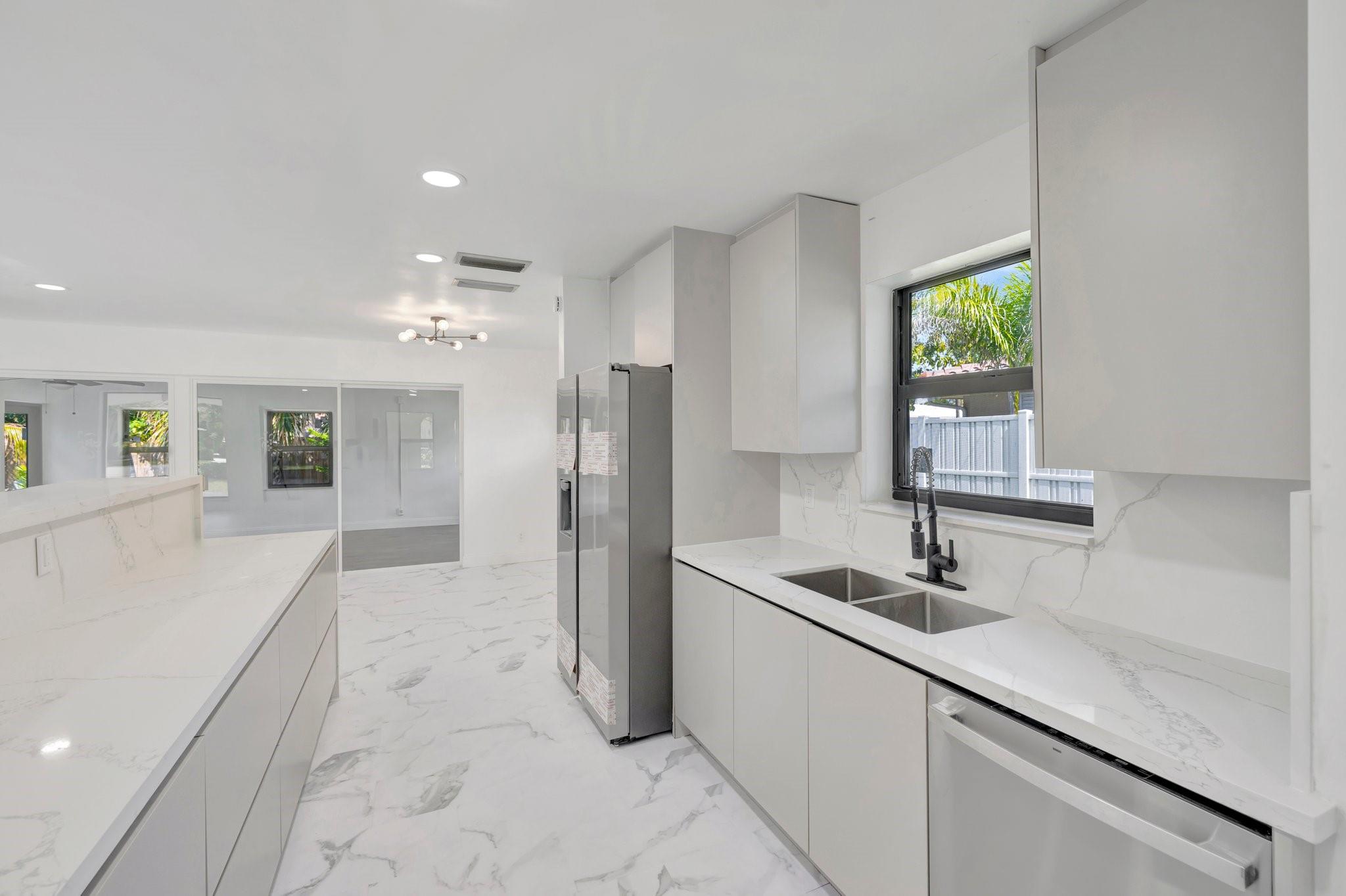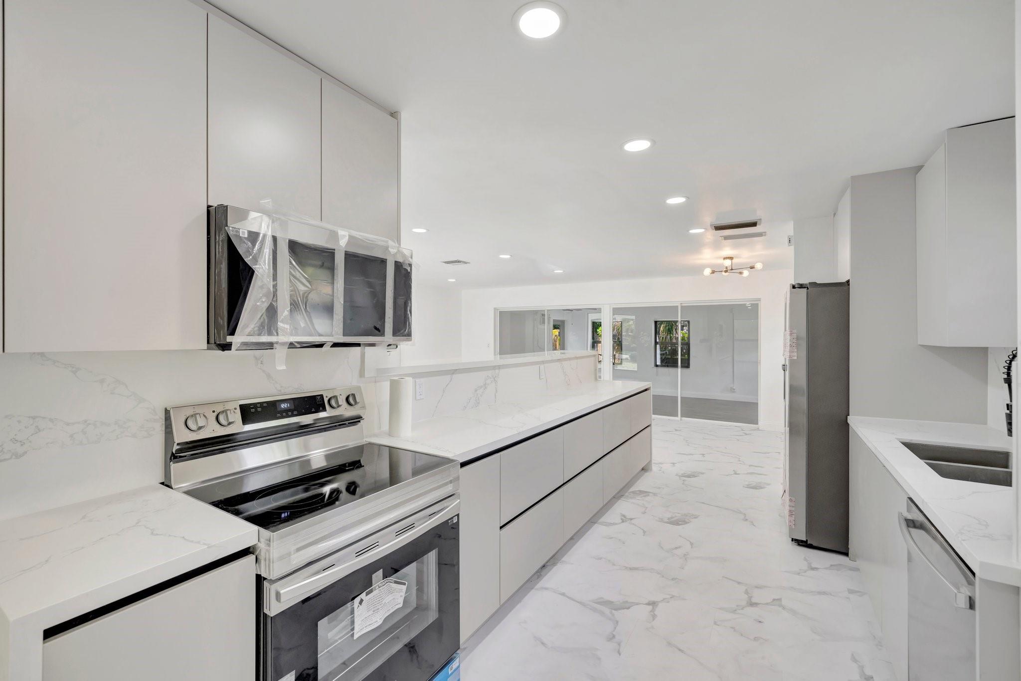 Beautifully remodeled home features new kitchen with Calacatta quartz counter tops, breakfast bar, new appliances and cabinets. New bathrooms with glass enclosed showers. New roof. New impact windows. Waterproof flooring in enclosed sunroom. Bedrooms with ceiling fans. New baseboards and light fixtures. Recessed lighting throughout. Covered front porch. Fenced back yard with concrete patio and wading pool. Storage Shed. Mango tree. Sprinkler system. Lots more! Don’t miss it!