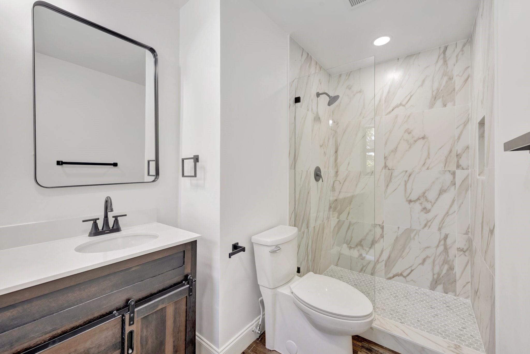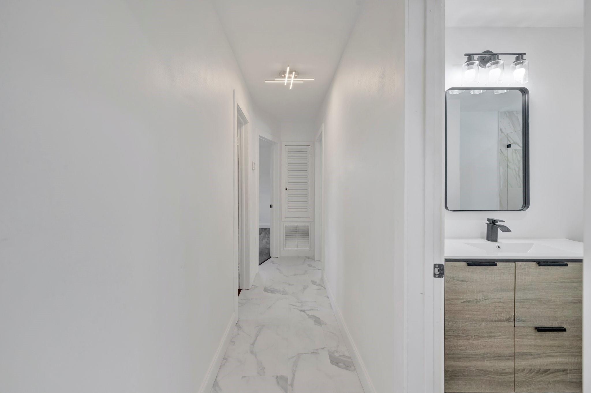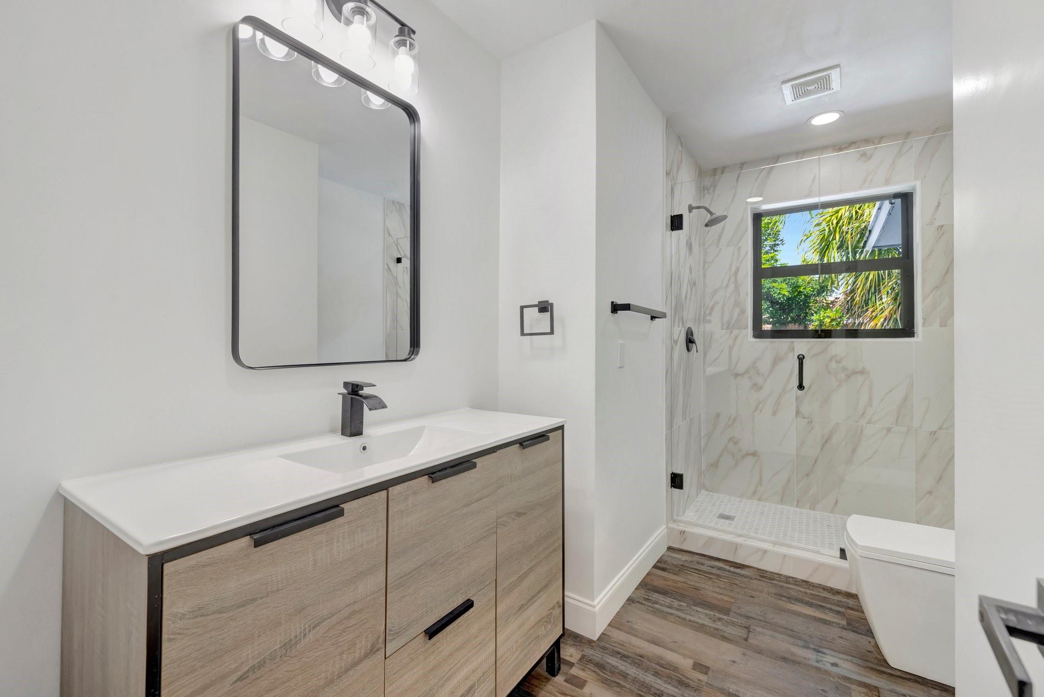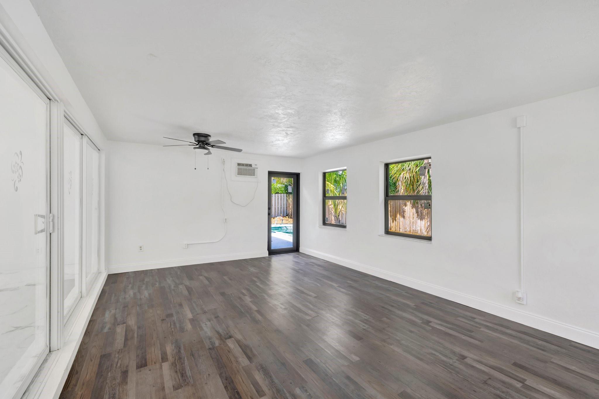 Beautifully remodeled home features new kitchen with Calacatta quartz counter tops, breakfast bar, new appliances and cabinets. New bathrooms with glass enclosed showers. New roof. New impact windows. Waterproof flooring in enclosed sunroom. Bedrooms with ceiling fans. New baseboards and light fixtures. Recessed lighting throughout. Covered front porch. Fenced back yard with concrete patio and wading pool. Storage Shed. Mango tree. Sprinkler system. Lots more! Don’t miss it!
