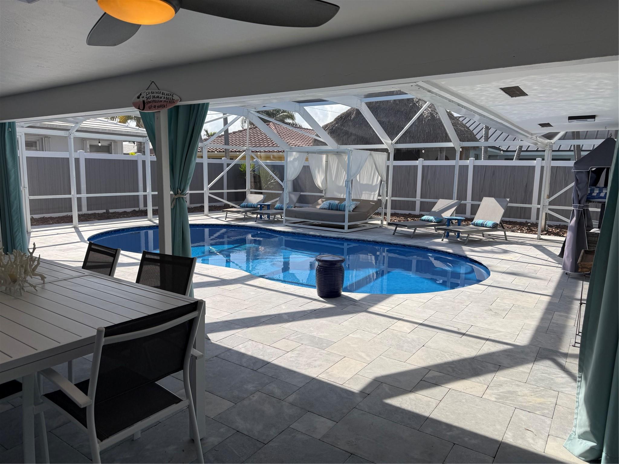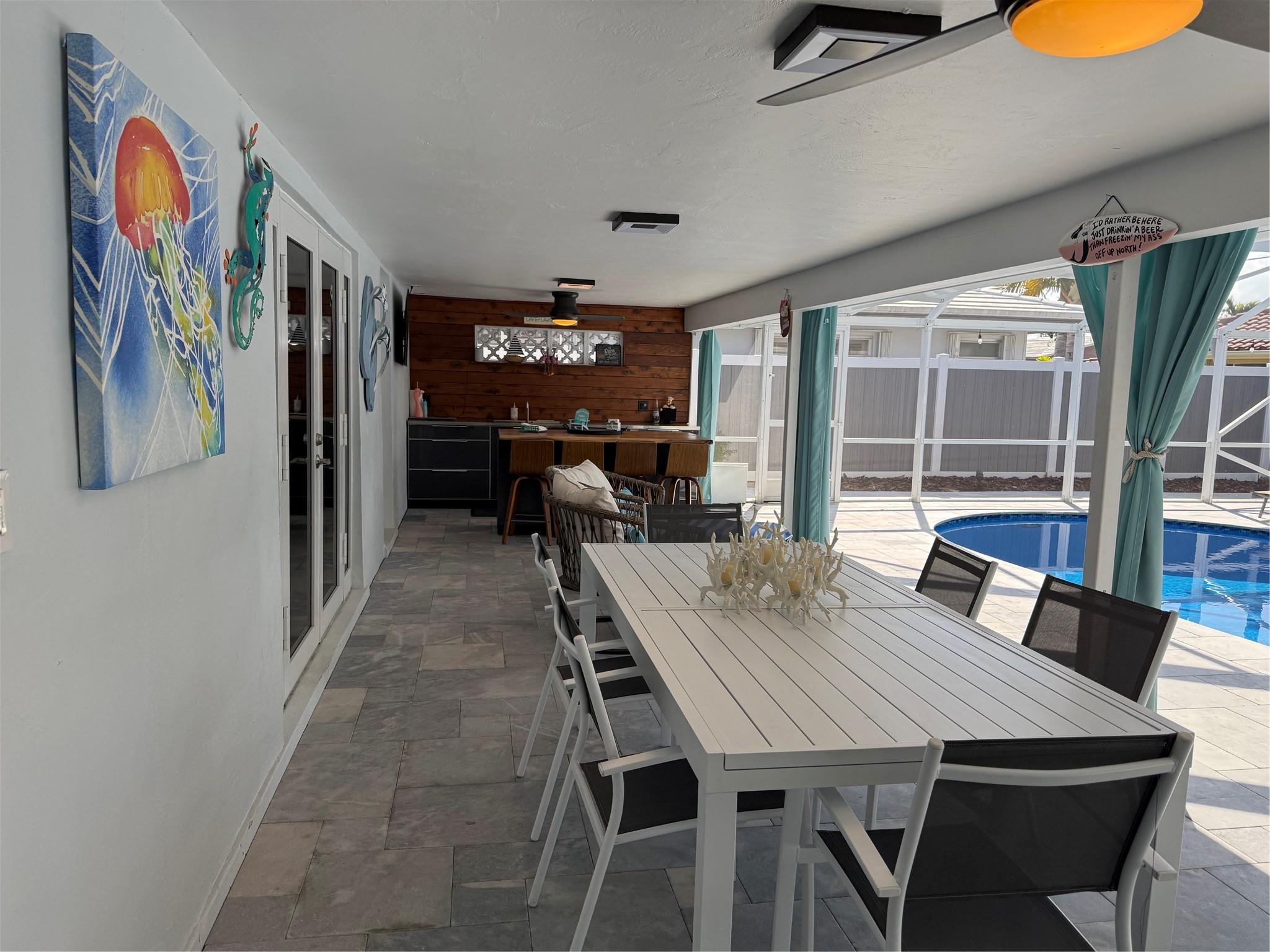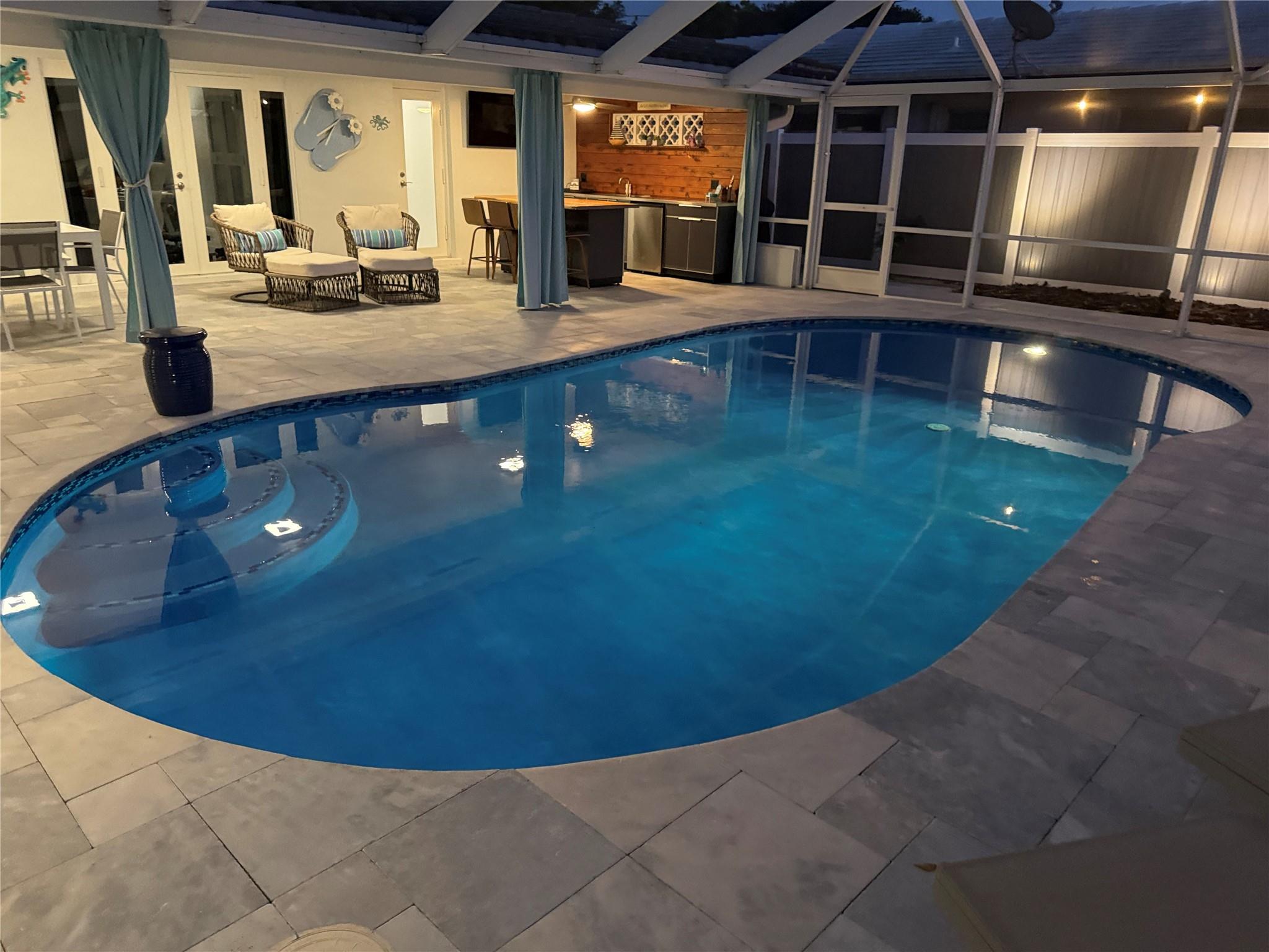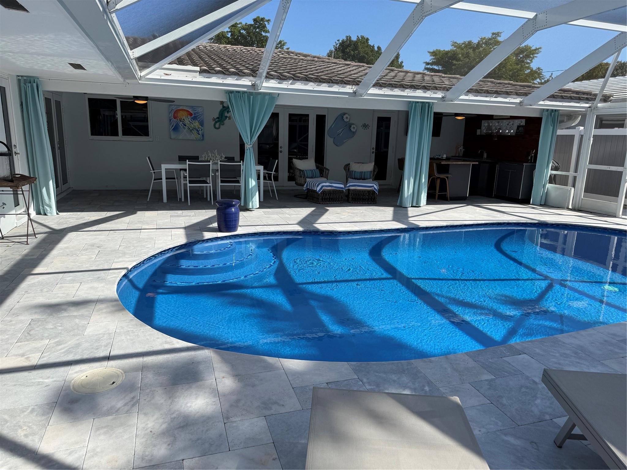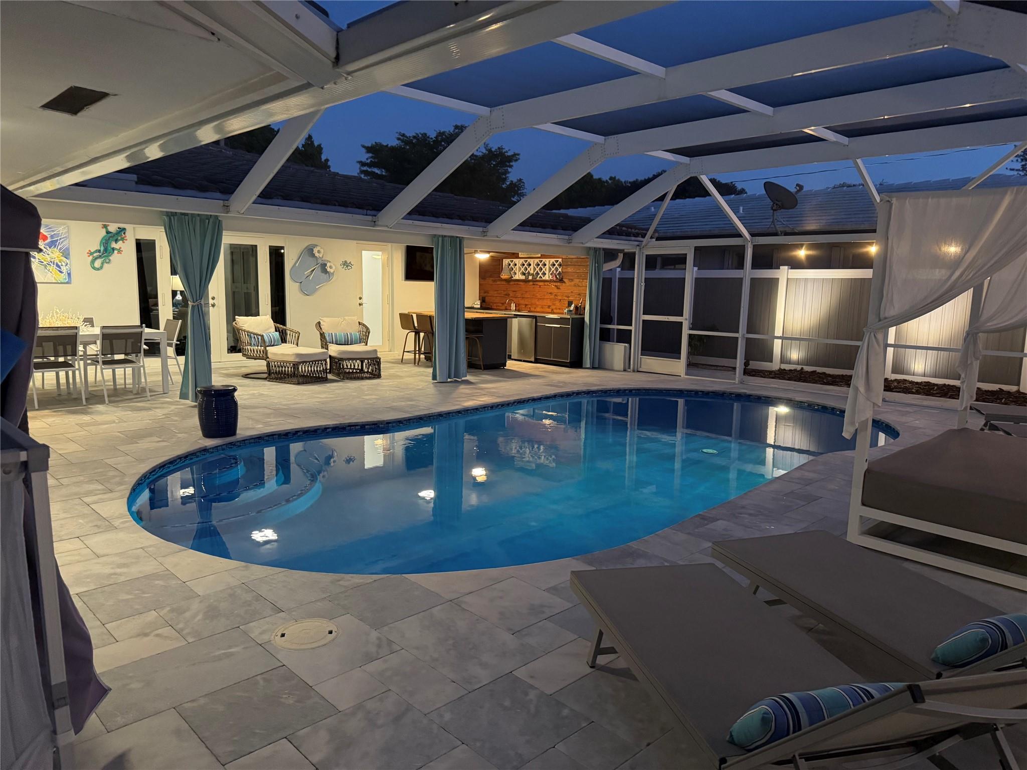 Step outside to the incredible outdoor oasis, featuring an outdoor kitchen, shower, and a sparkling saltwater pool with tumbled marble surround. The screened-in pool and patio area is a perfect place to relax and entertain, offering ultimate privacy and comfort.