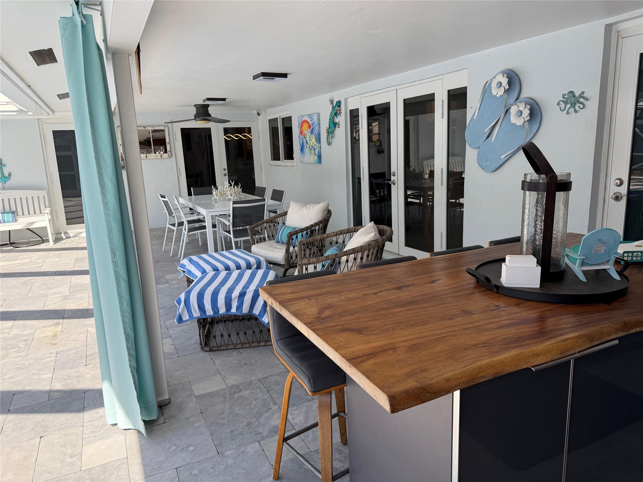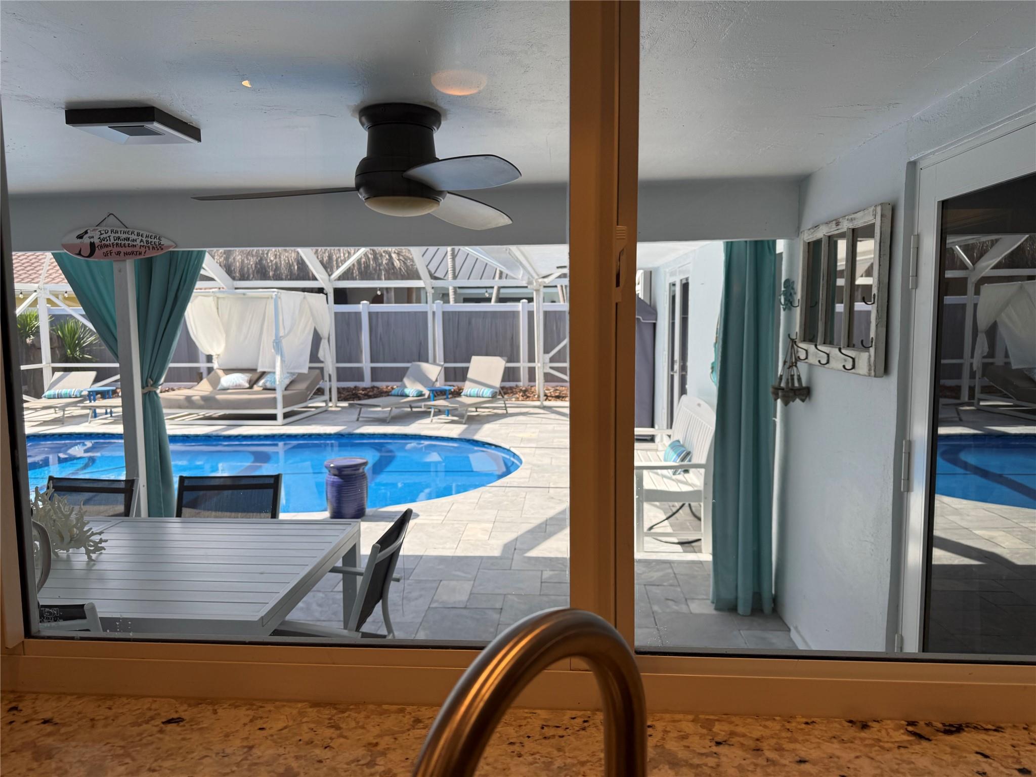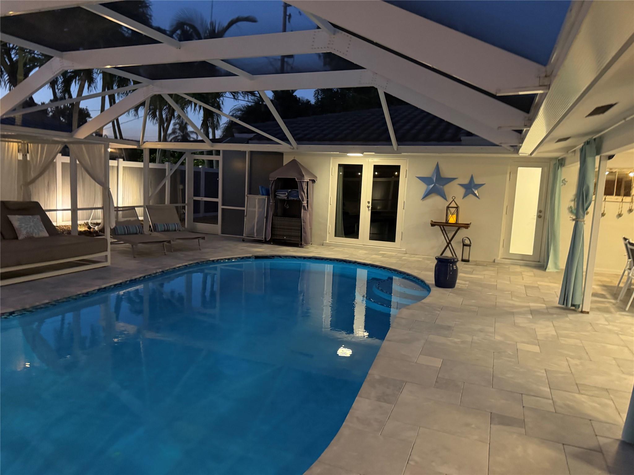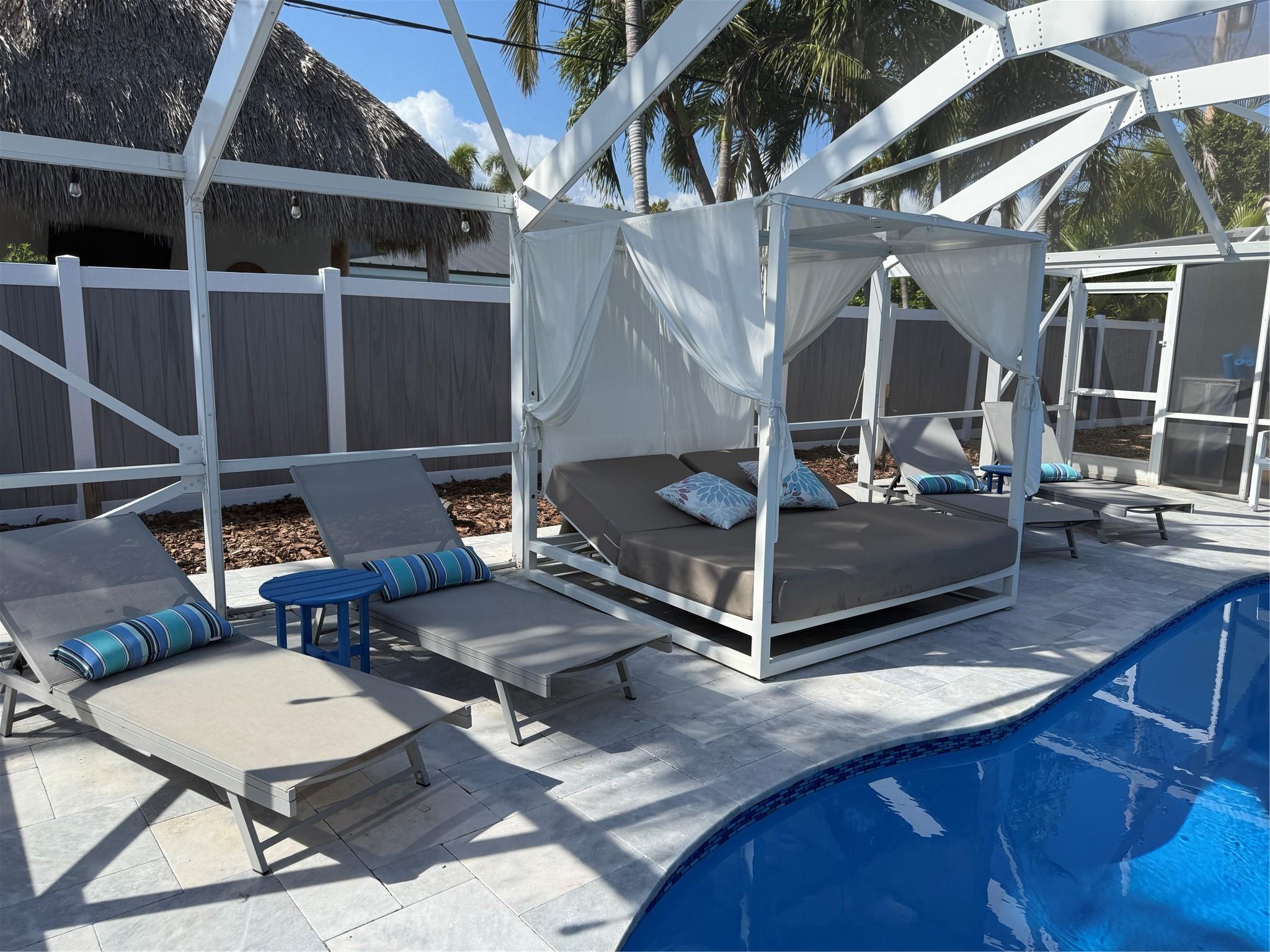 Step outside to the incredible outdoor oasis, featuring an outdoor kitchen, shower, and a sparkling saltwater pool with tumbled marble surround. The screened-in pool and patio area is a perfect place to relax and entertain, offering ultimate privacy and comfort.
