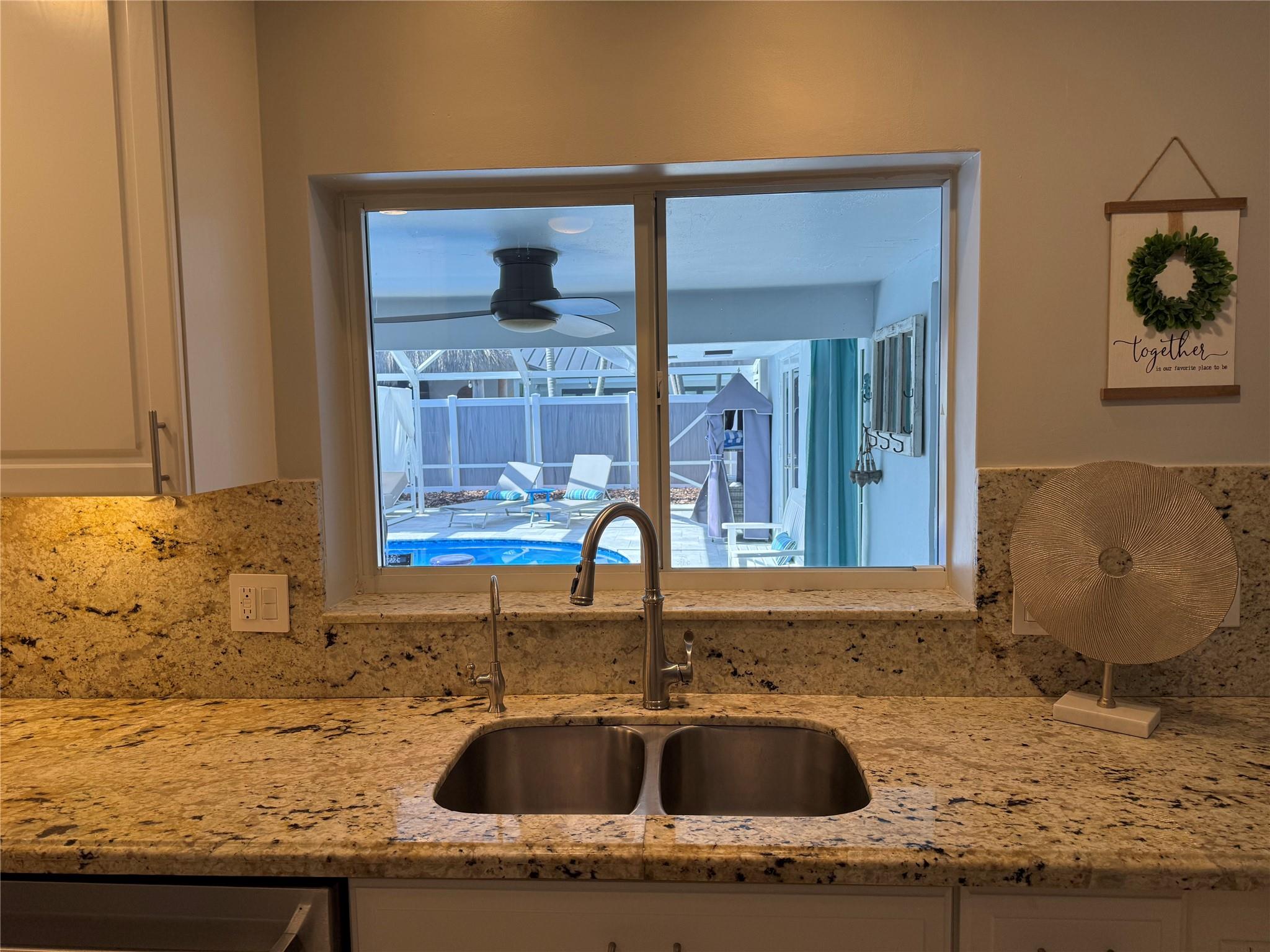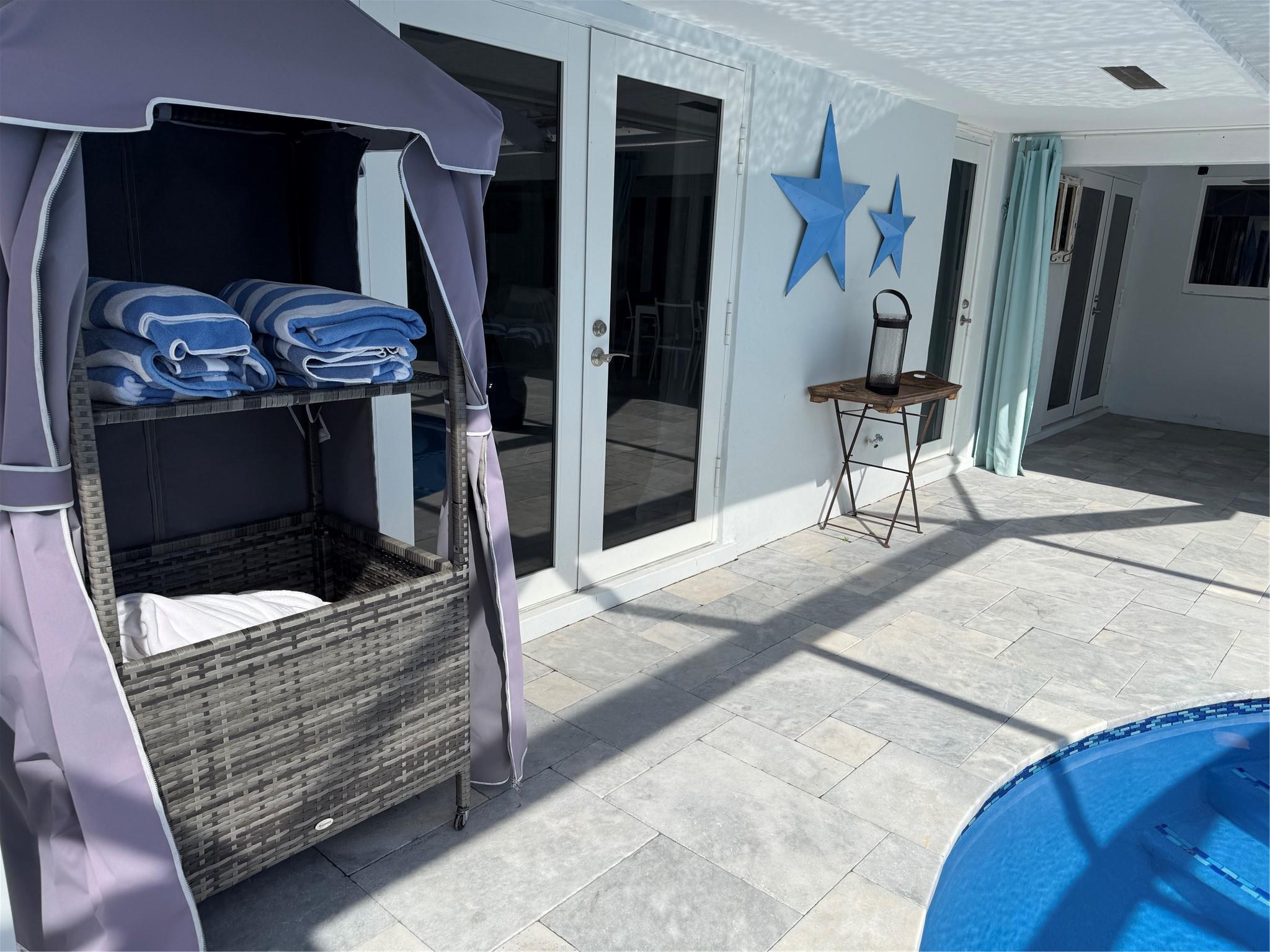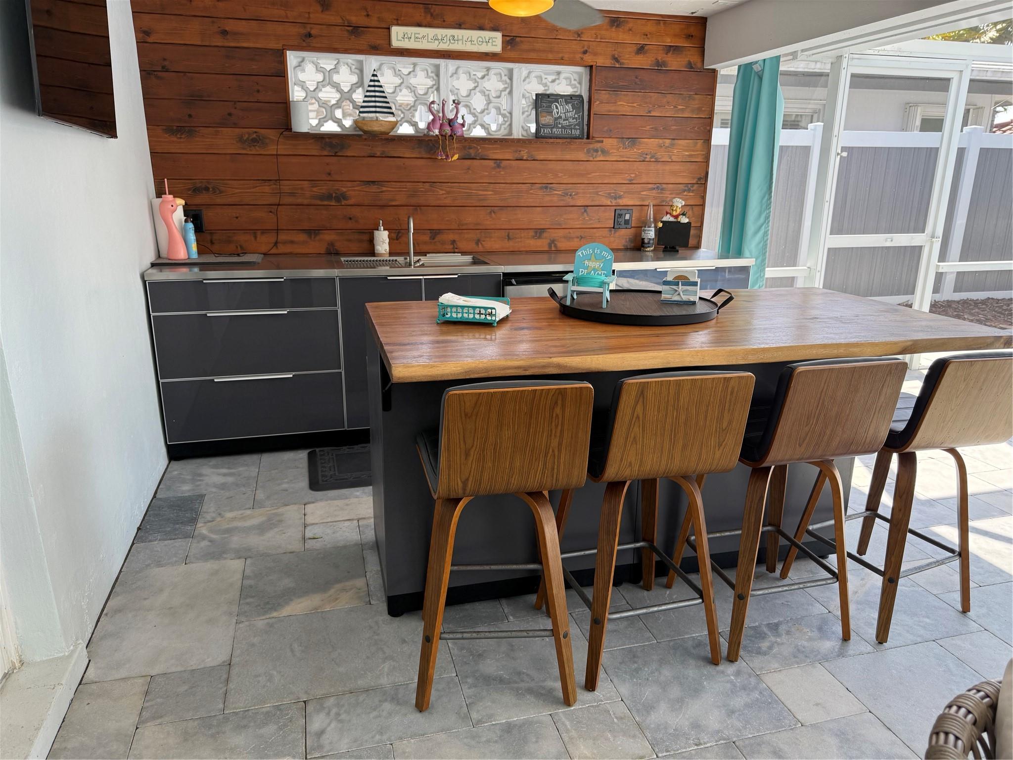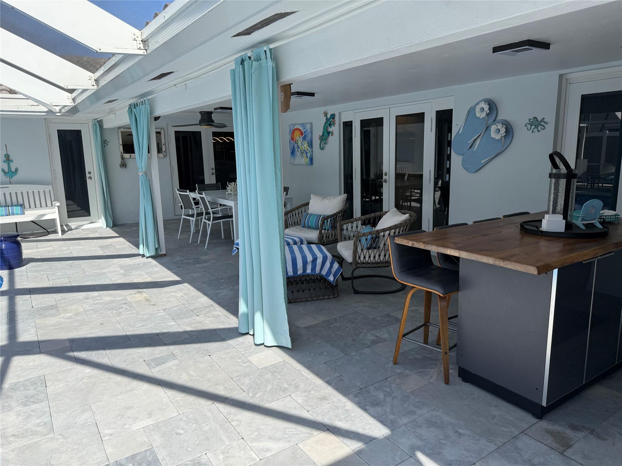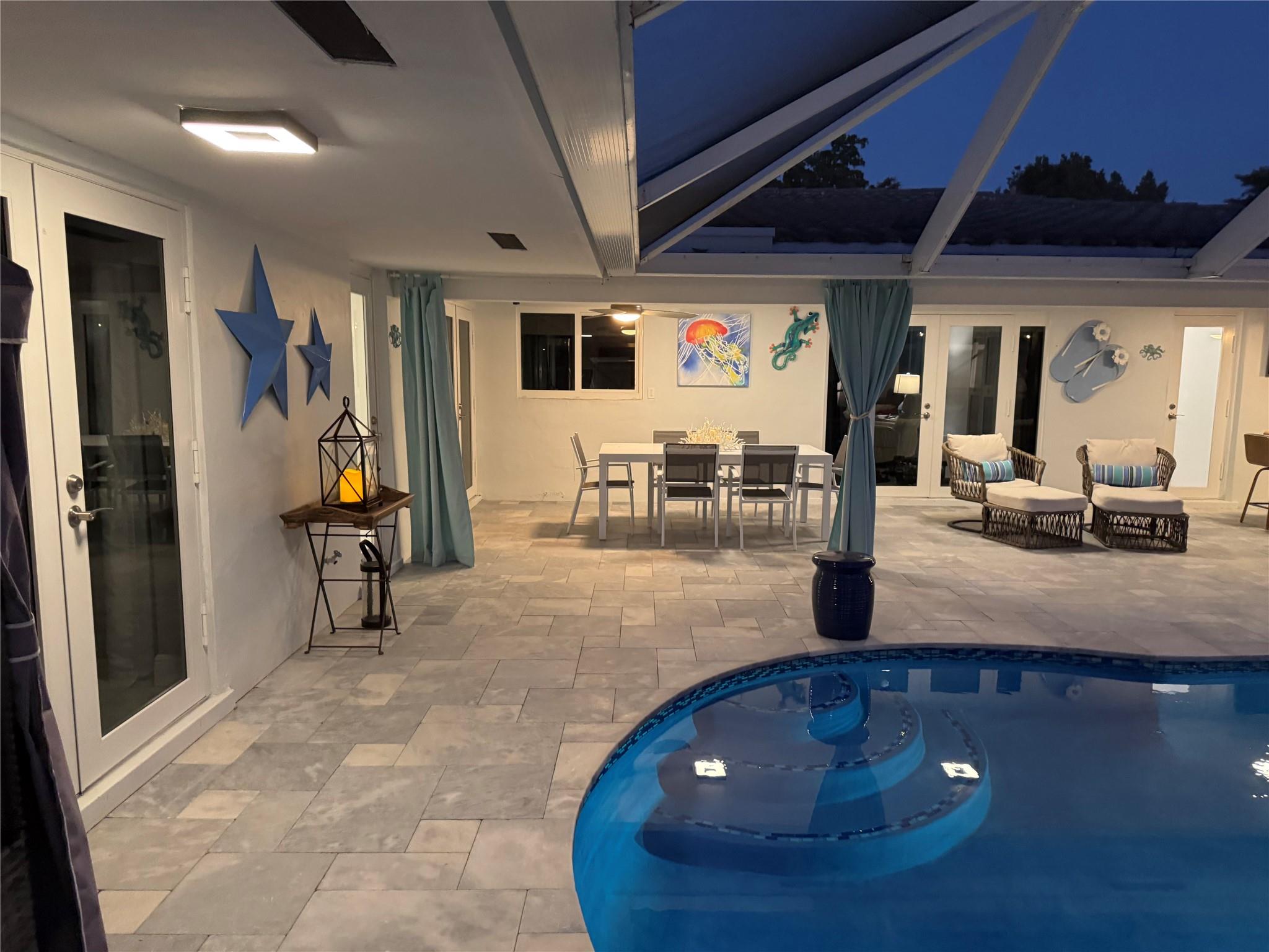 Step outside to the incredible outdoor oasis, featuring an outdoor kitchen, shower, and a sparkling saltwater pool with tumbled marble surround. The screened-in pool and patio area is a perfect place to relax and entertain, offering ultimate privacy and comfort.