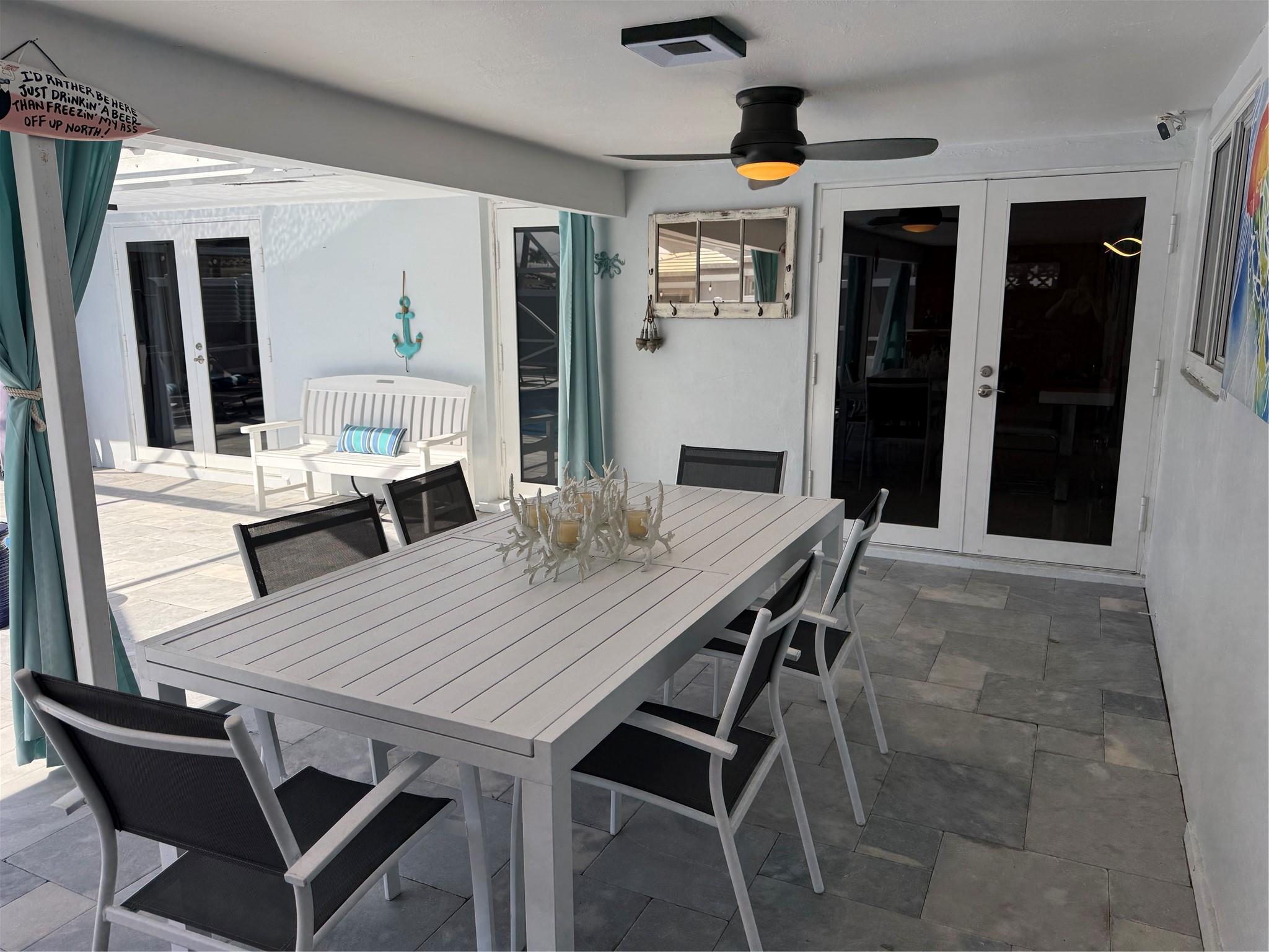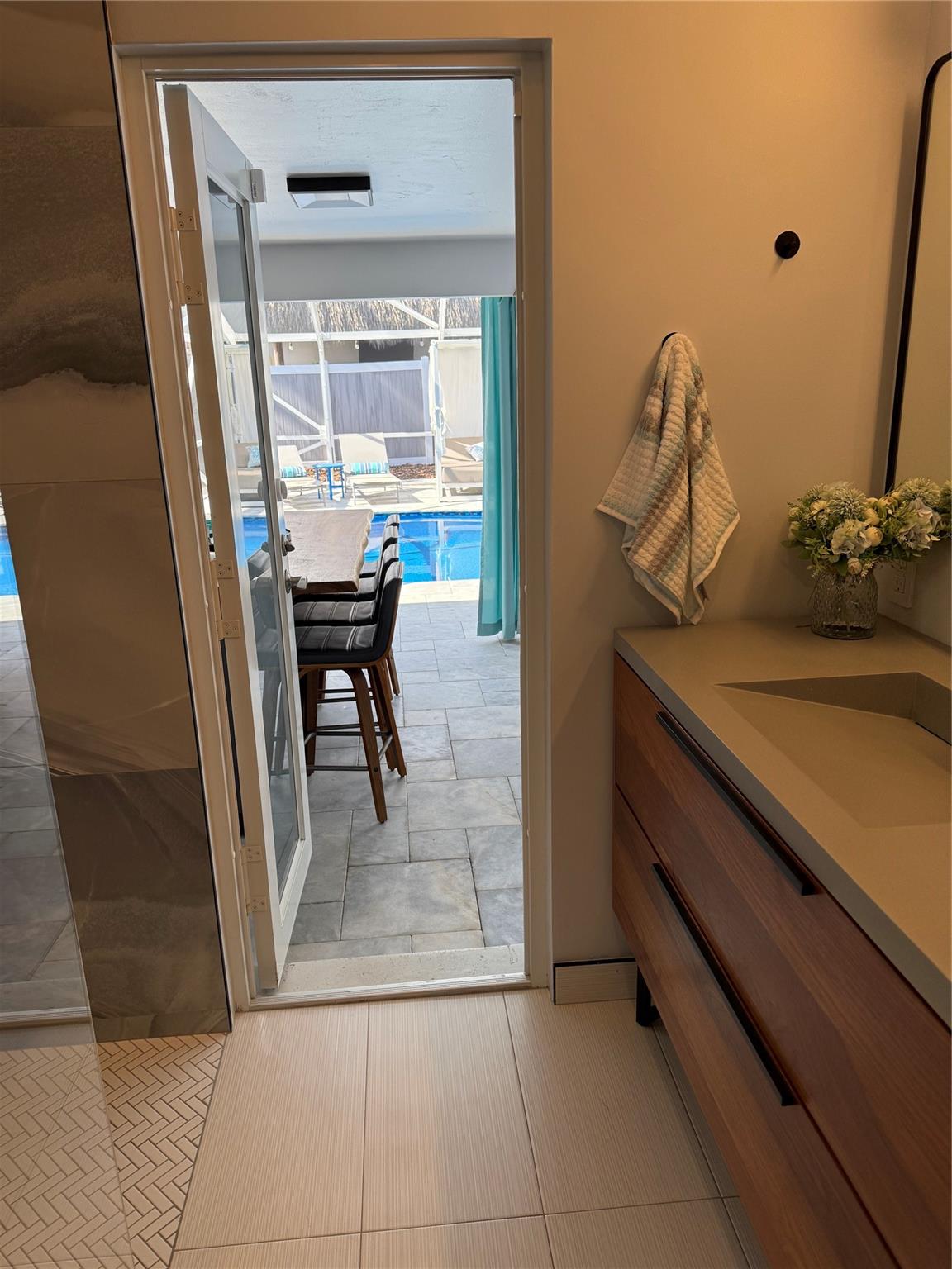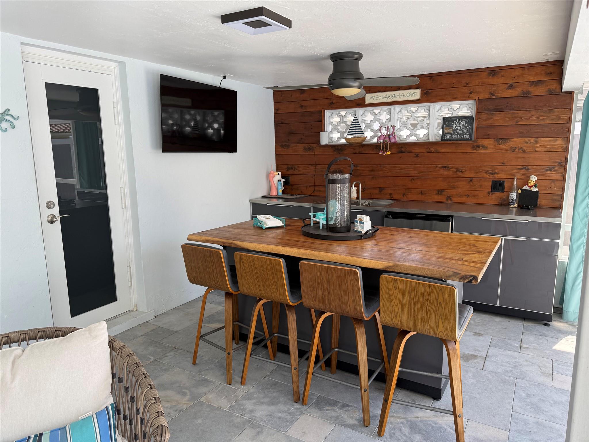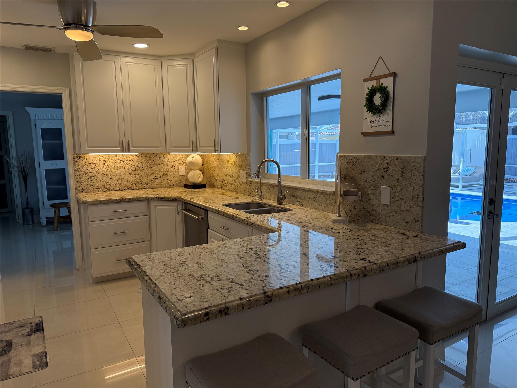 Step outside to the incredible outdoor oasis, featuring an outdoor kitchen, shower, and a sparkling saltwater pool with tumbled marble surround. The screened-in pool and patio area is a perfect place to relax and entertain, offering ultimate privacy and comfort.