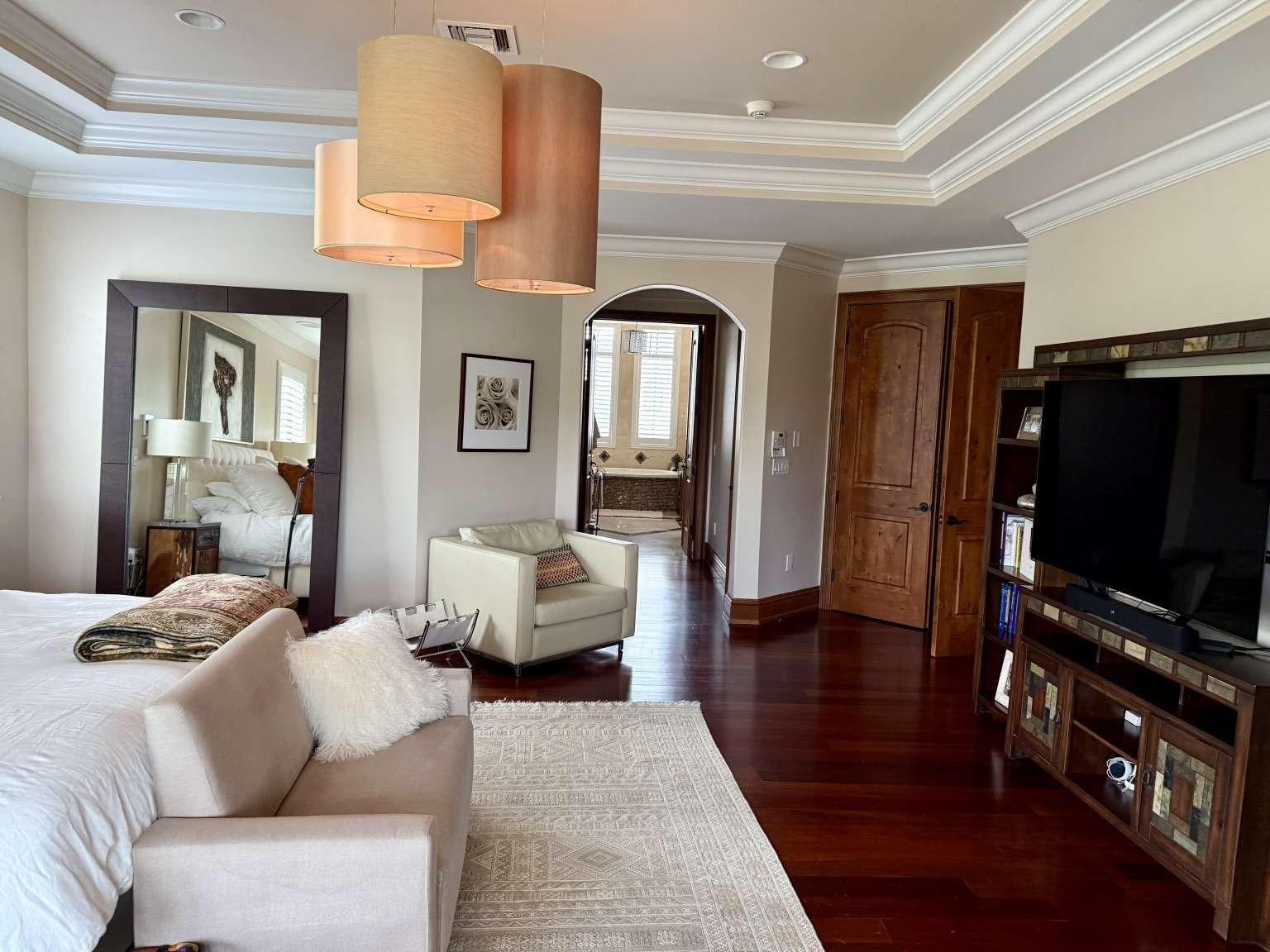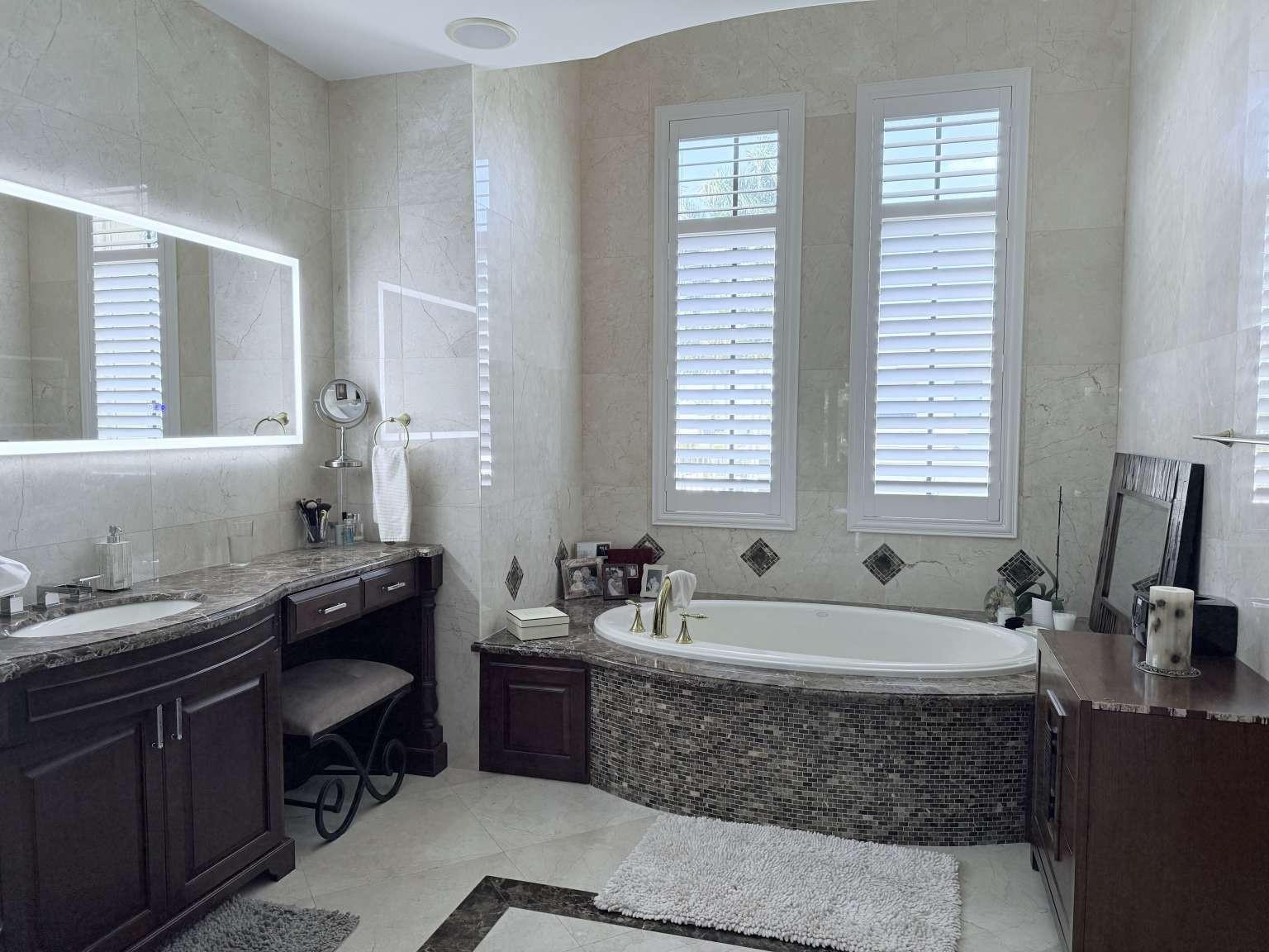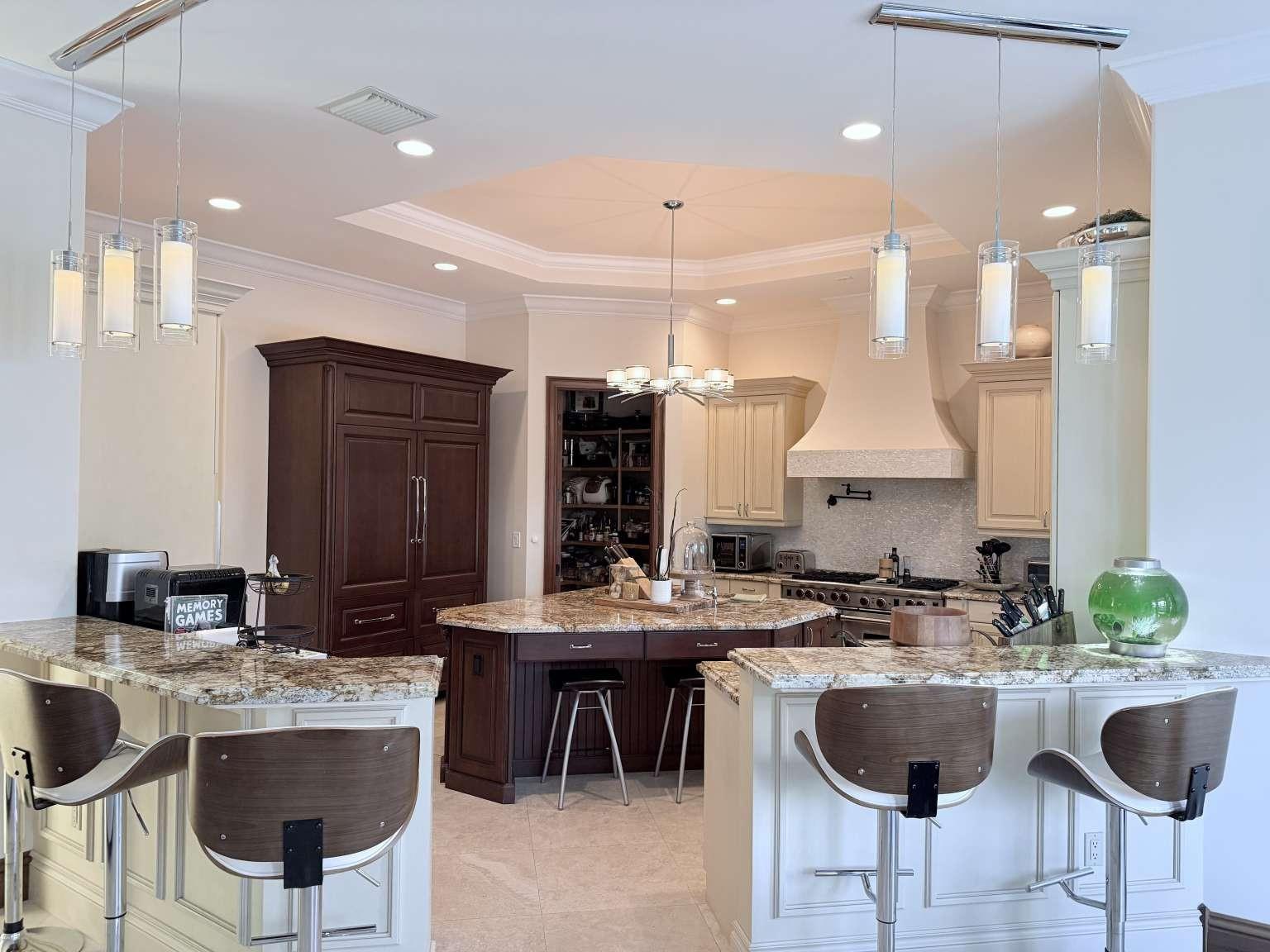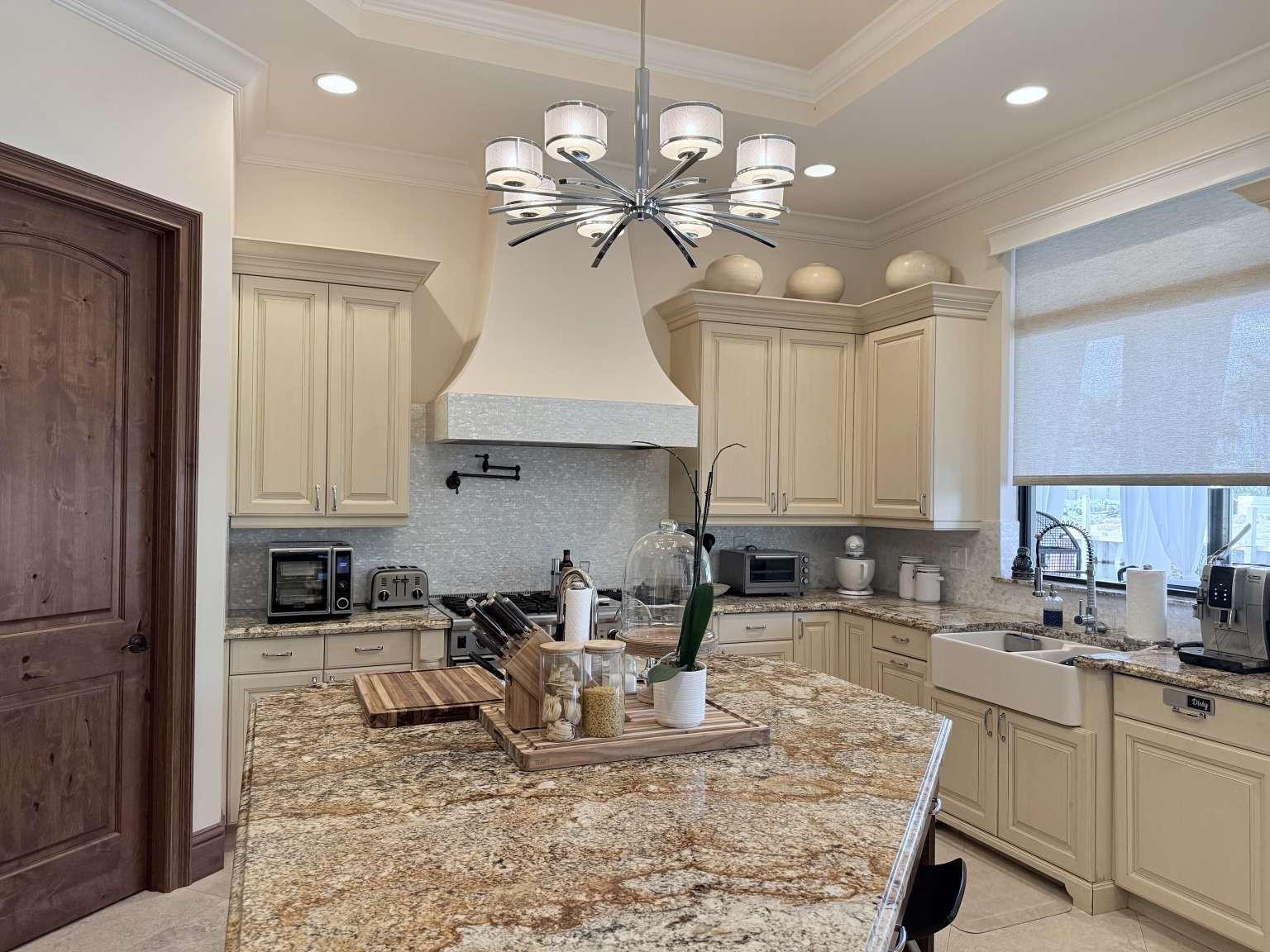Custom whole house sound system. Whole house water conditioner system and whole house generator. Brazilian cherry and travertine marble floors. Custom plantation shutters and window treatments throughout. Luxurious floor-to-ceiling marble in the bathrooms. Chef’s kitchen with six burner gas range, three ovens, and two dishwashers. High-end Subzero and Wolf appliances. Separate bar with wine fridge and heating drawer. Elevator. Two fireplaces. Heated pool and spa, outdoor shower, cabana bath, and spa with covered verandas. Outdoor gas grill, bar, and fridge.