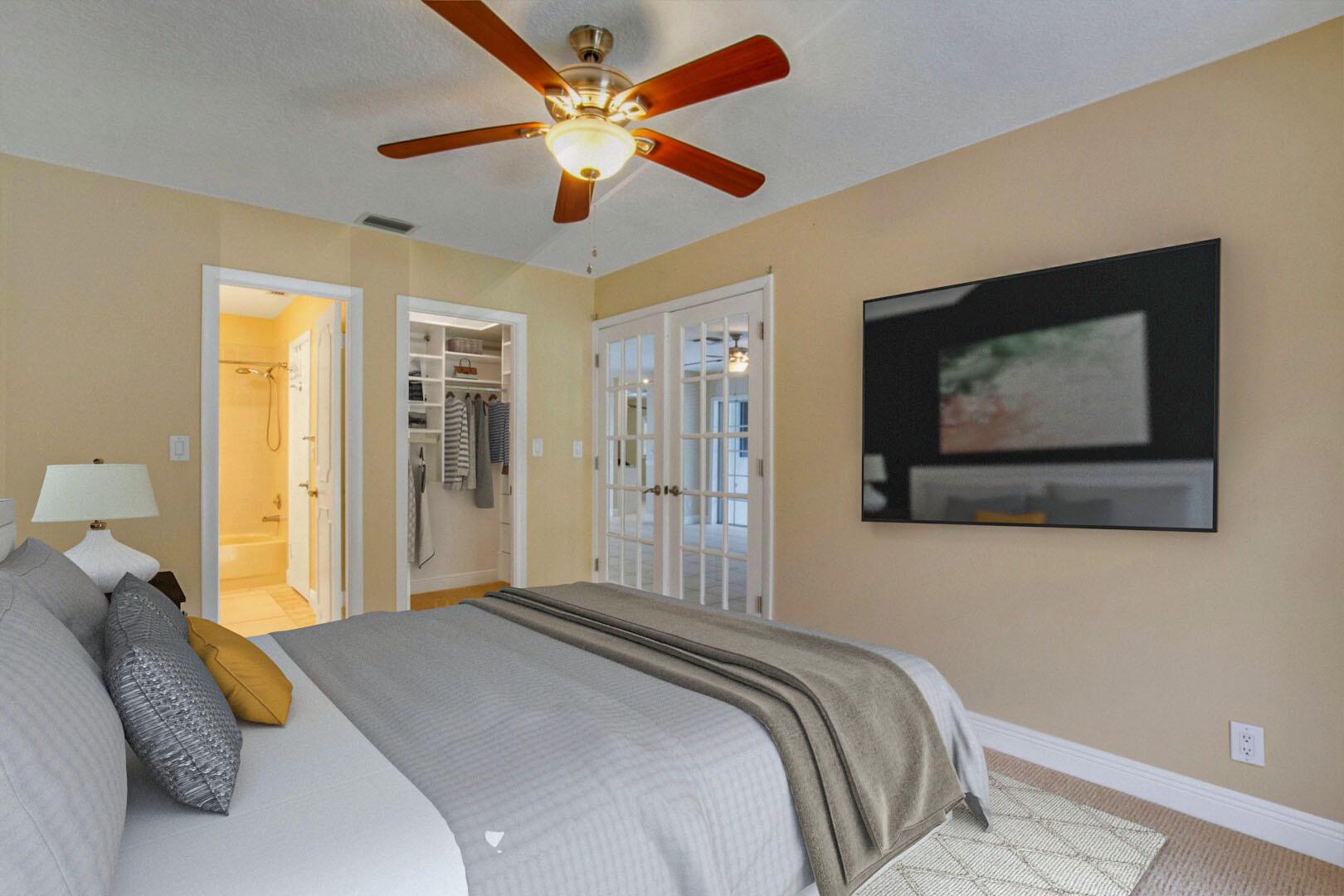 Welcome to this delightful 2-bedroom, 2-bathroom home with a spacious 2-car garage, nestled in the peaceful community of Rainberry Lake. Step inside to find a bright and airy living room that seamlessly connects to a cozy dining area–perfect for gatherings or everyday meals.The kitchen is a chef’s dream, featuring classic white cabinetry, elegant granite countertops, a stylish tiled backsplash, and modern stainless-steel appliances, making meal preparation a joy. The primary suite serves as a private retreat, complete with French doors that open onto the patio, blending indoor and outdoor living effortlessly. It also includes an en-suite bath for added comfort and privacy.