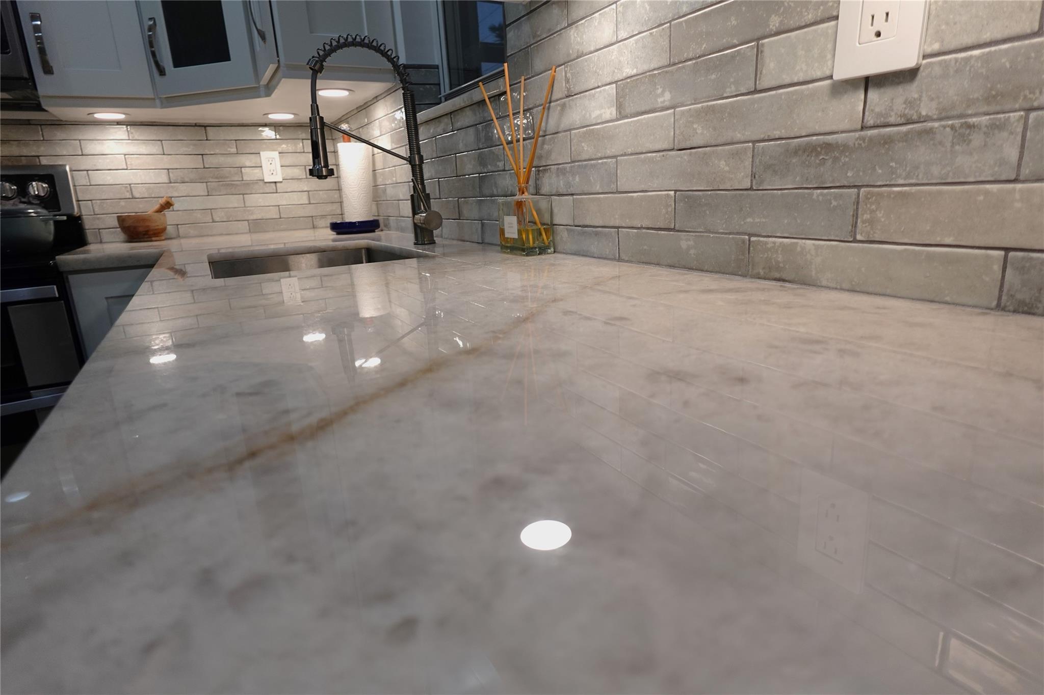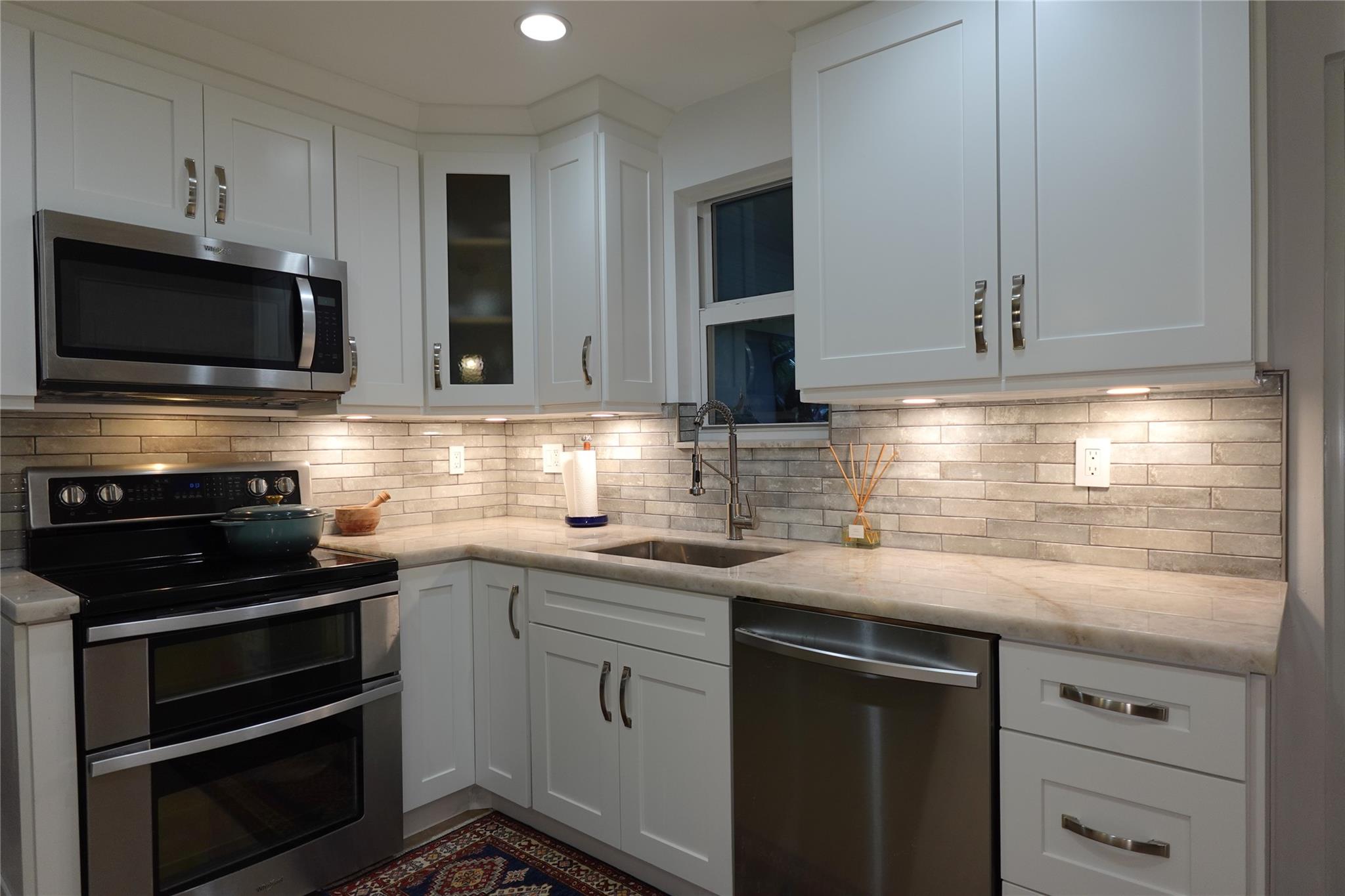 Open concept living space with BRAND NEW KITCHEN, STAINLESS STEEL APPLIANCES, QUARTZITE