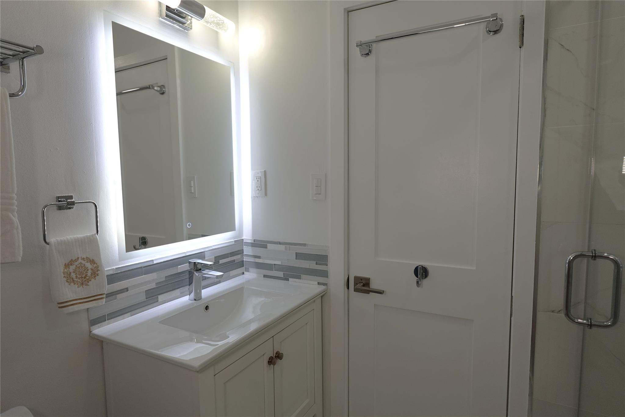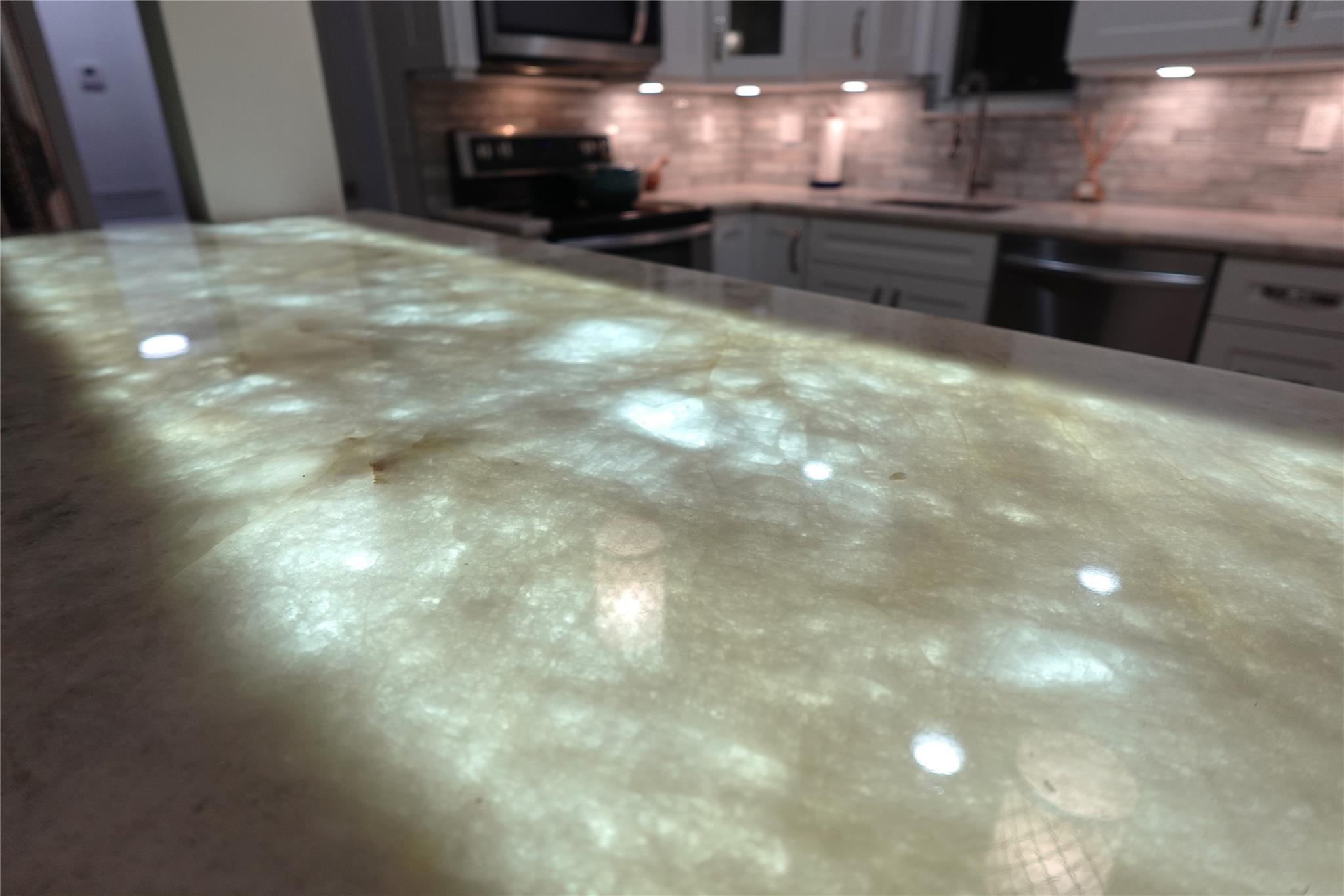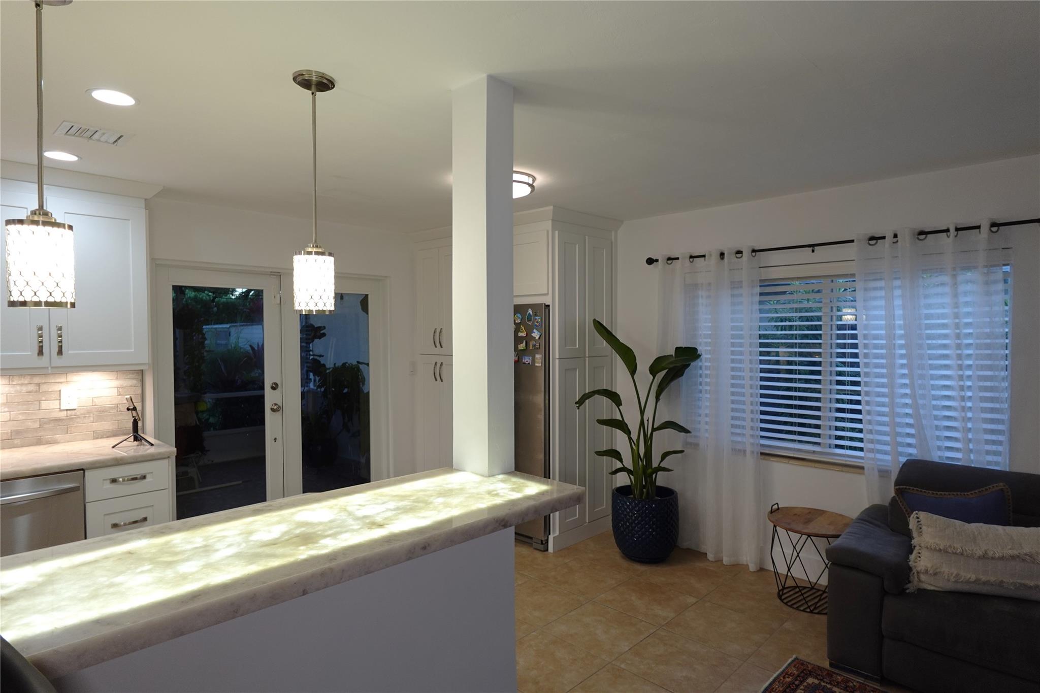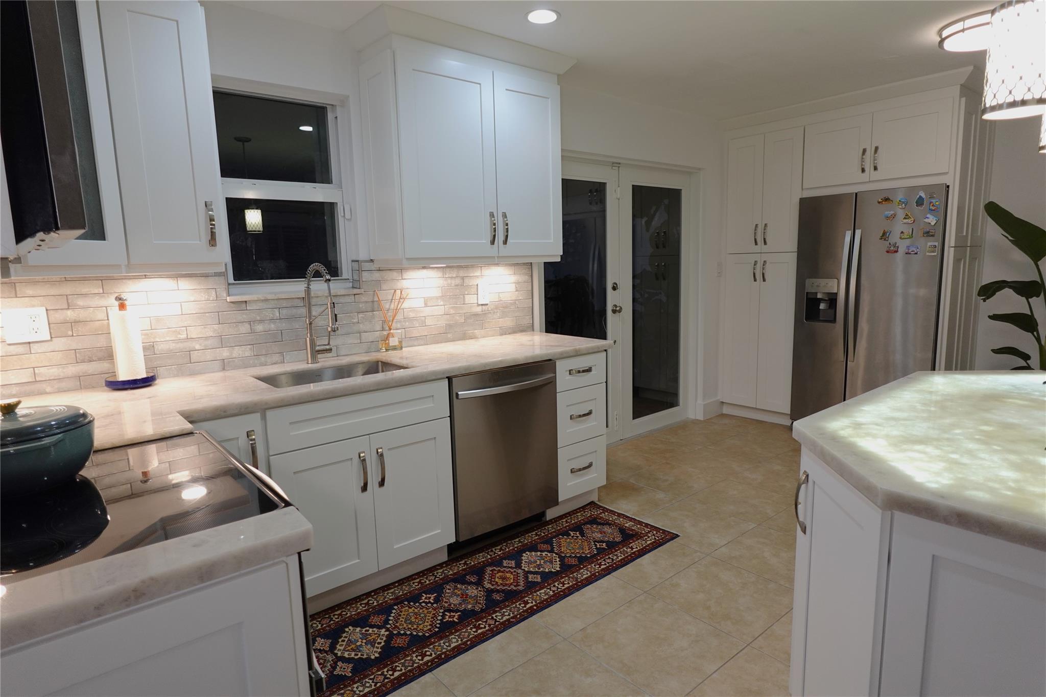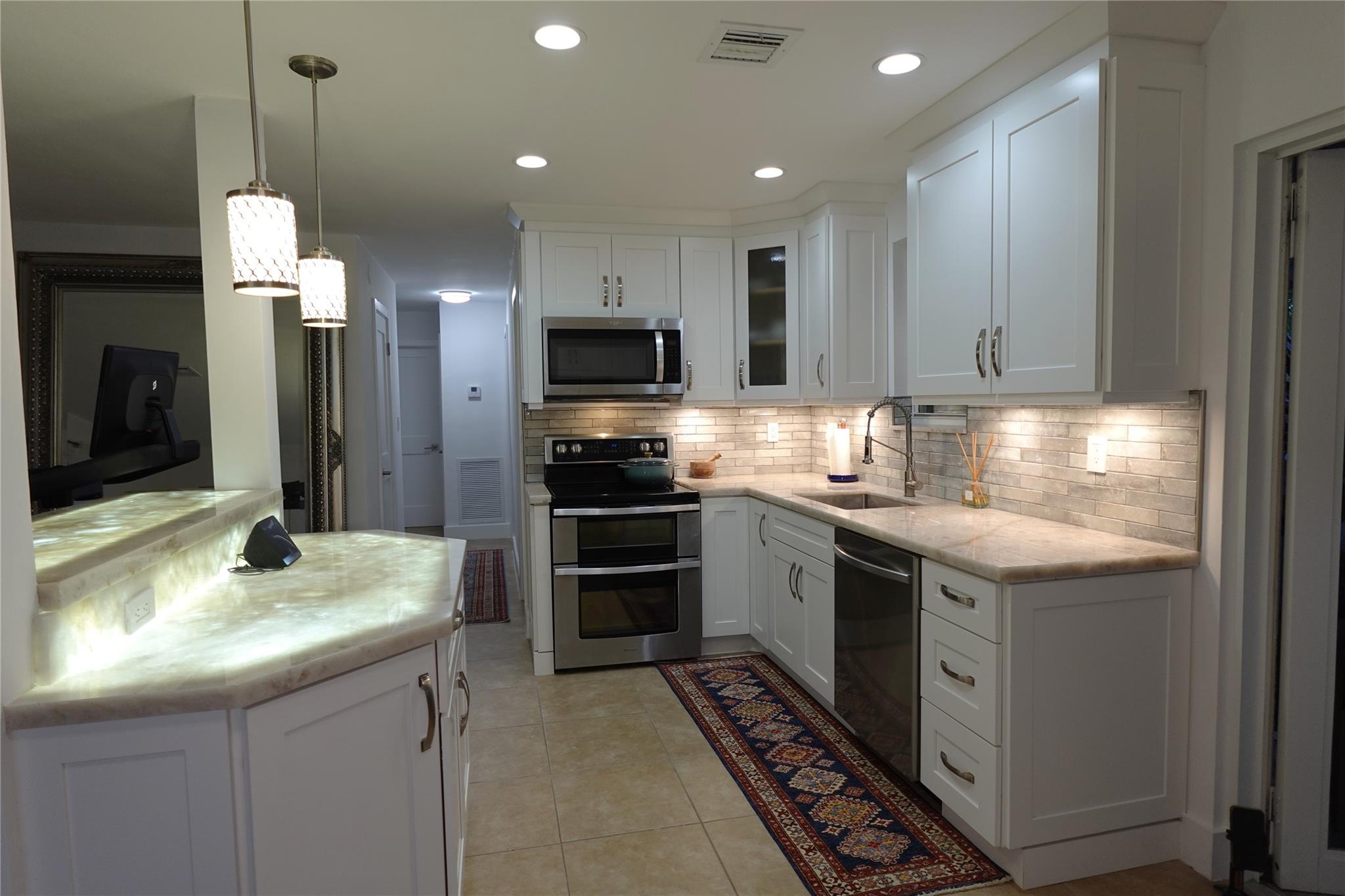 COUNTERTOPS, UNIQUE ILLUMINATED KITCHEN ISLAND. Two full baths with GLASS ENCLOSURES & modern fixtures, IRRIGATION SYSTEM, HOME SECURITY SYSTEM. IMPACT WINDOWS & DOORS.