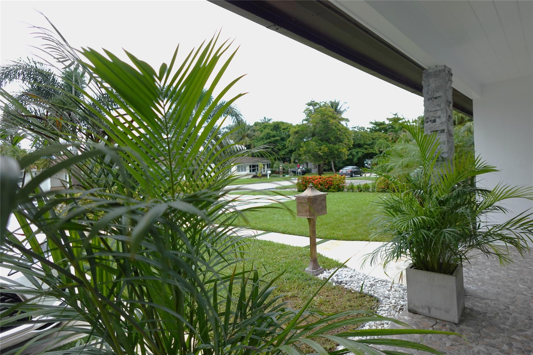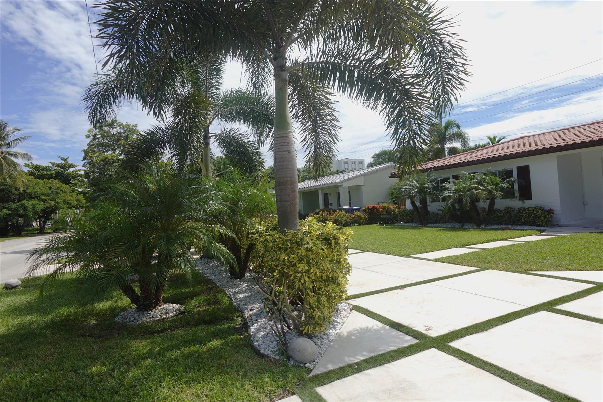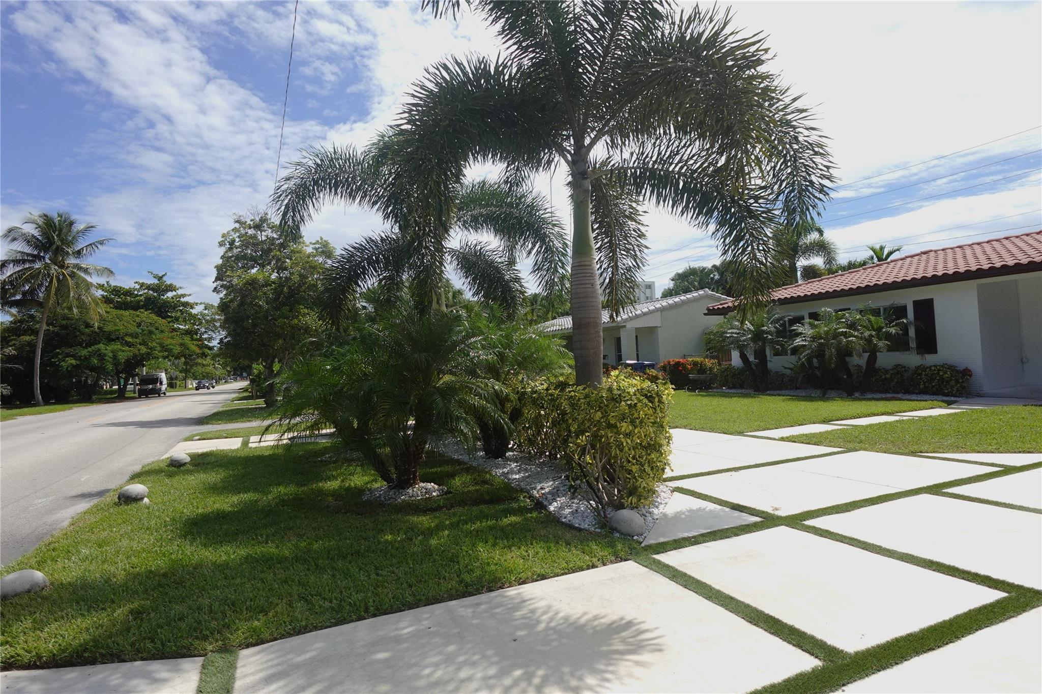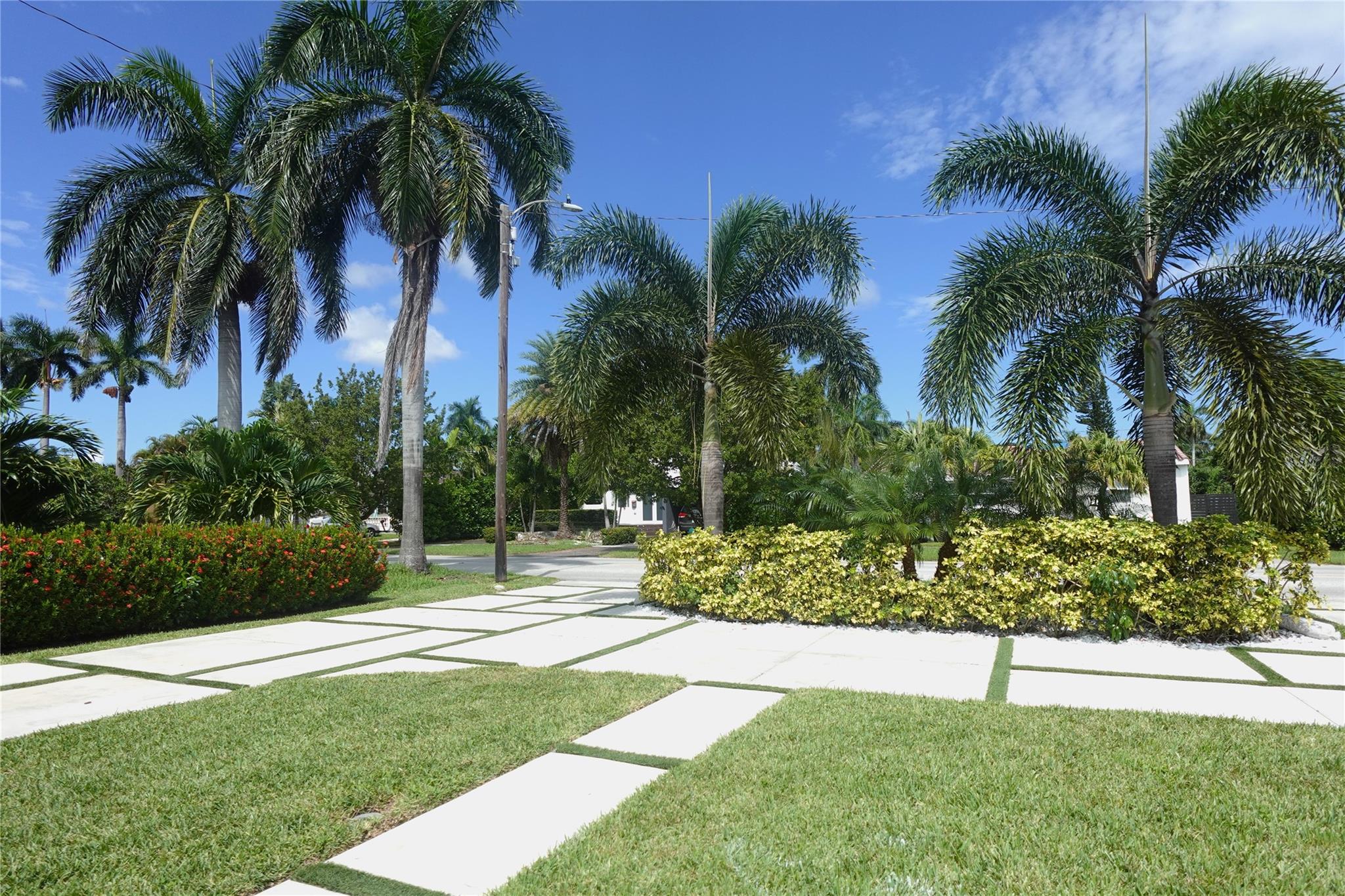 MODERN CONCRETE DRIVEWAY and lush, tropical landscape.