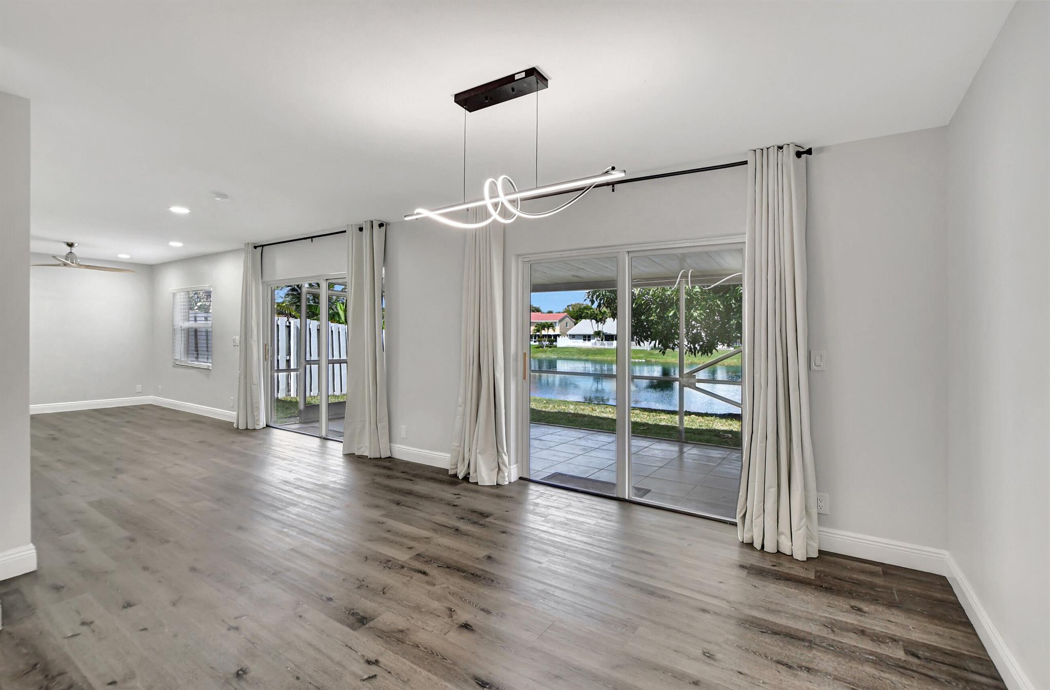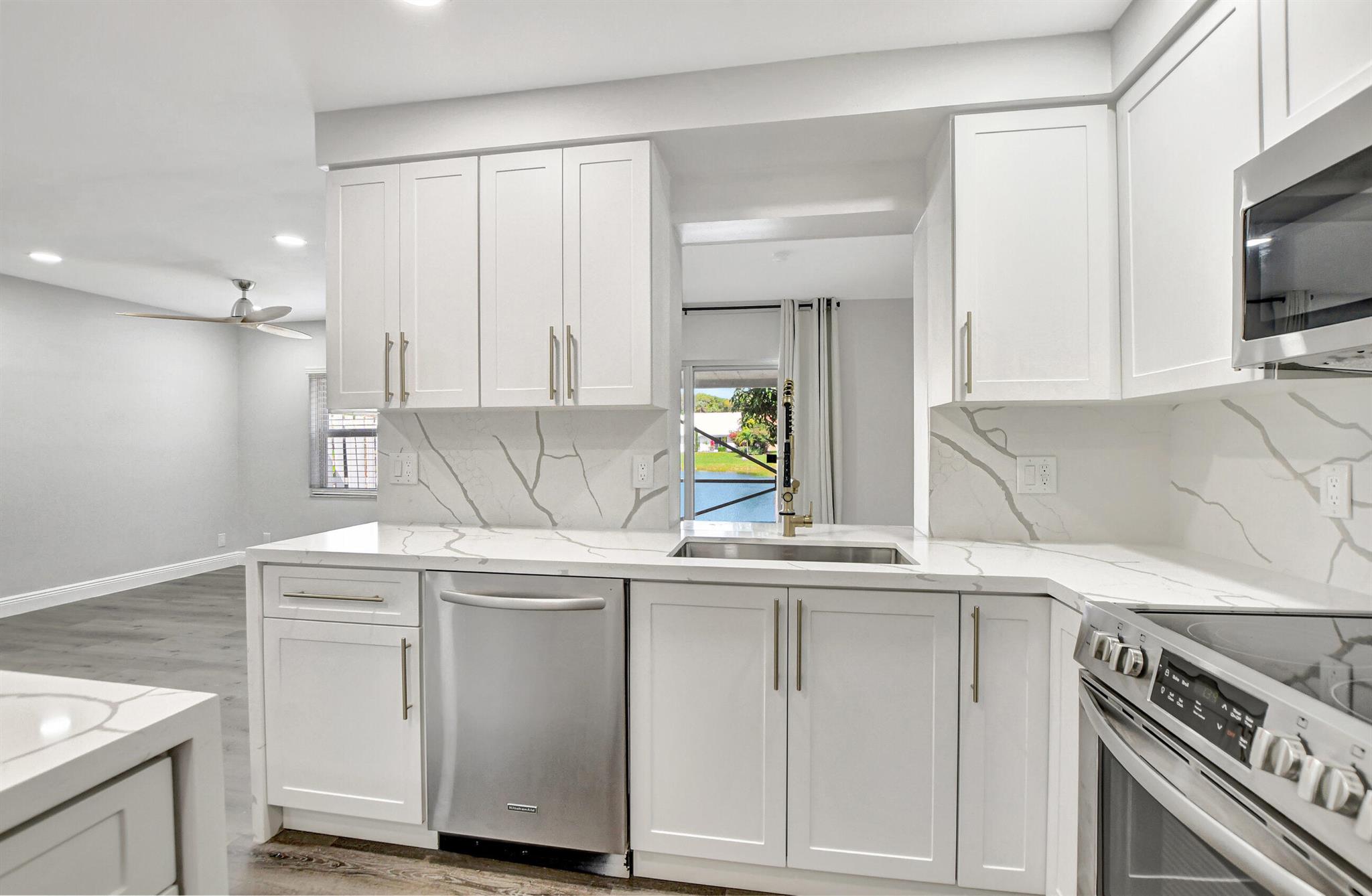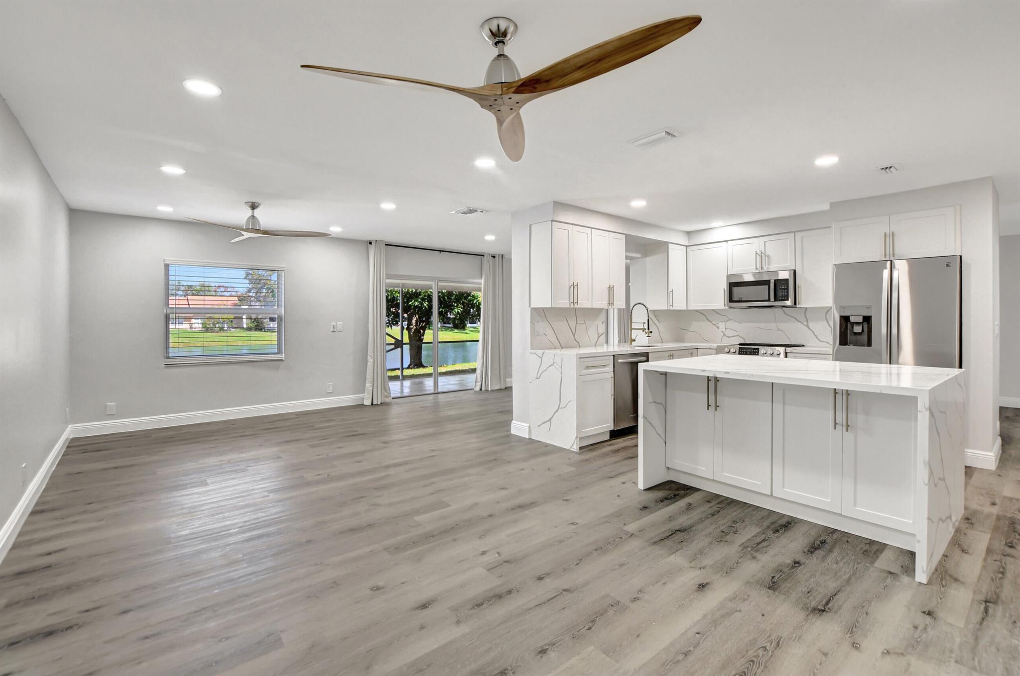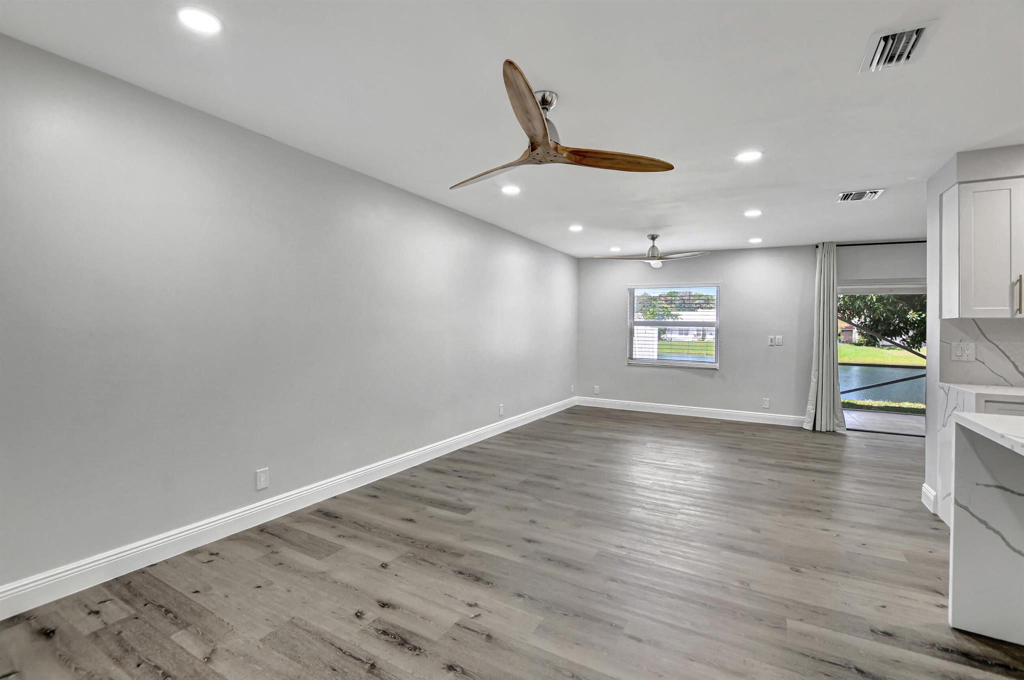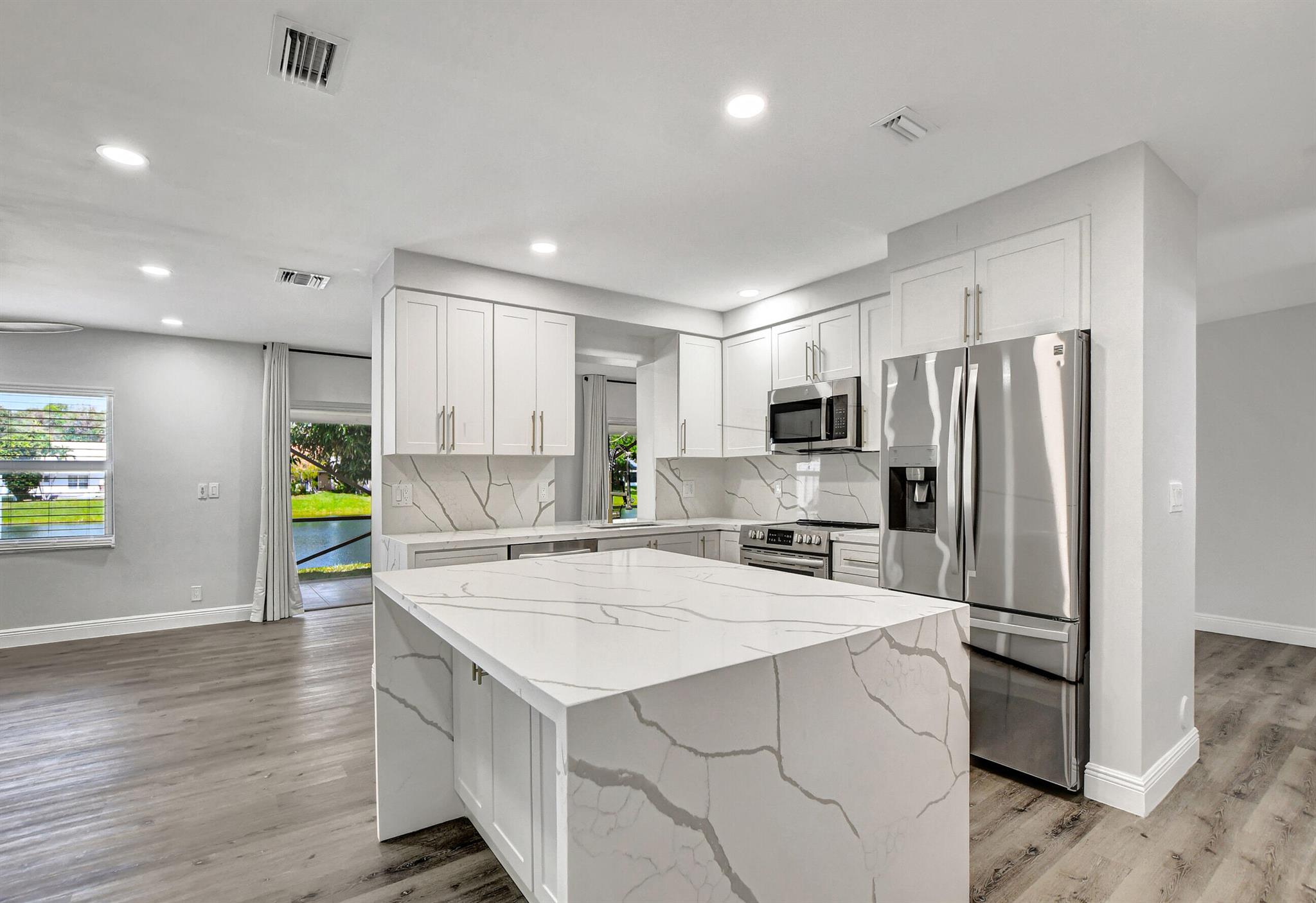 This gorgeous single family home in prestigious Boca Springs sits on a private lot with direct lake views, fully upgraded with 4 bedrooms, 2.5 baths, brand new roof 2025, hurricane impact windows & doors, brand new kitchen & bathrooms, vaulted ceilings, ideal open floor plan – offering the perfect blend of privacy, luxury and entertainment! Beautiful gourmet kitchen w/ waterfall quartz countertops, eat in island with extra storage on both sides, brand new appliances all overlooking the lake from main living areas! Primary suite with vaulted ceilings, walk- in closet and 2nd closet space, full 2 car garage, bonus storage area underneath the stairs, private laundry room with ample space for extra storage, private screened in porch – perfect for BBQs, family gatherings, ideal